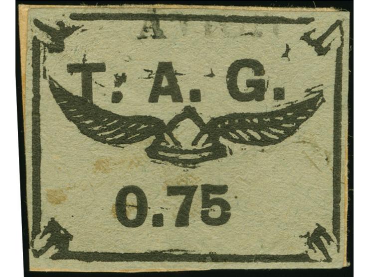 1921, Cayenne 'Winged Helmet' issue T.A.G. 75 c. black on grey, imperforate, a used example on piece with well margins all round, few tiny spots, cancelled by AVION handstamp struck in black. A scarce stamp, just 500 issued, fine, signed (Yvert 4)