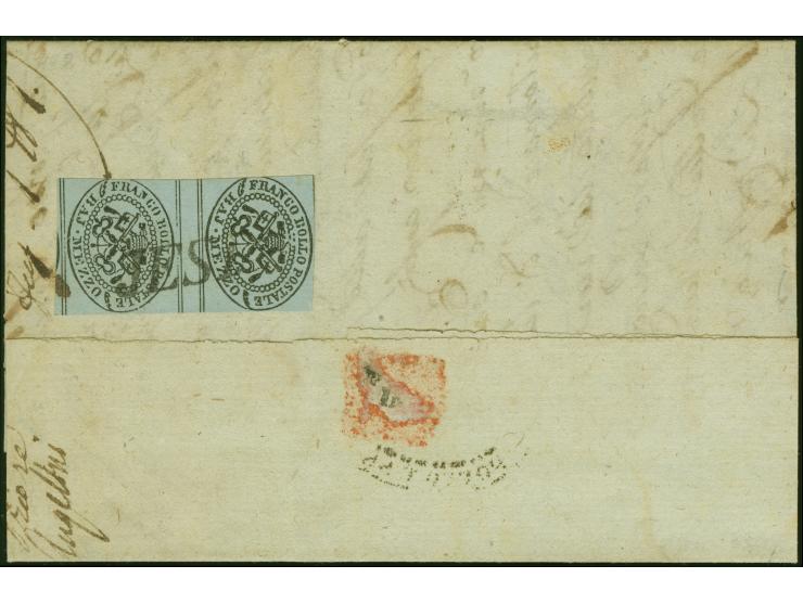 1852, ½ b. grey blue, vertical “interspazio” pair, margins into framlines on three sides, affixed to reverse of 1854 folded letter, cancelled with “JESSY” straight-line, free strike on front, an uncommon franking. (Michel 1a)