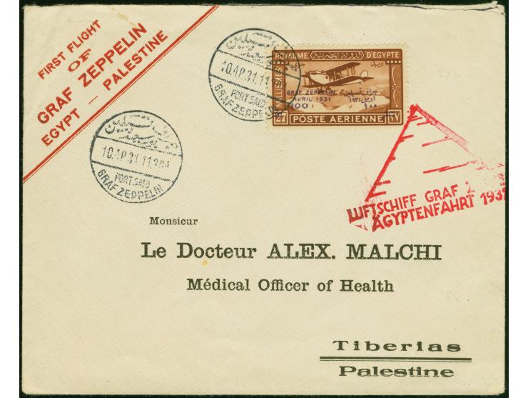 1931, Landungsfahrt nach Ägypten, ägyptische Post, Palästina-Rundfahrt mit Sonderstempel “PORT SAID” und deutschen Bestätigungsstempel, Vordruckbrief mit Sondermarke 100 auf 27 M. nach Tiberias, Palästina mit Ankunftsstempel, kleine Öffnungsspuren oben, selten (Mi.-Nr. 165cII)