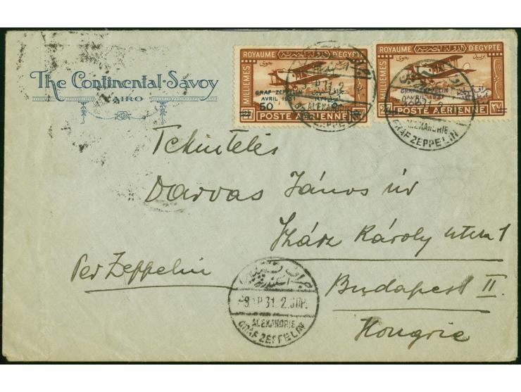 1931, Landungsfahrt nach Ägypten, ägyptische Post, Rückfahrt mit Sonderstempel “ALEXANDRIA”, Hotel-Vordruckbrief “The Continental-Savoy Cairo” mit beiden Sondermarken 100 auf 27 M. nach Budapest mit Ankunftsstempel, leichte Randspuren (Mi.-Nr. 166bII)
