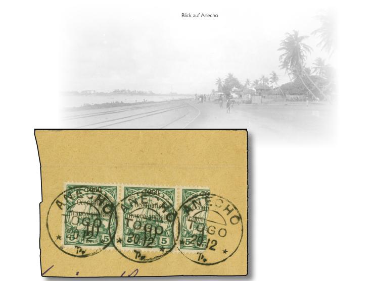 1915, 10 (C) auf 5 Pfg. senkrecht halbiert, im waagerechten Dreierstreifen mit zwei Normalmarken, sauber mit Stempel “ANECHO TOGO 20/12” auf Briefstück mit Ankunftsstempel “PORTO-NO(VO” DAHOM(EY) 20 JAN 15", tadellos, selten, sign Kilian BPP mit Fotoattest (1984) sowie Fotoattest RPSL (2018)