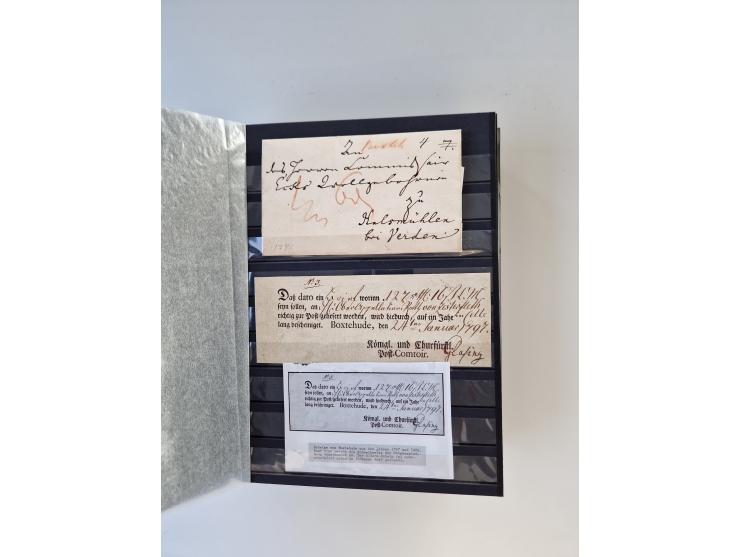 Buxtehude: 1787/2020, umfangreiche Sammlung ab Vorphila mit u.a. frühem Postschein von 1797, Botenbrief 1813 mit Dienstsiegel, Personenschein 1854 mit blauem L1 “BUXTEHUDE”, Hannover Mi.-Nr. 2a mit Vorausentwertung “(BUXT)EHUDE” und übergehendem handschriftlichem Vermerk “reicht nicht” auf Damenkuvert im Postverein (FA Berger BPP), Deutsches Reich ab Brustschild mit interessanten Frankaturen, Zonen-Ausgaben mit Paketkarten und Auslandsbriefe und Bund mit Anfangsausgaben und Luftpostbriefen sowie geschätzt weit über 1000 moderne Briefe inkl. sehr vieler Belege mit Freistempeln, in 16 Alben