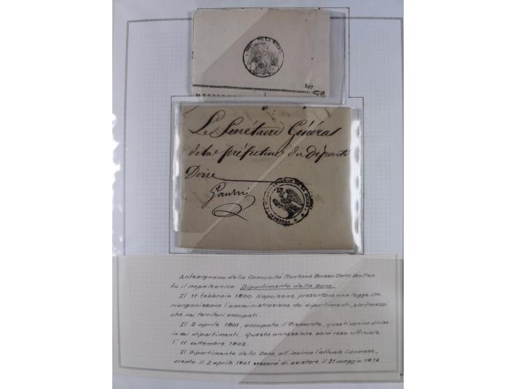 SARDINIEN: 1772/1960, Ausstellungssammlung “Die Stempel der Berggemeinschaft Bassa Dora Baltea” mit über 100 Briefen und Dokumente, Schwerpunkt mit ca. 80 Belegen ab der Napoleonischen Zeit bis ca. 1944, später einige frankierte Briefe, Ansichtskarten sowie Postscheine, sauber in drei Alben