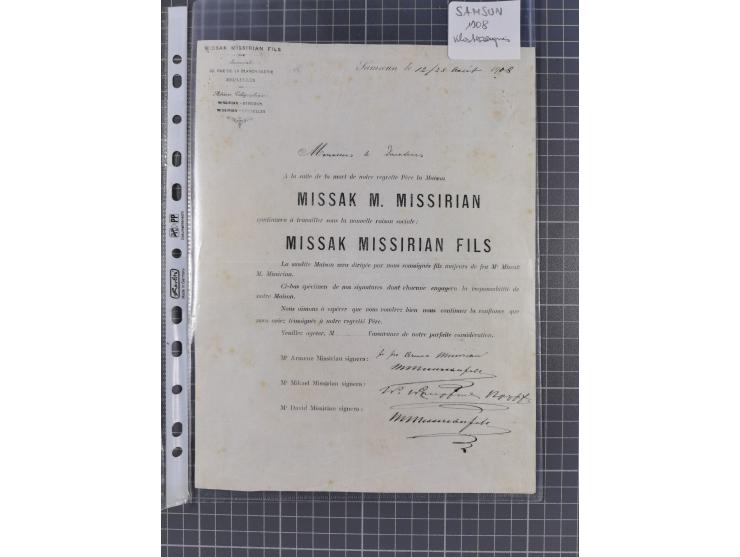 1871/1945, Armenians in Turkey: 20 covers, postcards and documents from Ottoman Empire to Republic with armenian imprints, senders and addresses, monastery document Samsun 1908, two nice postcards armenian village and Ararat, some faults and missing or added stamps, but an interesting collection for collectors with an interest in history.