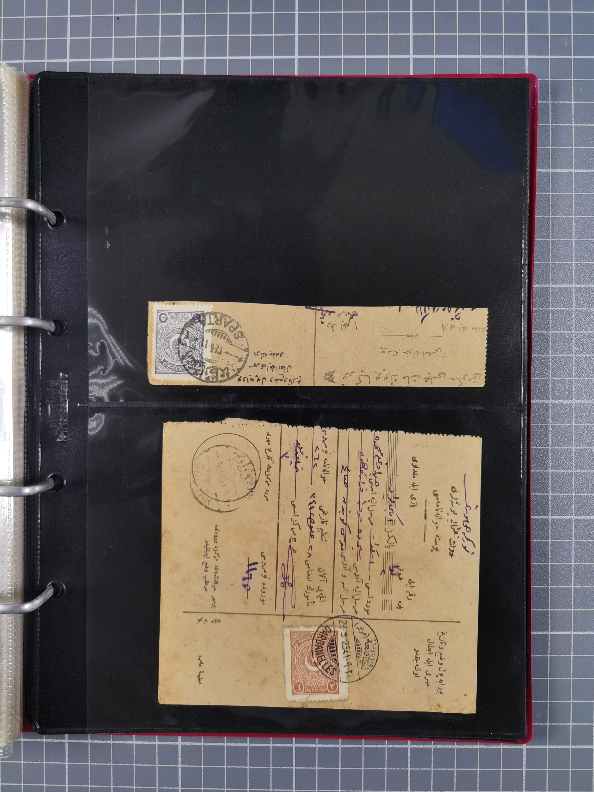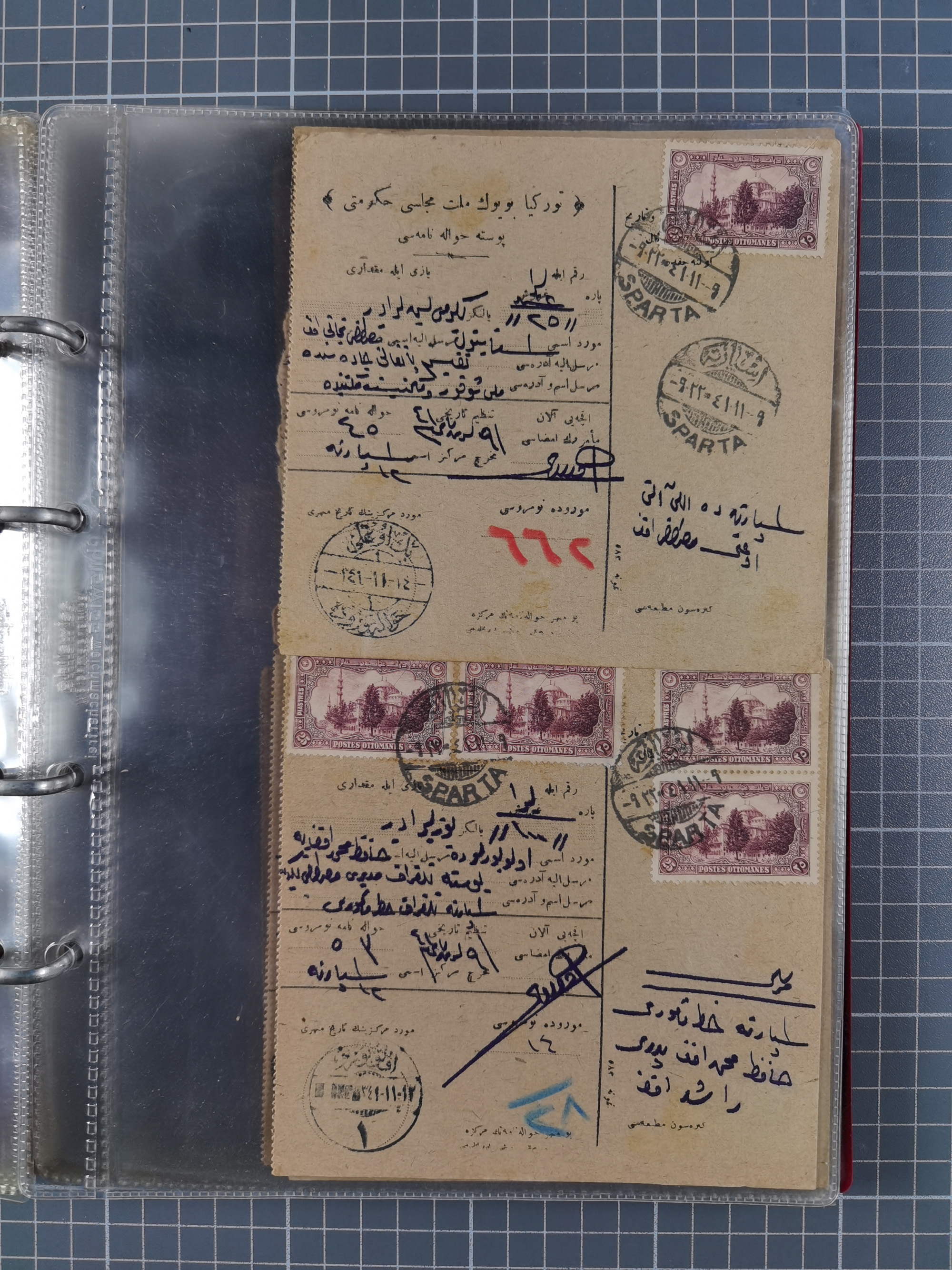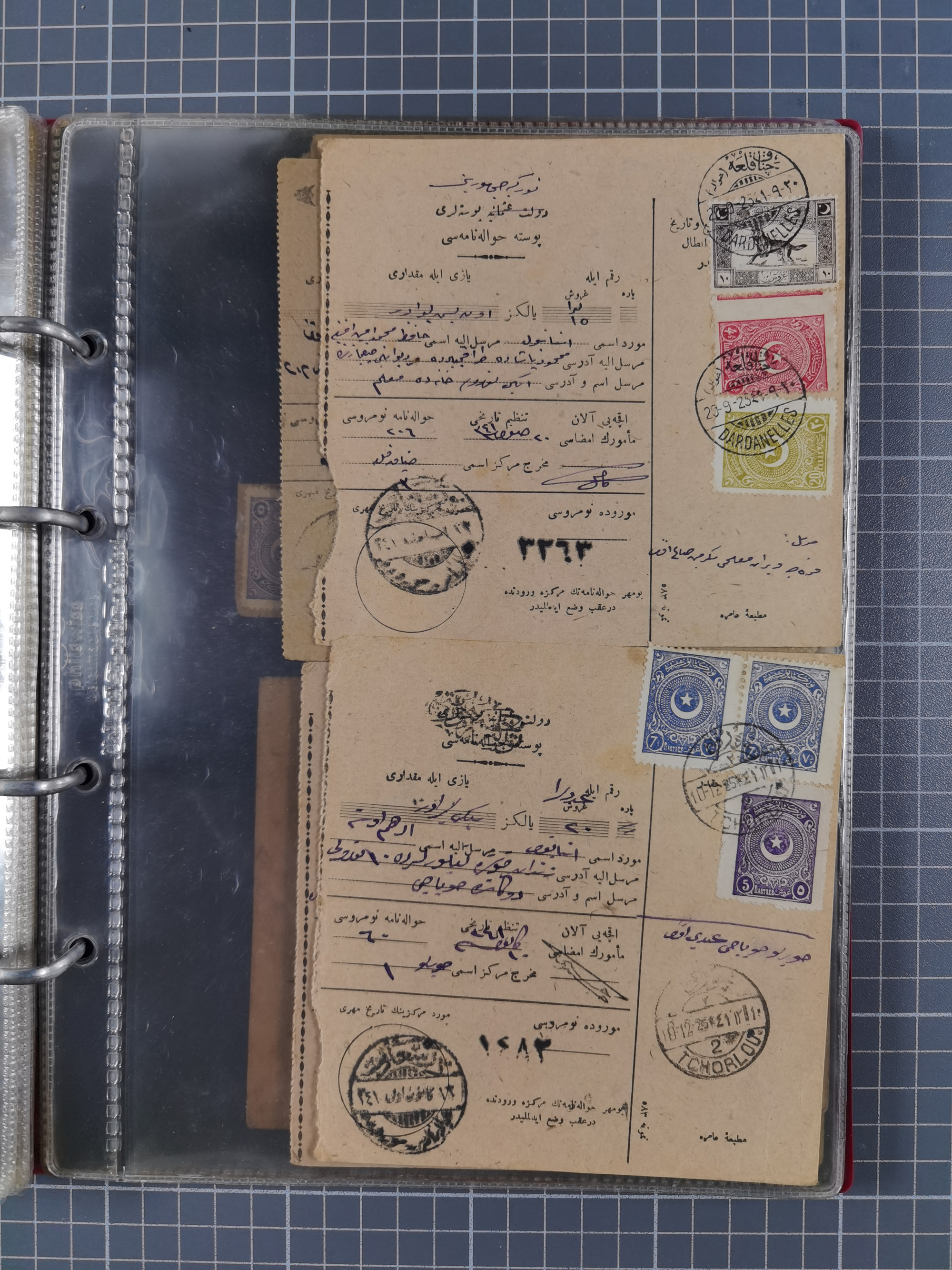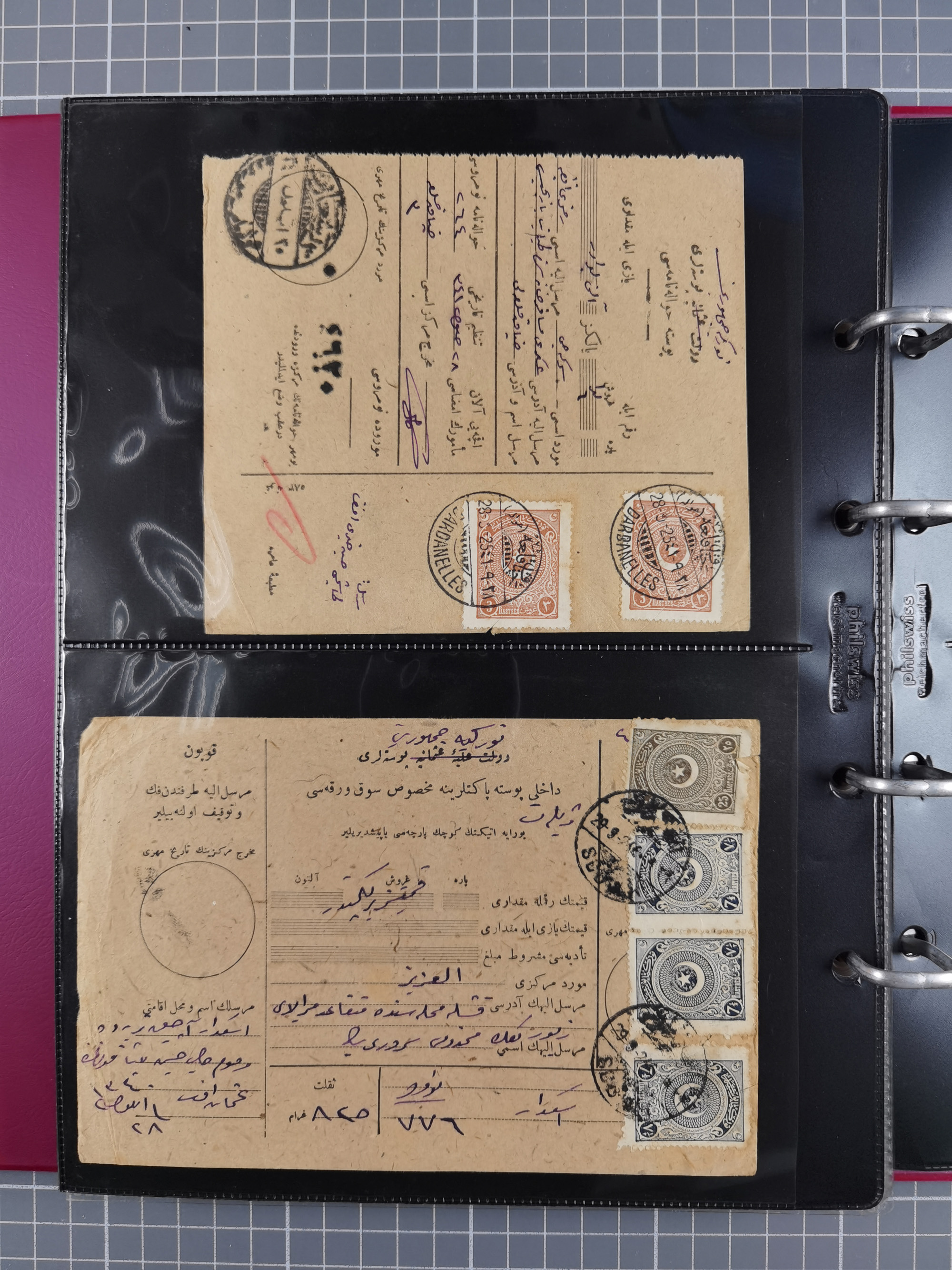 1917/25, 48 parcel cards and money transfers, mainly early republic, including 1917 order from Elvechre with bisect stamp to ministery of war, good cancellations of Dardanelles, Sparta, Chorlou, Tarsus, Manisa etc., some different, mainly fine.