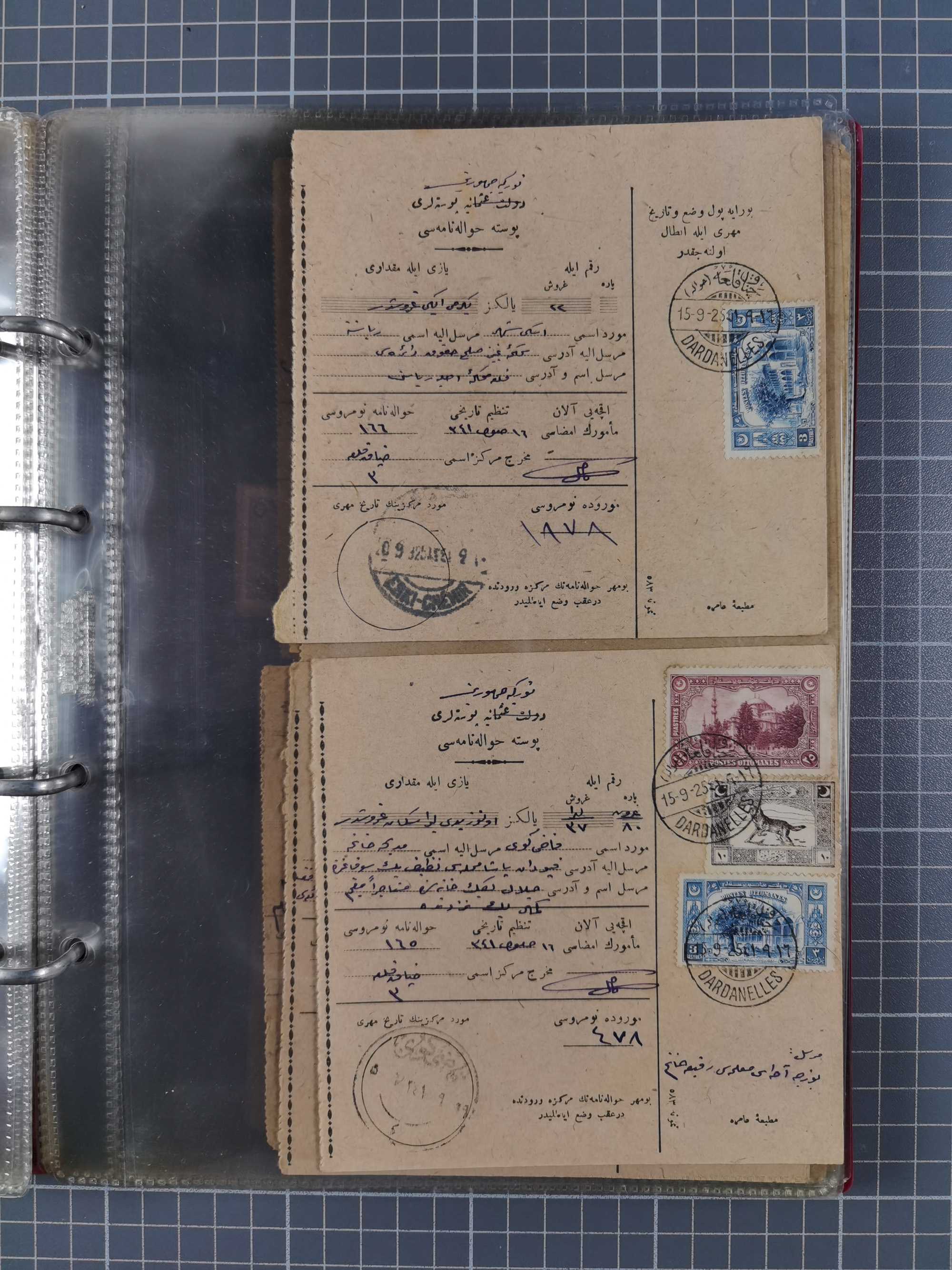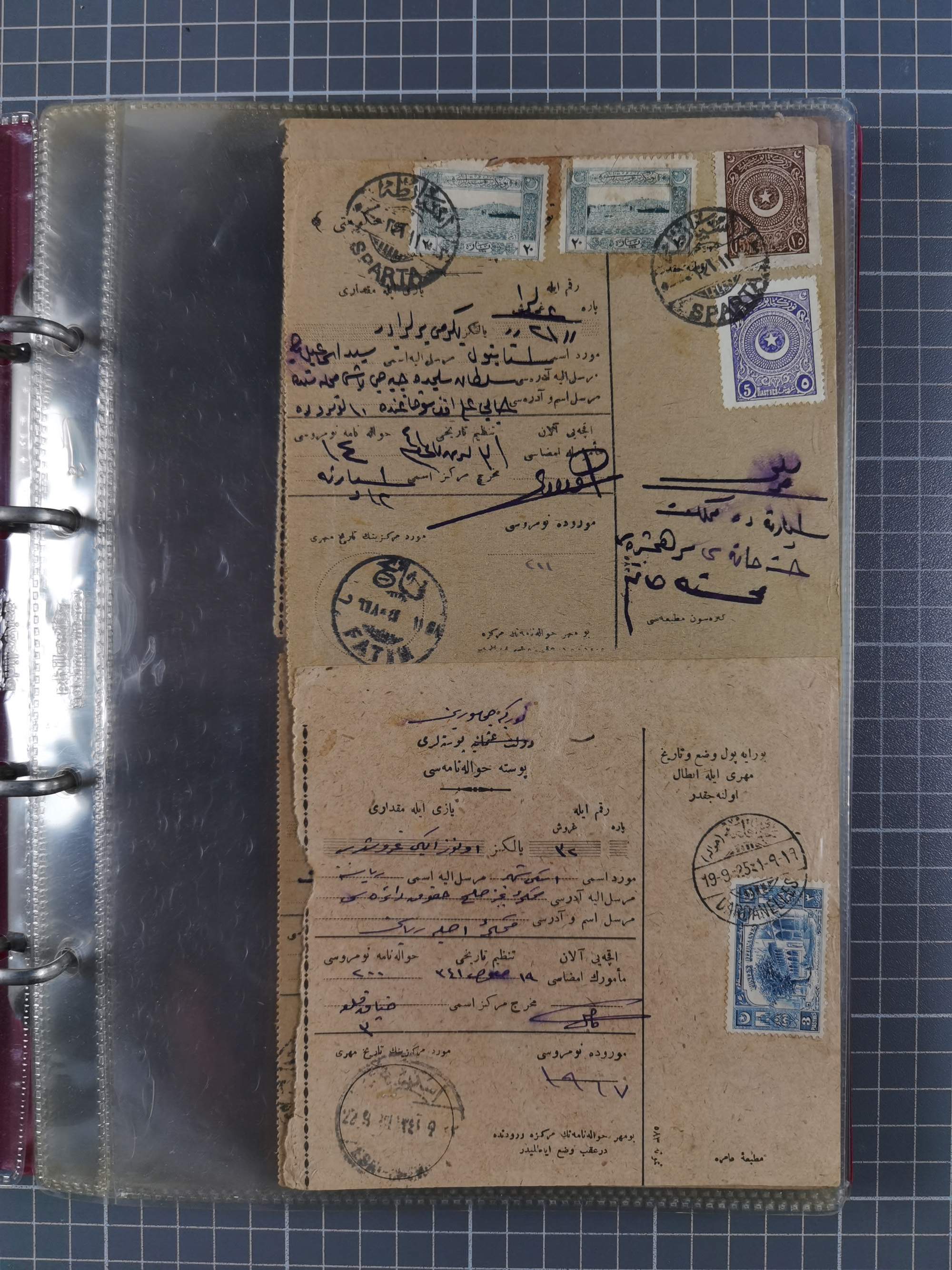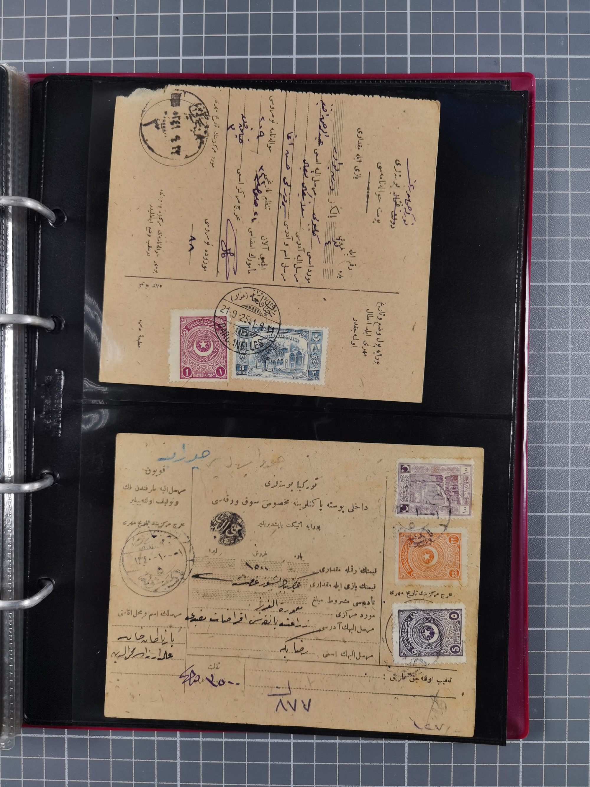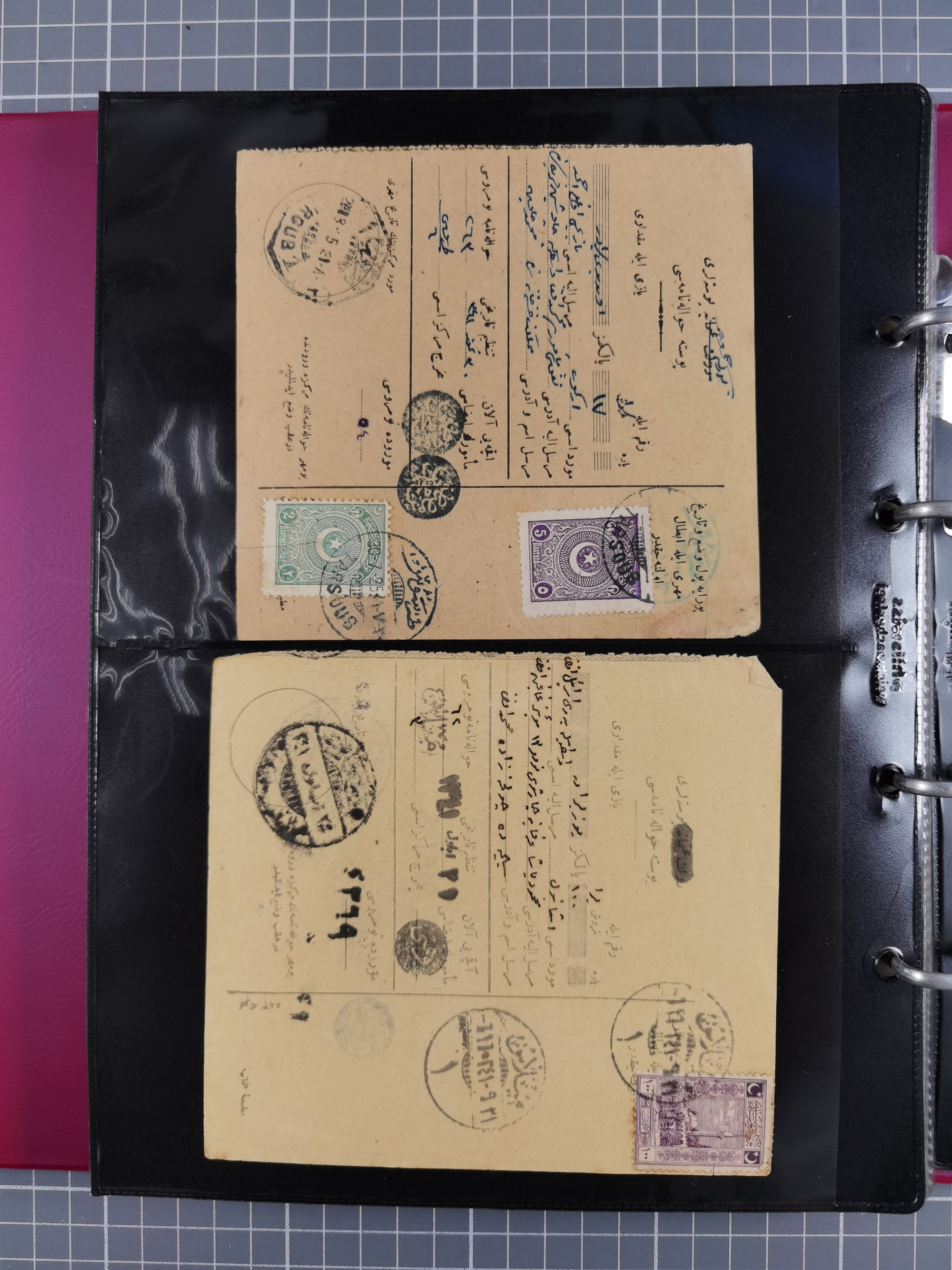 1917/25, 48 parcel cards and money transfers, mainly early republic, including 1917 order from Elvechre with bisect stamp to ministery of war, good cancellations of Dardanelles, Sparta, Chorlou, Tarsus, Manisa etc., some different, mainly fine.