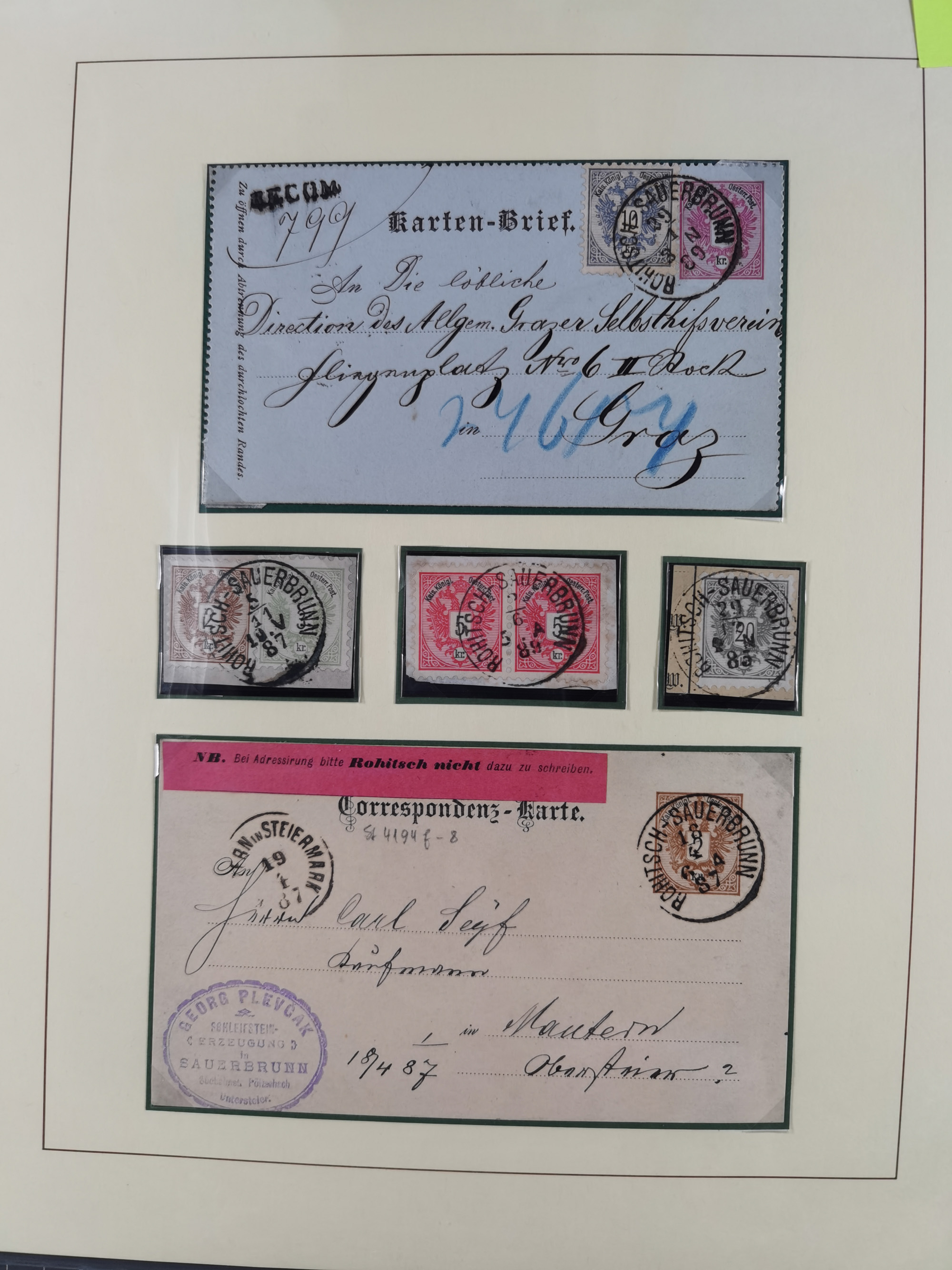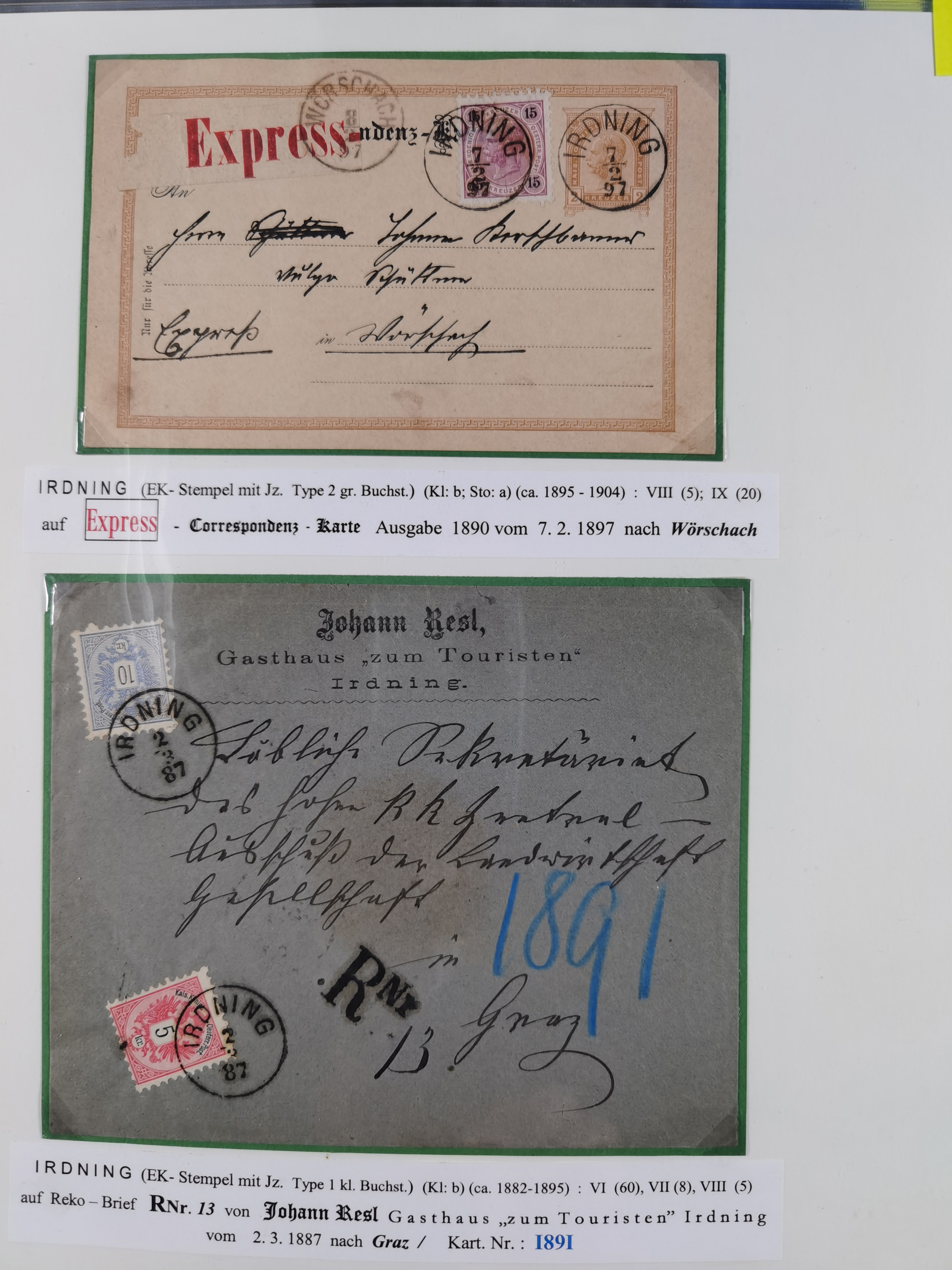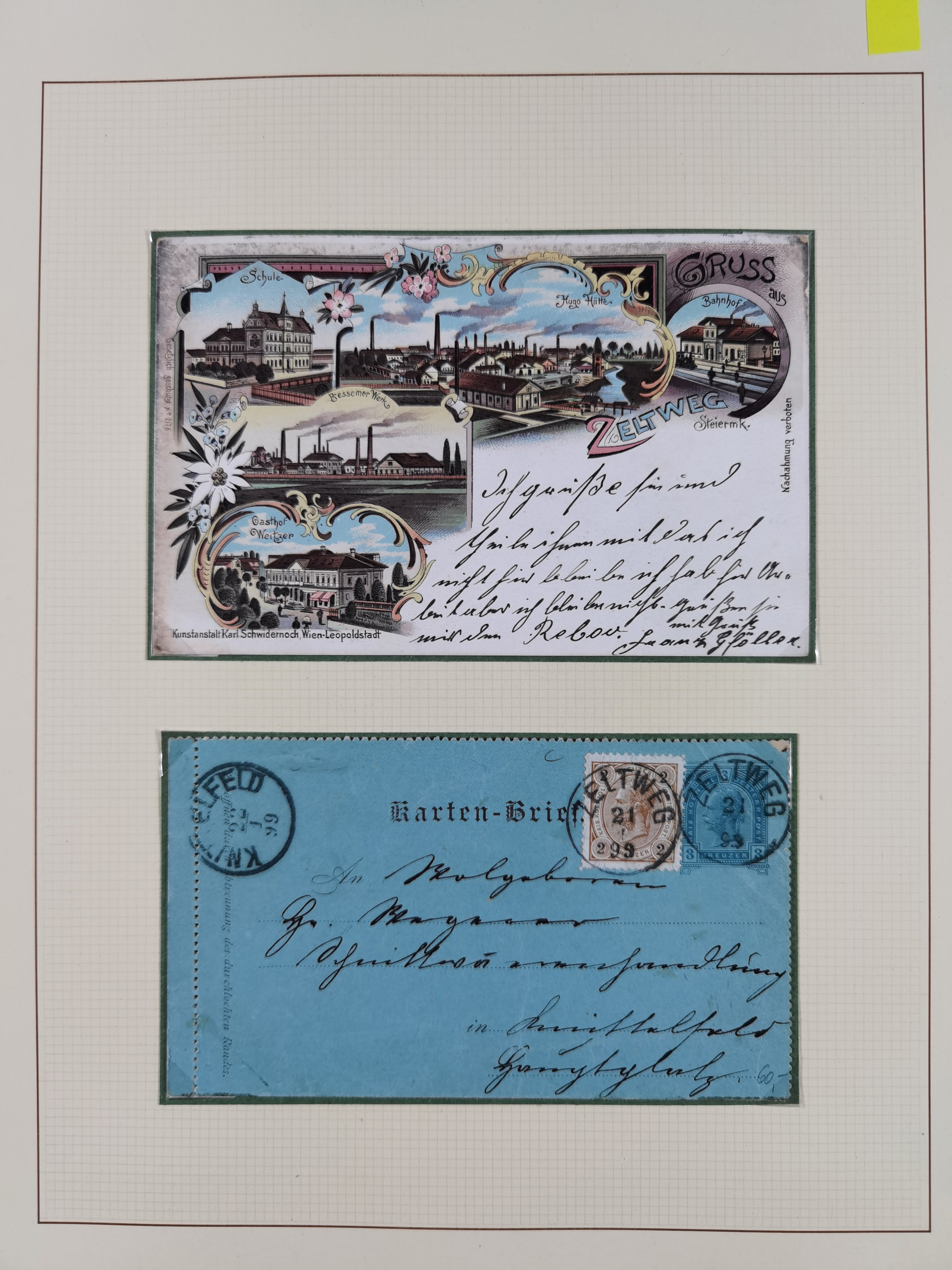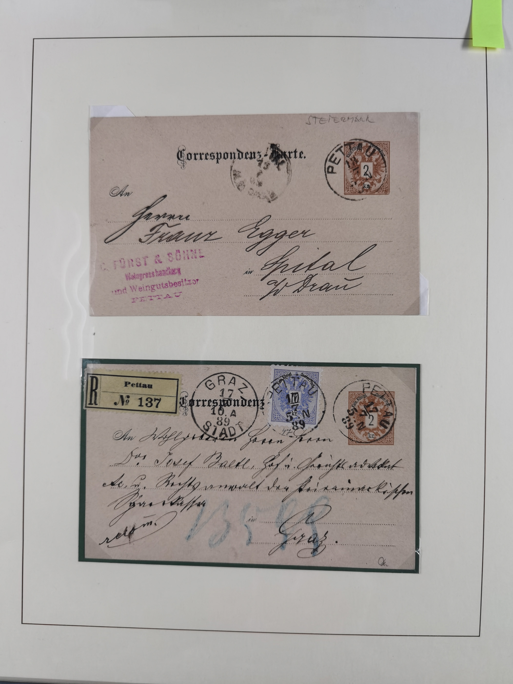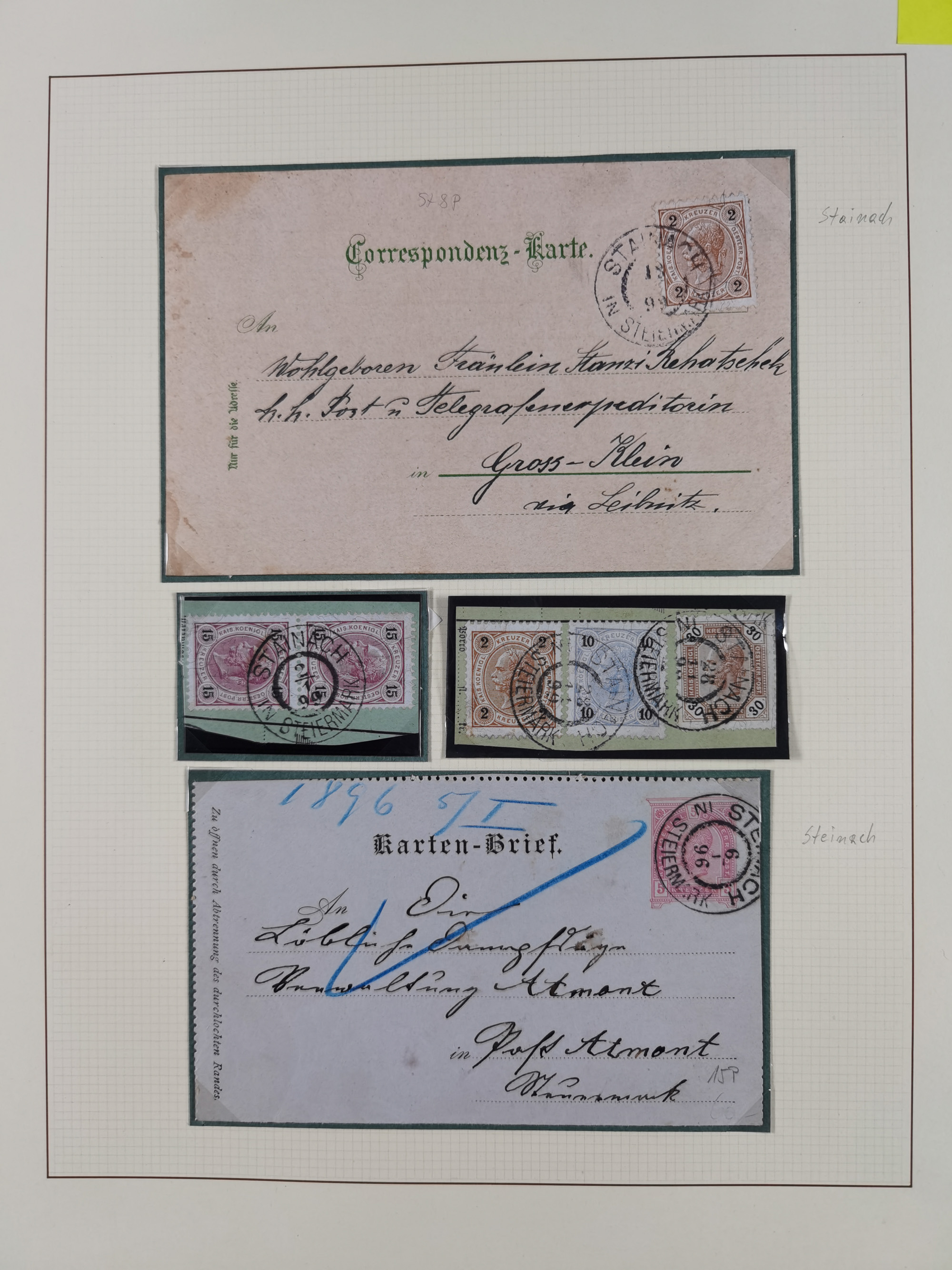 1870/1913 (ca.), umfangreiche aufgezogene Heimat-Sammlung “Herzogtum Steiermark (Styria)”, Bruck bis Windischgraz, mit über 1400 Briefen und Karten, bessere Frankaturen, Ansichtkarten und Illustriertenkarten mit Lithos, Paketkarten und Postscheine, R-Briefe, Ortsbriefe, Ganzsachenkarten- und Umschläge, etc., Schwerpunkt bei den Ausgaben 1883 bis 1899, schöne Auswahl an Poststempeln inkl. Fingerhutstempeln und handschriftlicher Entwertungen, dabei u.a. Express-Ganzsachekarte mit Zufrankatur aus “IRDNING 7 2 97” nach Wörschach, etc., sowie zahlreiche lose Marken und Briefstücke mit meist klaren Stempel-Abschlägen. Ein außerordentlich reichaltiges und interessantes Objekt, zusammen in 22 Alben