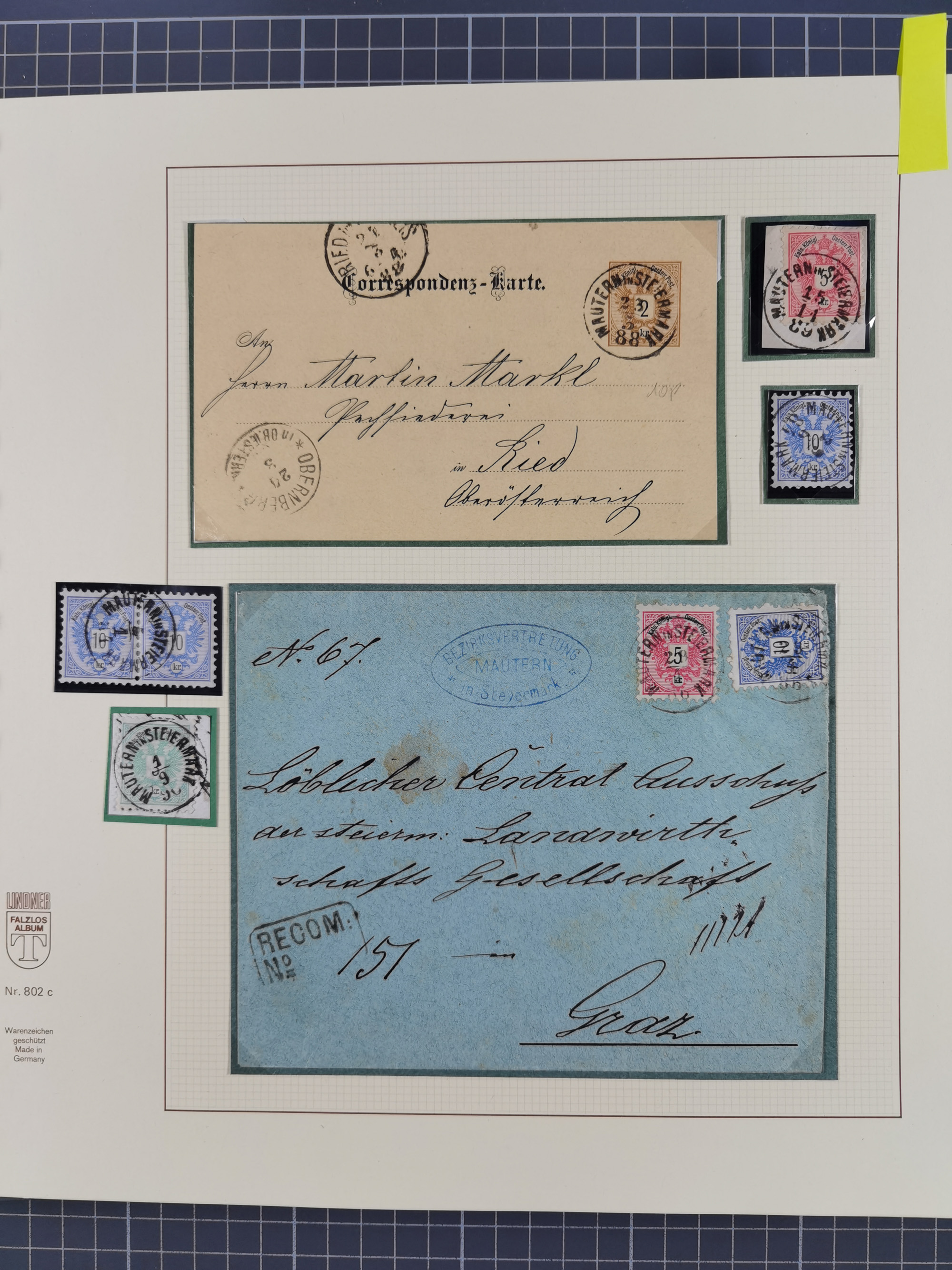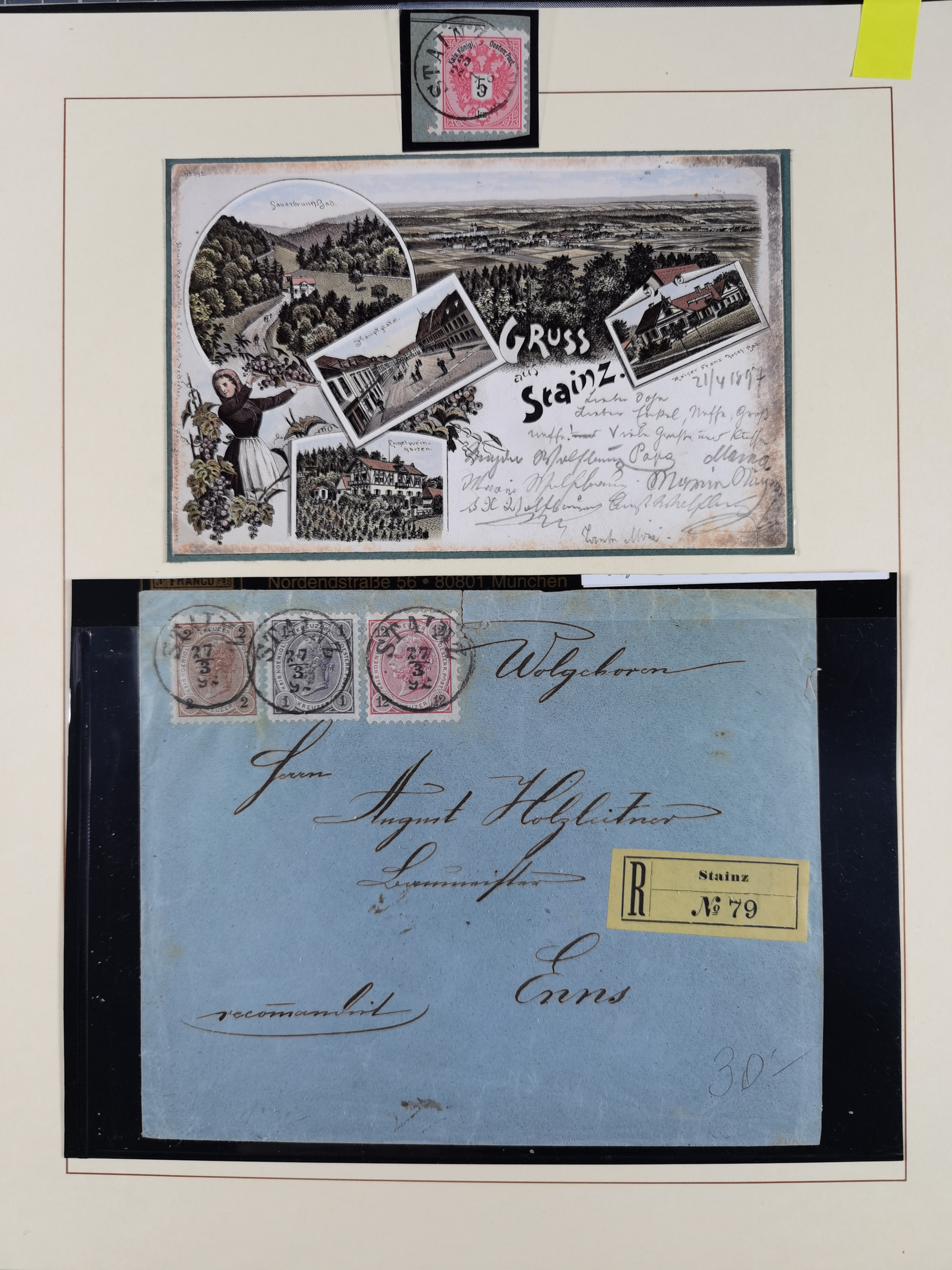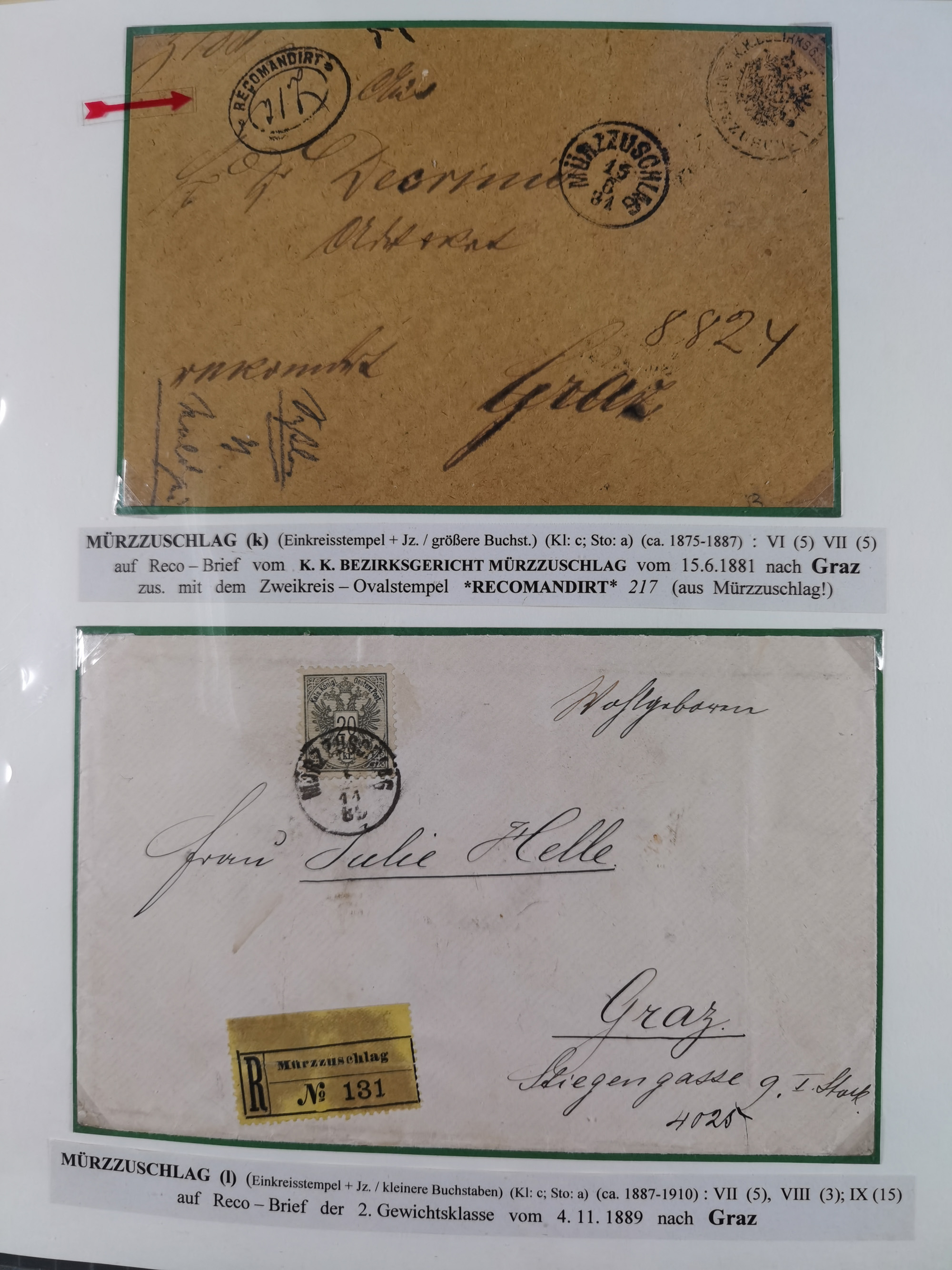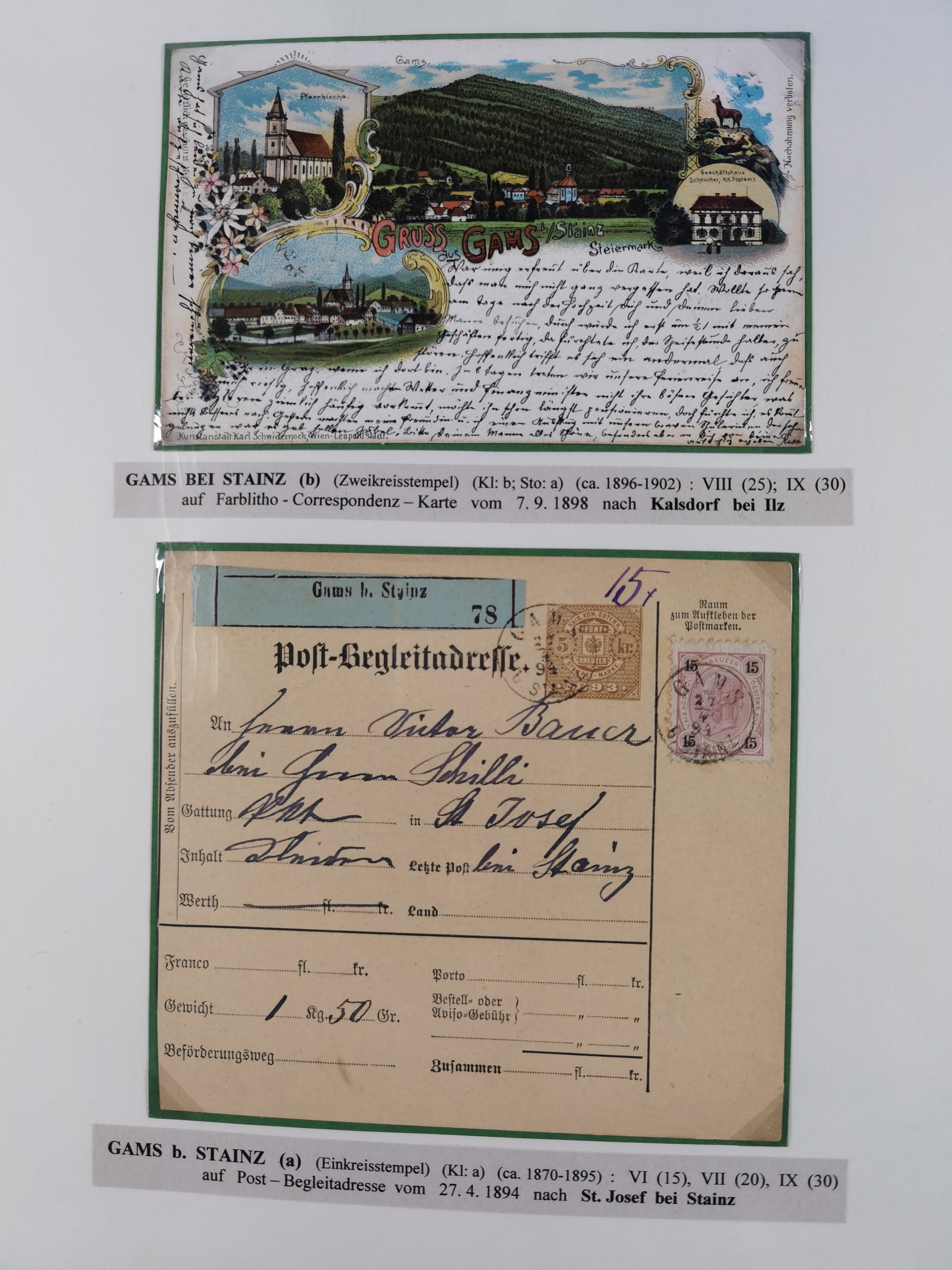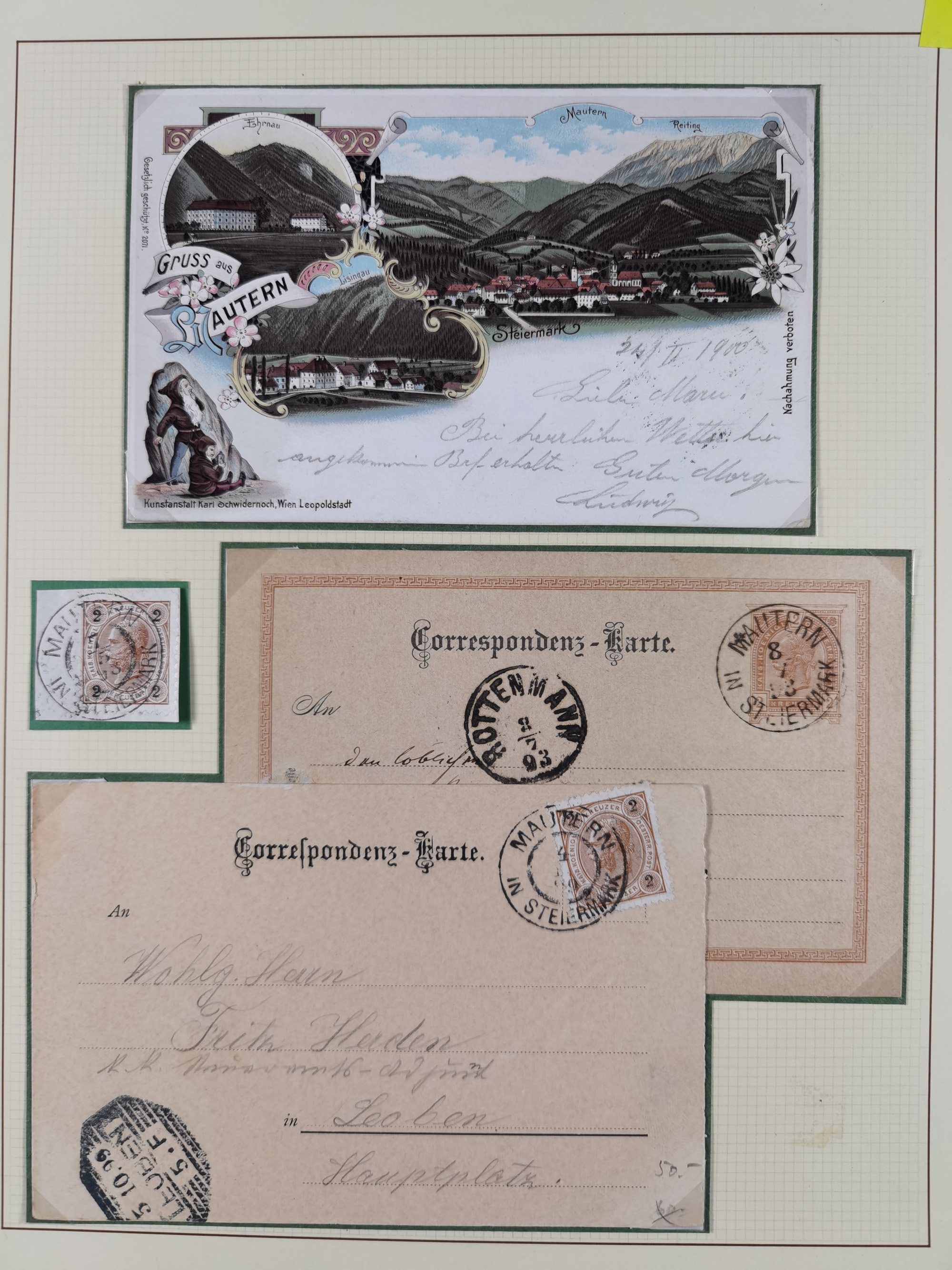 1870/1913 (ca.), umfangreiche aufgezogene Heimat-Sammlung “Herzogtum Steiermark (Styria)”, Bruck bis Windischgraz, mit über 1400 Briefen und Karten, bessere Frankaturen, Ansichtkarten und Illustriertenkarten mit Lithos, Paketkarten und Postscheine, R-Briefe, Ortsbriefe, Ganzsachenkarten- und Umschläge, etc., Schwerpunkt bei den Ausgaben 1883 bis 1899, schöne Auswahl an Poststempeln inkl. Fingerhutstempeln und handschriftlicher Entwertungen, dabei u.a. Express-Ganzsachekarte mit Zufrankatur aus “IRDNING 7 2 97” nach Wörschach, etc., sowie zahlreiche lose Marken und Briefstücke mit meist klaren Stempel-Abschlägen. Ein außerordentlich reichaltiges und interessantes Objekt, zusammen in 22 Alben