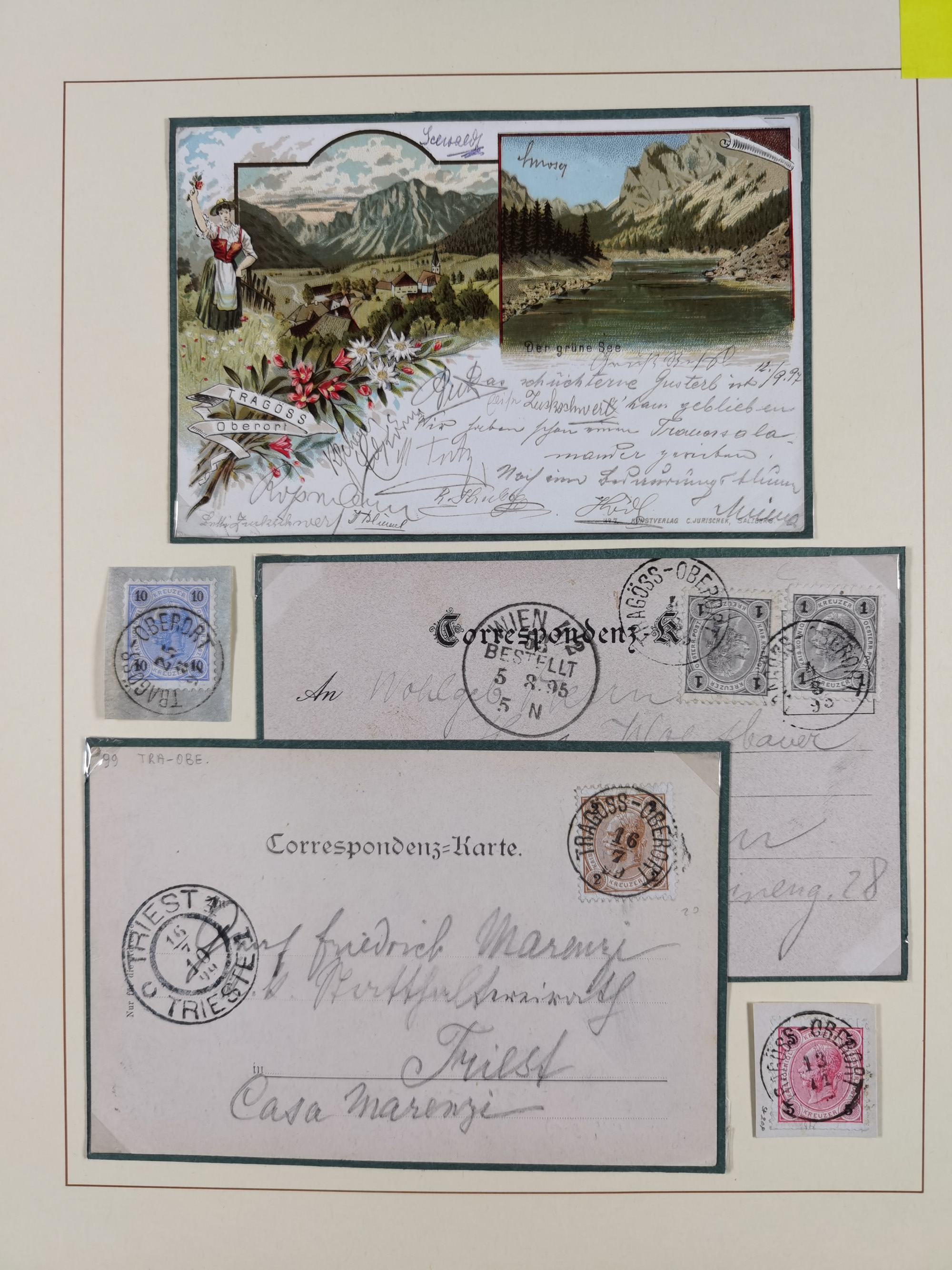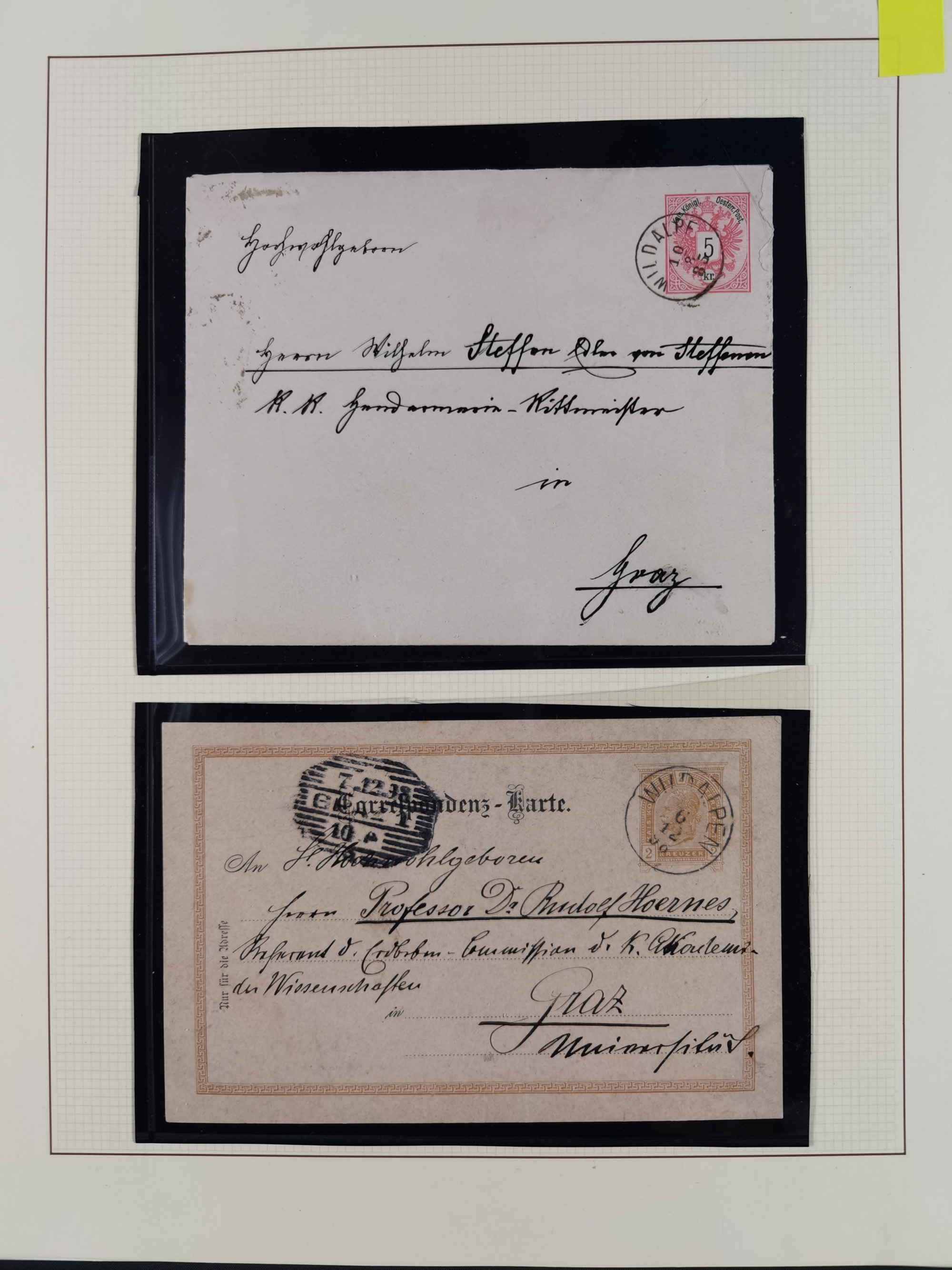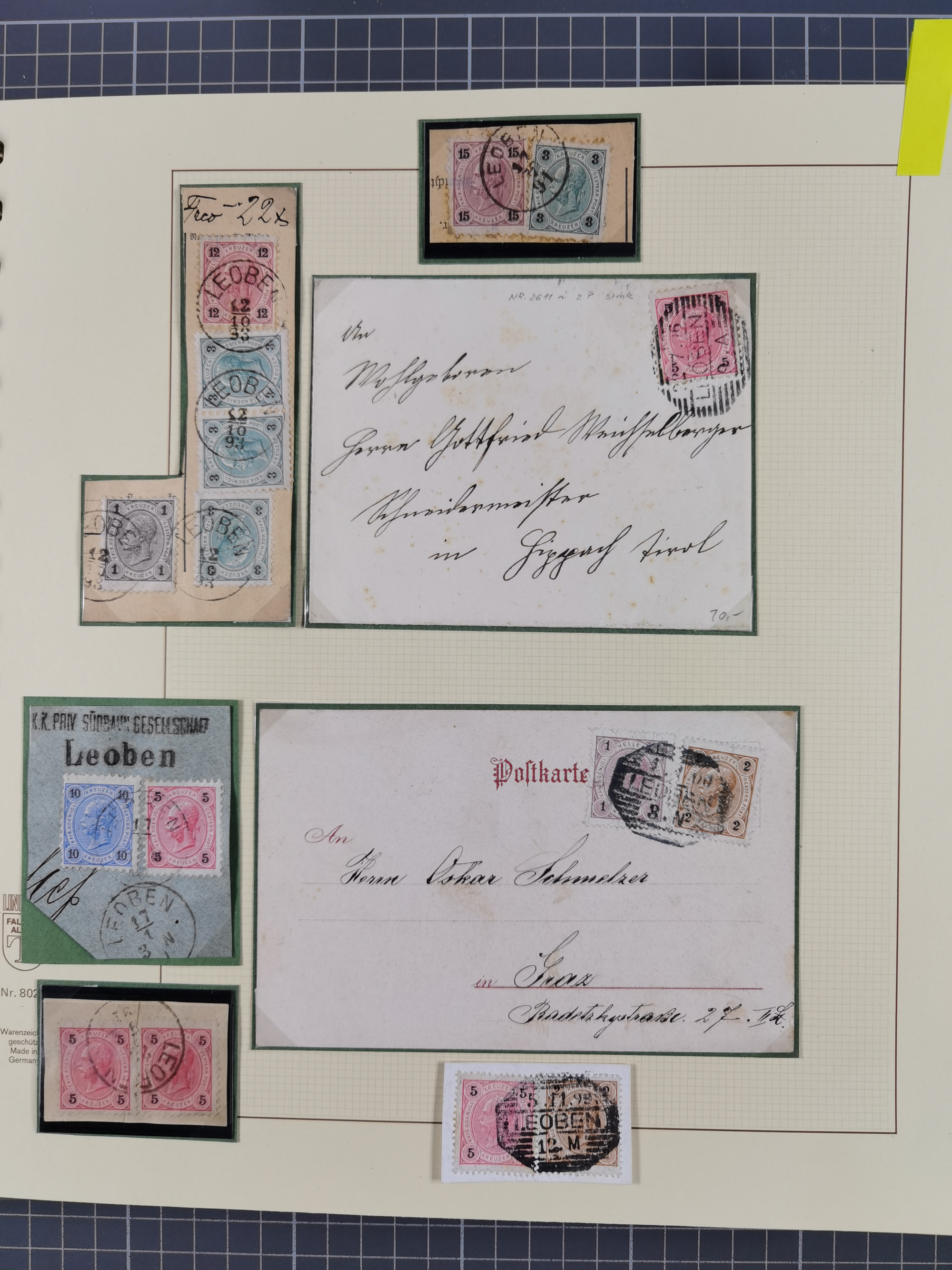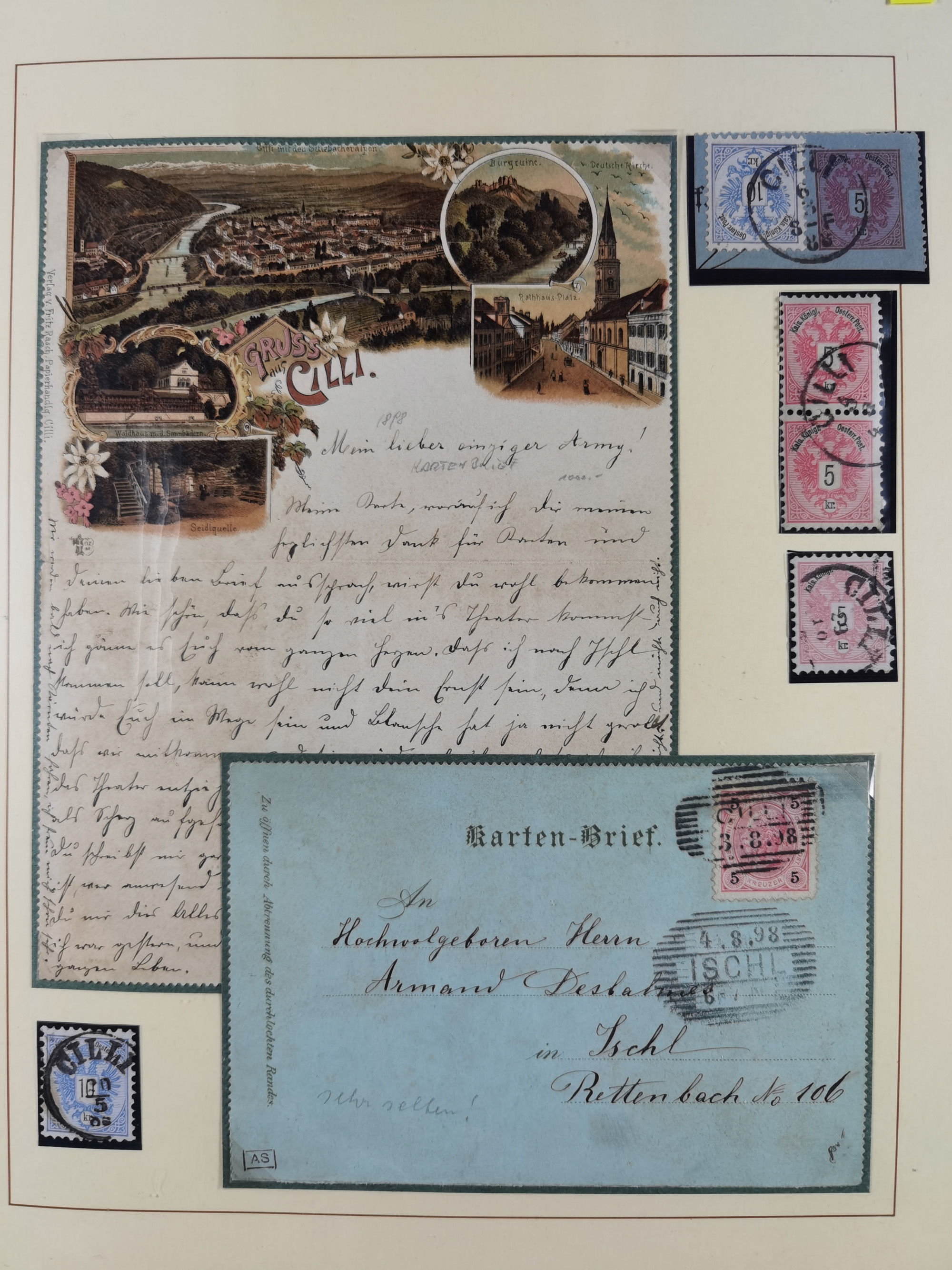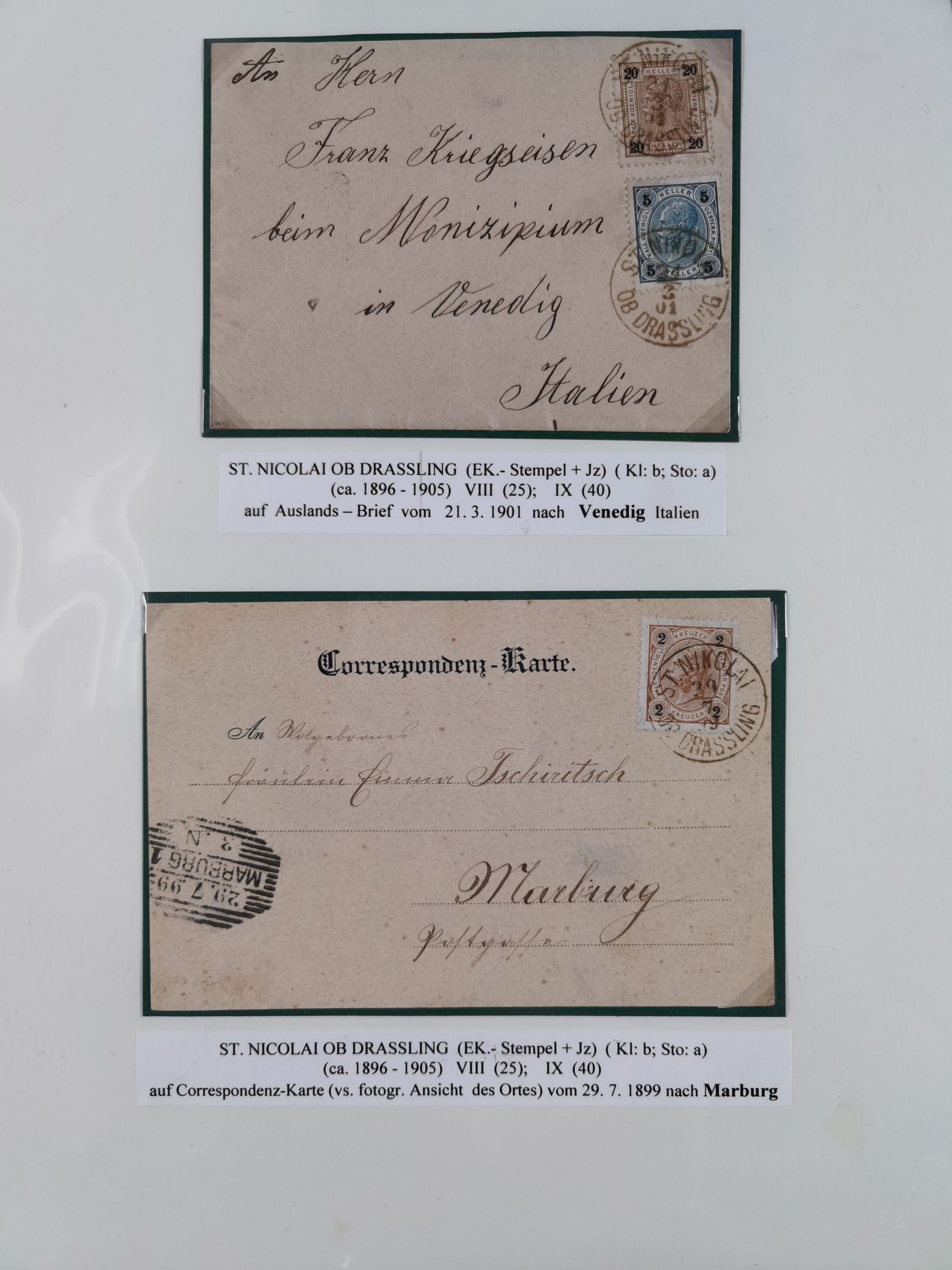 1870/1913 (ca.), umfangreiche aufgezogene Heimat-Sammlung “Herzogtum Steiermark (Styria)”, Bruck bis Windischgraz, mit über 1400 Briefen und Karten, bessere Frankaturen, Ansichtkarten und Illustriertenkarten mit Lithos, Paketkarten und Postscheine, R-Briefe, Ortsbriefe, Ganzsachenkarten- und Umschläge, etc., Schwerpunkt bei den Ausgaben 1883 bis 1899, schöne Auswahl an Poststempeln inkl. Fingerhutstempeln und handschriftlicher Entwertungen, dabei u.a. Express-Ganzsachekarte mit Zufrankatur aus “IRDNING 7 2 97” nach Wörschach, etc., sowie zahlreiche lose Marken und Briefstücke mit meist klaren Stempel-Abschlägen. Ein außerordentlich reichaltiges und interessantes Objekt, zusammen in 22 Alben