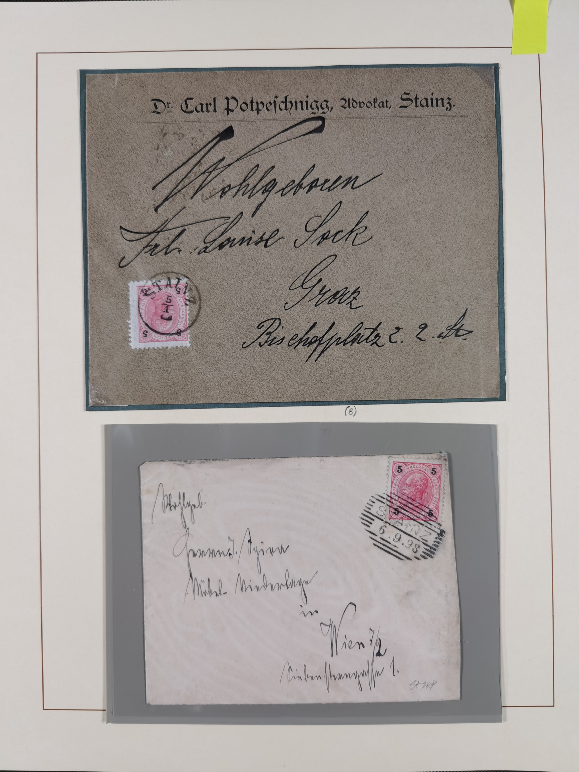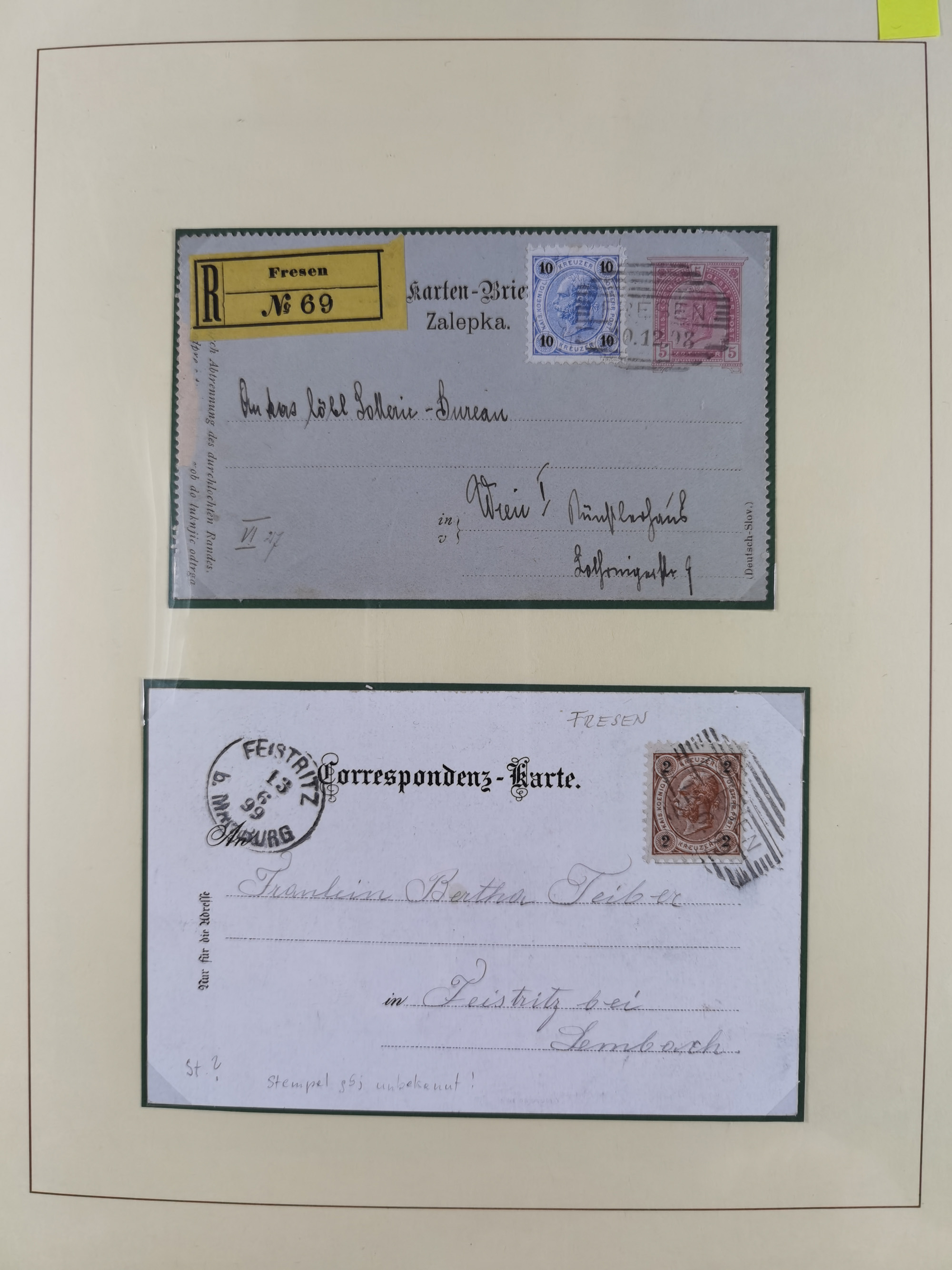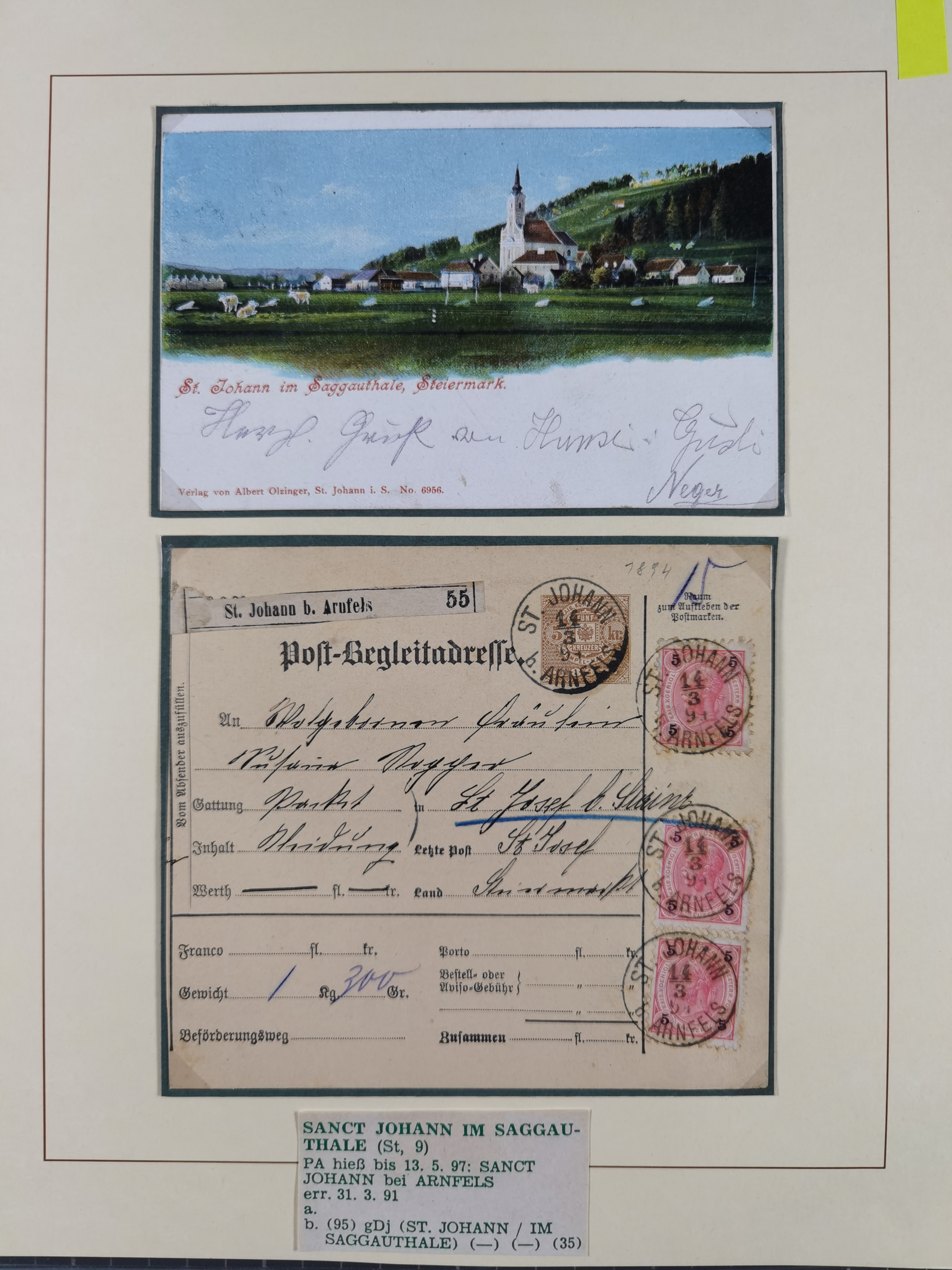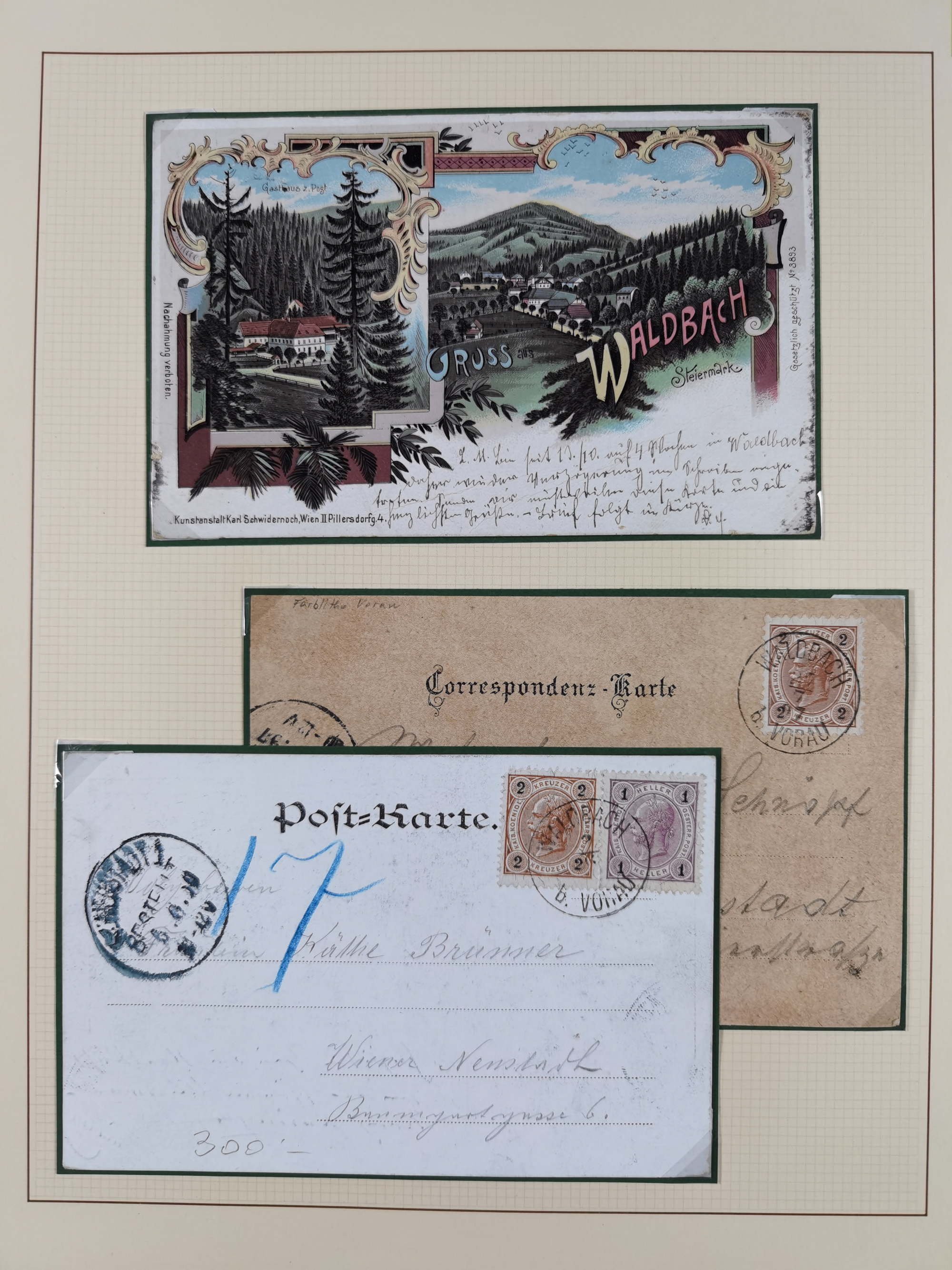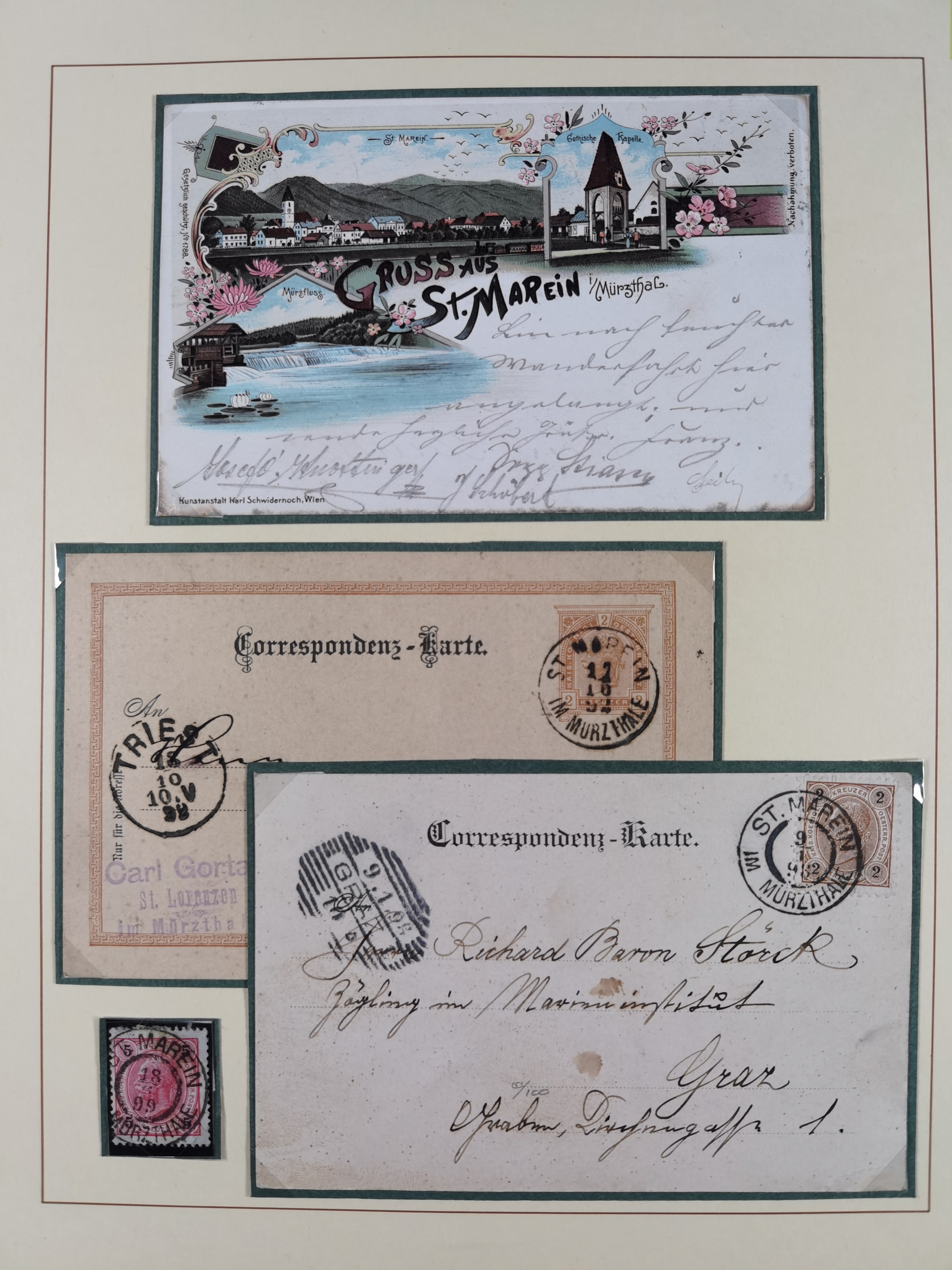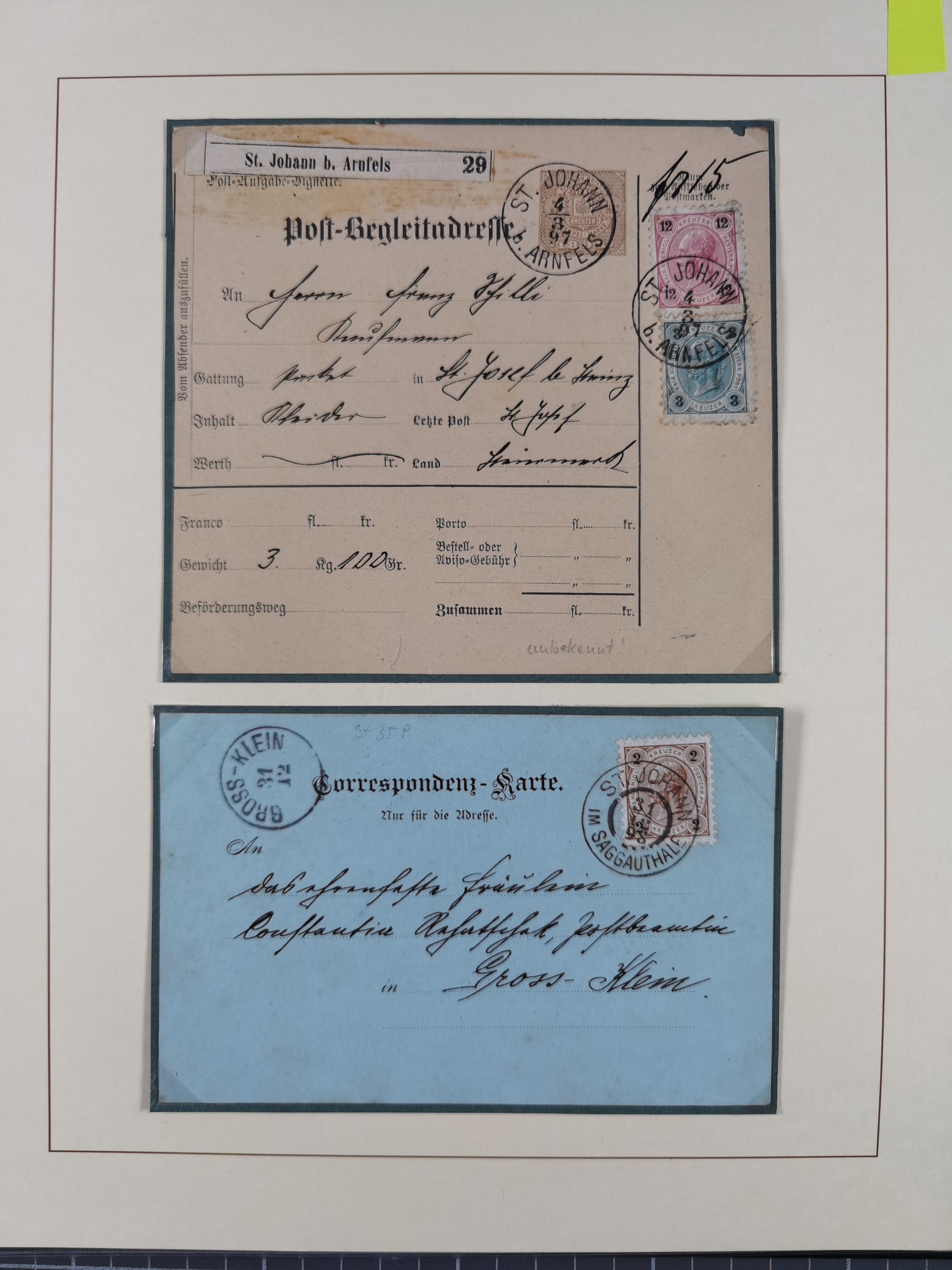 1870/1913 (ca.), umfangreiche aufgezogene Heimat-Sammlung “Herzogtum Steiermark (Styria)”, Bruck bis Windischgraz, mit über 1400 Briefen und Karten, bessere Frankaturen, Ansichtkarten und Illustriertenkarten mit Lithos, Paketkarten und Postscheine, R-Briefe, Ortsbriefe, Ganzsachenkarten- und Umschläge, etc., Schwerpunkt bei den Ausgaben 1883 bis 1899, schöne Auswahl an Poststempeln inkl. Fingerhutstempeln und handschriftlicher Entwertungen, dabei u.a. Express-Ganzsachekarte mit Zufrankatur aus “IRDNING 7 2 97” nach Wörschach, etc., sowie zahlreiche lose Marken und Briefstücke mit meist klaren Stempel-Abschlägen. Ein außerordentlich reichaltiges und interessantes Objekt, zusammen in 22 Alben