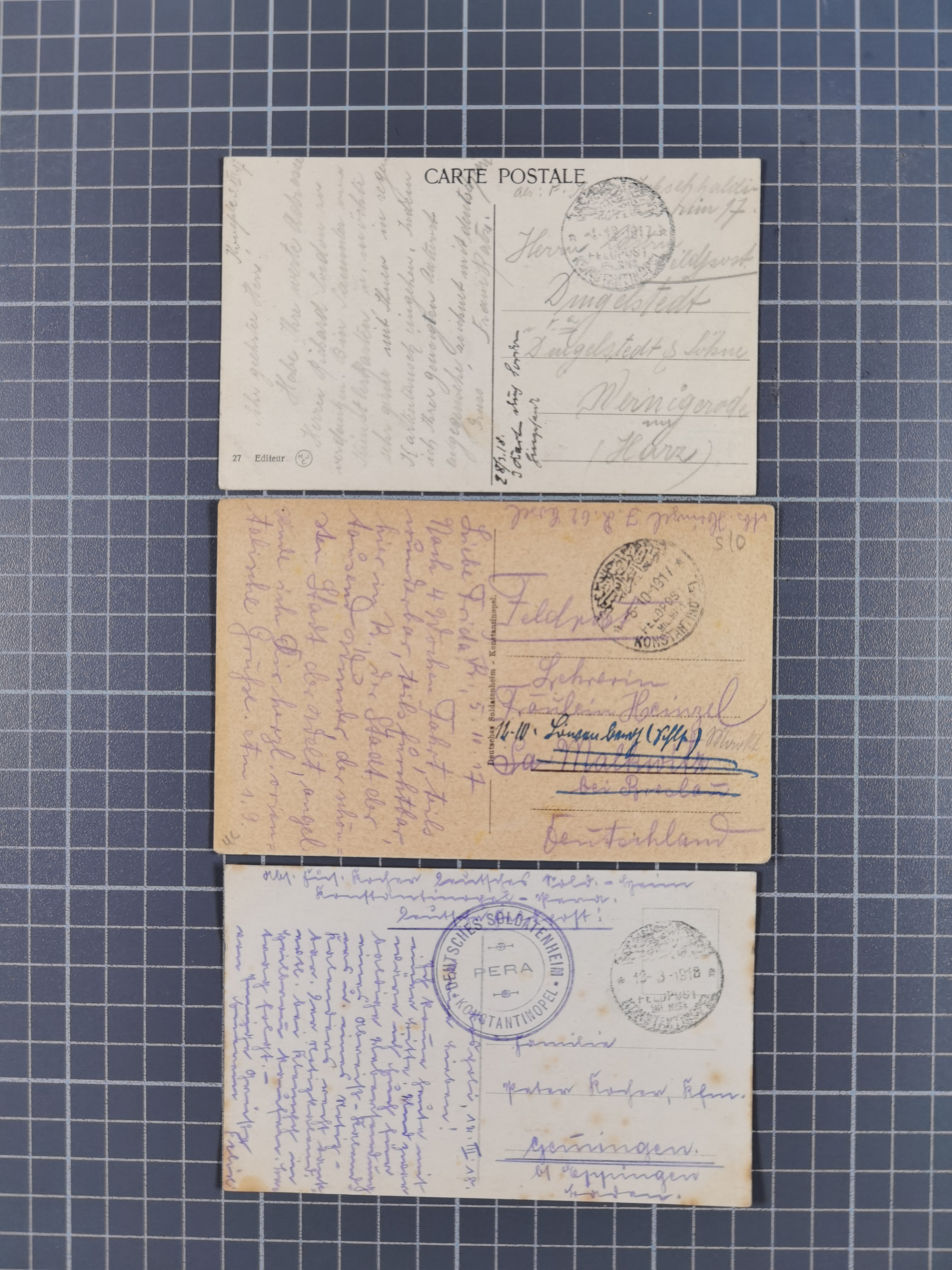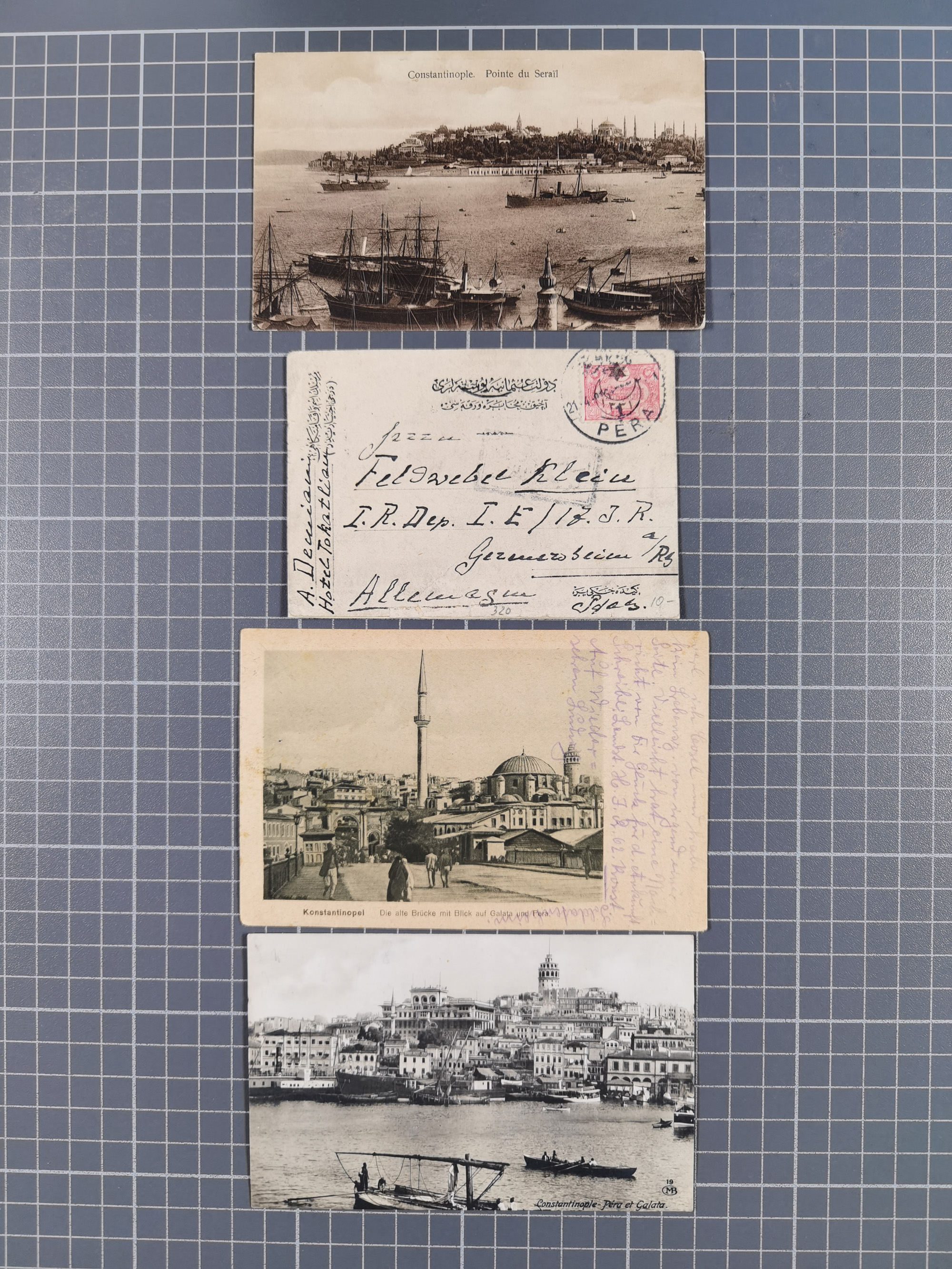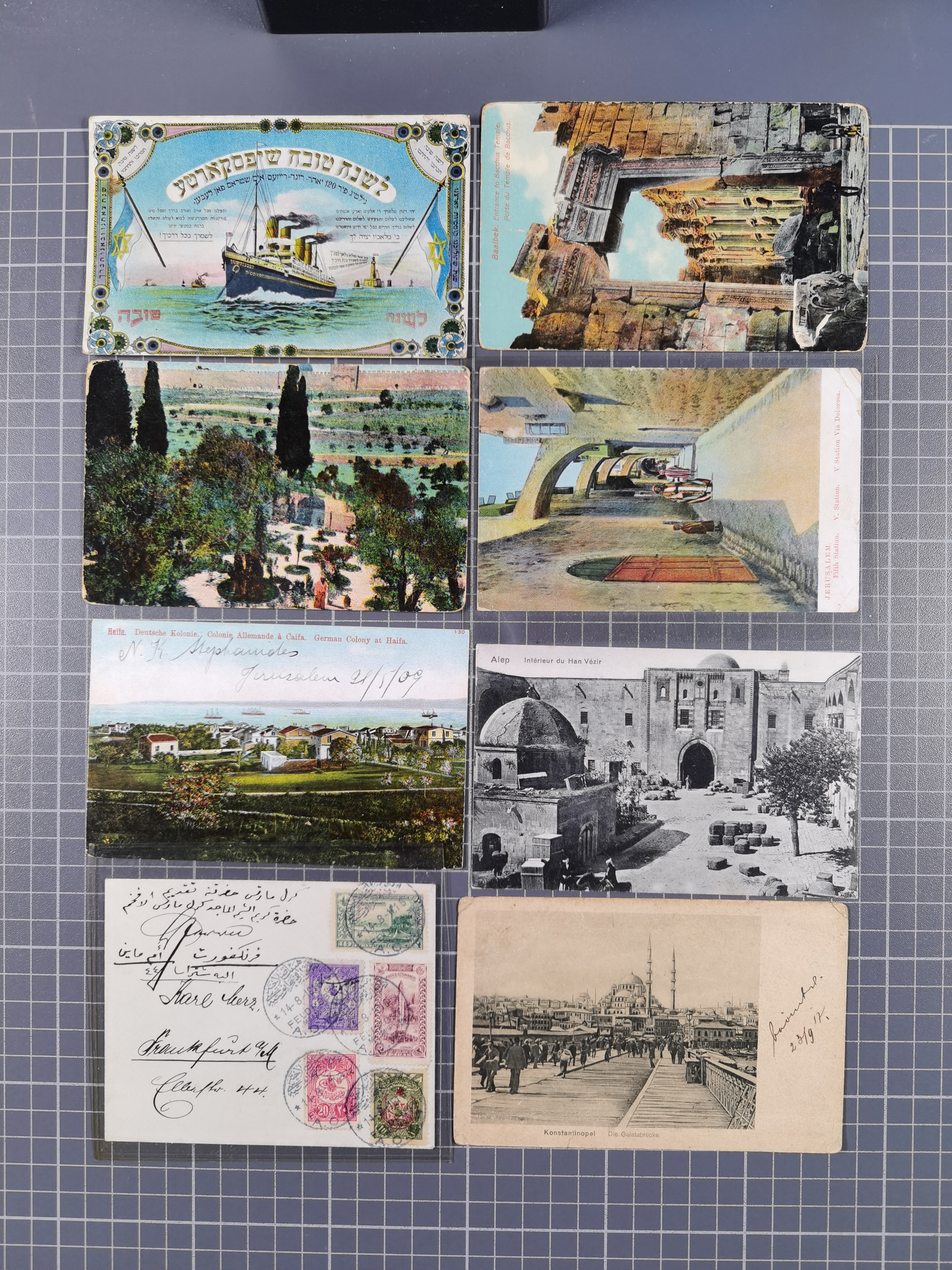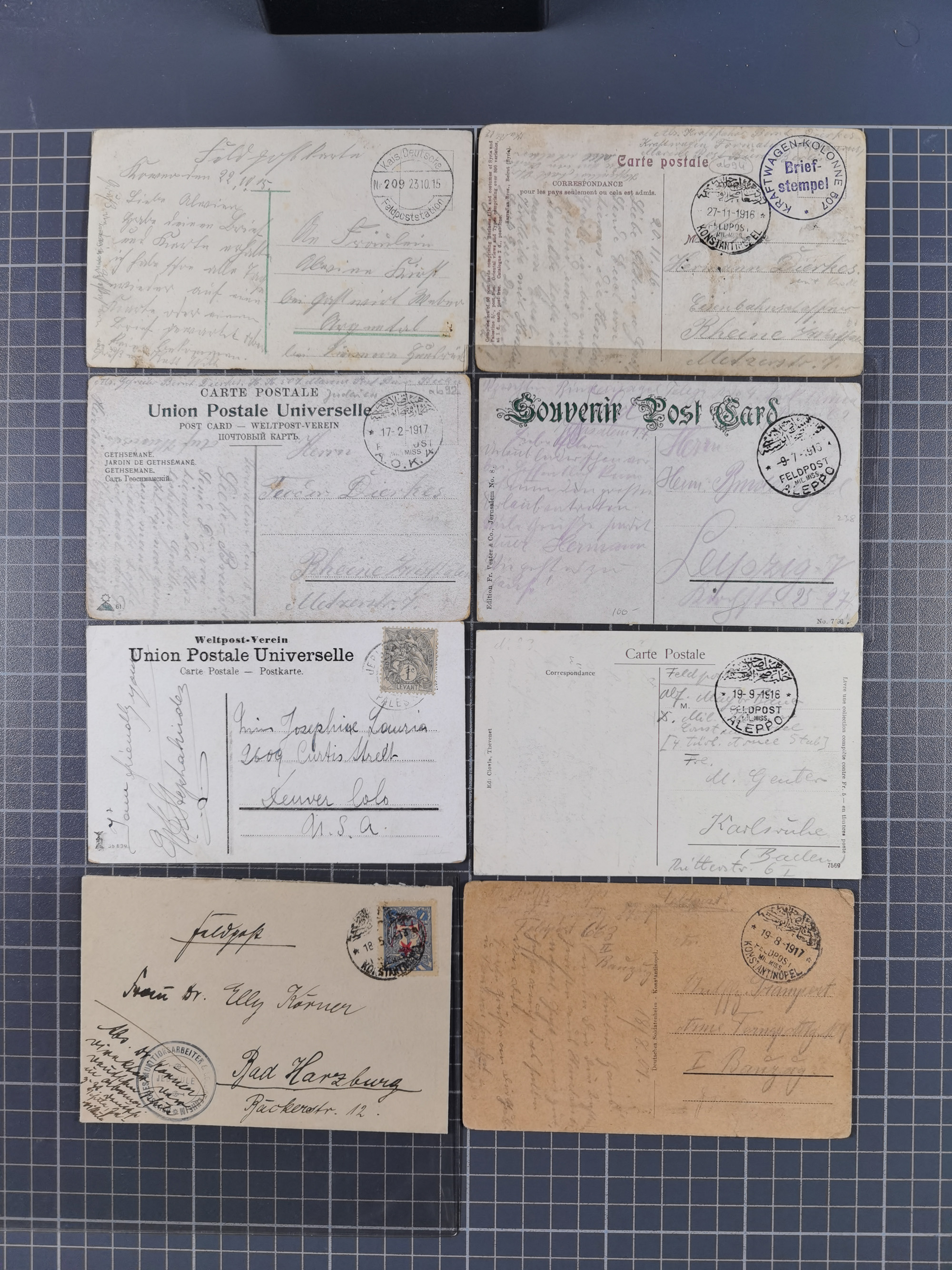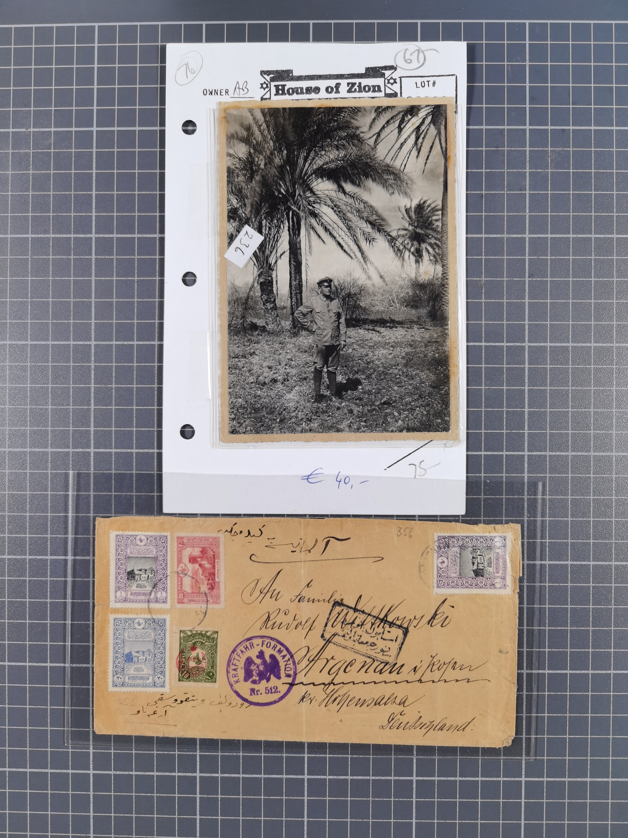 1914/18, 17 Briefe, Karten und Fotos, teils aus Palästina mit AK Deutsche Kolonie Haifa, Bade- ud Entlausungsanstalt, Mil.Miss. Aleppo, A.O.K.4 auch mit türkischer Frankatur, Nebenstempel Jedikule, Kraftfahrtformation Nr.512, Kraftfahrtkolonne 507, meist gut erhalten.