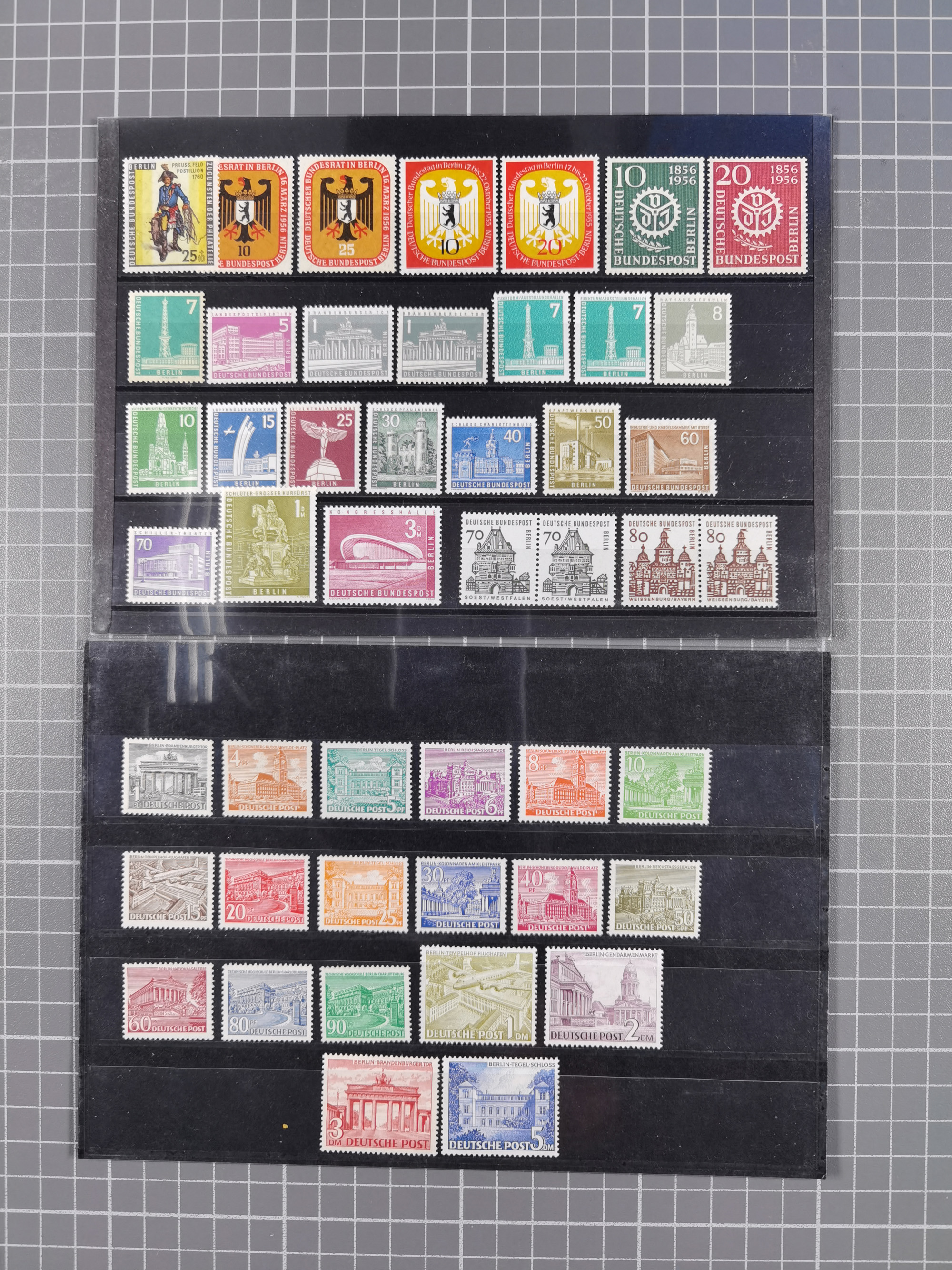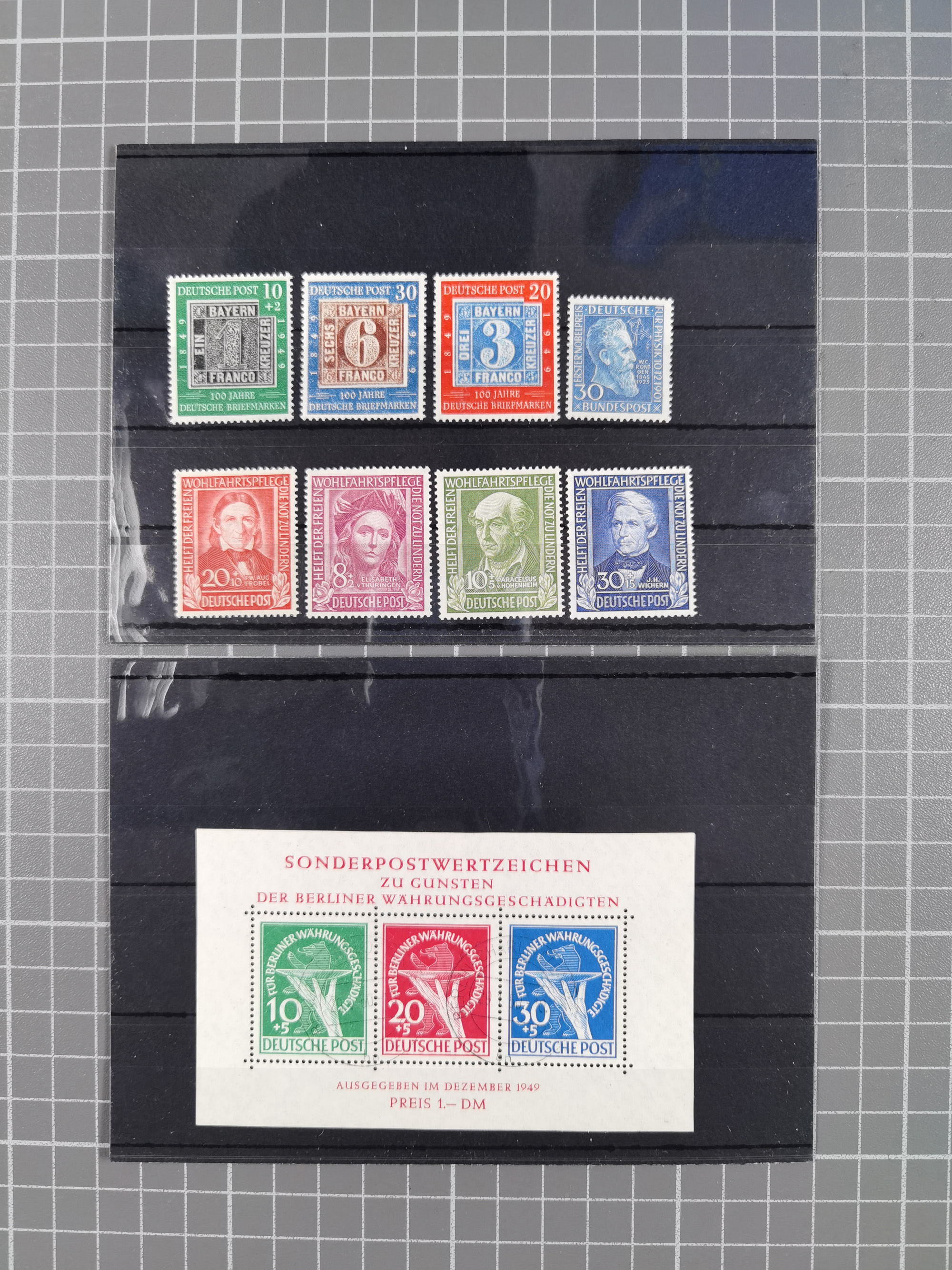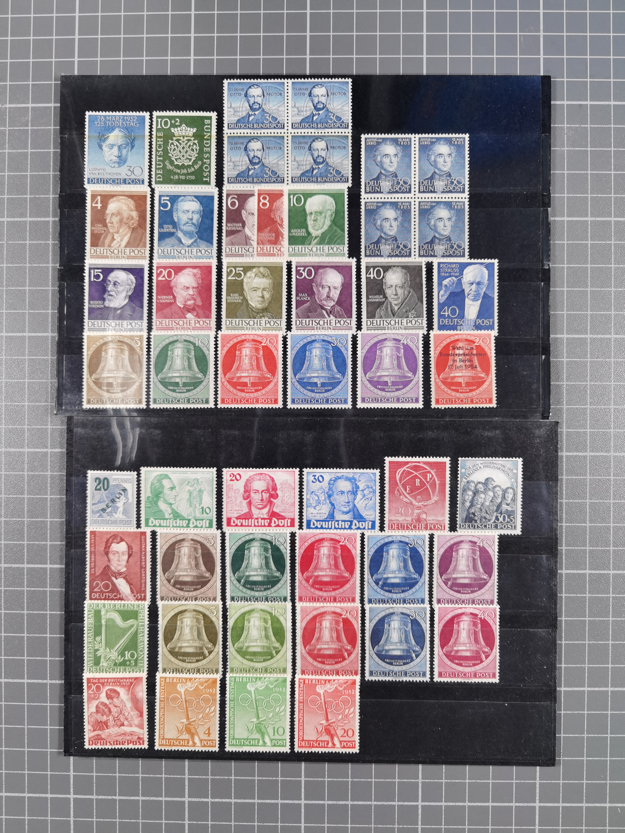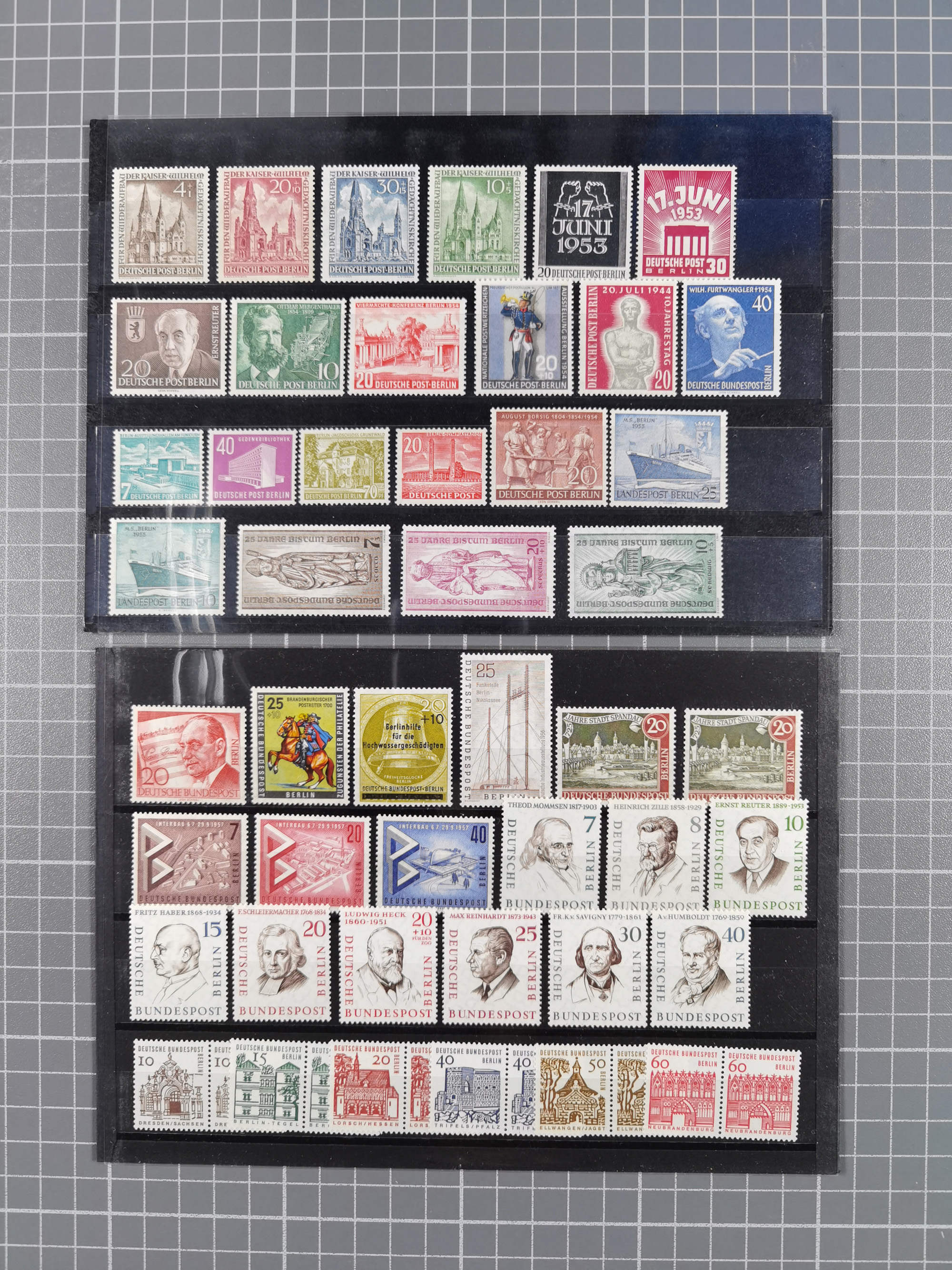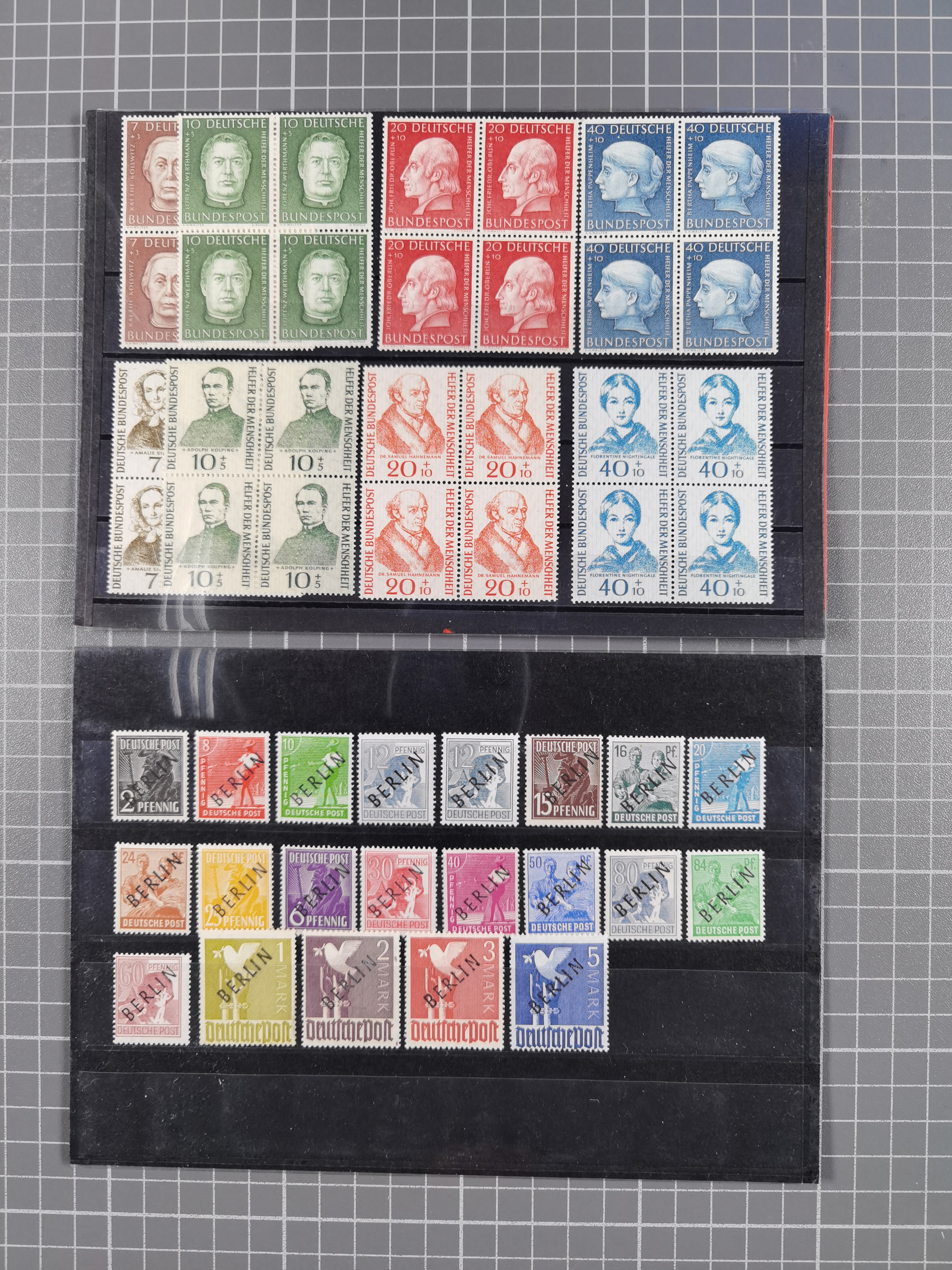 1949/60, Bestand auf Steckkarten mit Berlin Schwarzaufdrucke geprüft Schlegel, Goethe signiert Bühler, Helfer der Menschheit in Viererblöcken etc., meist sehr sauber erhalten.