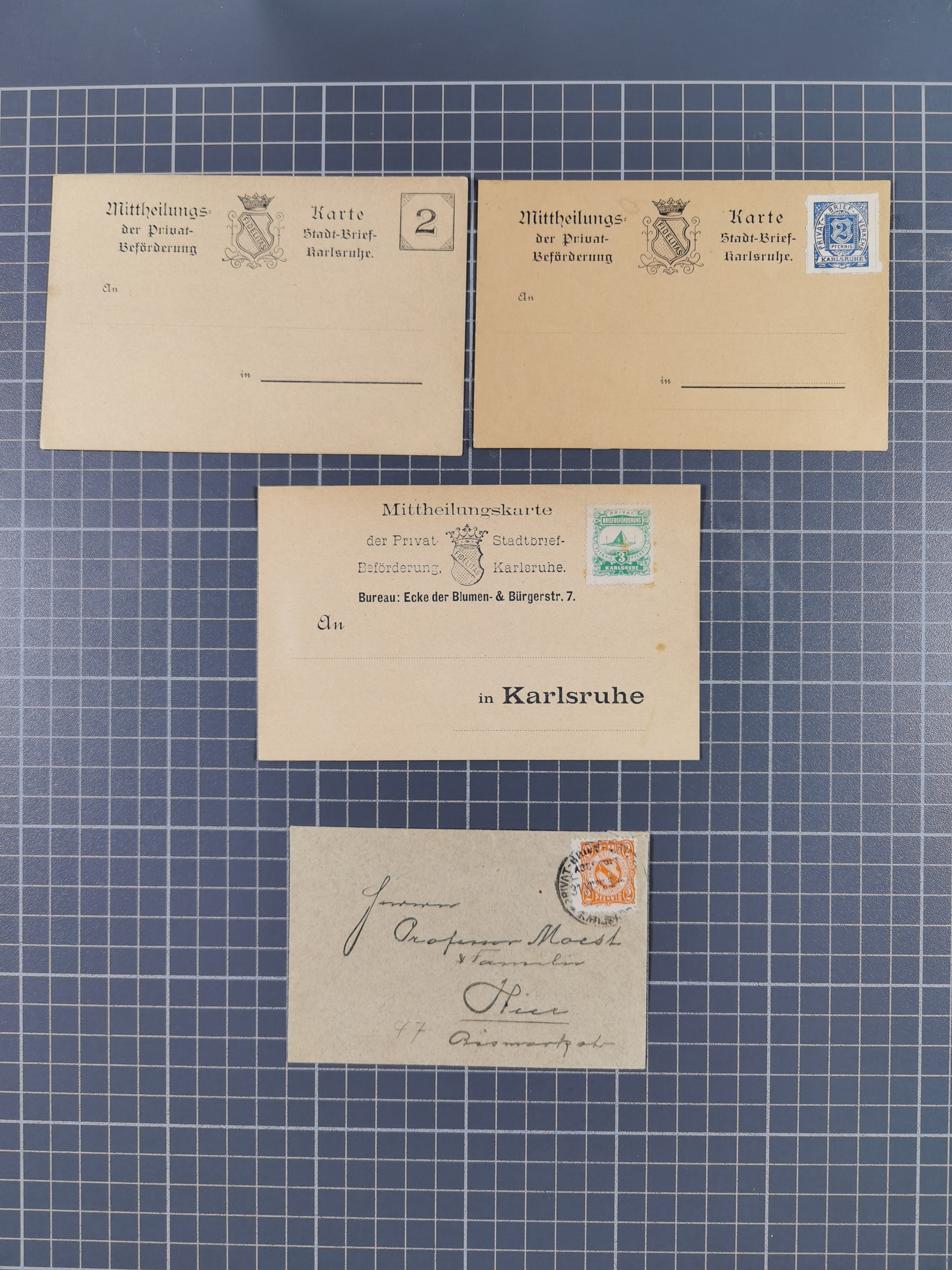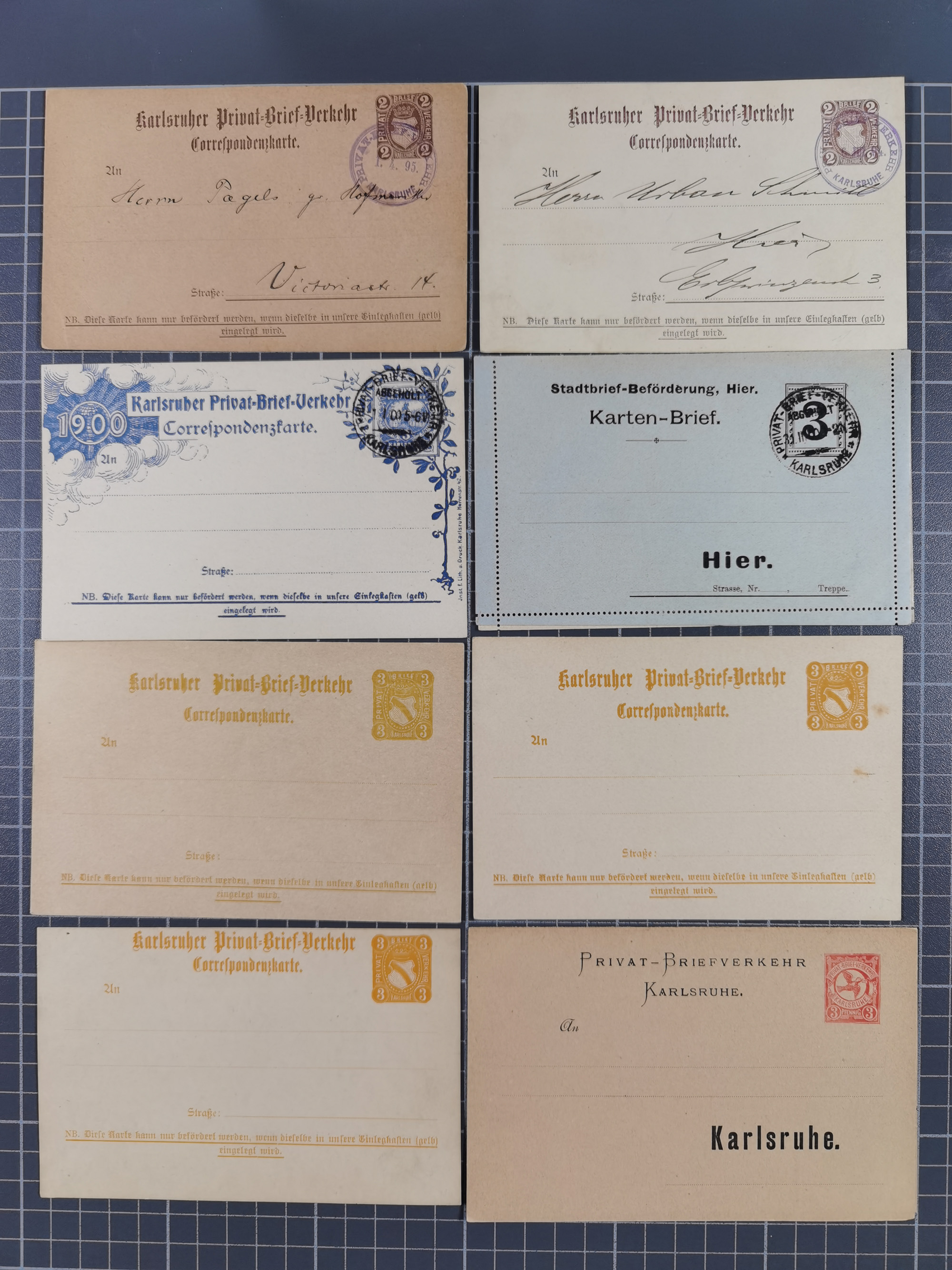 Karlsruhe, Partie mit 17 ungebrauchten/gebrauchten Ganzsachen und Postkarten-Formulare diverser Anstalten und Privat-Brief-Verkehr (Schmidt/Farrenkopf & Fritz) Mi.-Nr. 5B auf Brief. Dabei u.a. P1 und P2 gebraucht, meist in guter Erhaltung