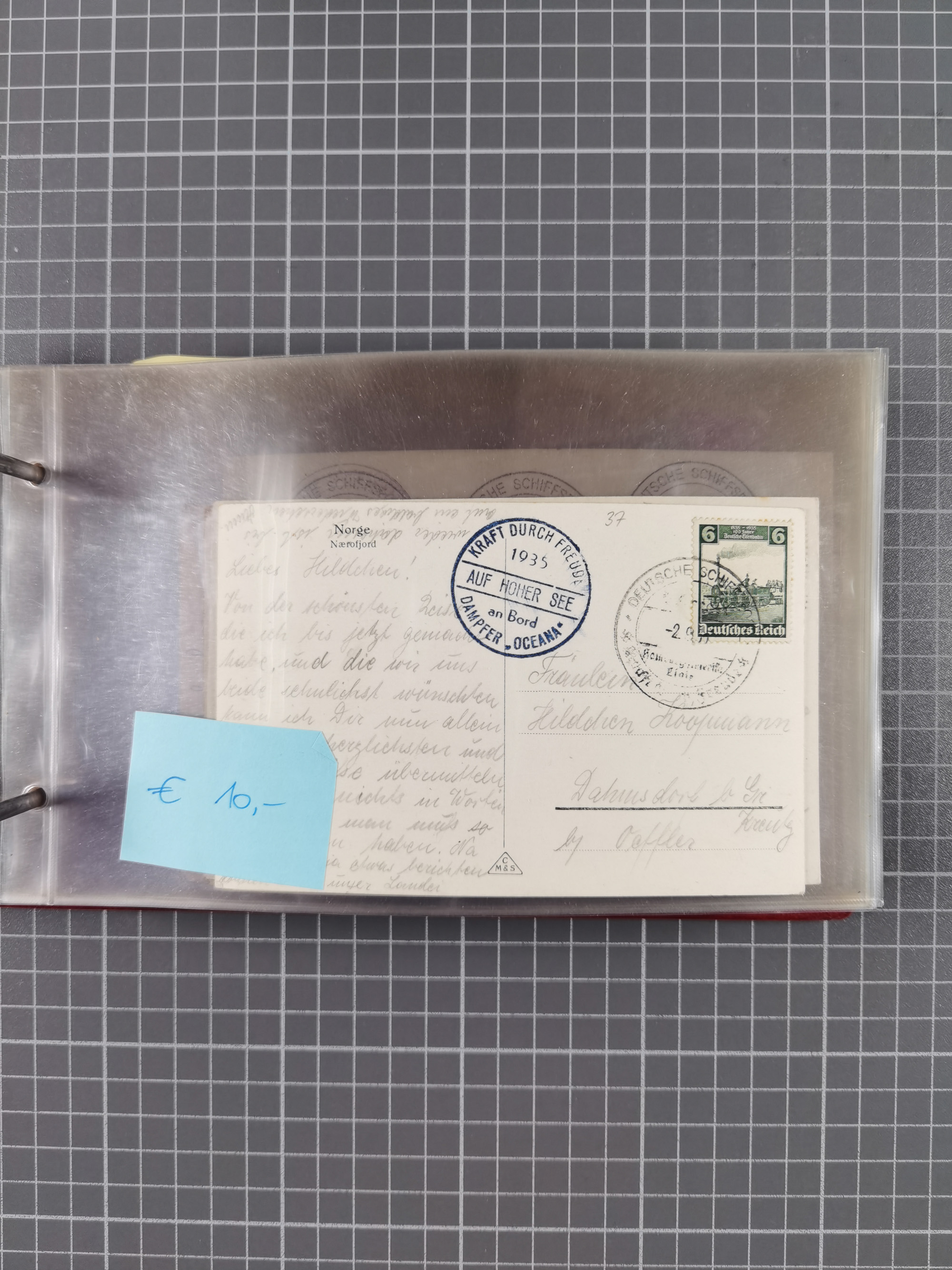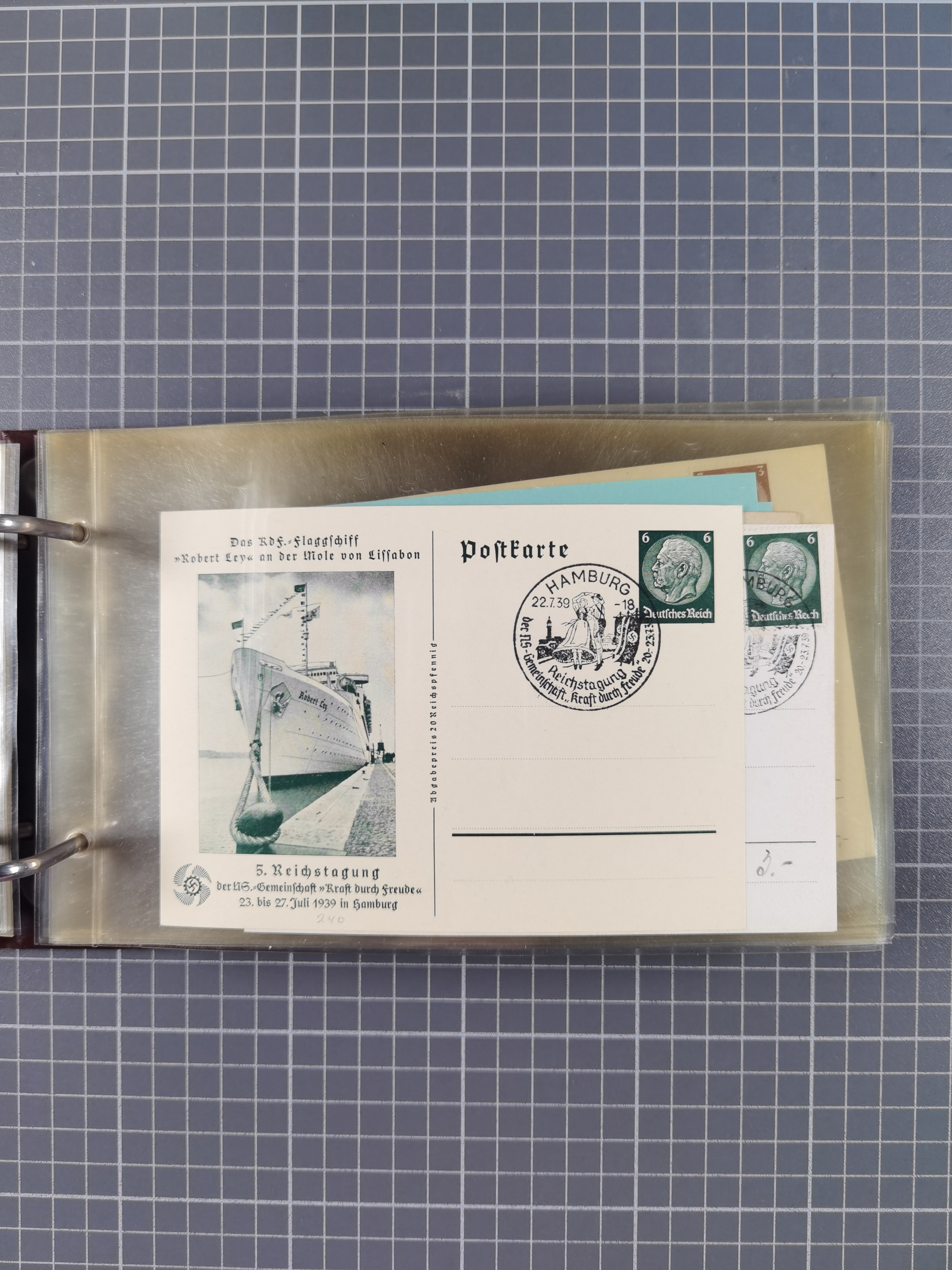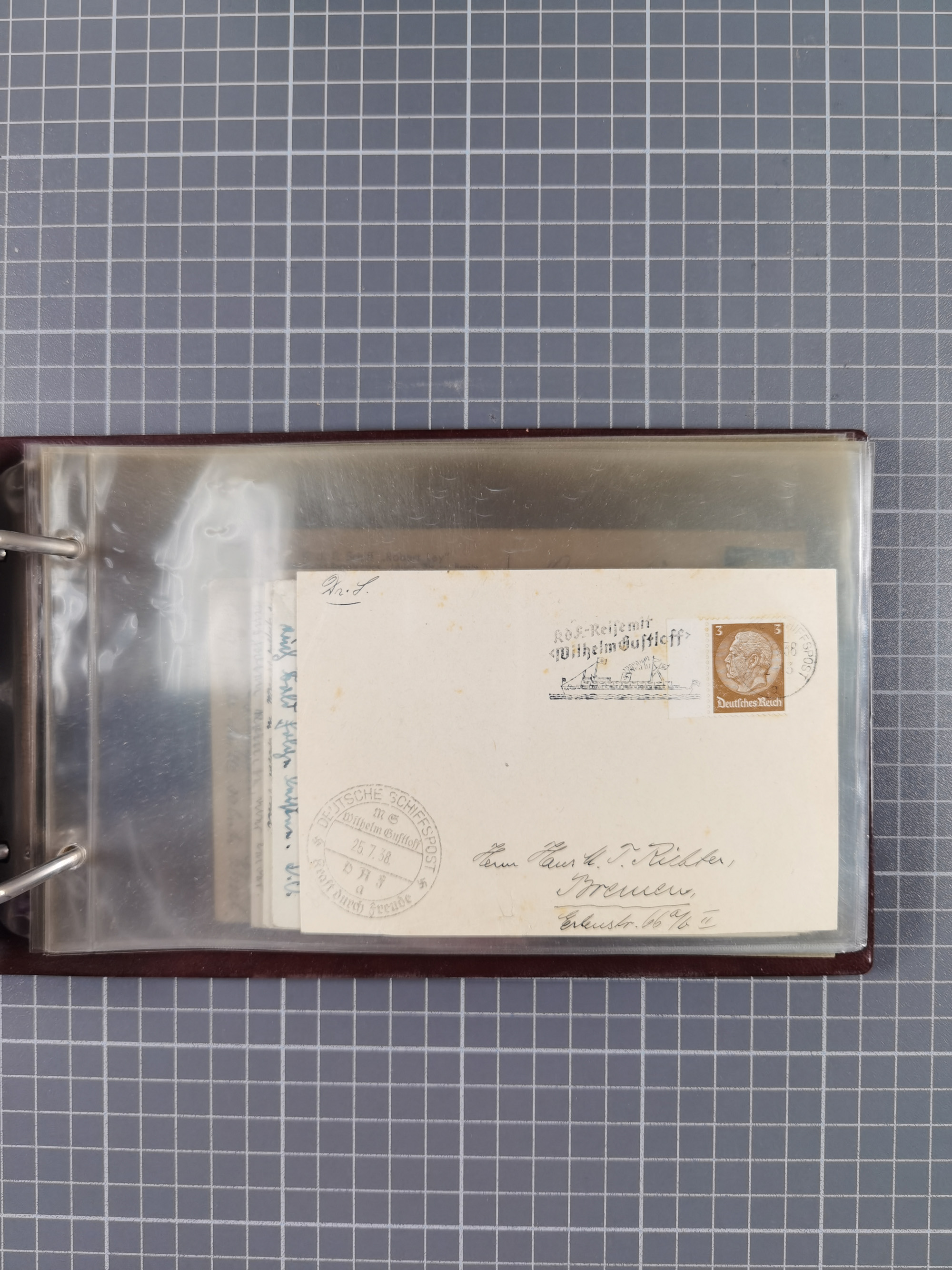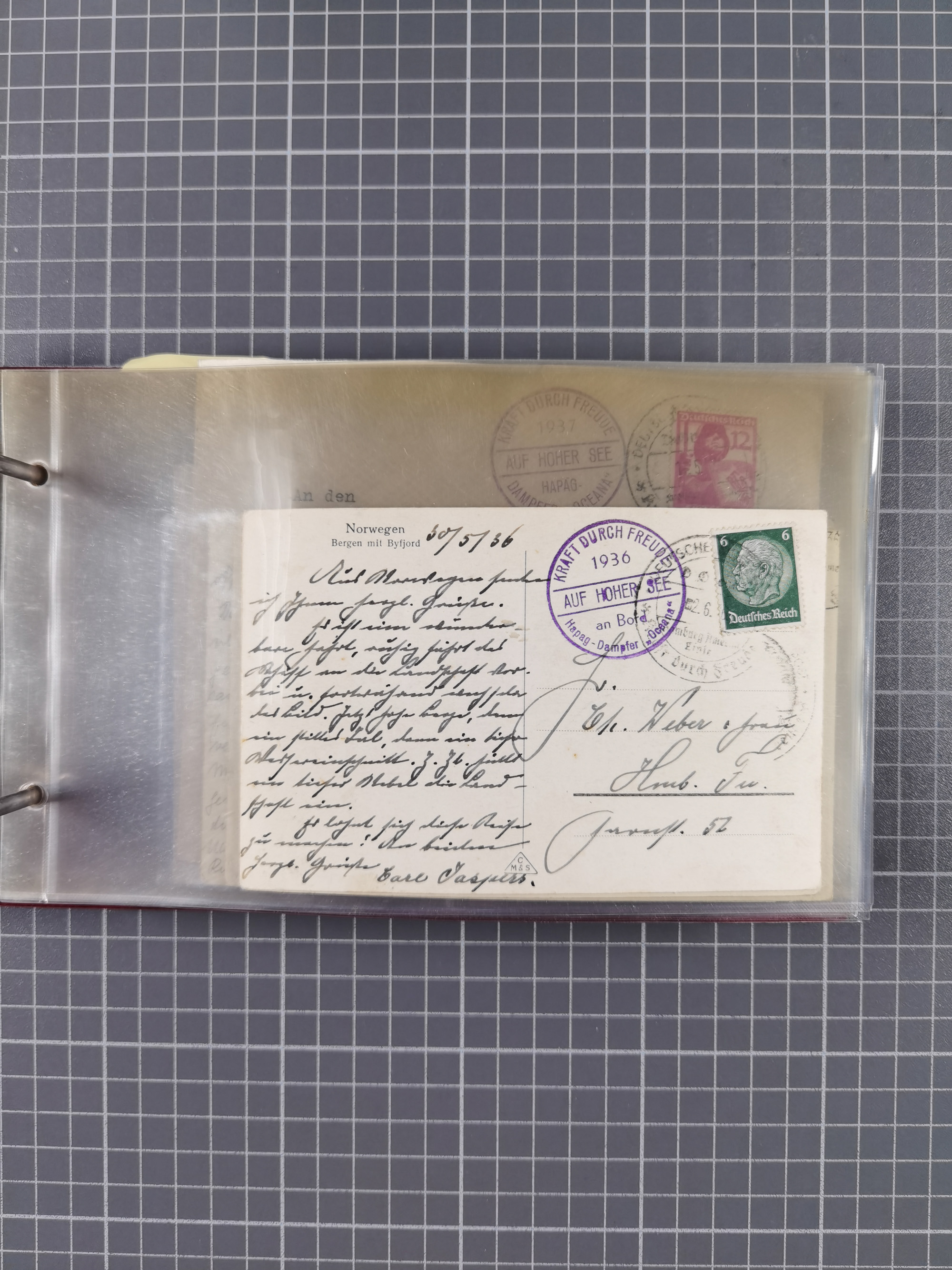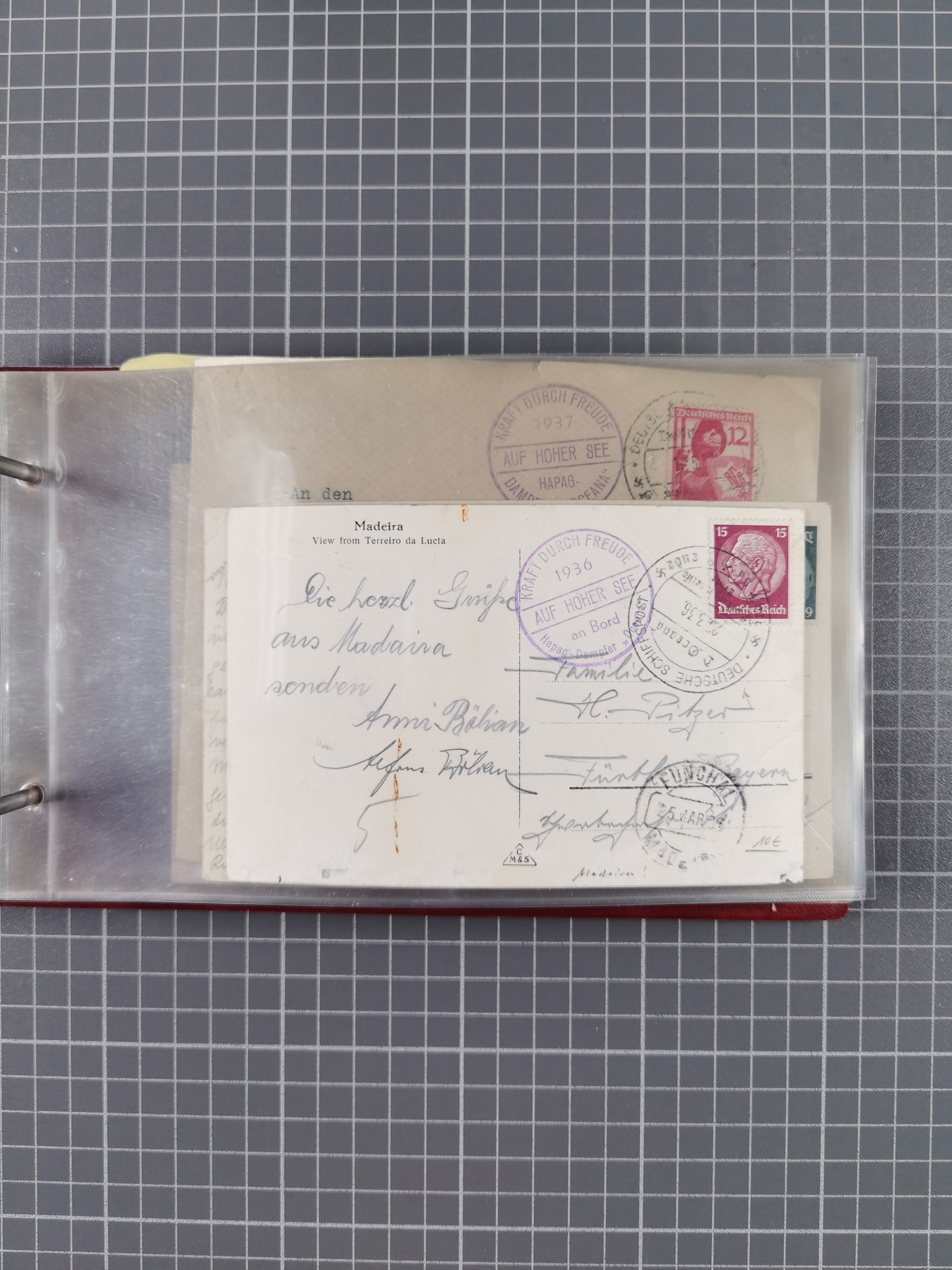 1934/39, Sammlung “Kraft durch Freude” mit ca. 240 Briefen, Karten und GSK inkl. Stempel des "LLOYD BREMEN", dazu Fotos, Schiffsansichtskarten, Speisekarten usw., sauber in vier Alben, ex Steinmeyer