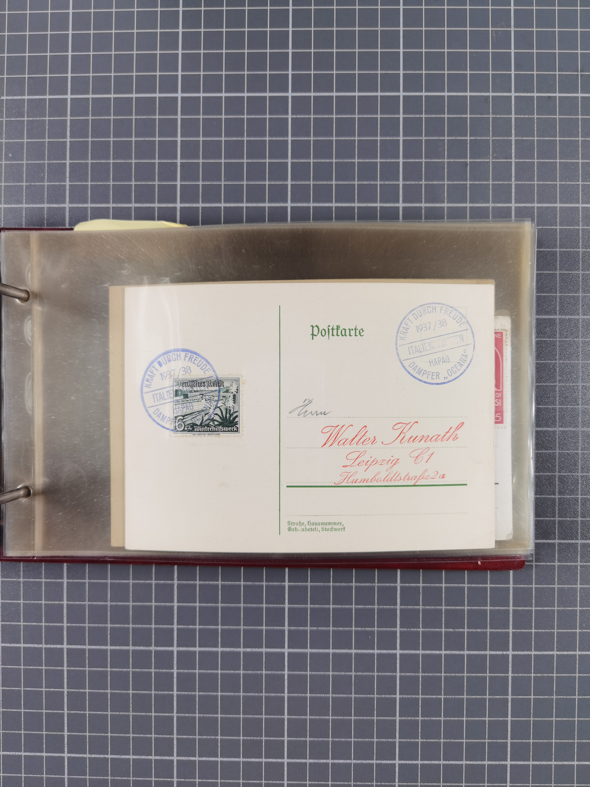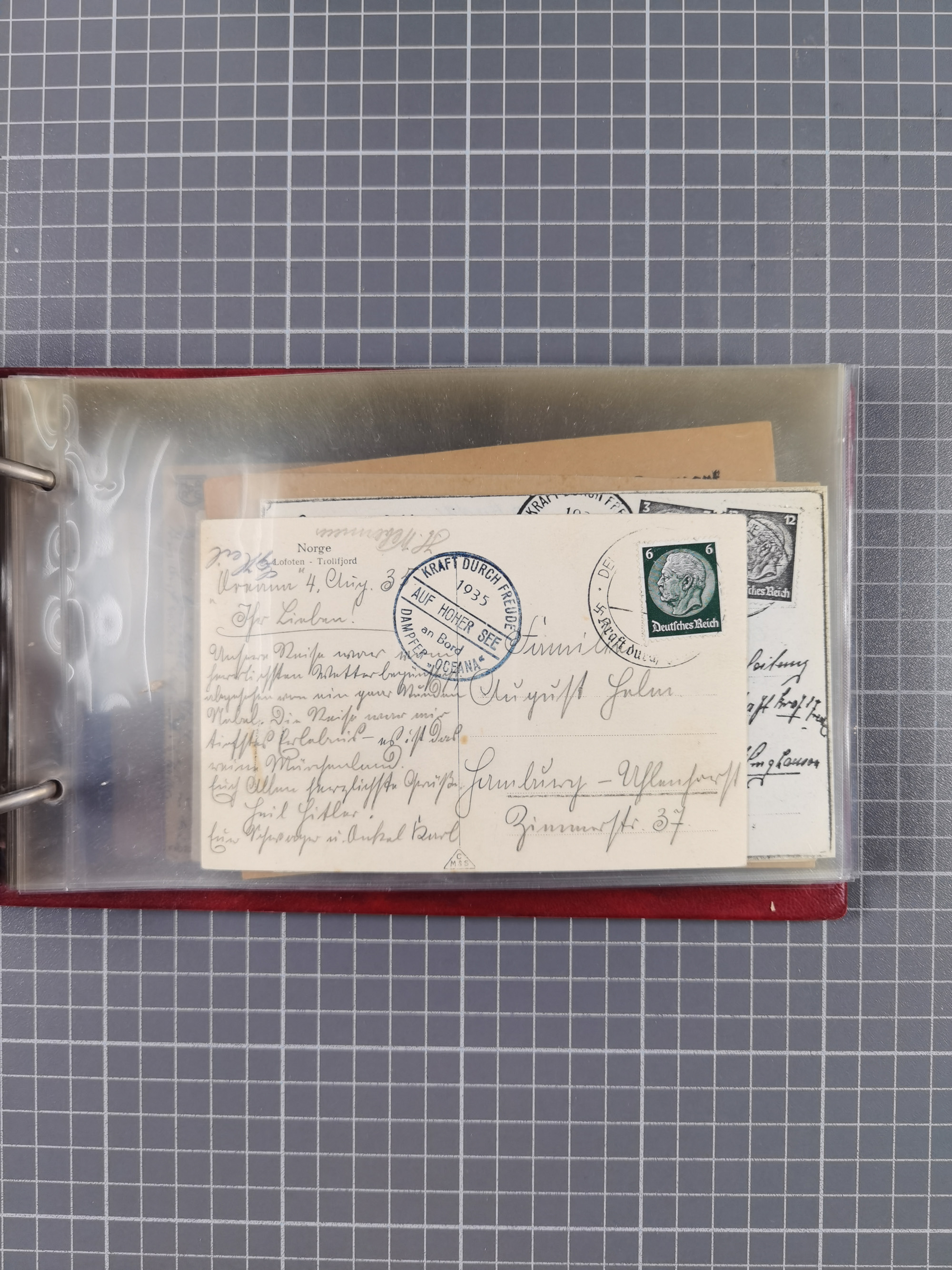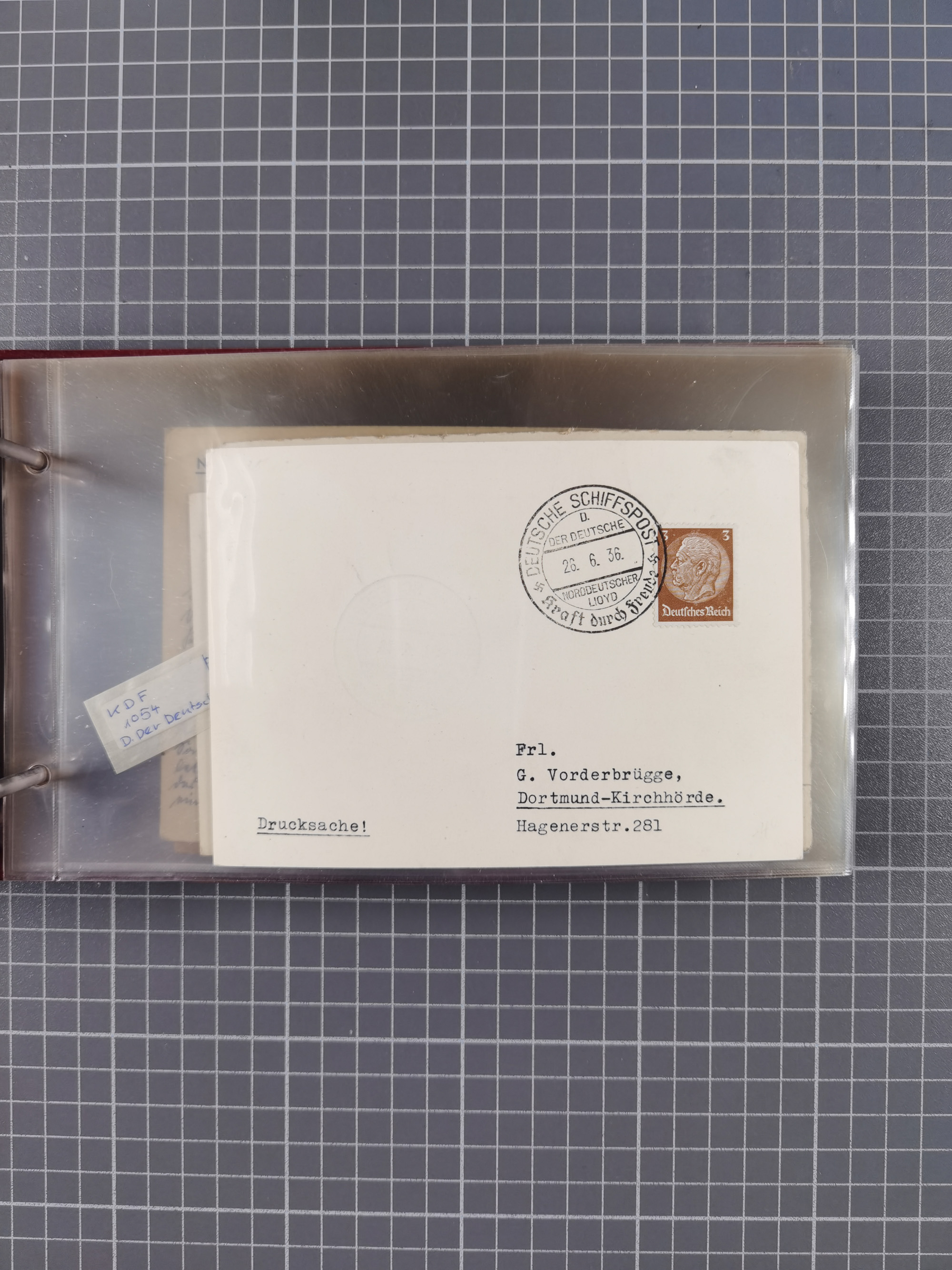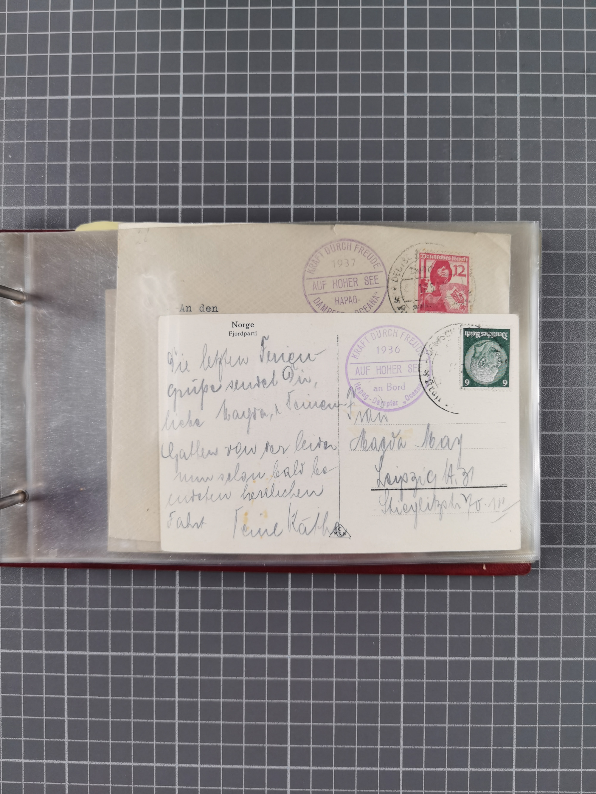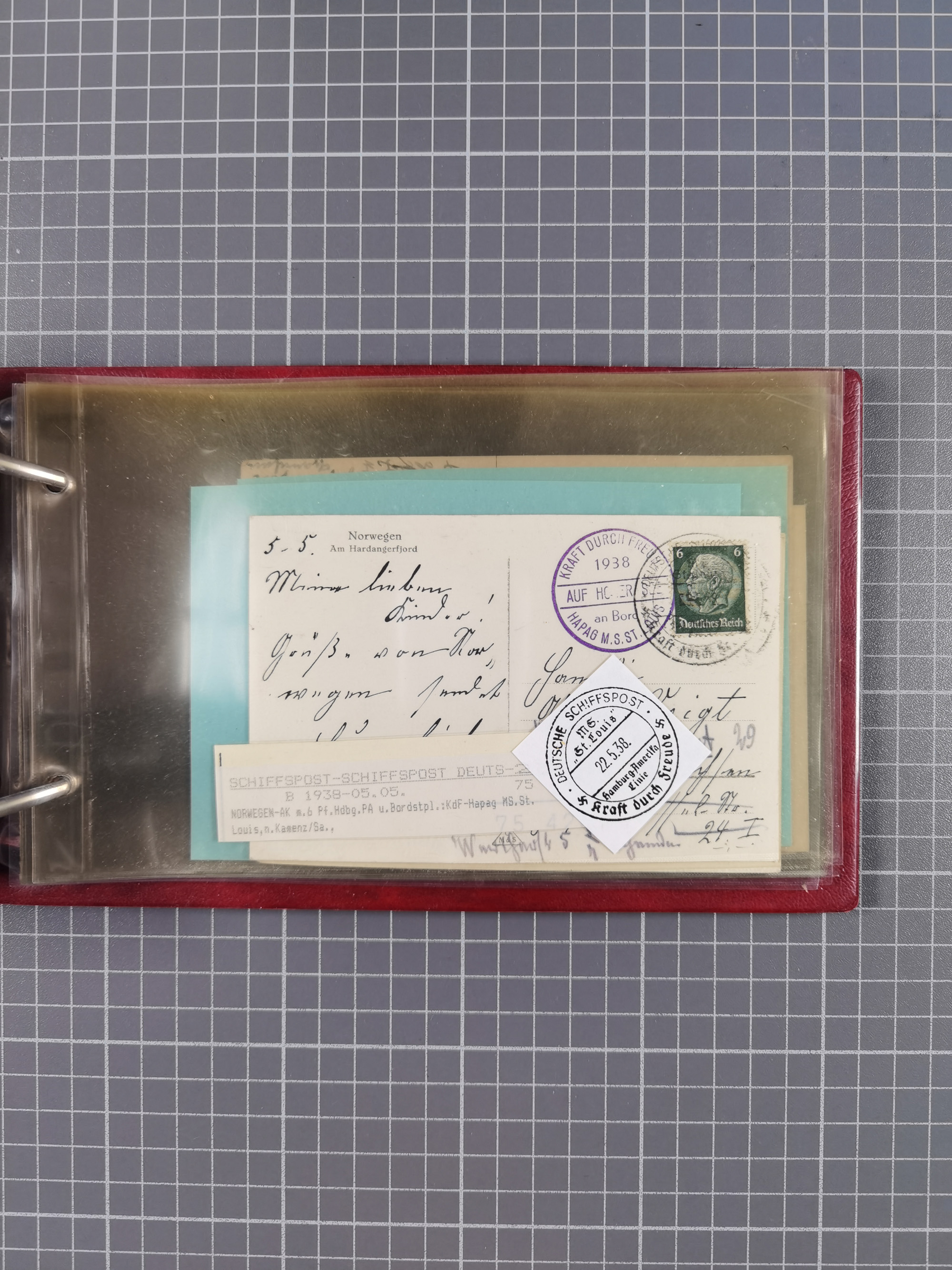1934/39, Sammlung “Kraft durch Freude” mit ca. 240 Briefen, Karten und GSK inkl. Stempel des "LLOYD BREMEN", dazu Fotos, Schiffsansichtskarten, Speisekarten usw., sauber in vier Alben, ex Steinmeyer
