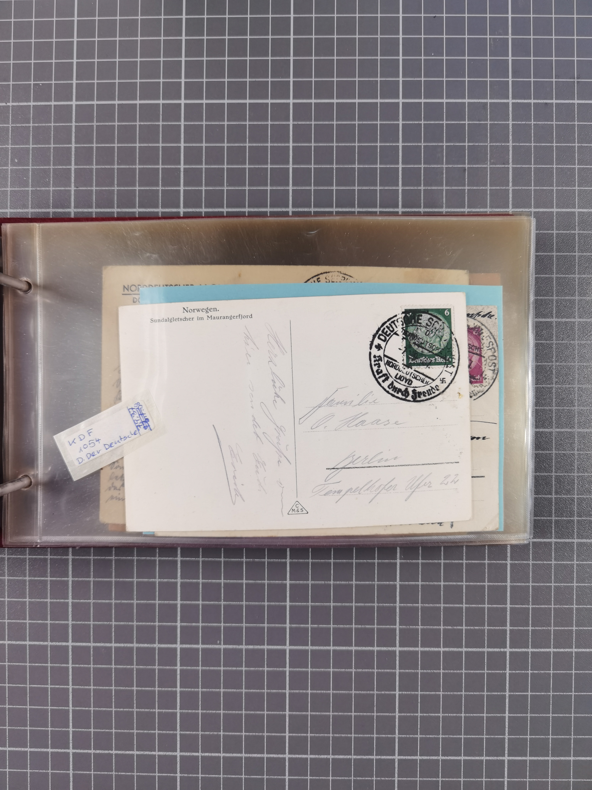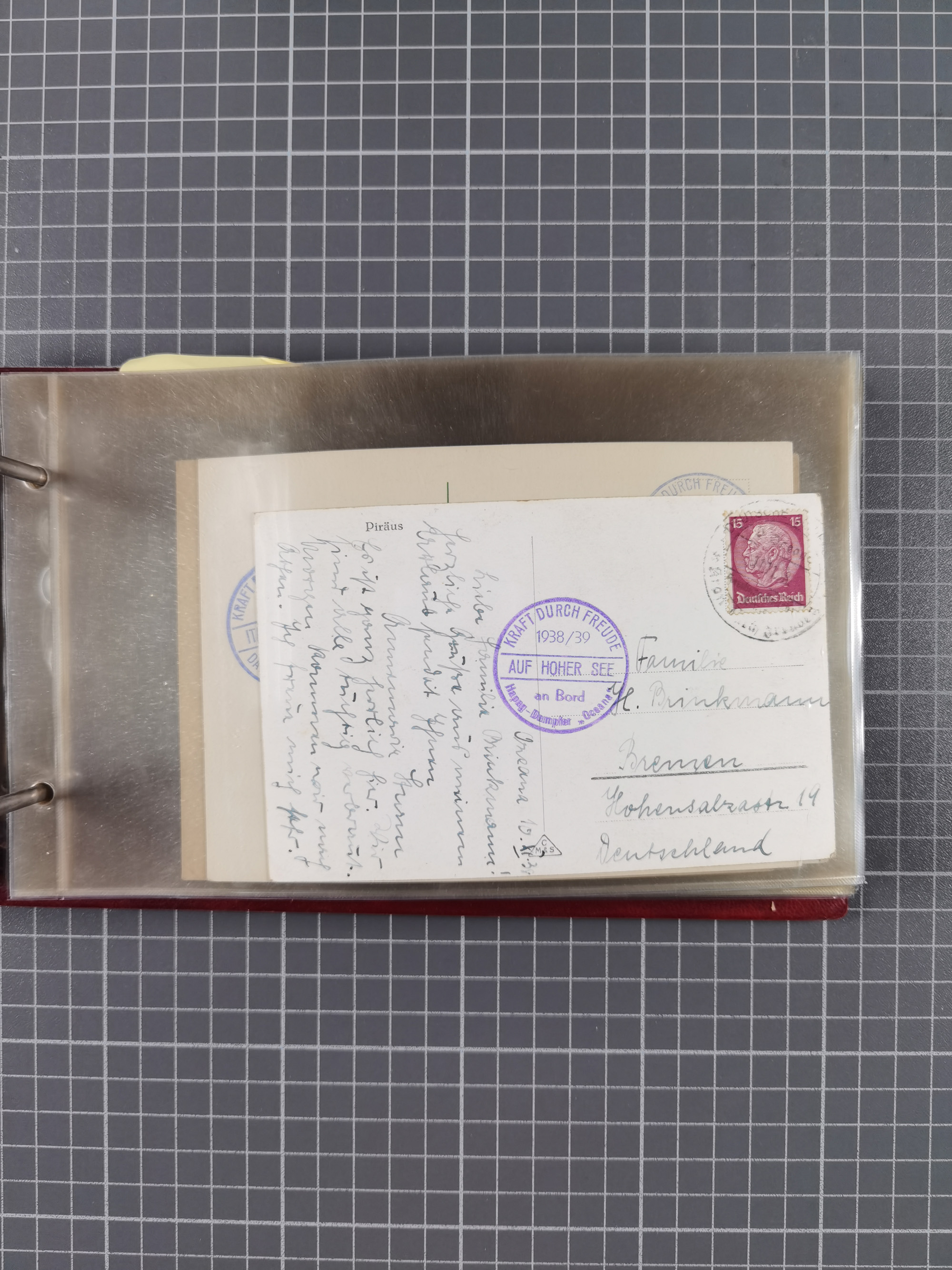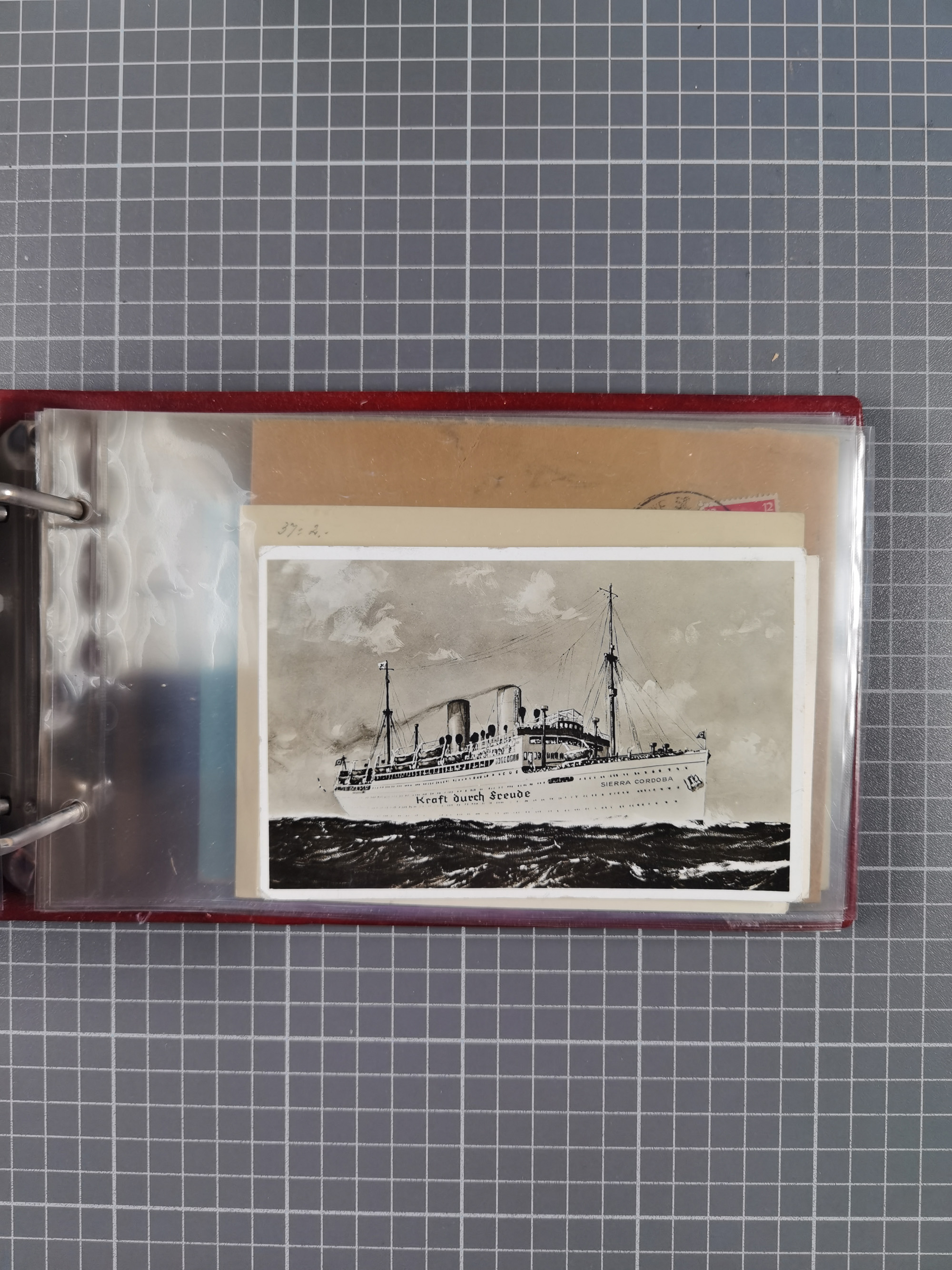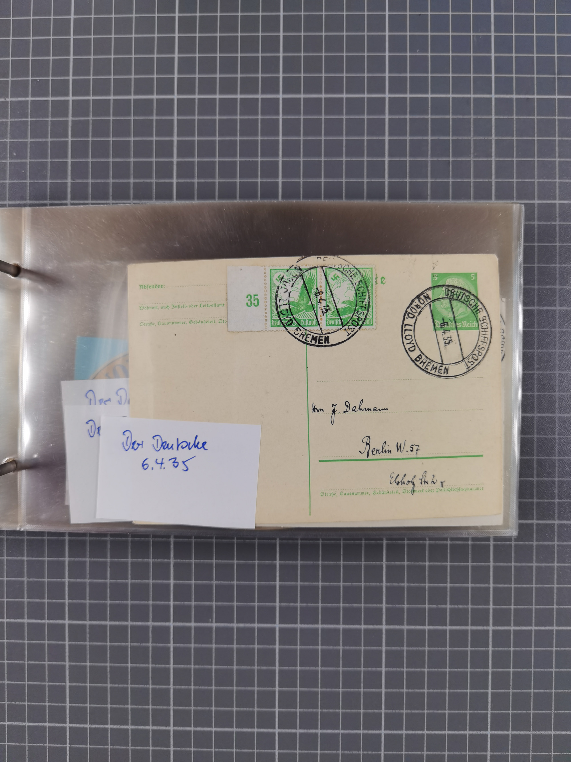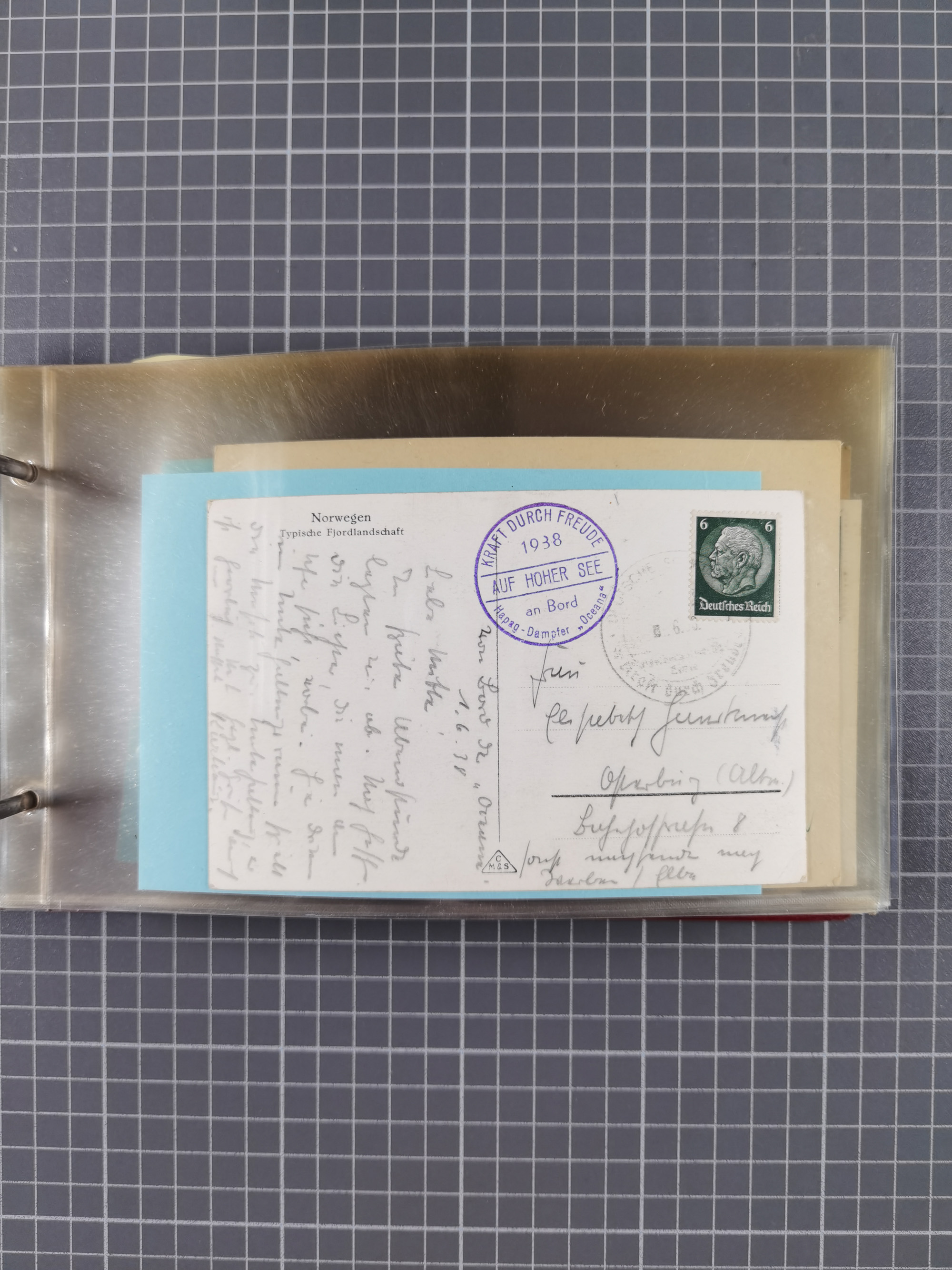 1934/39, Sammlung “Kraft durch Freude” mit ca. 240 Briefen, Karten und GSK inkl. Stempel des "LLOYD BREMEN", dazu Fotos, Schiffsansichtskarten, Speisekarten usw., sauber in vier Alben, ex Steinmeyer