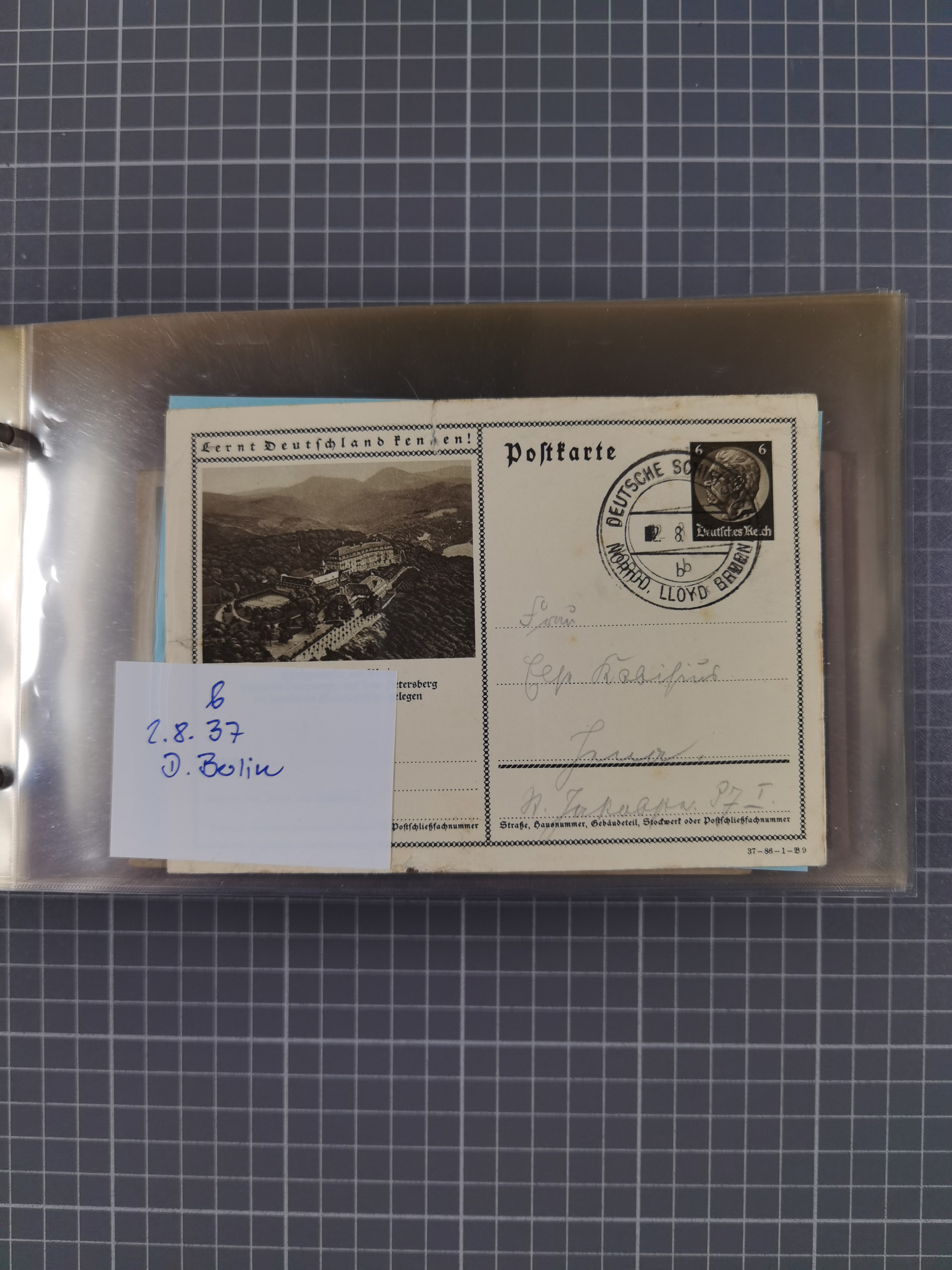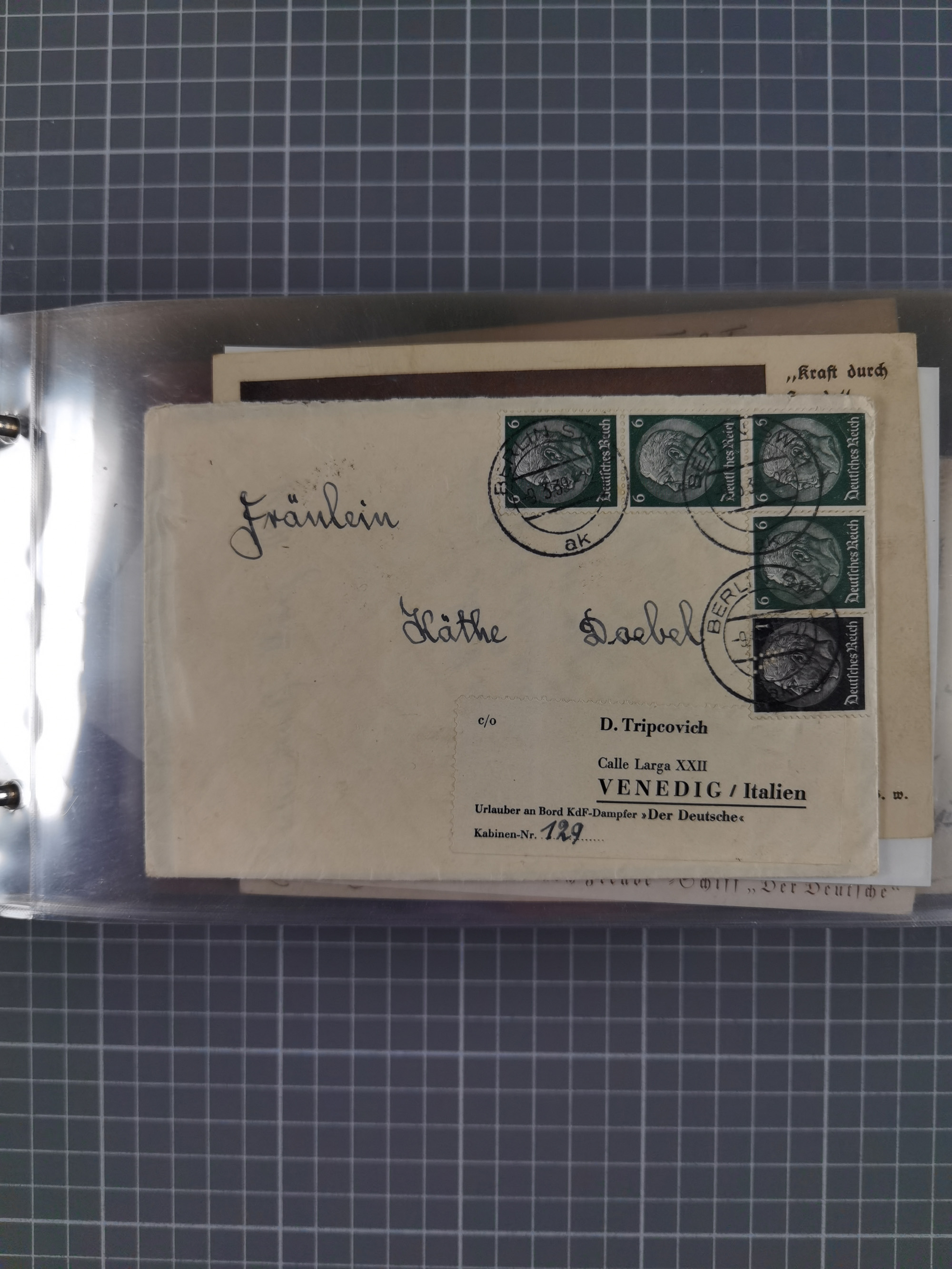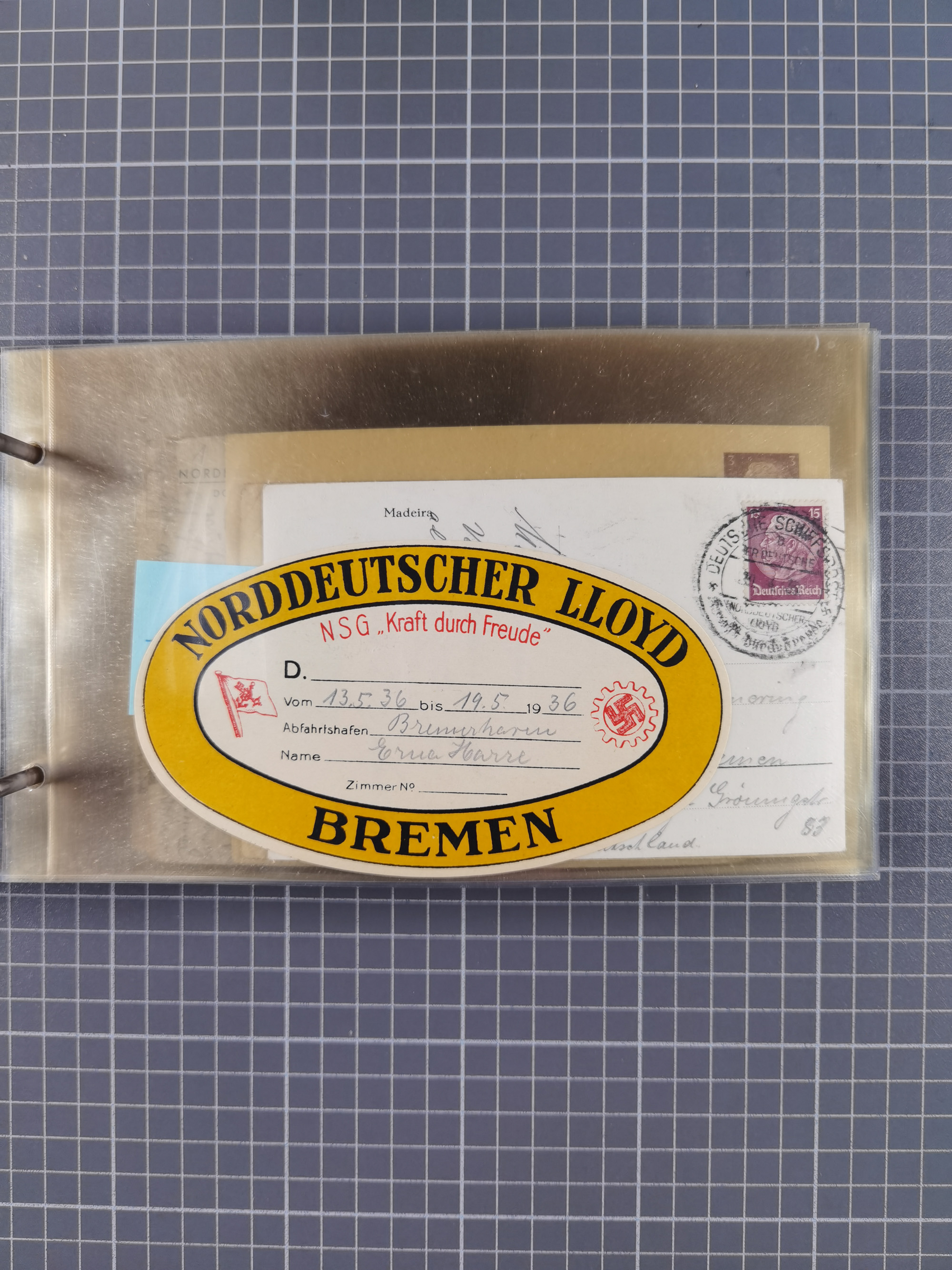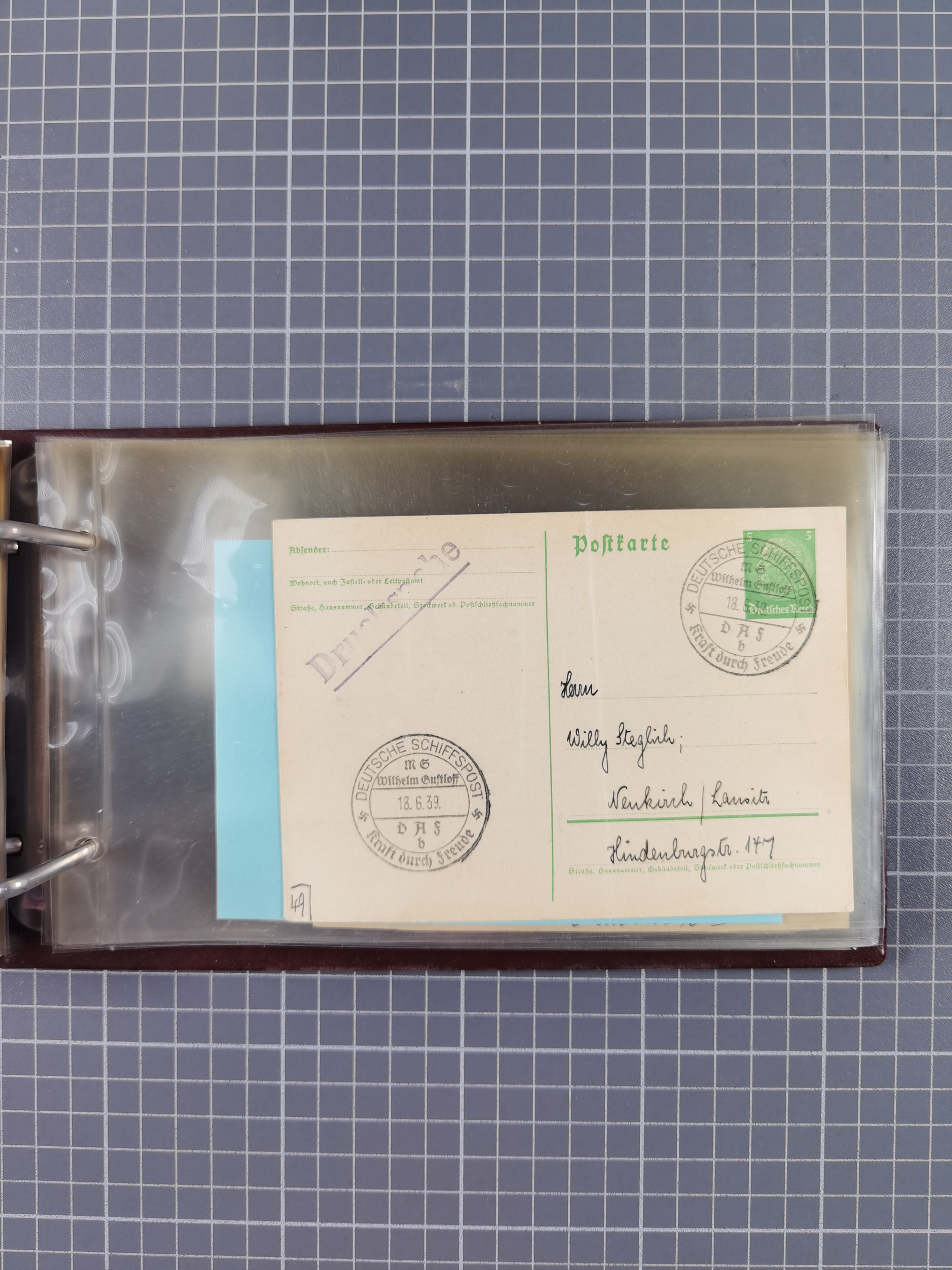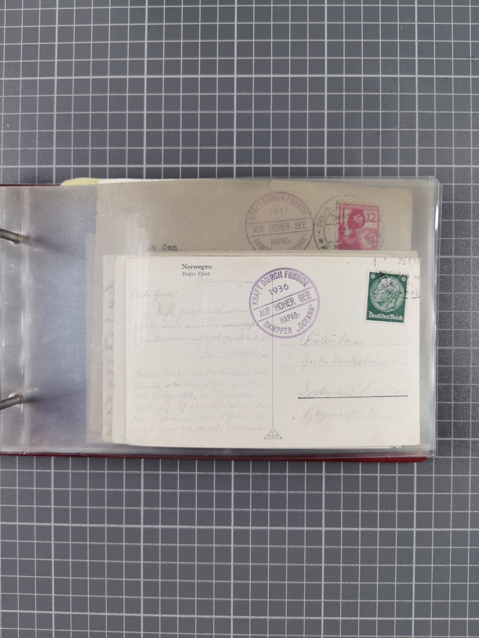 1934/39, Sammlung “Kraft durch Freude” mit ca. 240 Briefen, Karten und GSK inkl. Stempel des "LLOYD BREMEN", dazu Fotos, Schiffsansichtskarten, Speisekarten usw., sauber in vier Alben, ex Steinmeyer