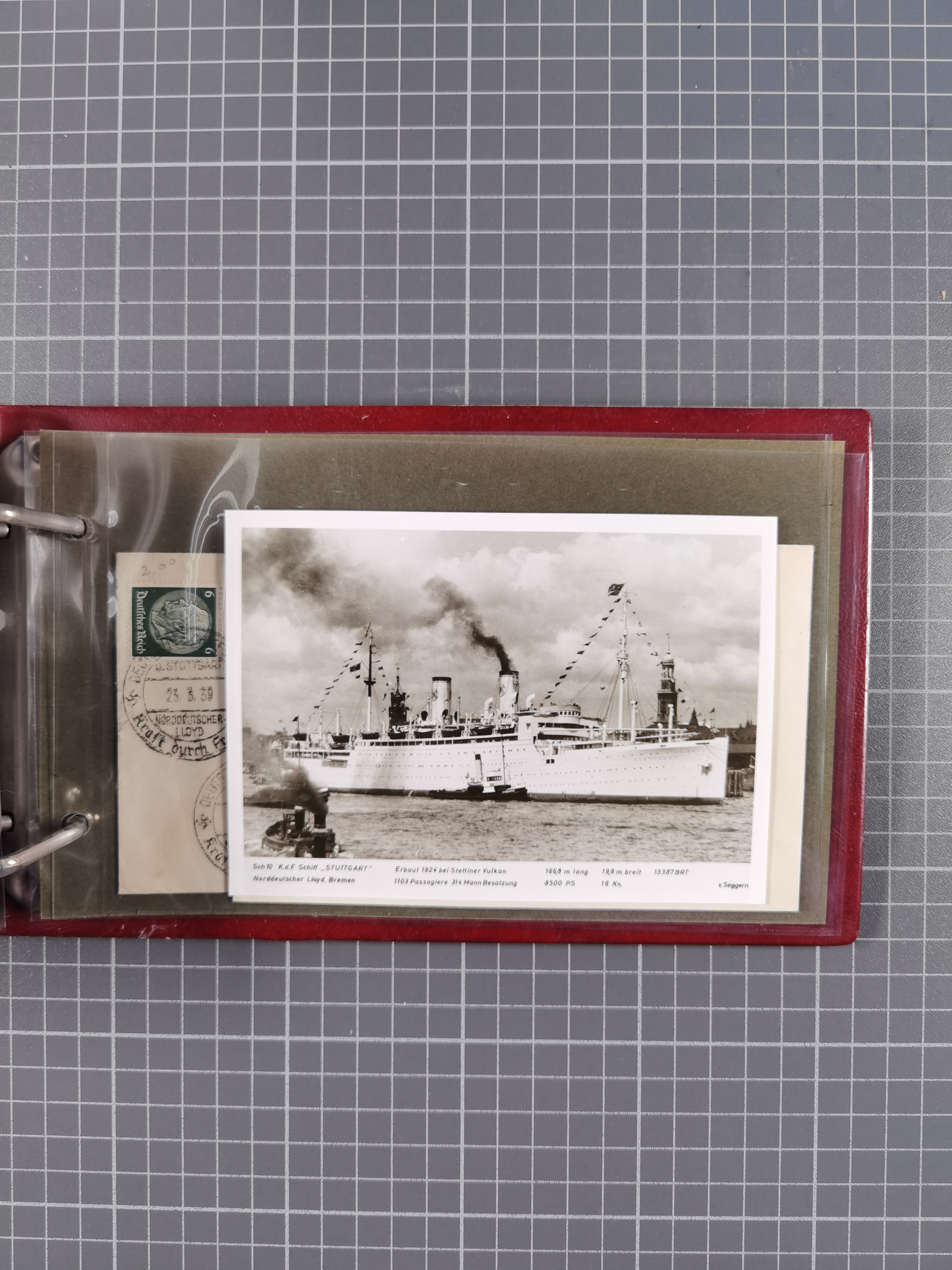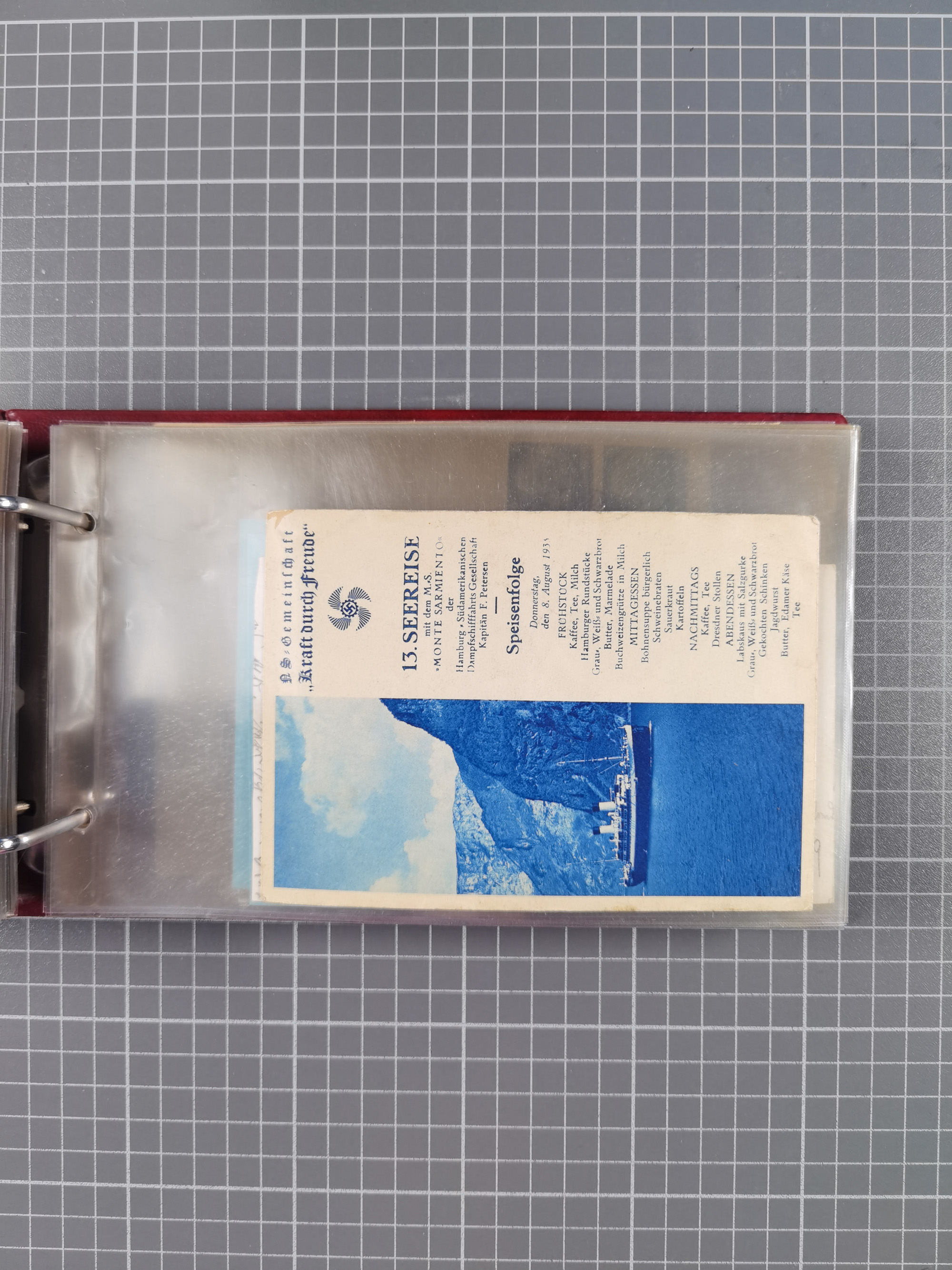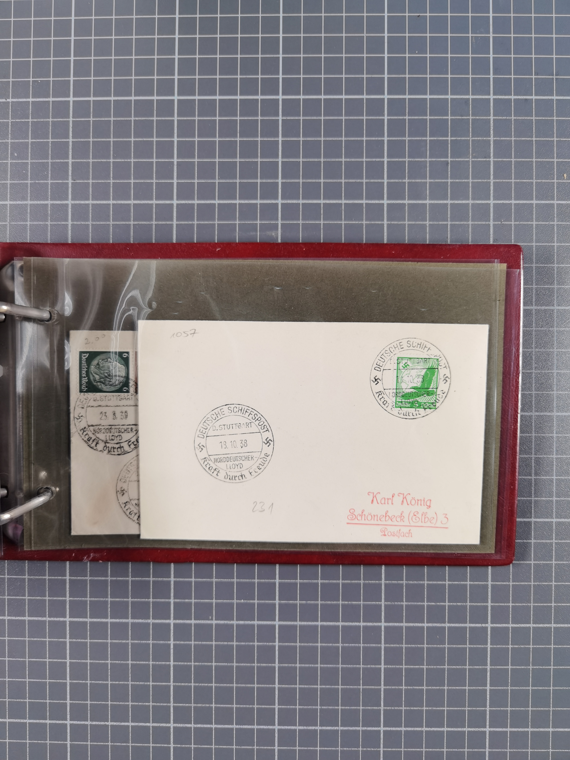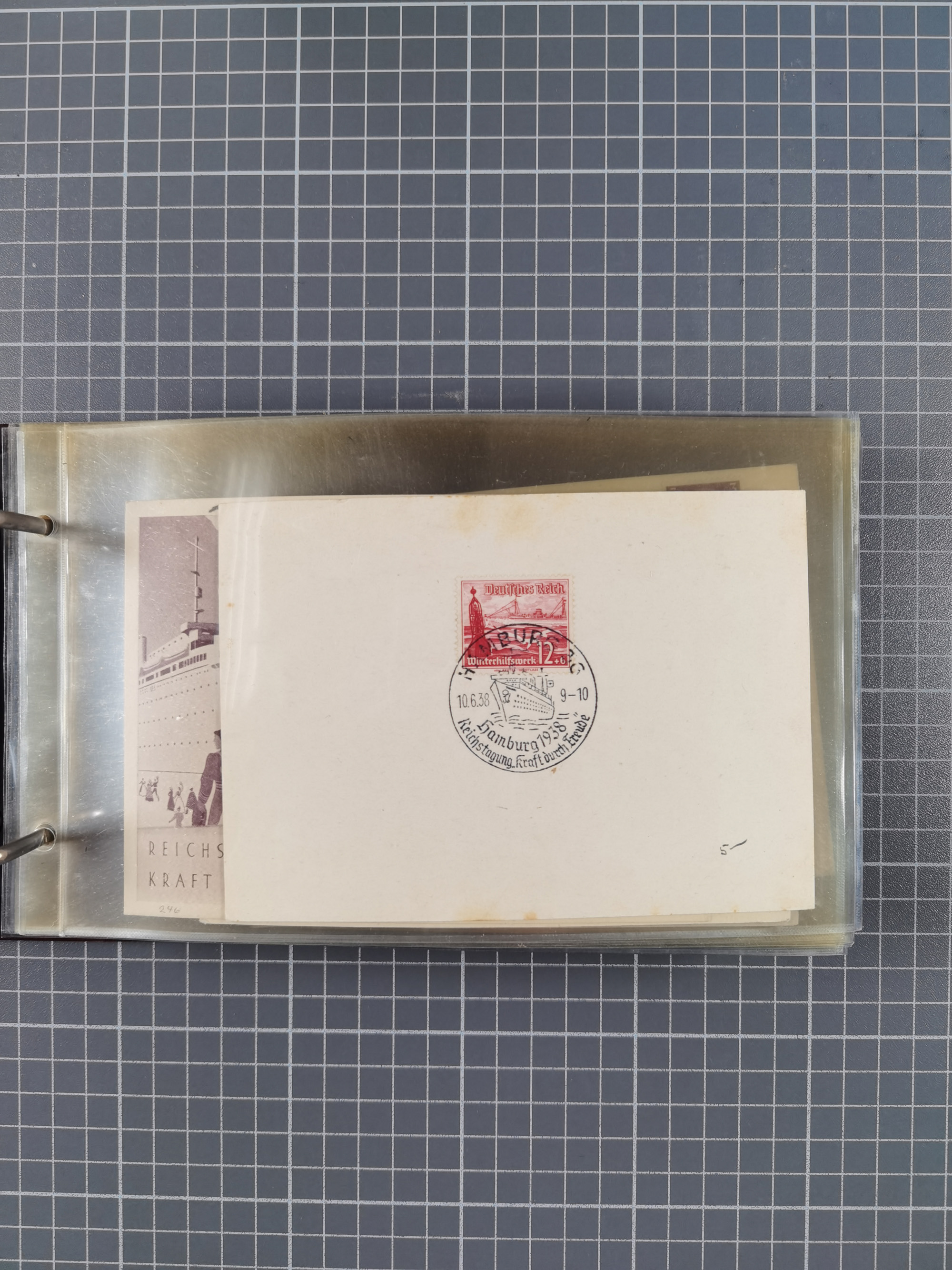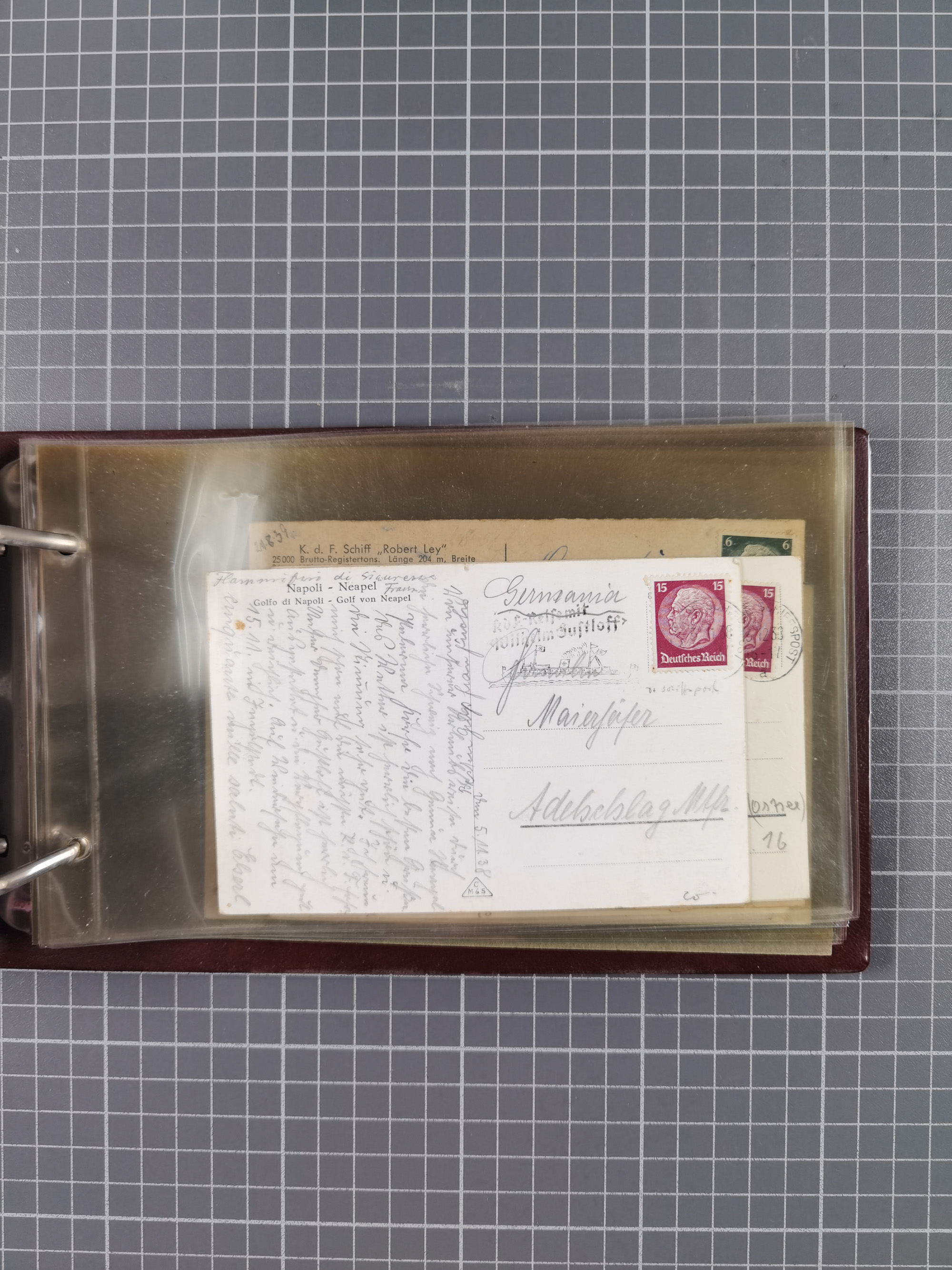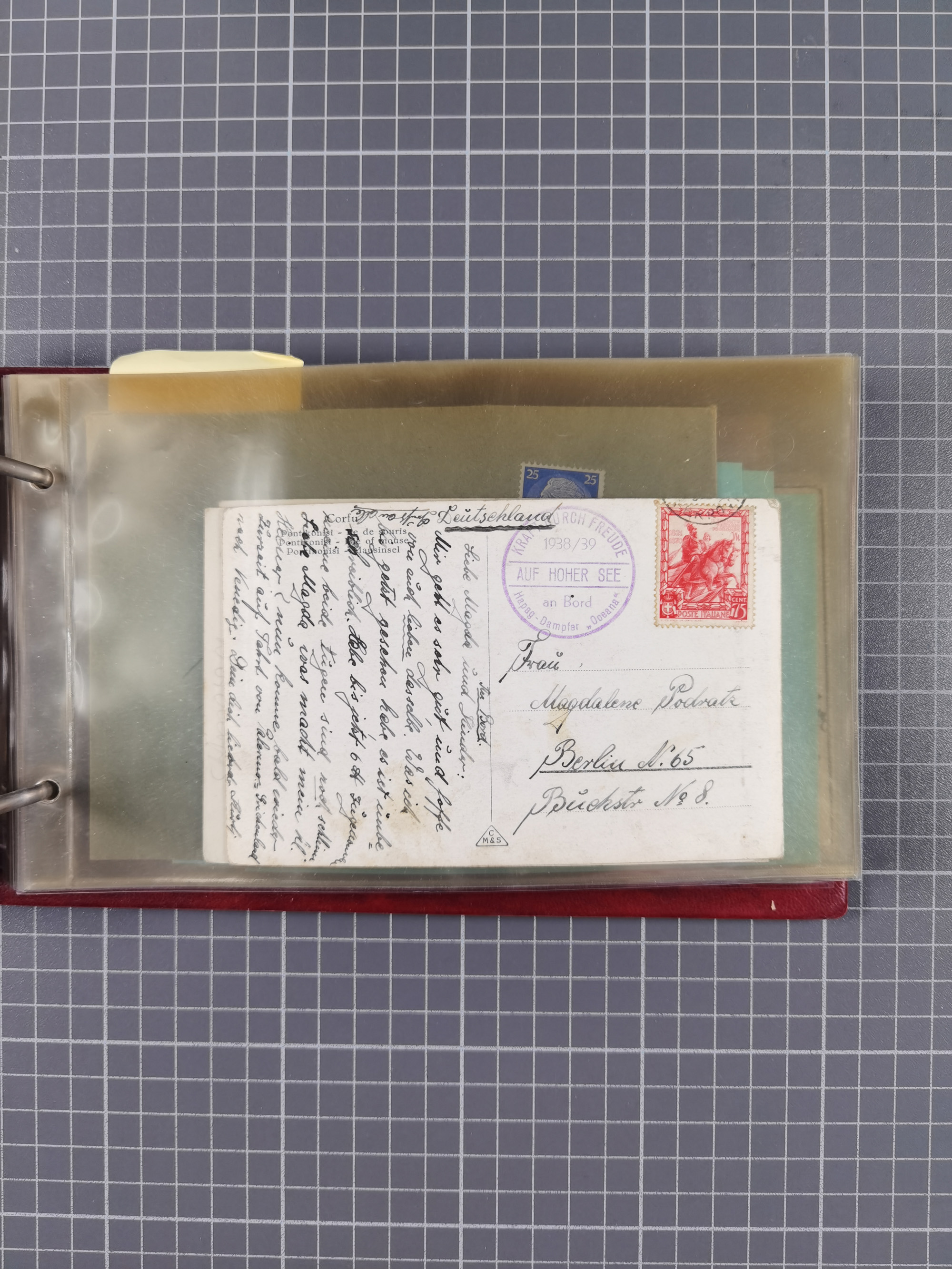 1934/39, Sammlung “Kraft durch Freude” mit ca. 240 Briefen, Karten und GSK inkl. Stempel des "LLOYD BREMEN", dazu Fotos, Schiffsansichtskarten, Speisekarten usw., sauber in vier Alben, ex Steinmeyer