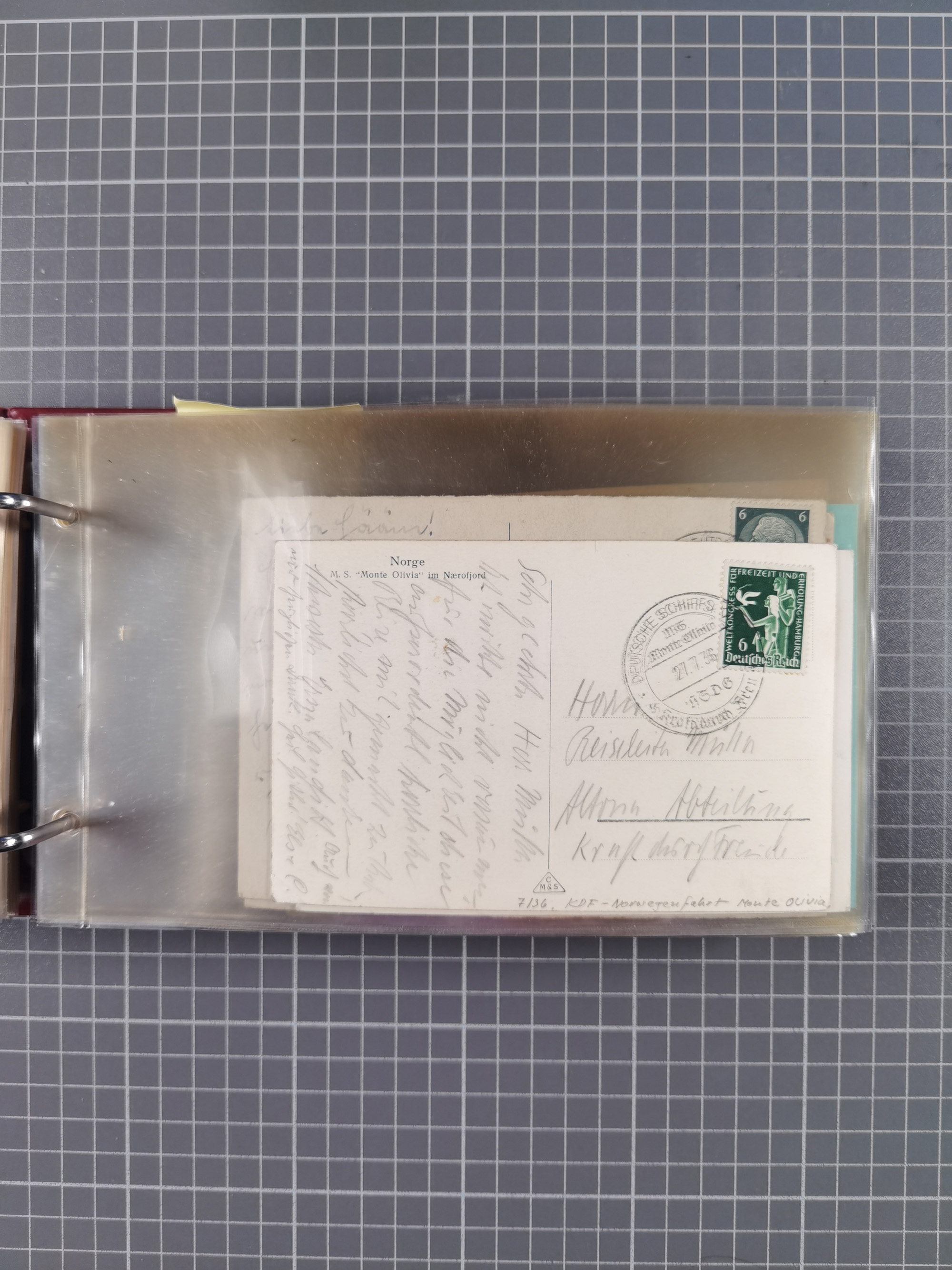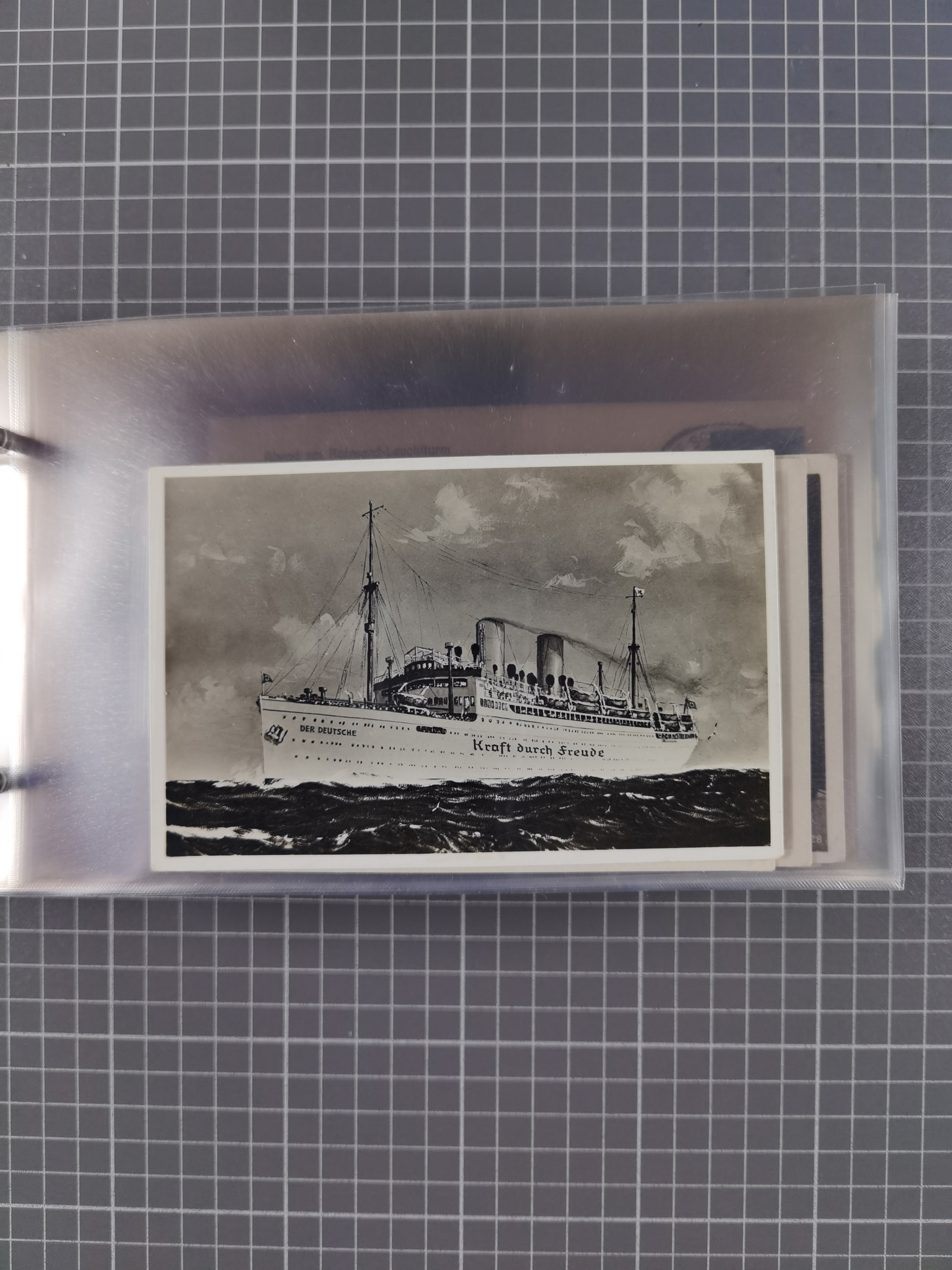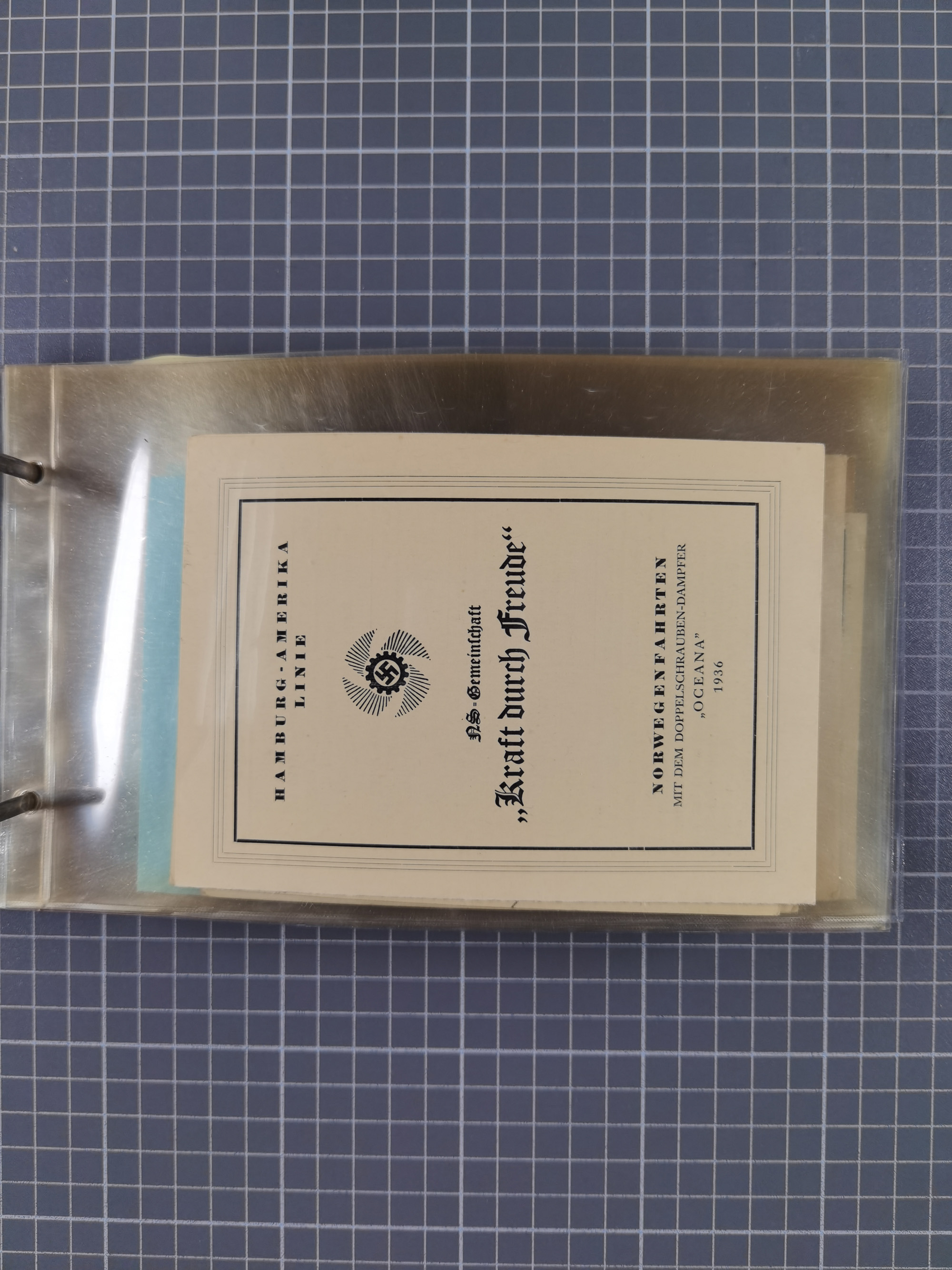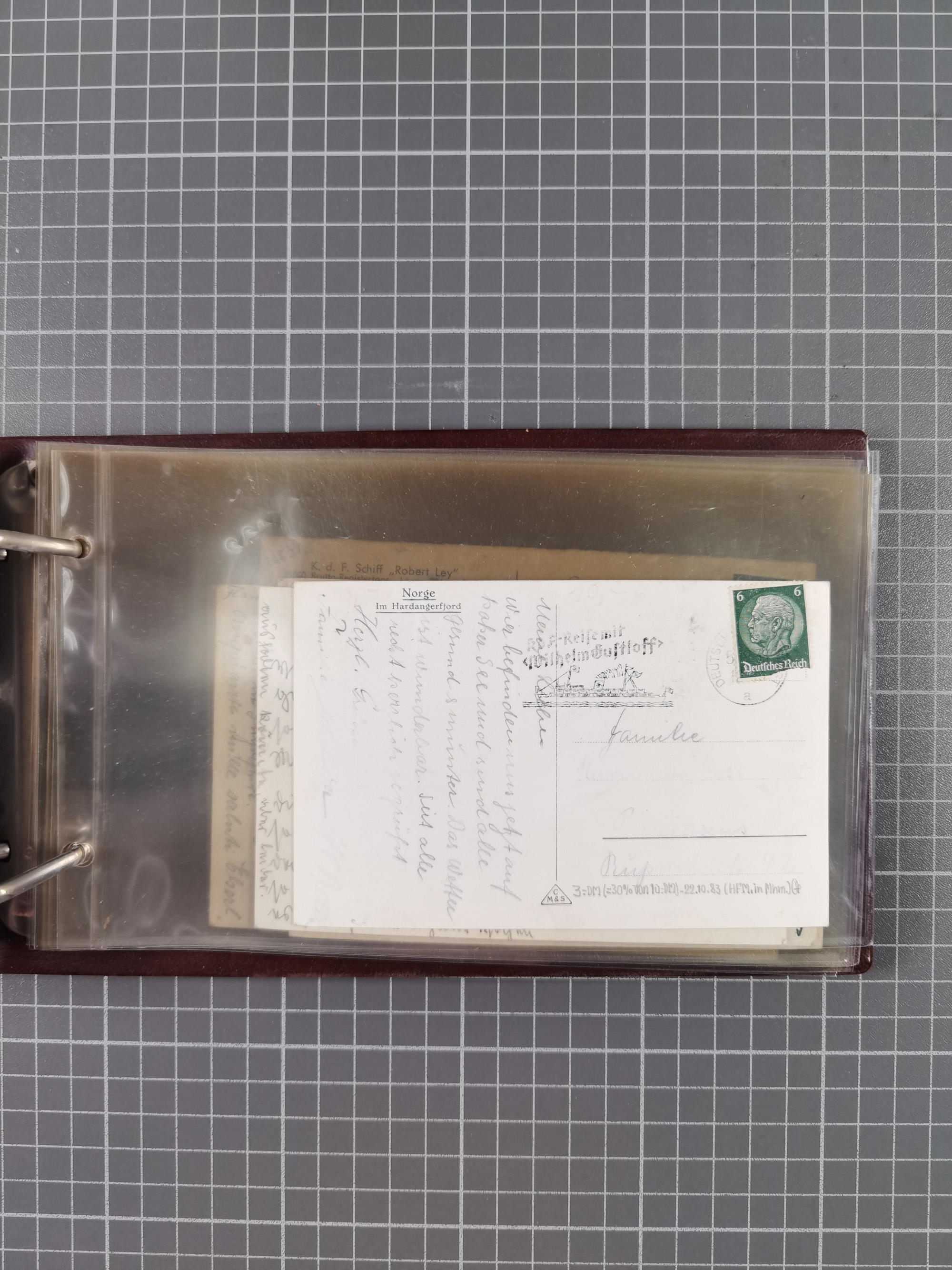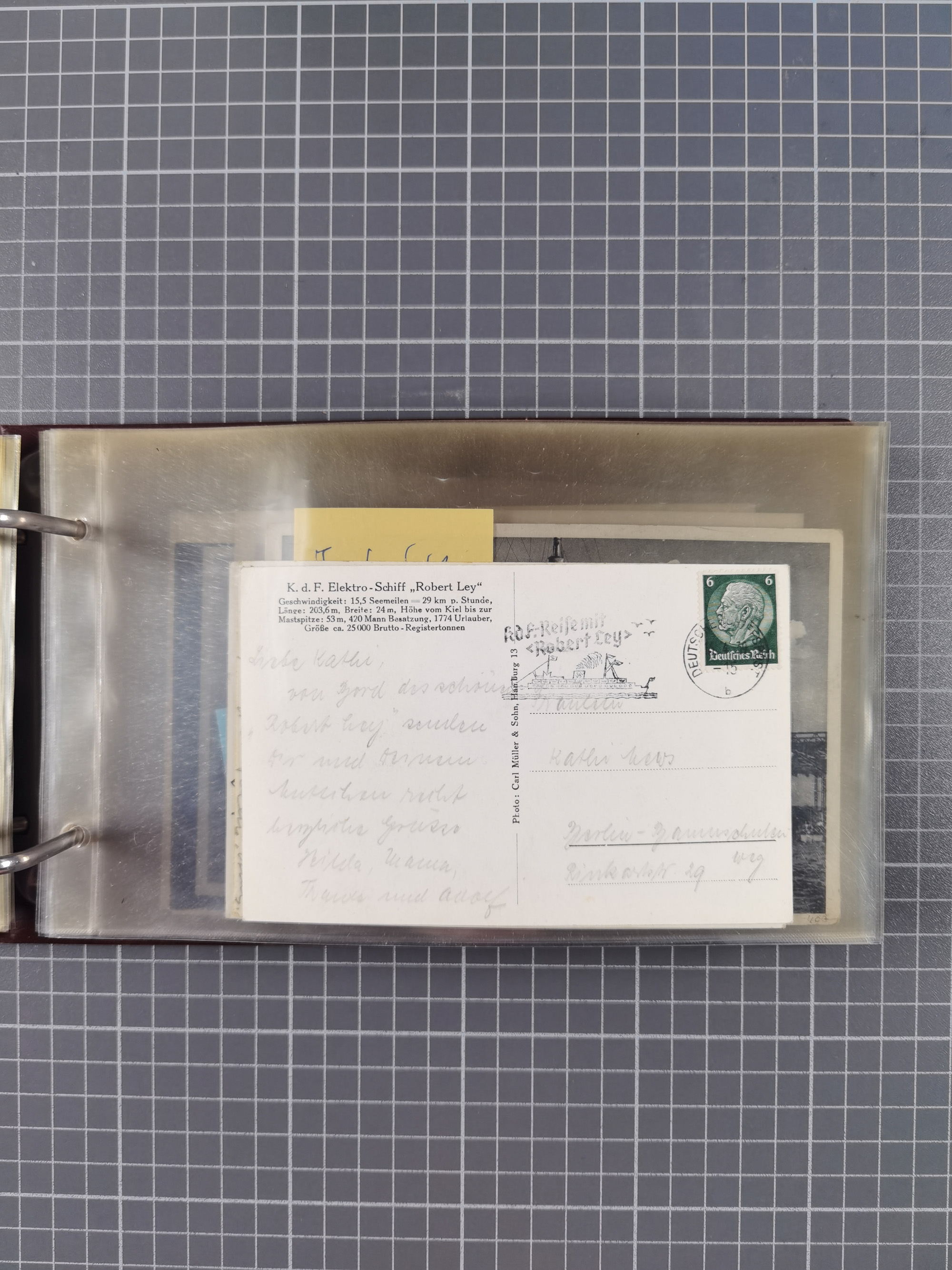 1934/39, Sammlung “Kraft durch Freude” mit ca. 240 Briefen, Karten und GSK inkl. Stempel des "LLOYD BREMEN", dazu Fotos, Schiffsansichtskarten, Speisekarten usw., sauber in vier Alben, ex Steinmeyer