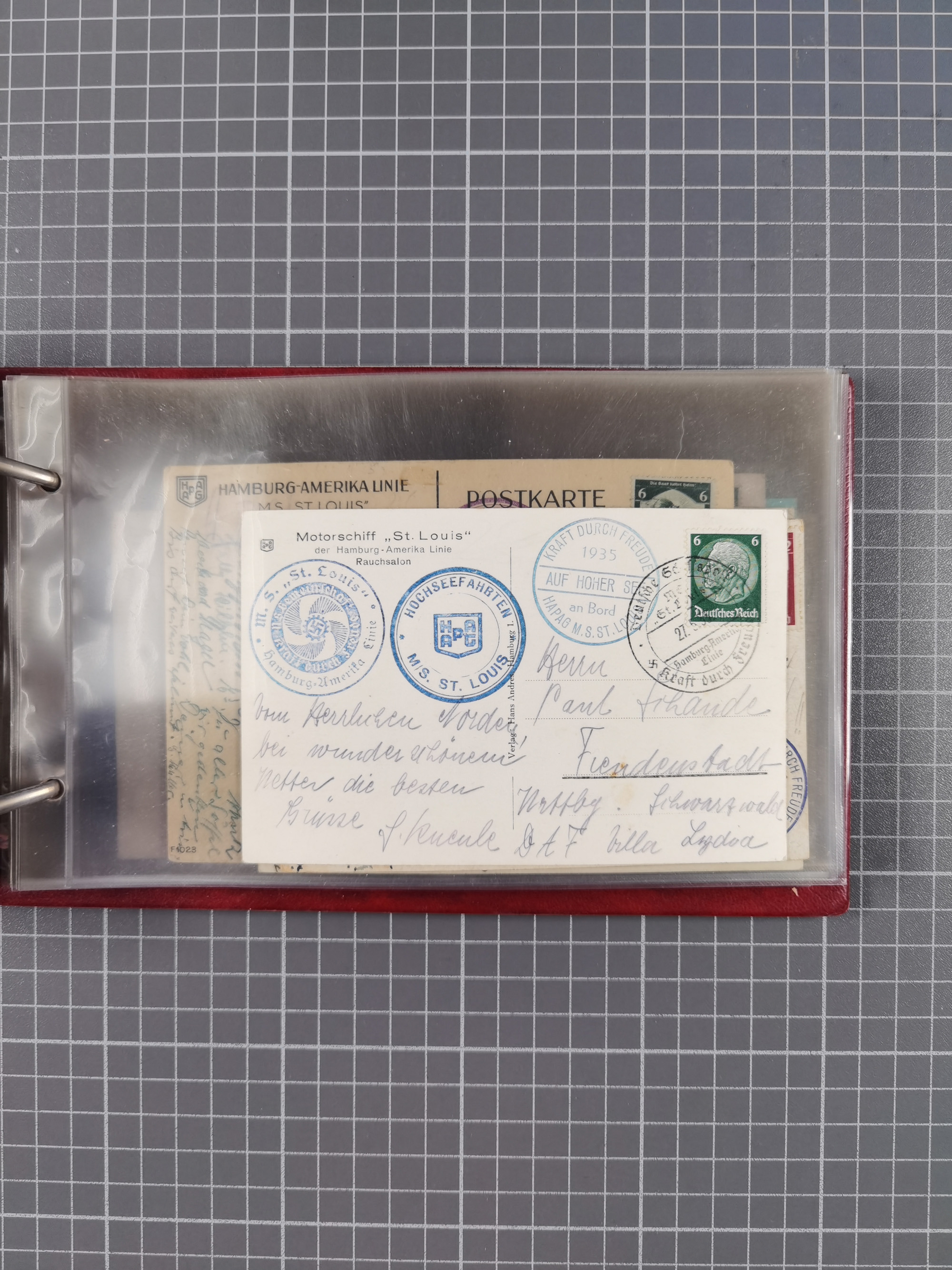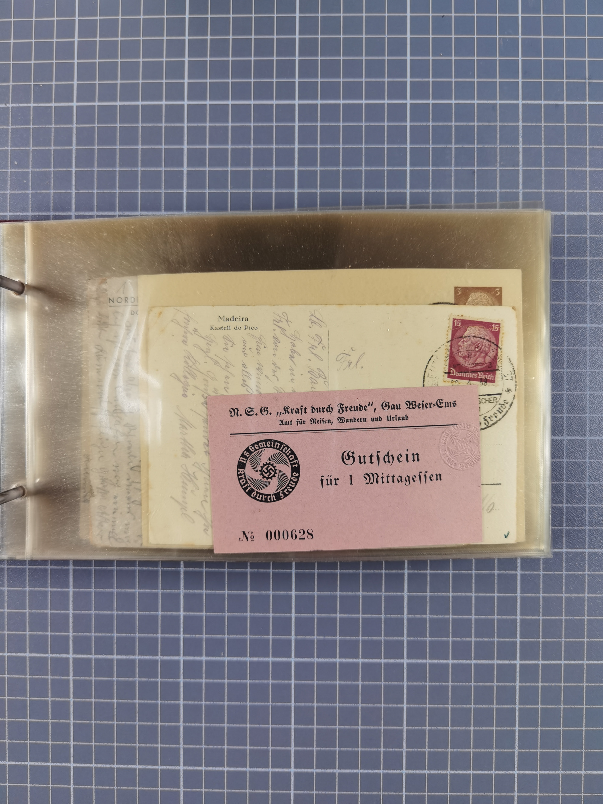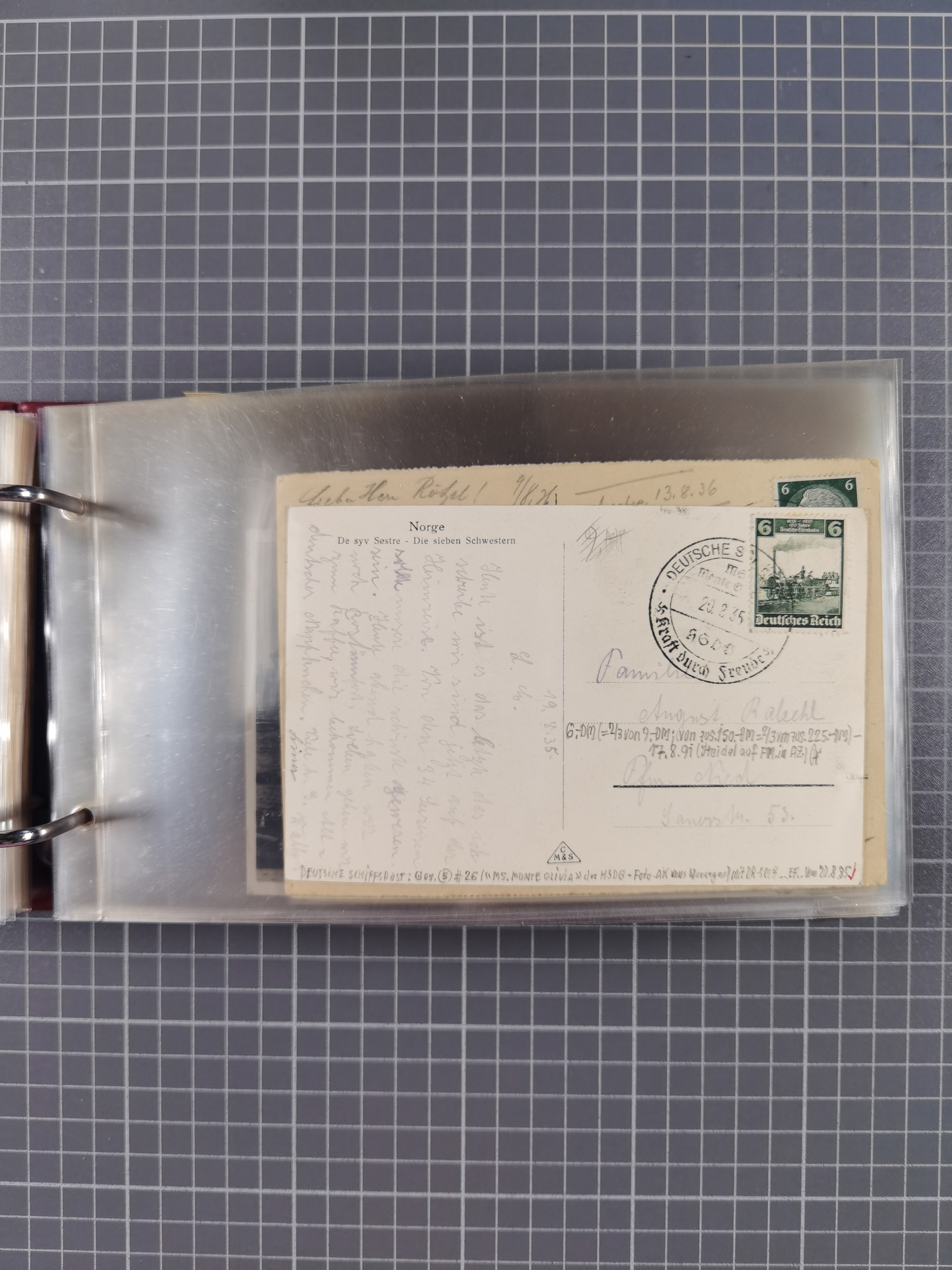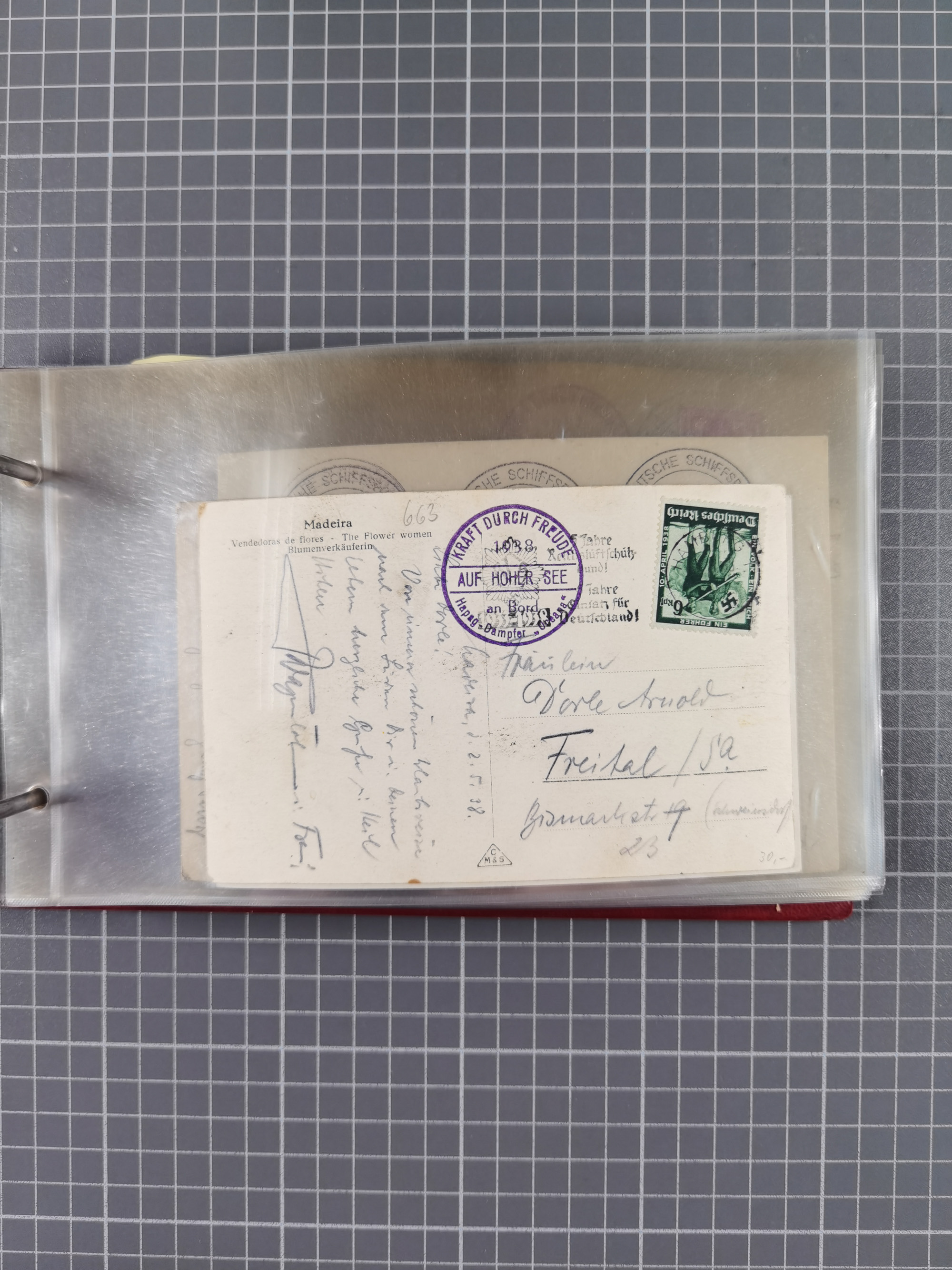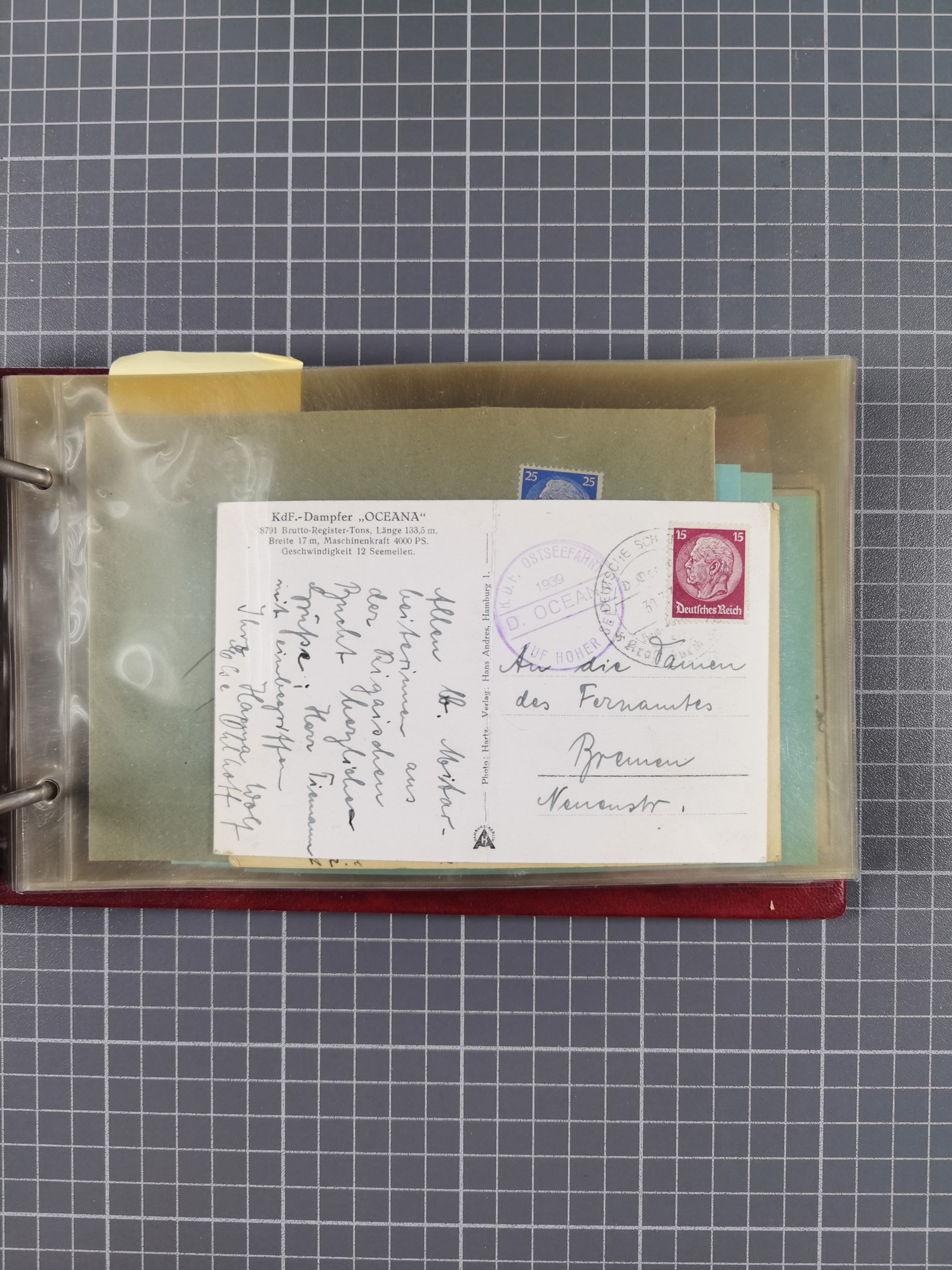 1934/39, Sammlung “Kraft durch Freude” mit ca. 240 Briefen, Karten und GSK inkl. Stempel des "LLOYD BREMEN", dazu Fotos, Schiffsansichtskarten, Speisekarten usw., sauber in vier Alben, ex Steinmeyer