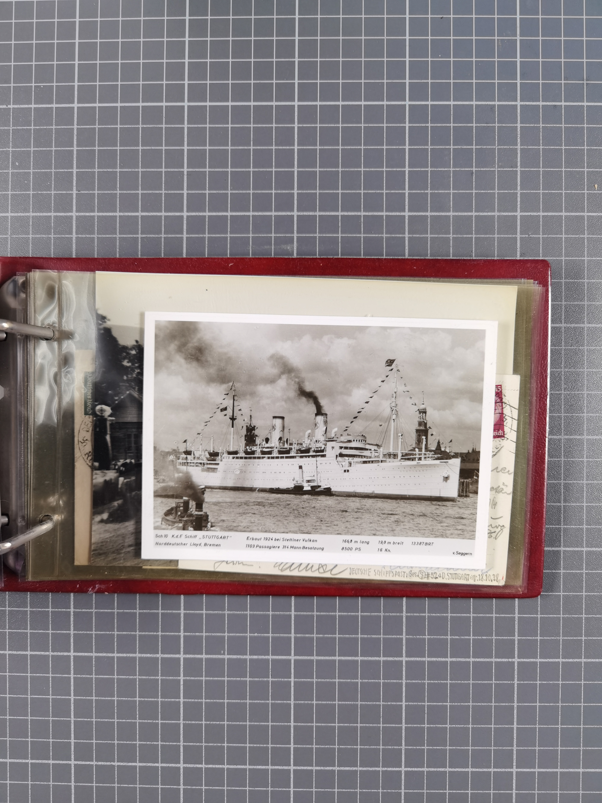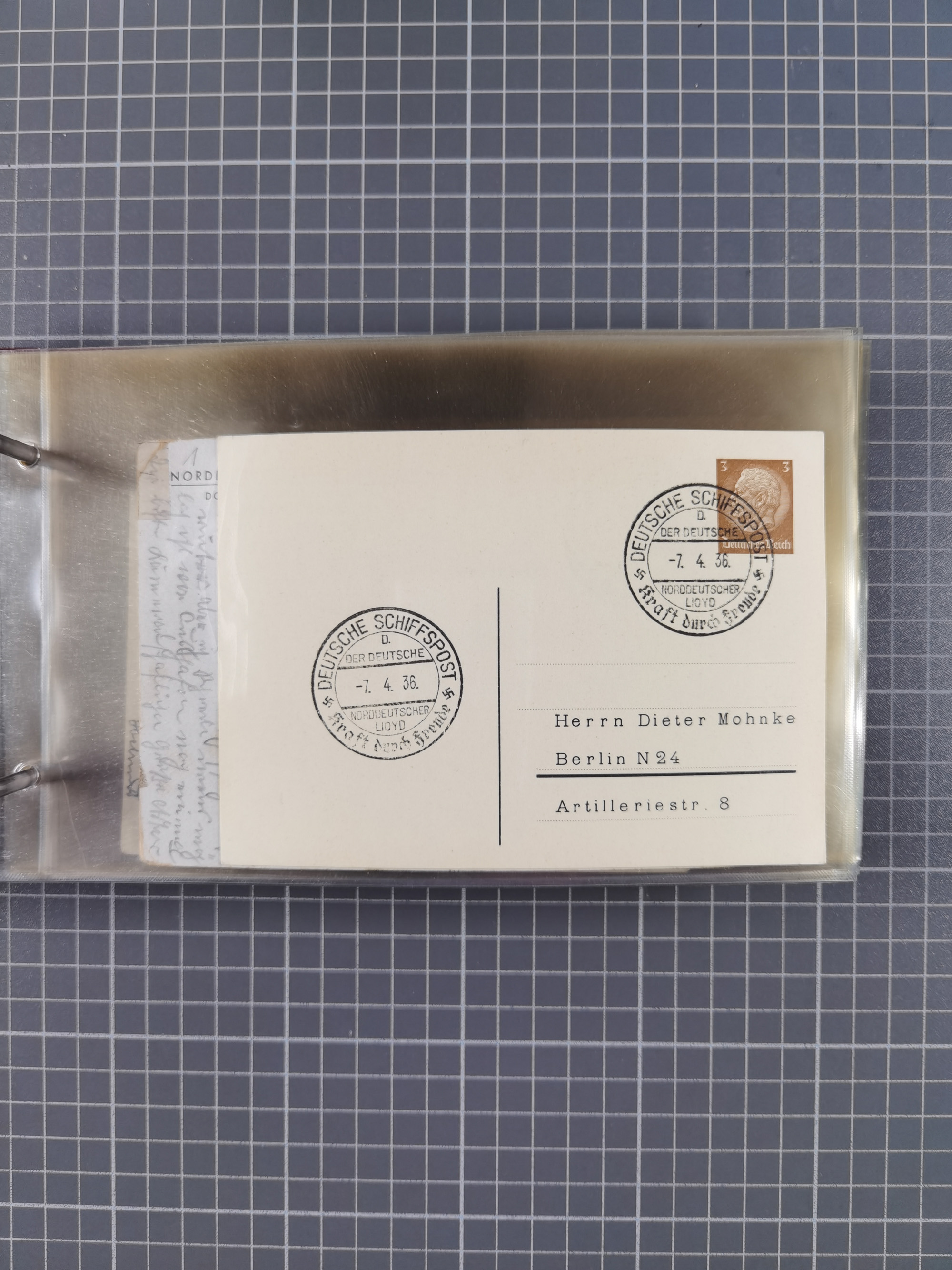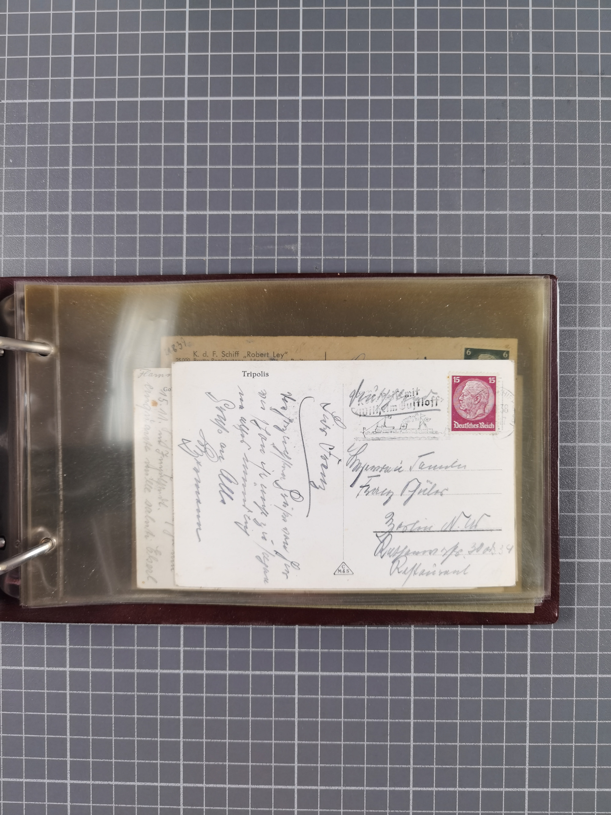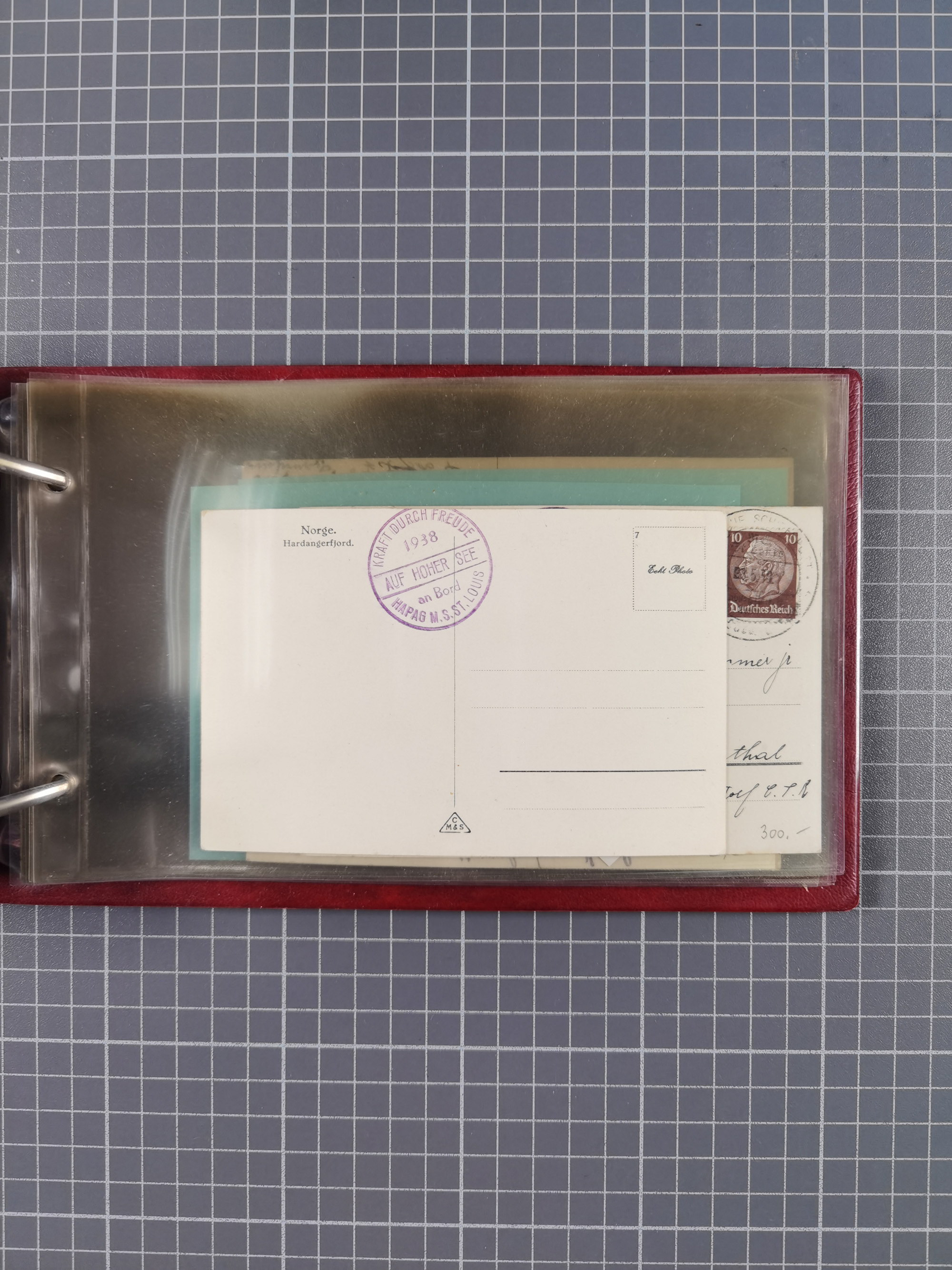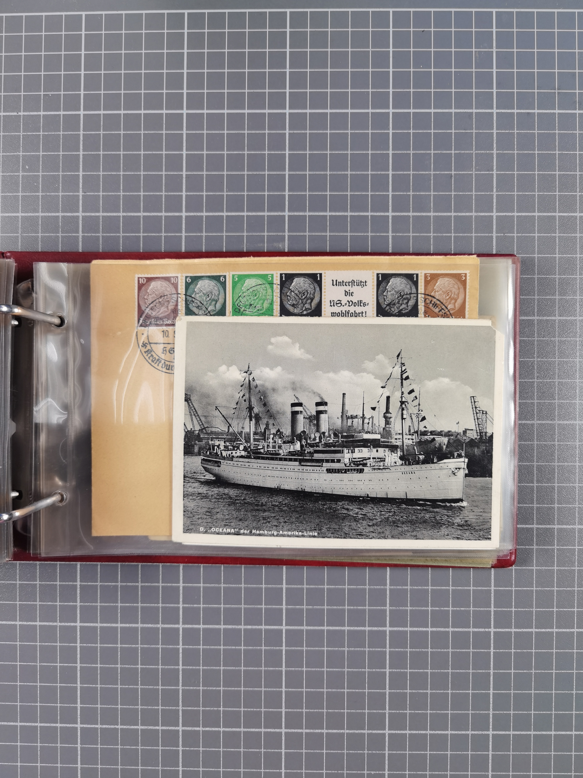 1934/39, Sammlung “Kraft durch Freude” mit ca. 240 Briefen, Karten und GSK inkl. Stempel des "LLOYD BREMEN", dazu Fotos, Schiffsansichtskarten, Speisekarten usw., sauber in vier Alben, ex Steinmeyer