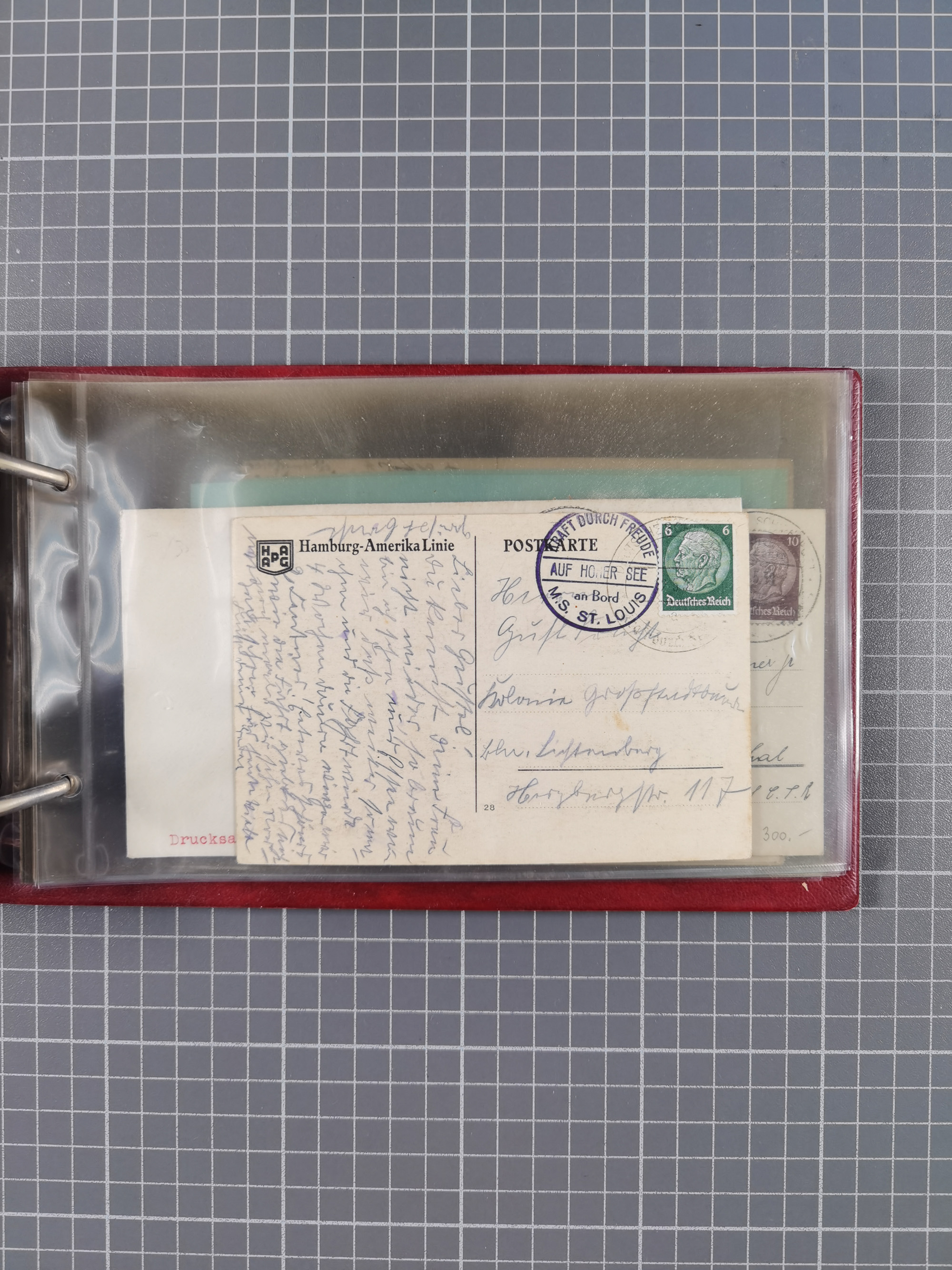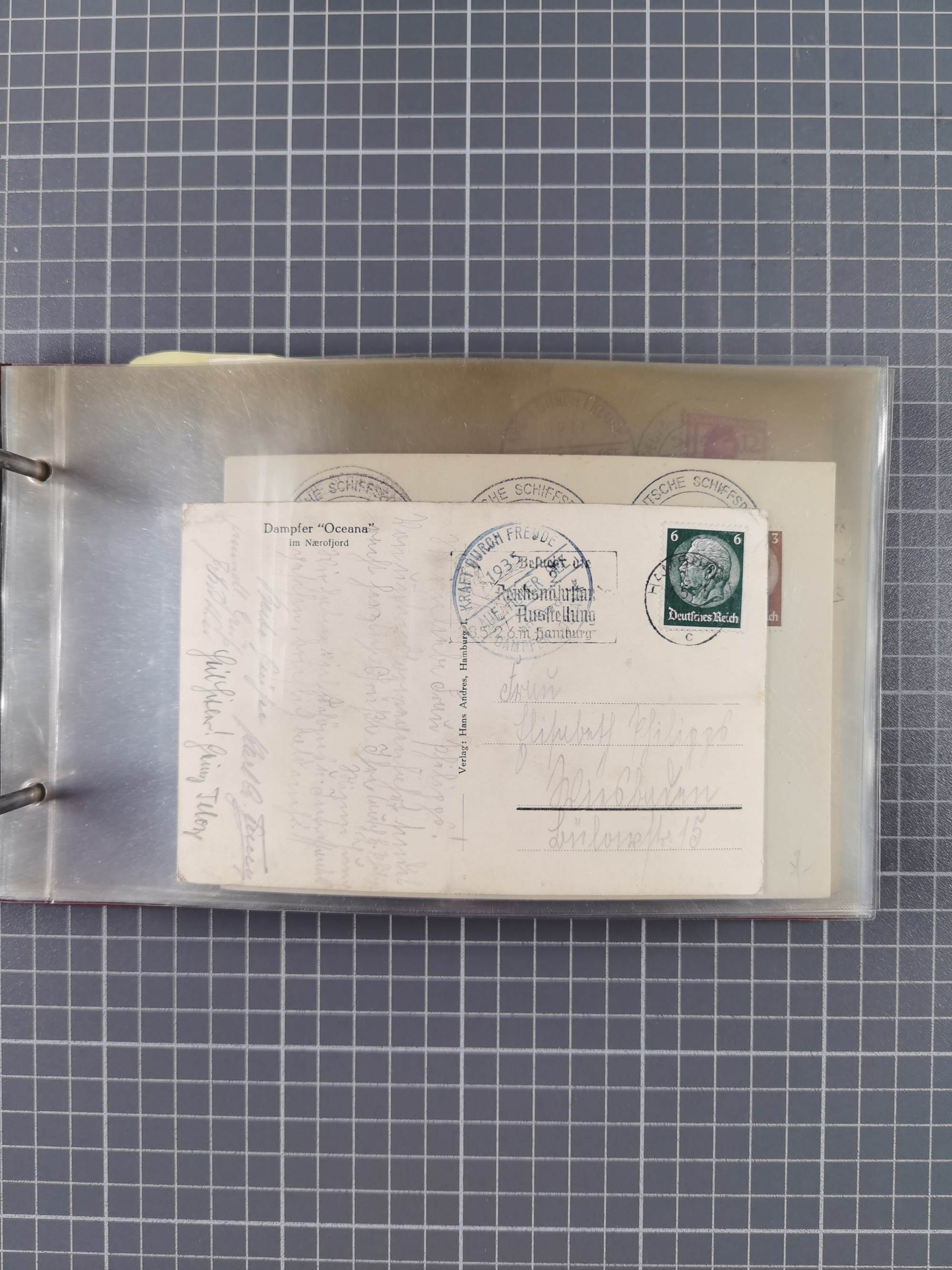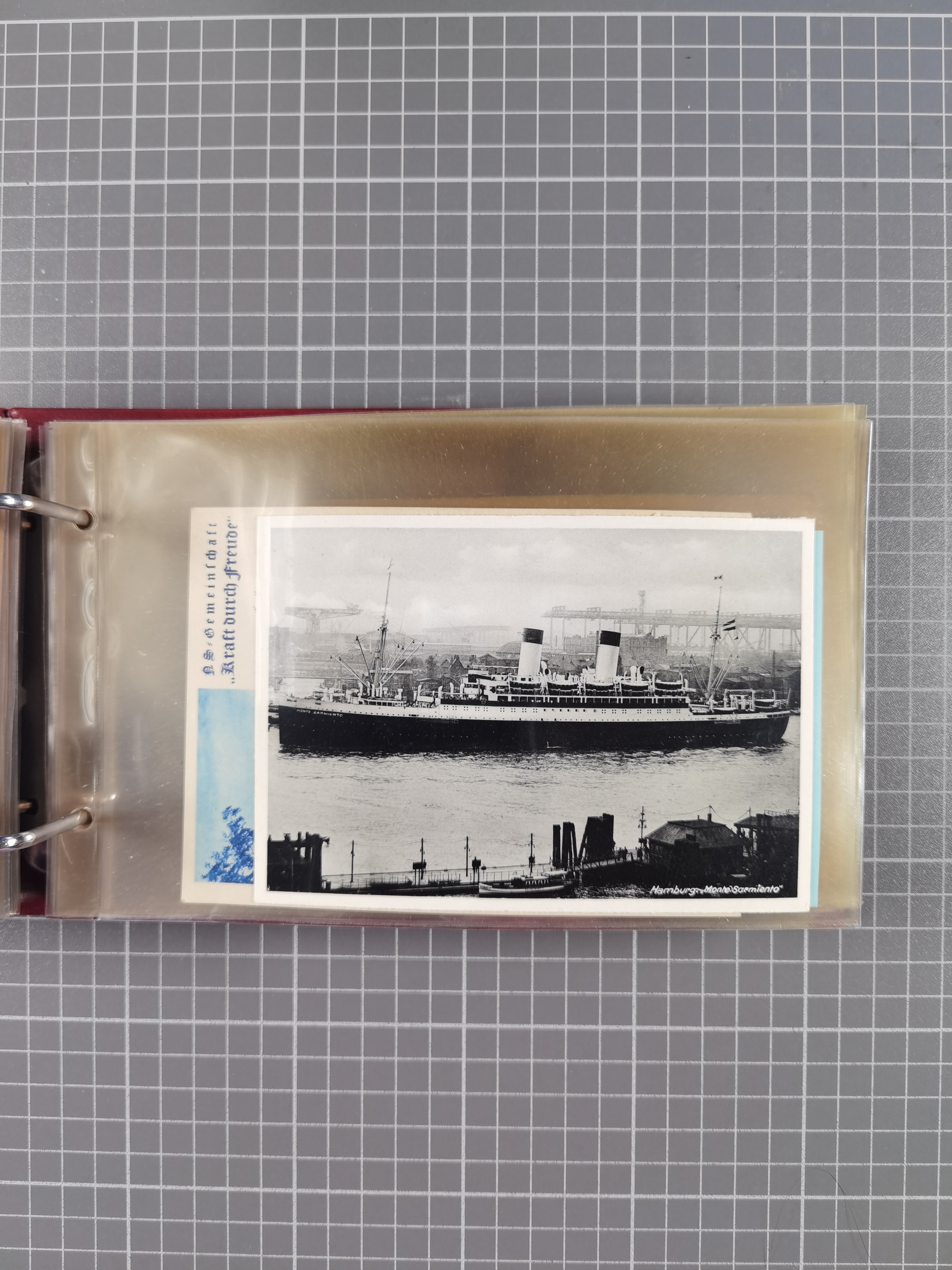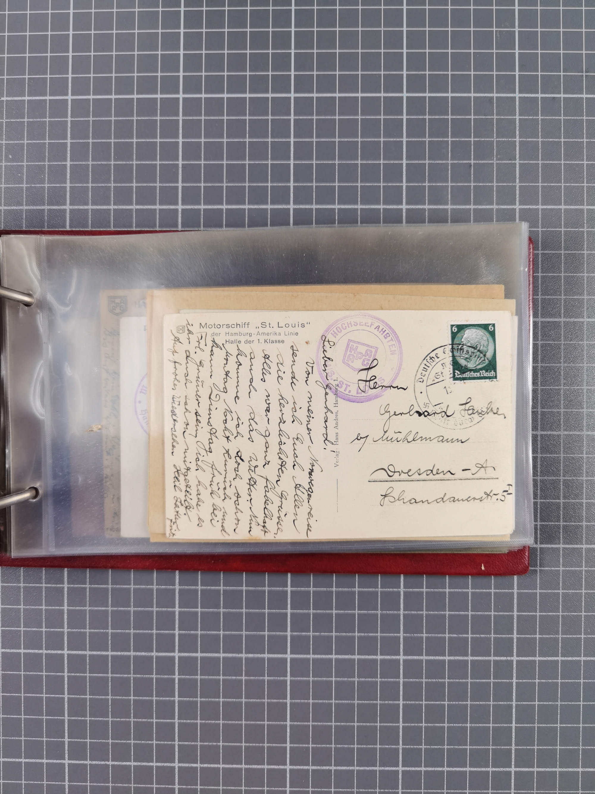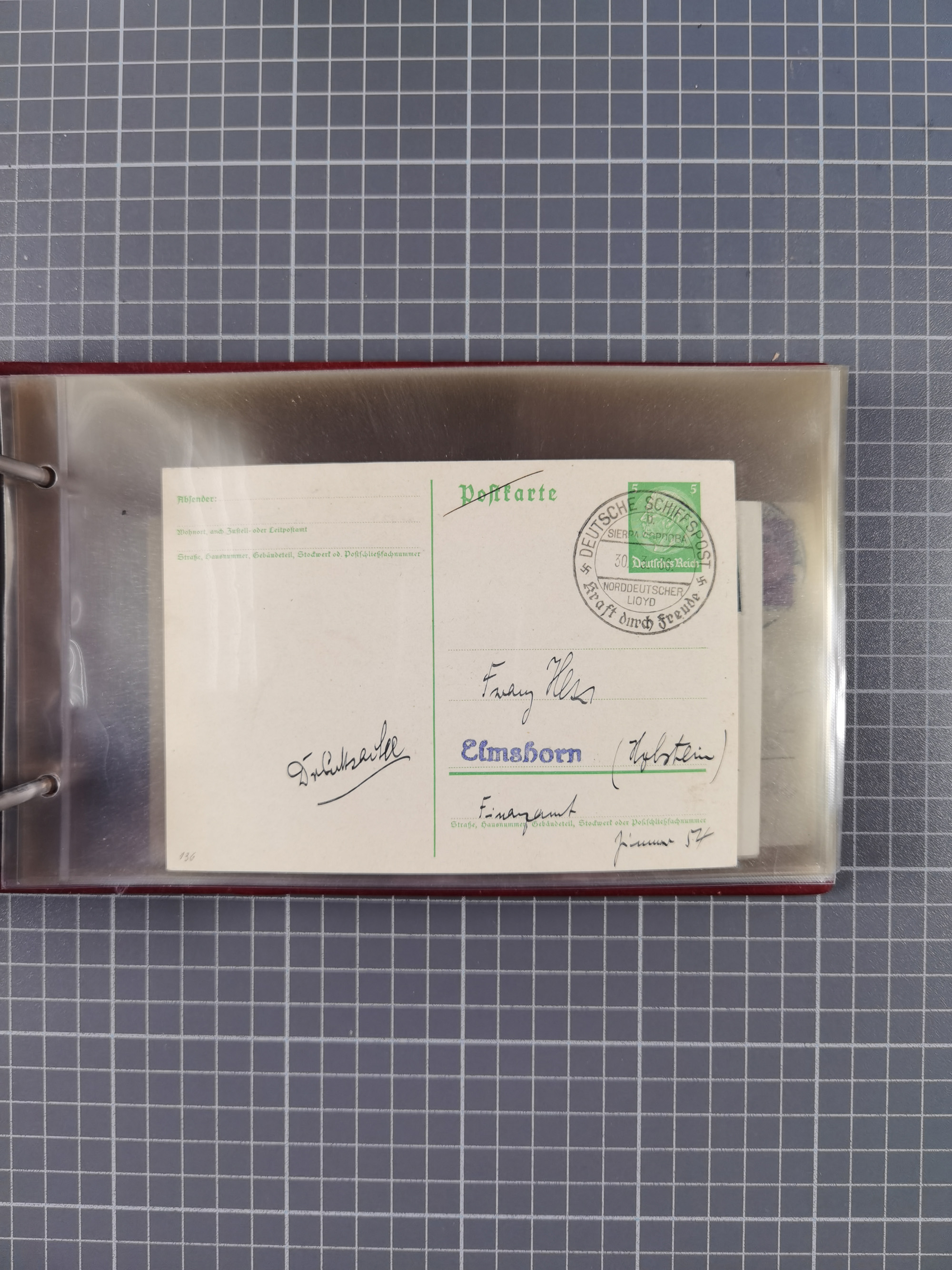 1934/39, Sammlung “Kraft durch Freude” mit ca. 240 Briefen, Karten und GSK inkl. Stempel des "LLOYD BREMEN", dazu Fotos, Schiffsansichtskarten, Speisekarten usw., sauber in vier Alben, ex Steinmeyer