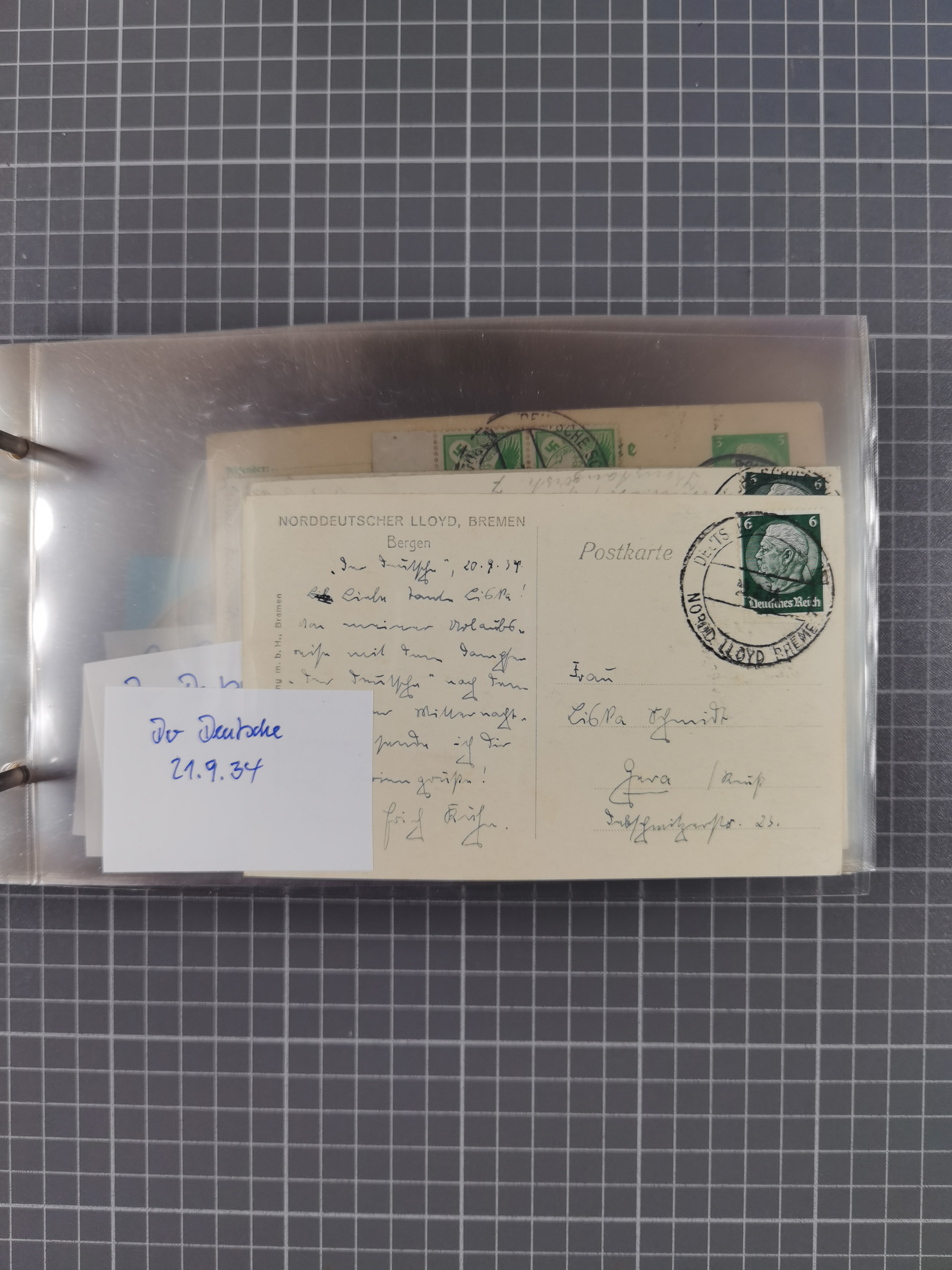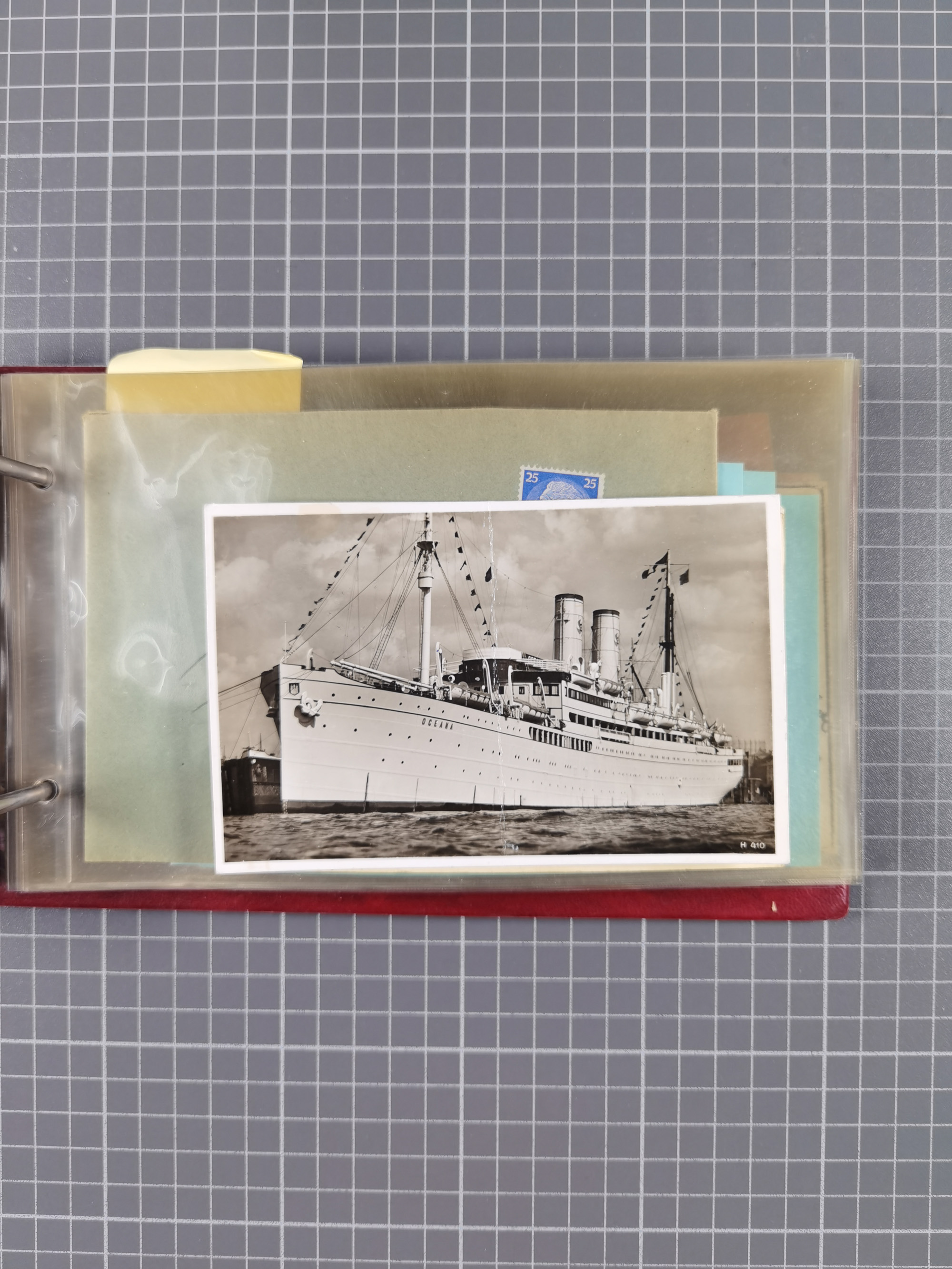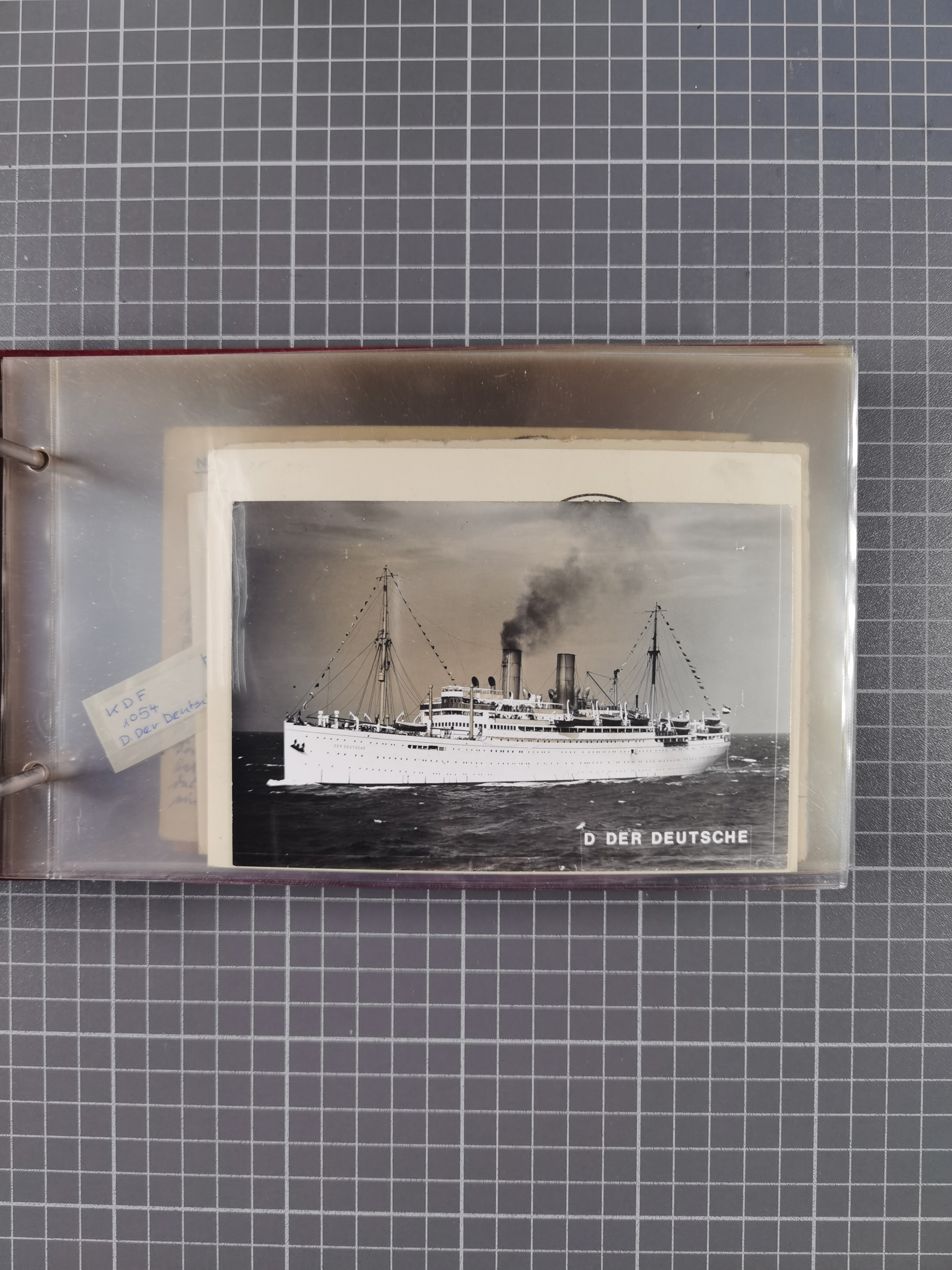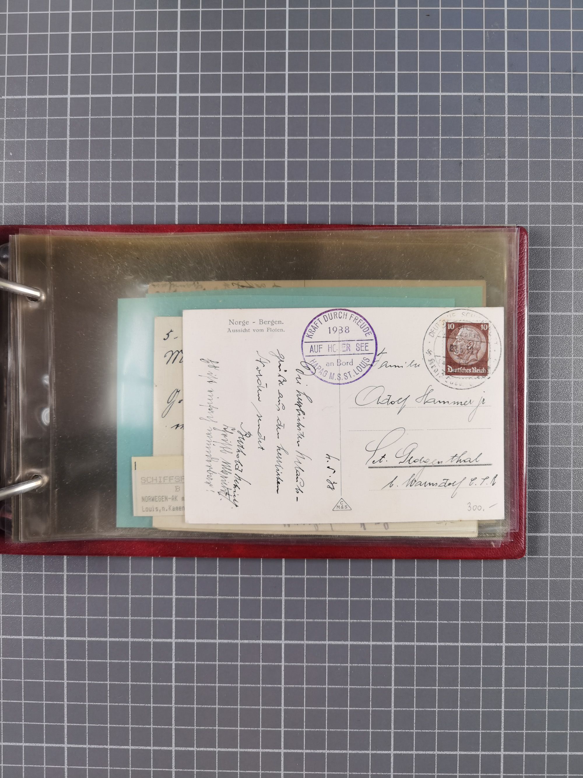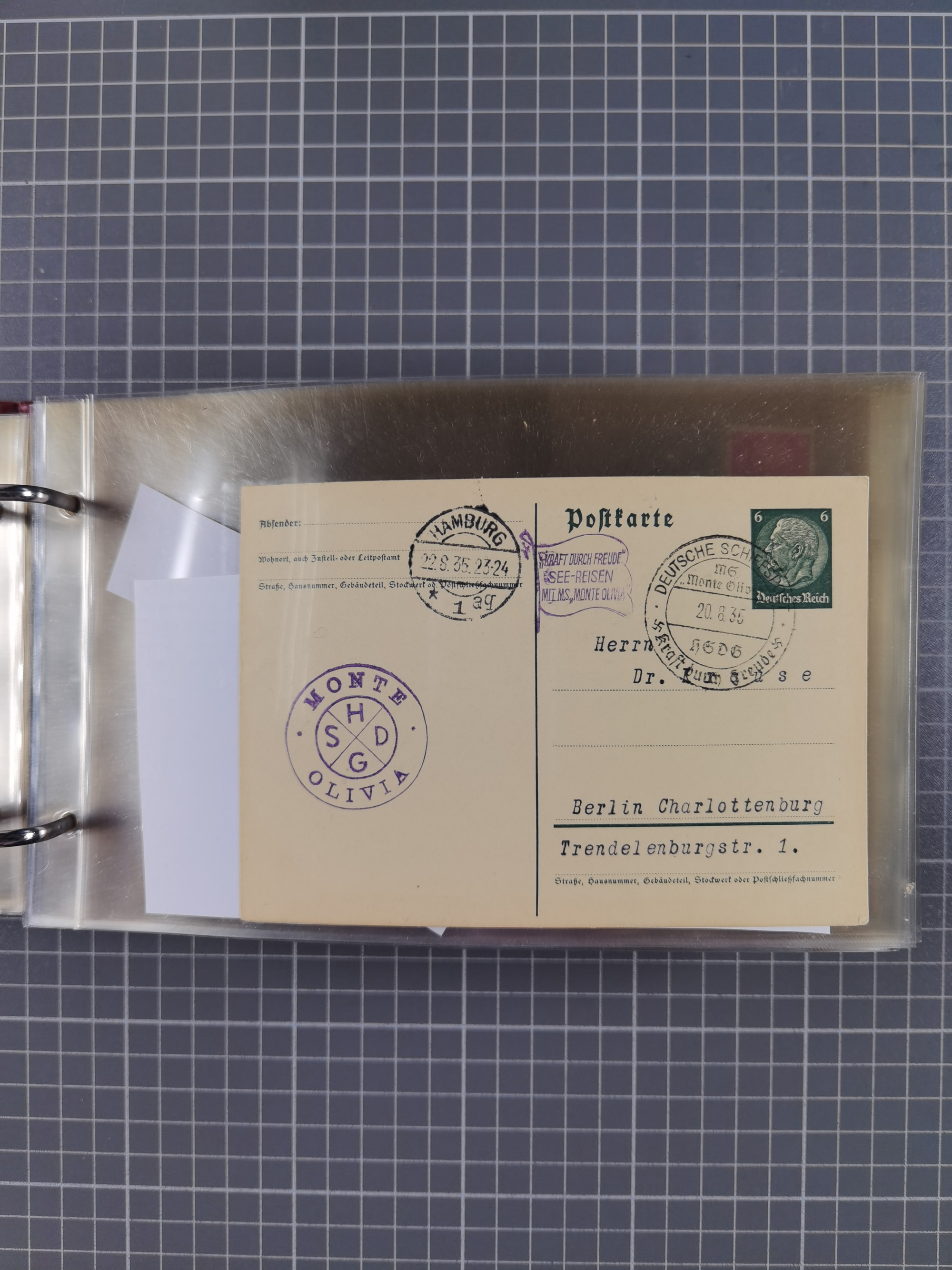 1934/39, Sammlung “Kraft durch Freude” mit ca. 240 Briefen, Karten und GSK inkl. Stempel des "LLOYD BREMEN", dazu Fotos, Schiffsansichtskarten, Speisekarten usw., sauber in vier Alben, ex Steinmeyer