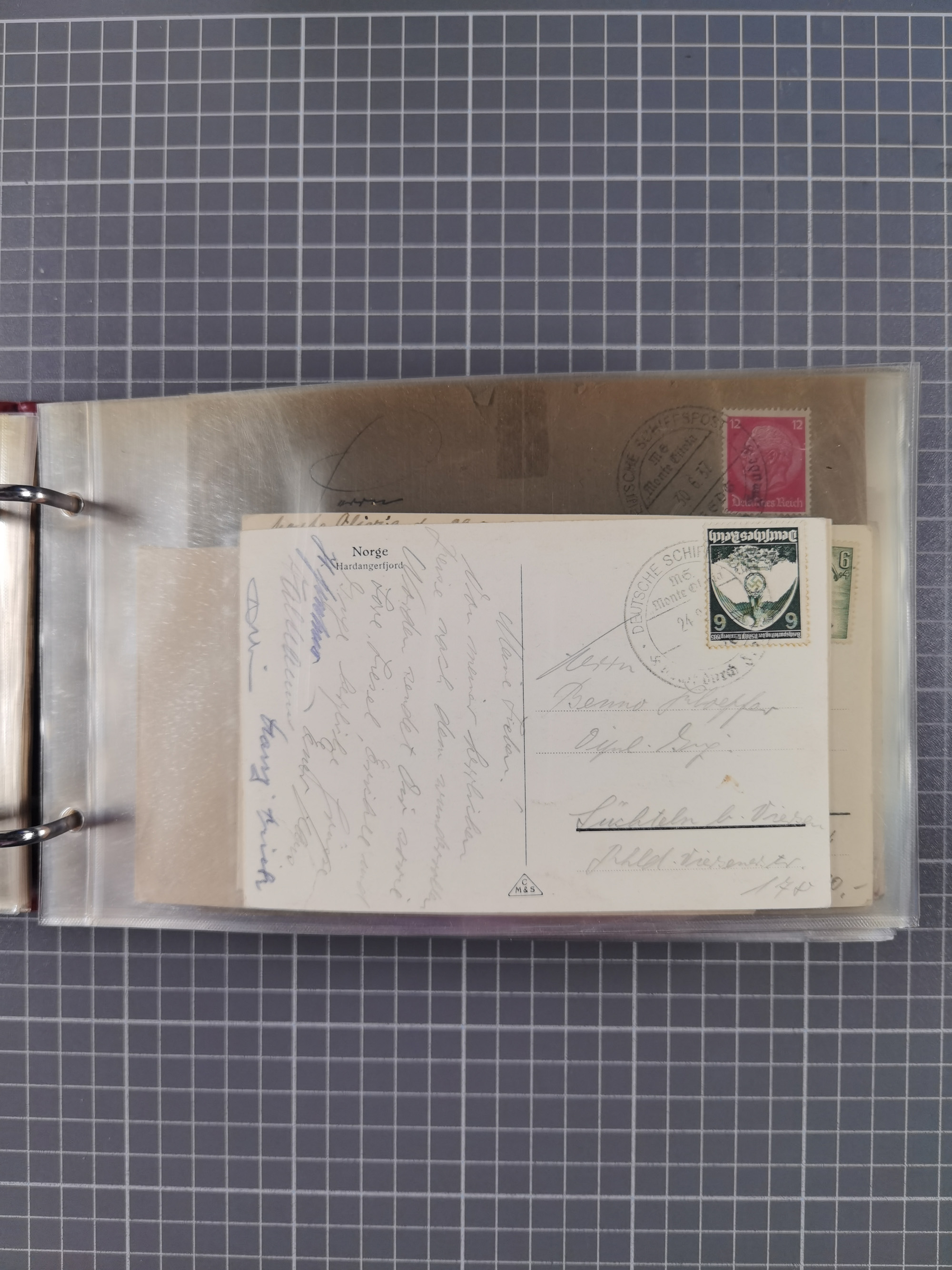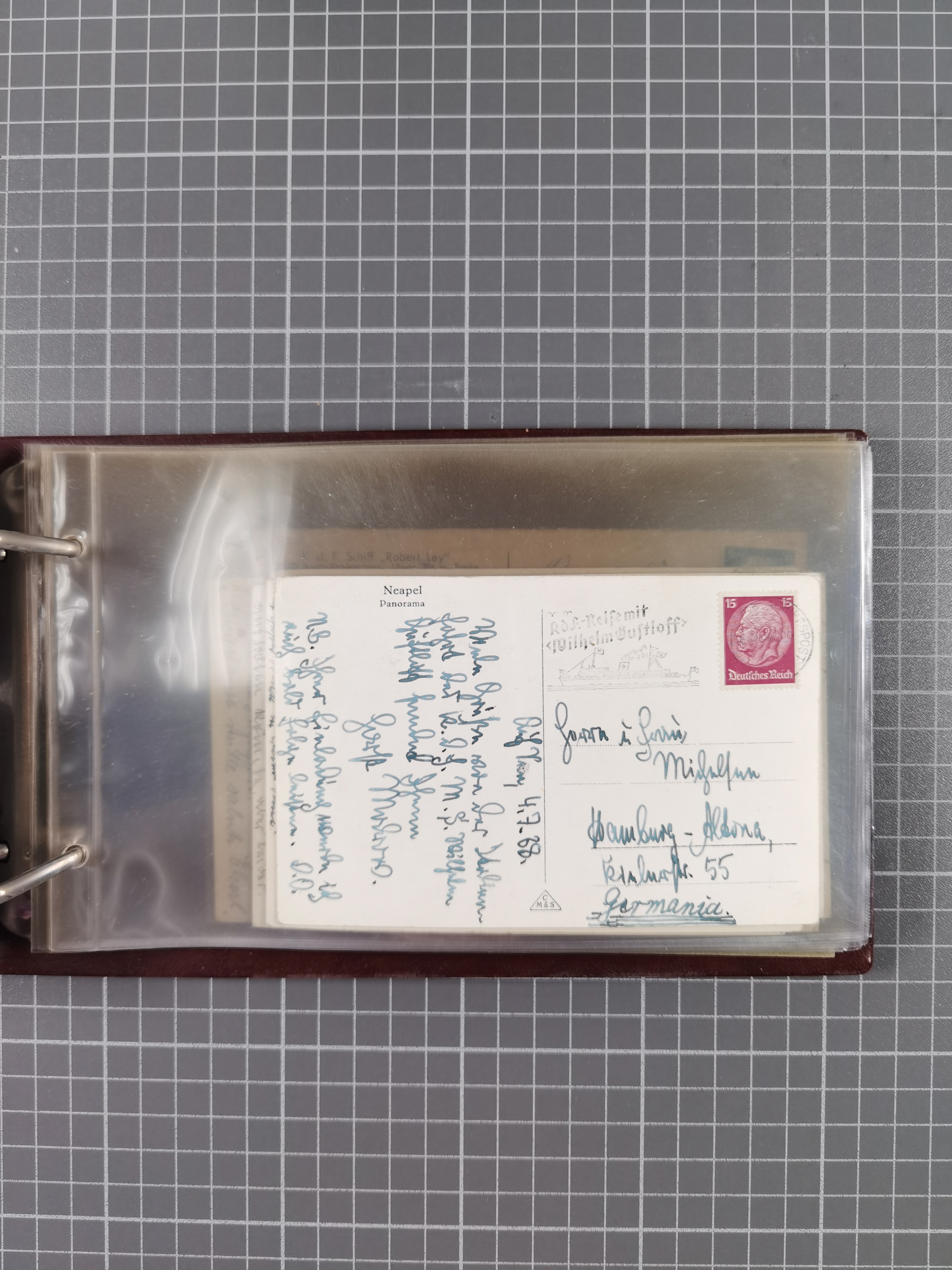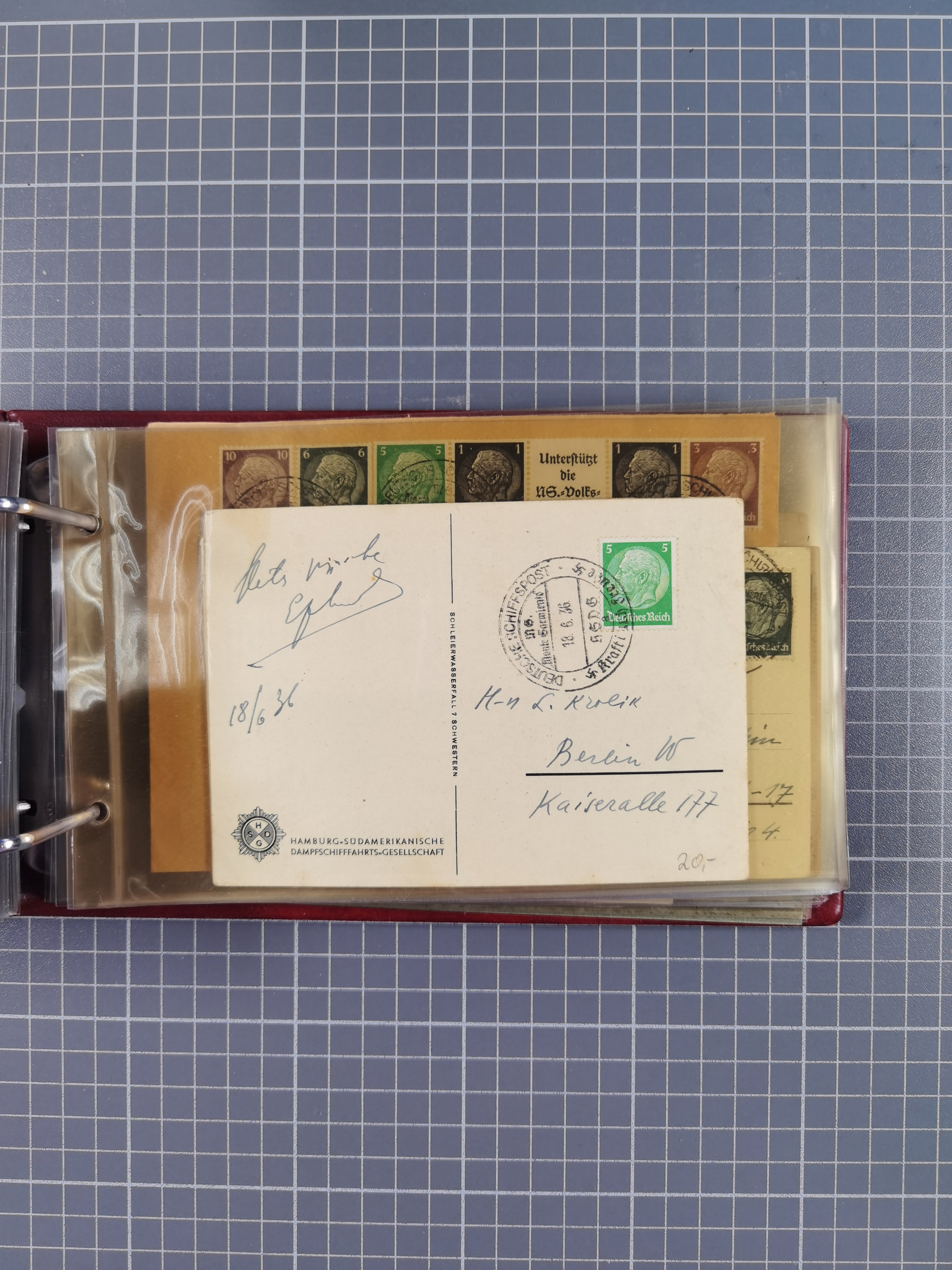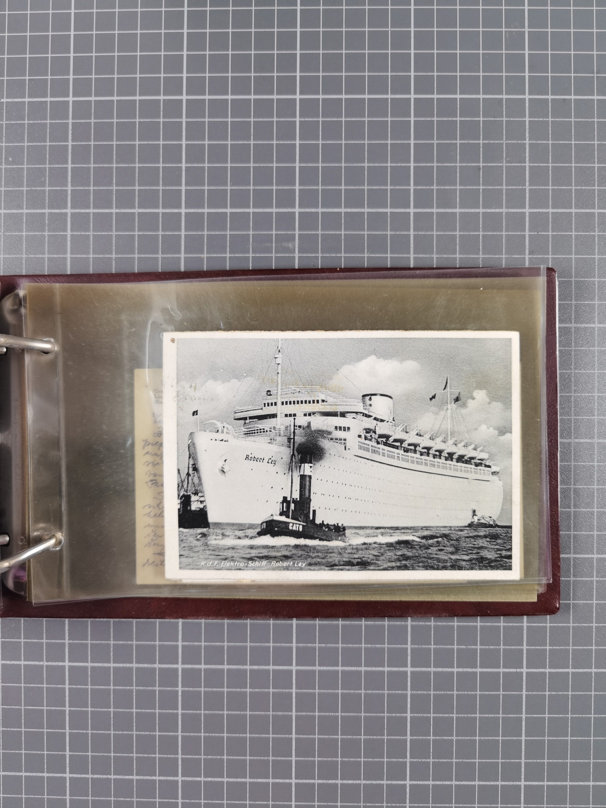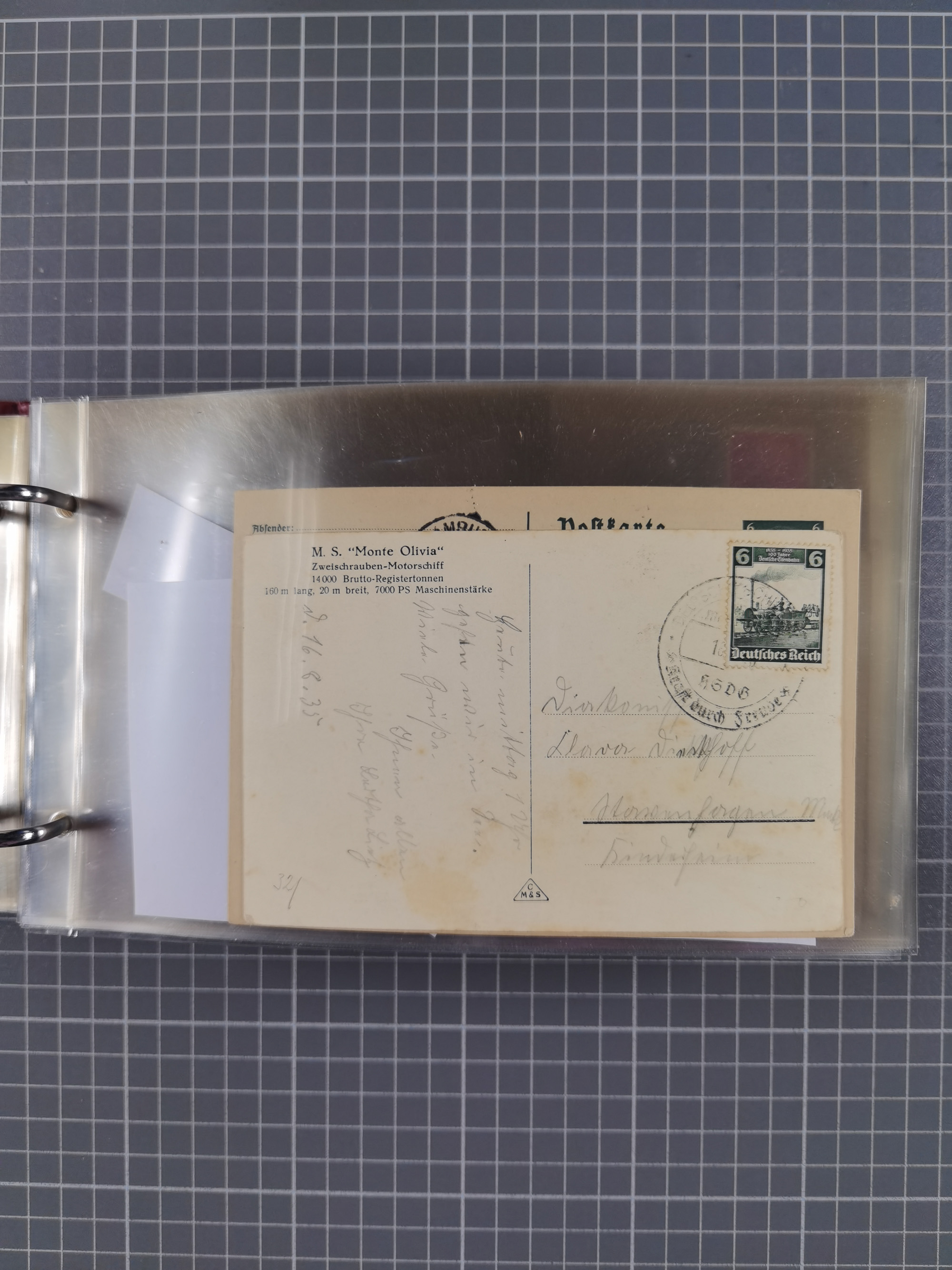 1934/39, Sammlung “Kraft durch Freude” mit ca. 240 Briefen, Karten und GSK inkl. Stempel des "LLOYD BREMEN", dazu Fotos, Schiffsansichtskarten, Speisekarten usw., sauber in vier Alben, ex Steinmeyer