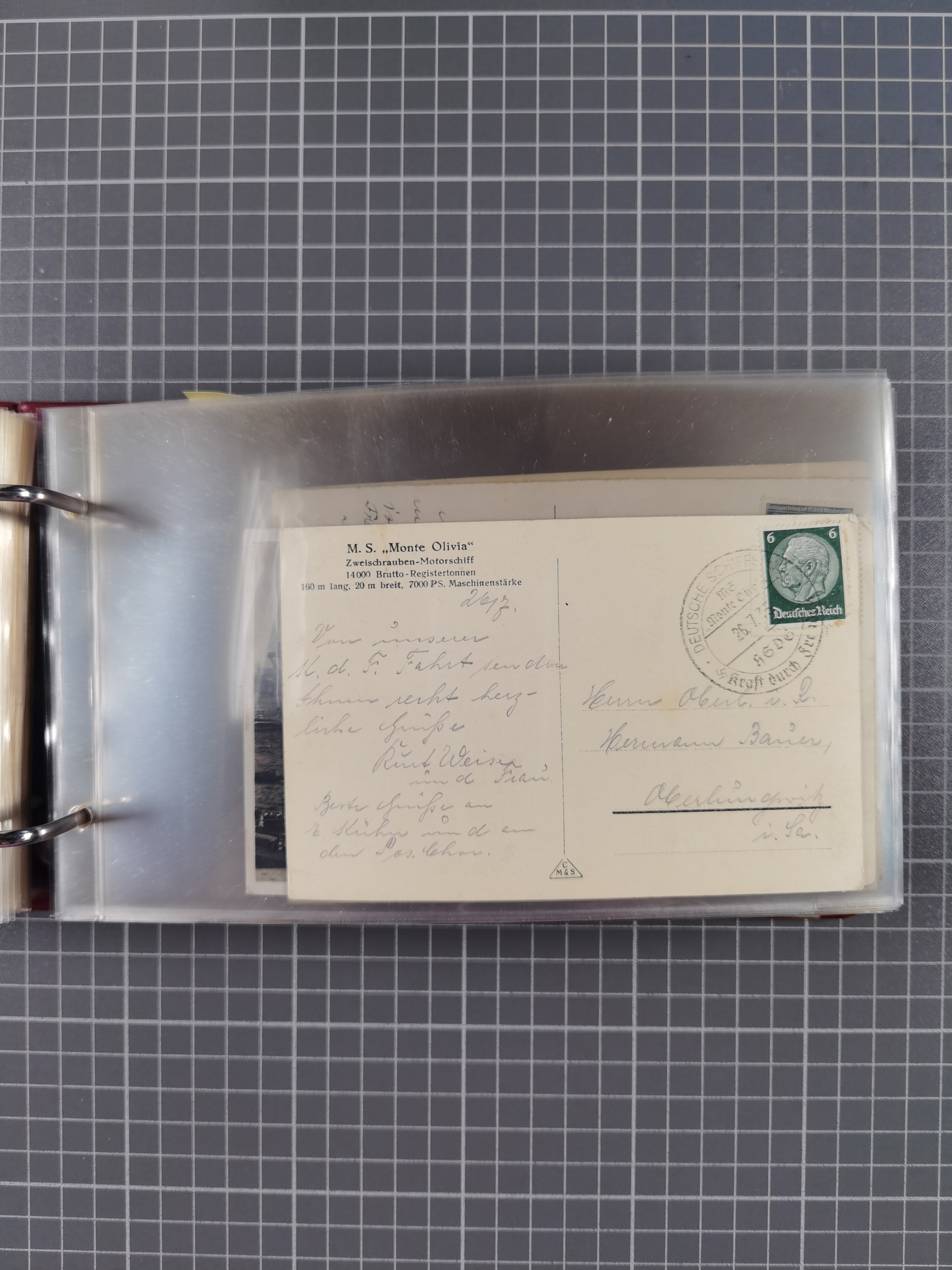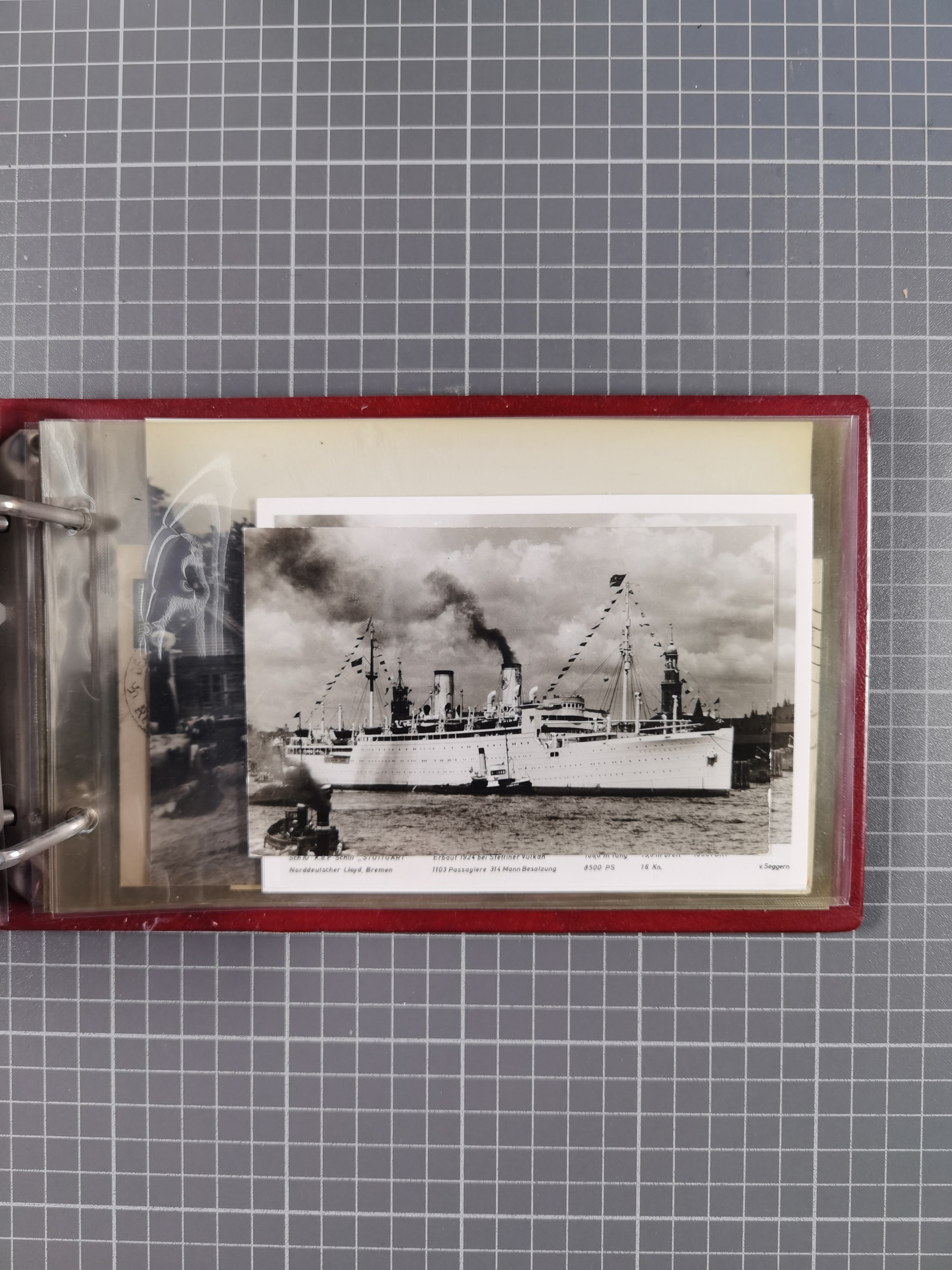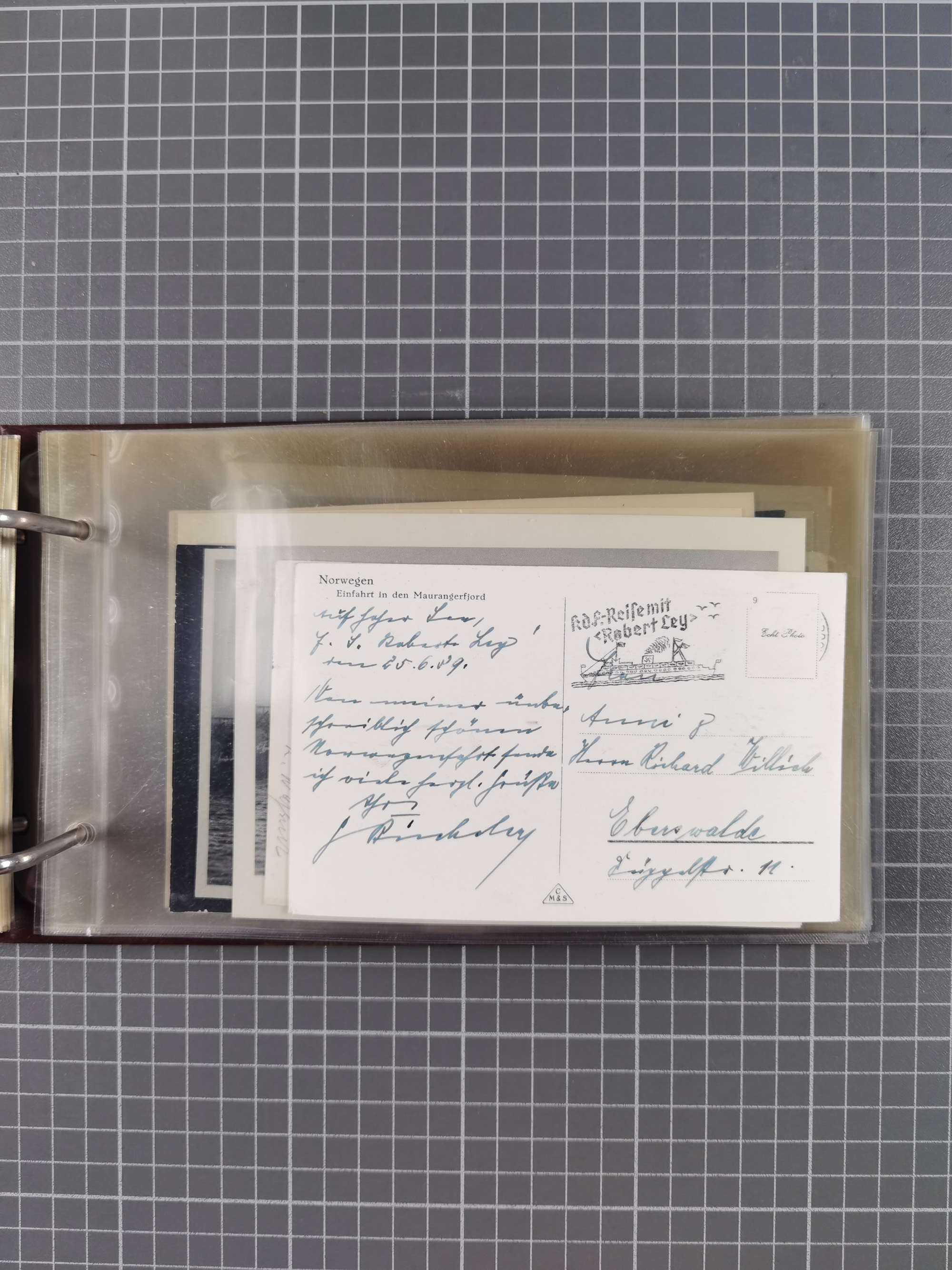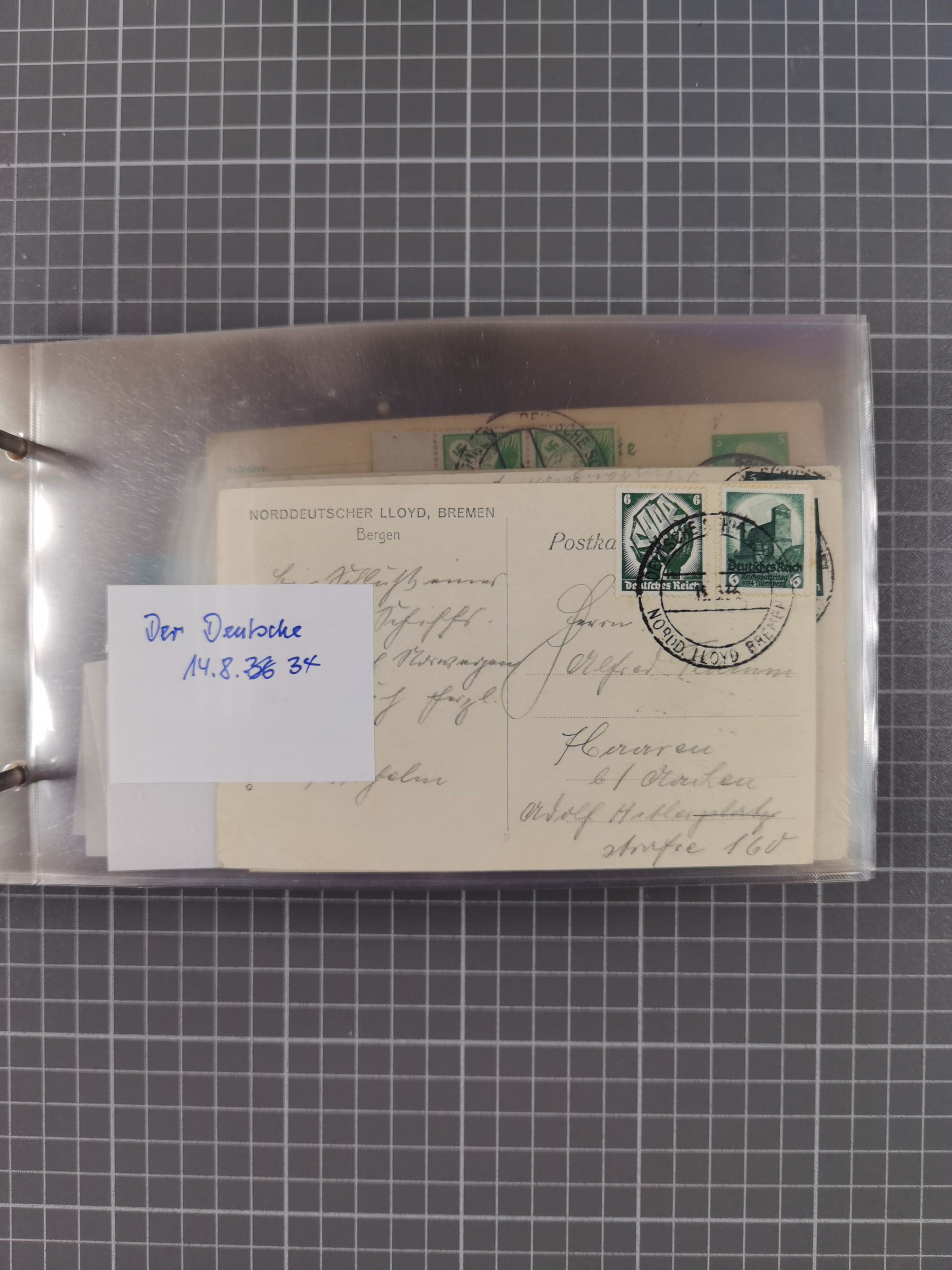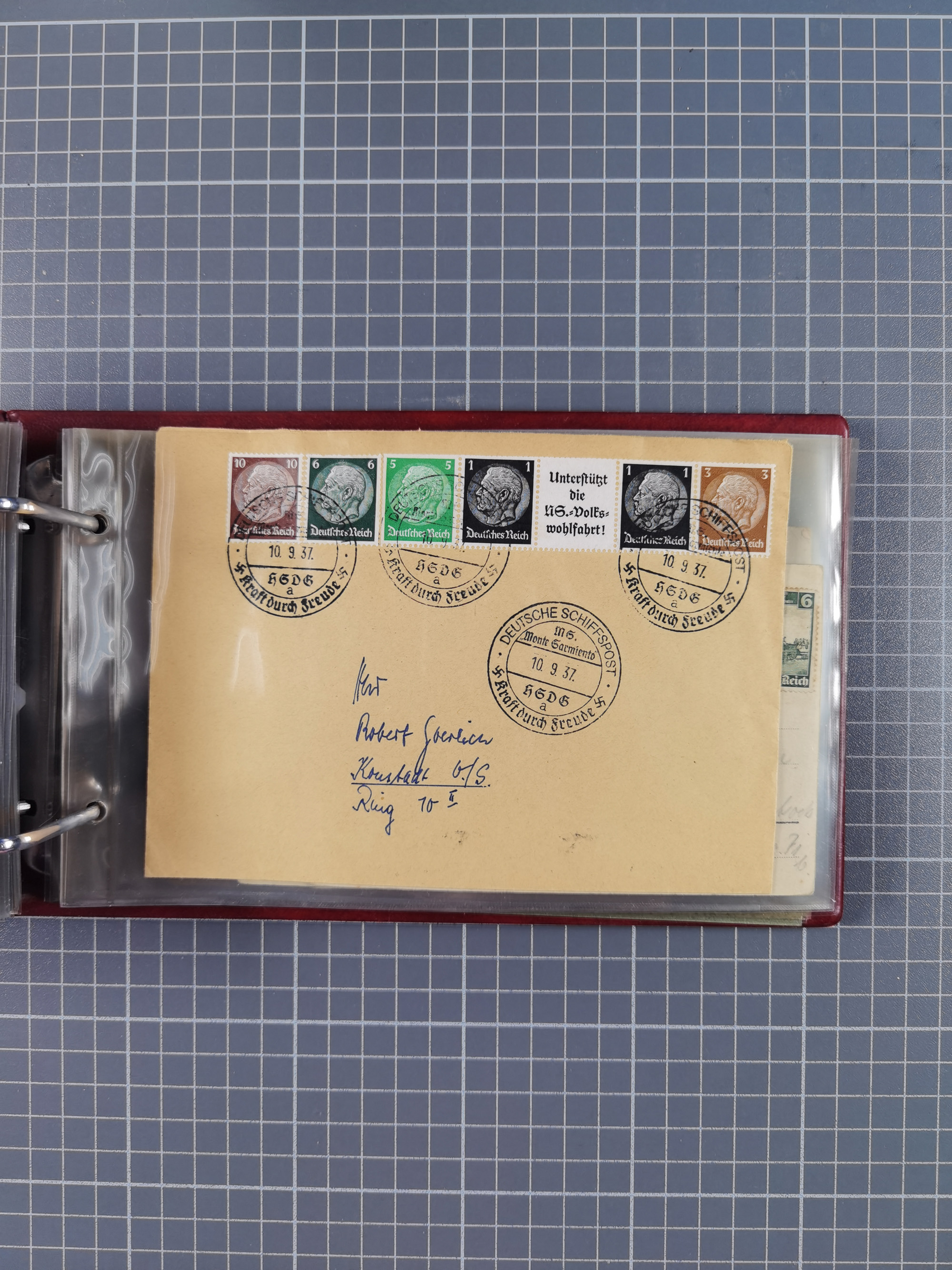 1934/39, Sammlung “Kraft durch Freude” mit ca. 240 Briefen, Karten und GSK inkl. Stempel des "LLOYD BREMEN", dazu Fotos, Schiffsansichtskarten, Speisekarten usw., sauber in vier Alben, ex Steinmeyer