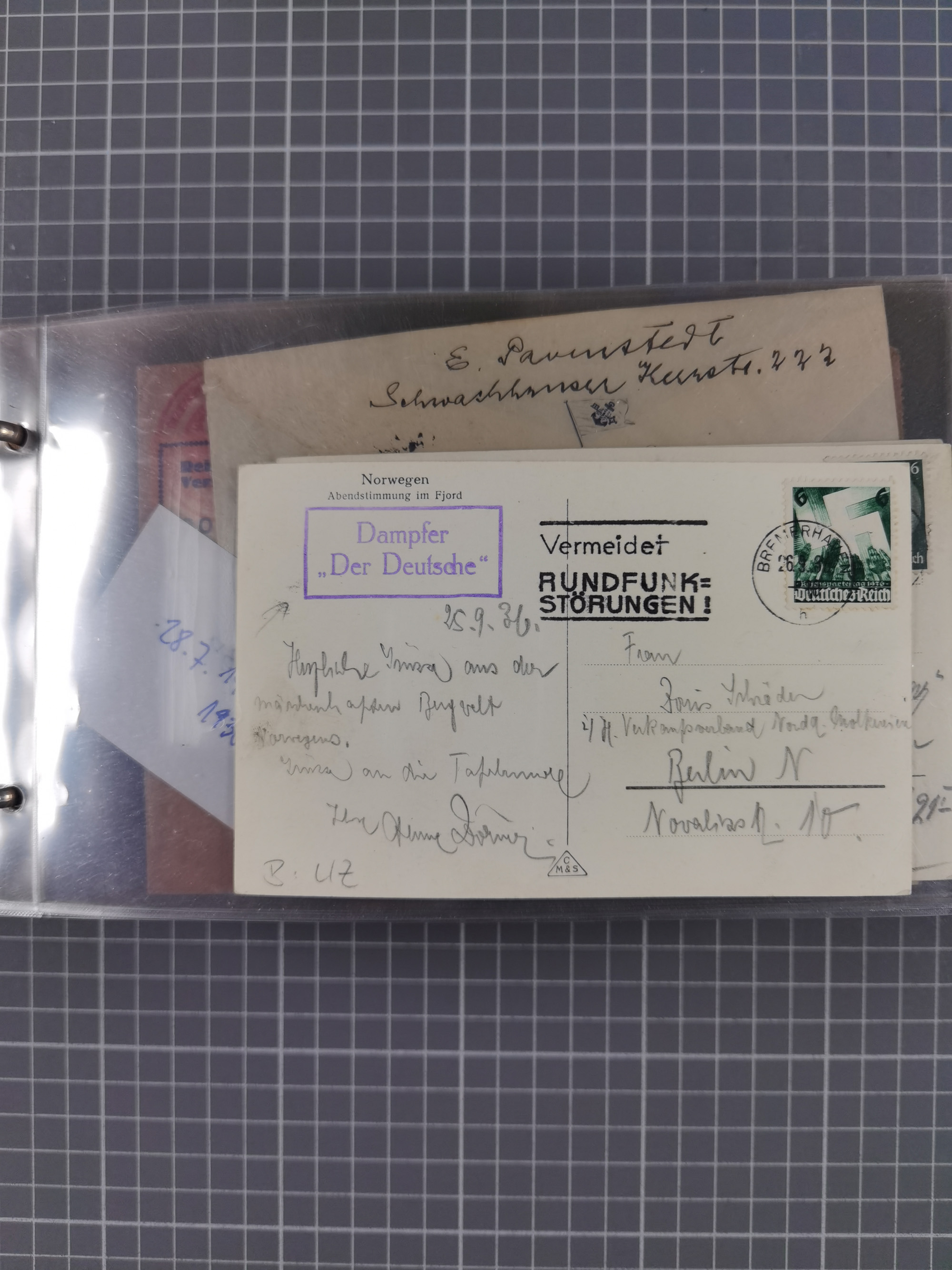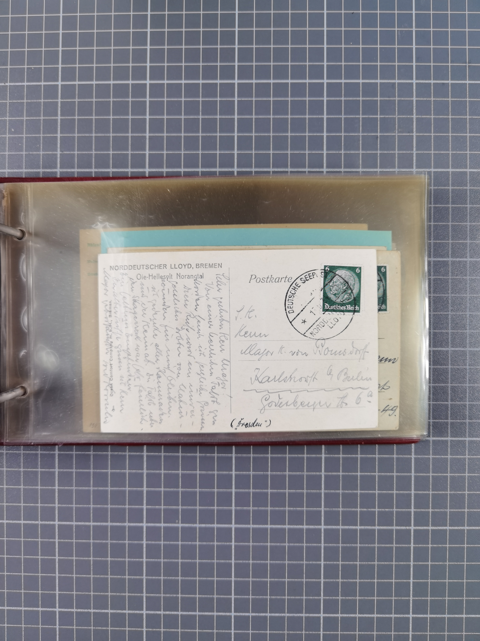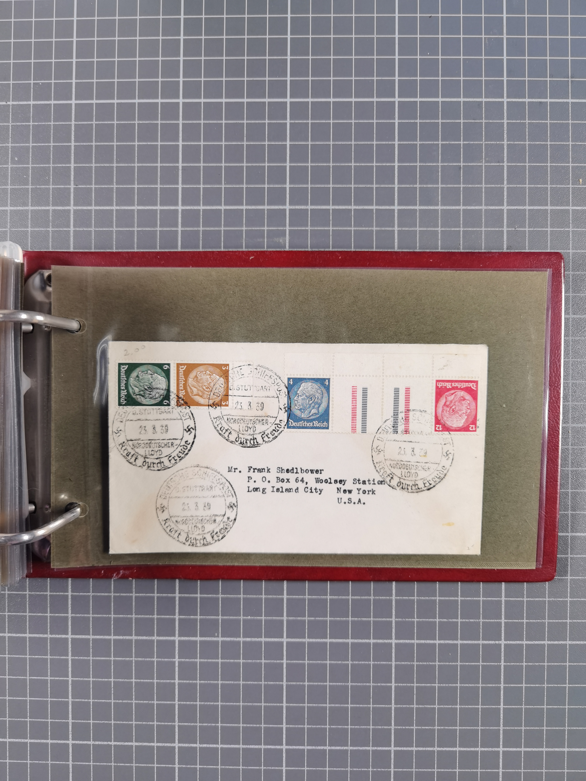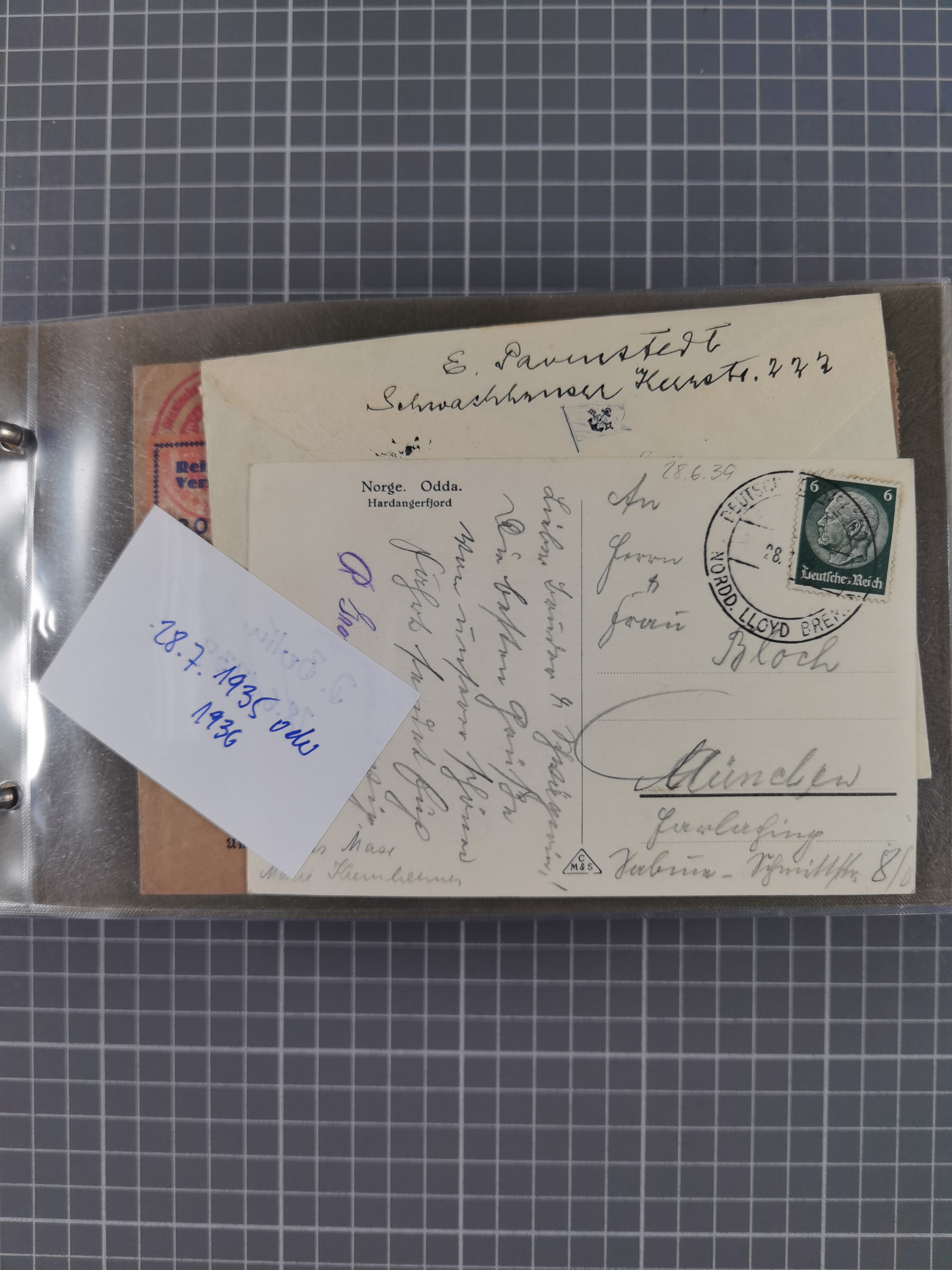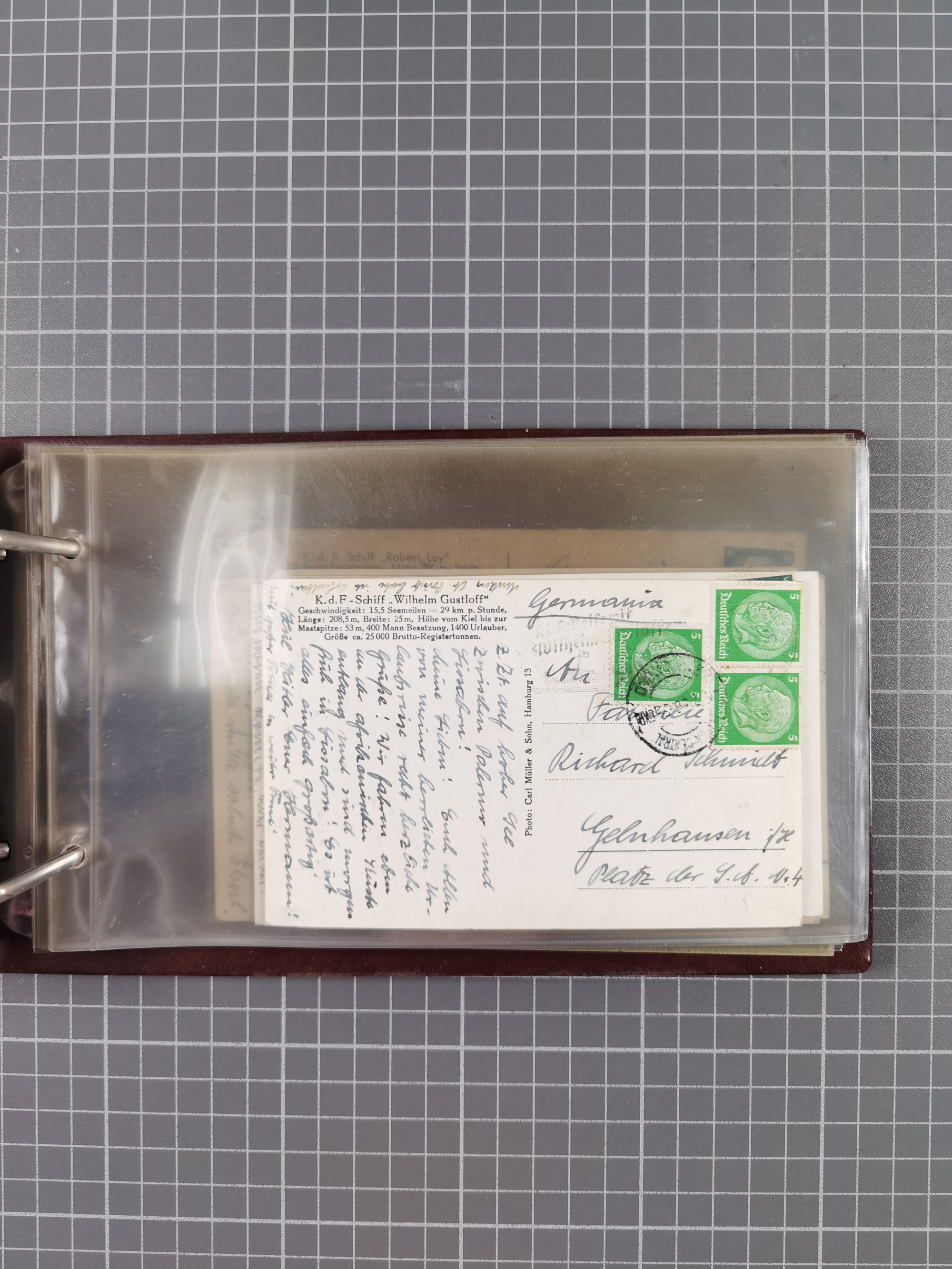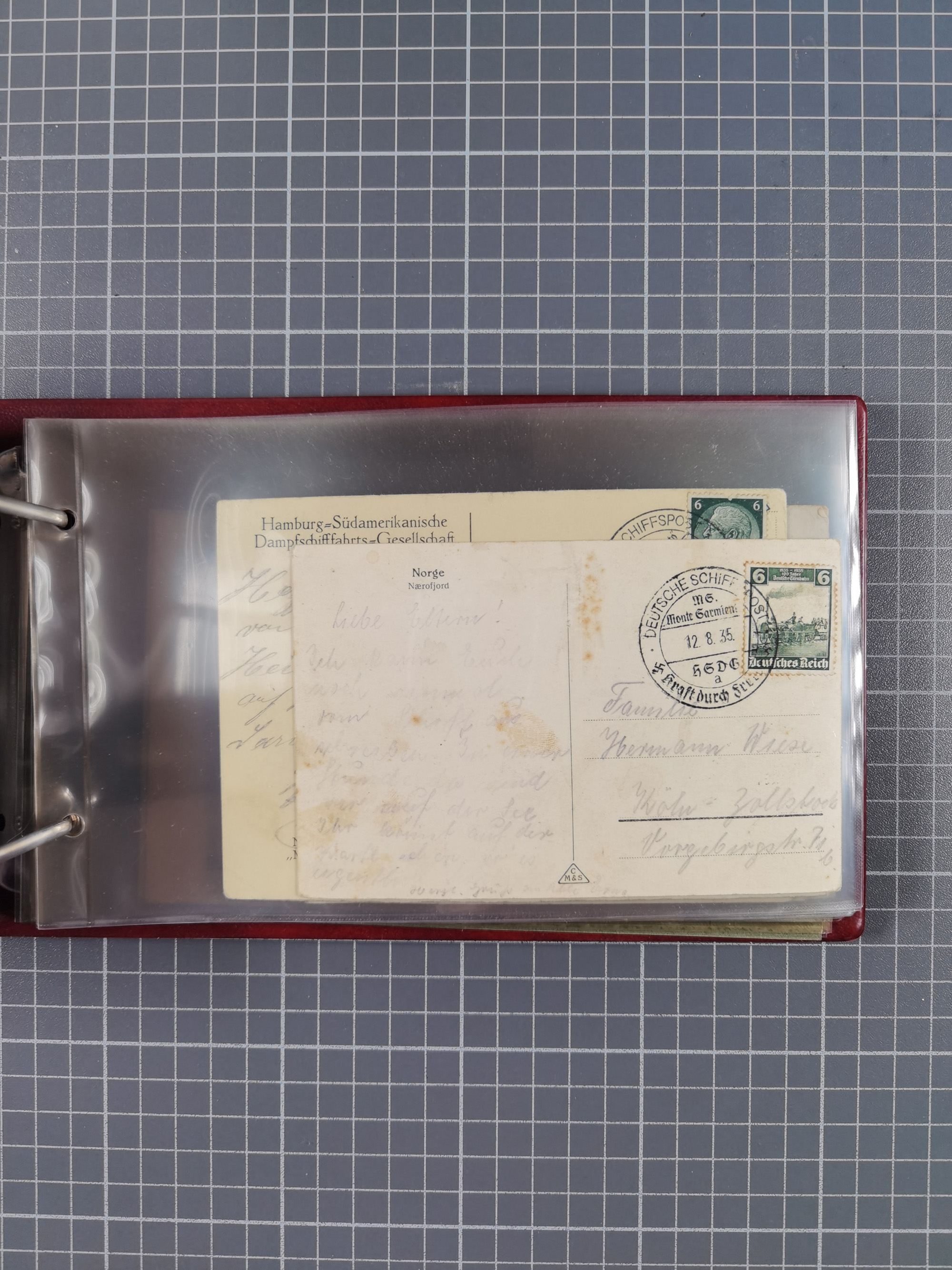 1934/39, Sammlung “Kraft durch Freude” mit ca. 240 Briefen, Karten und GSK inkl. Stempel des "LLOYD BREMEN", dazu Fotos, Schiffsansichtskarten, Speisekarten usw., sauber in vier Alben, ex Steinmeyer