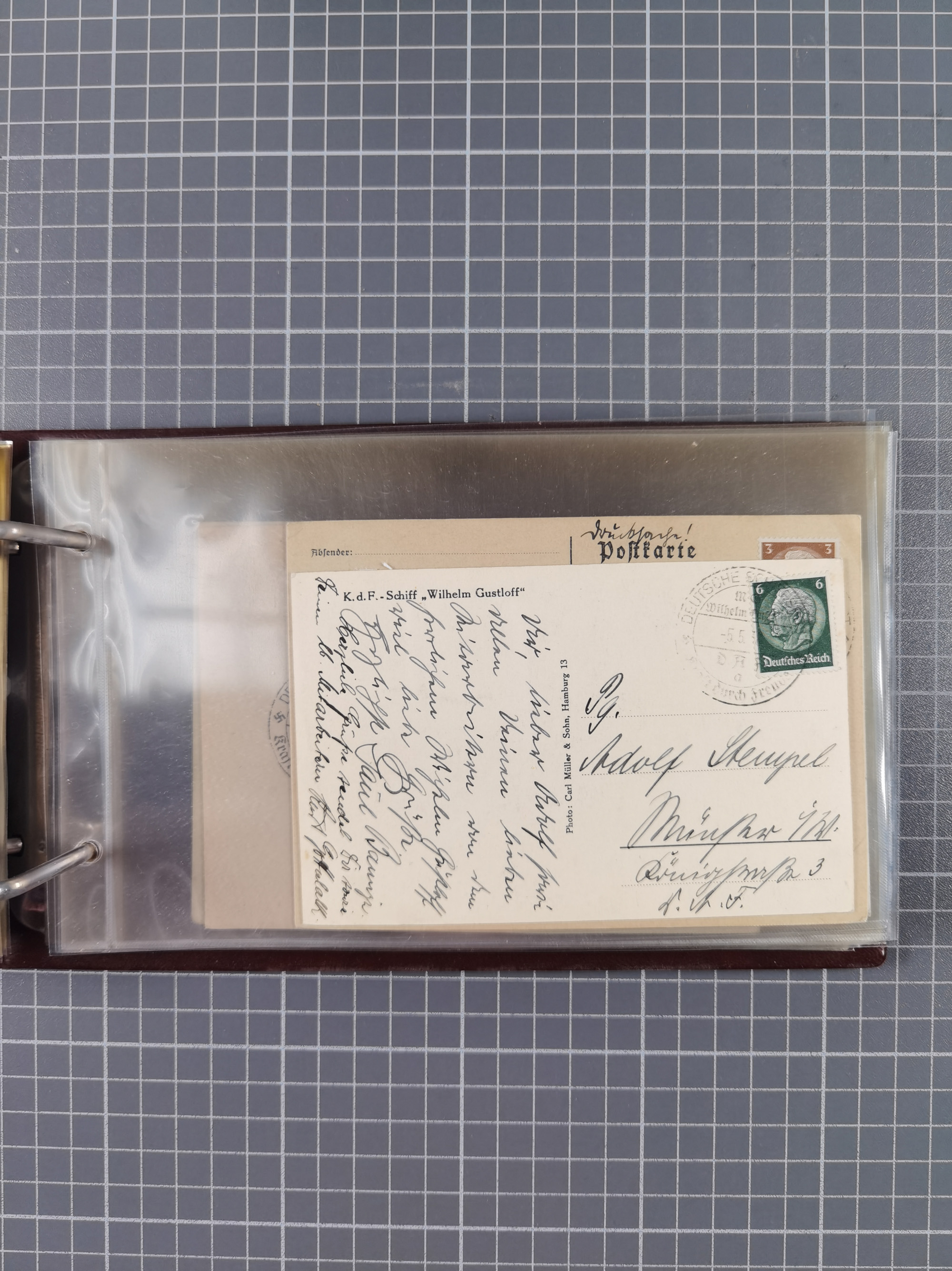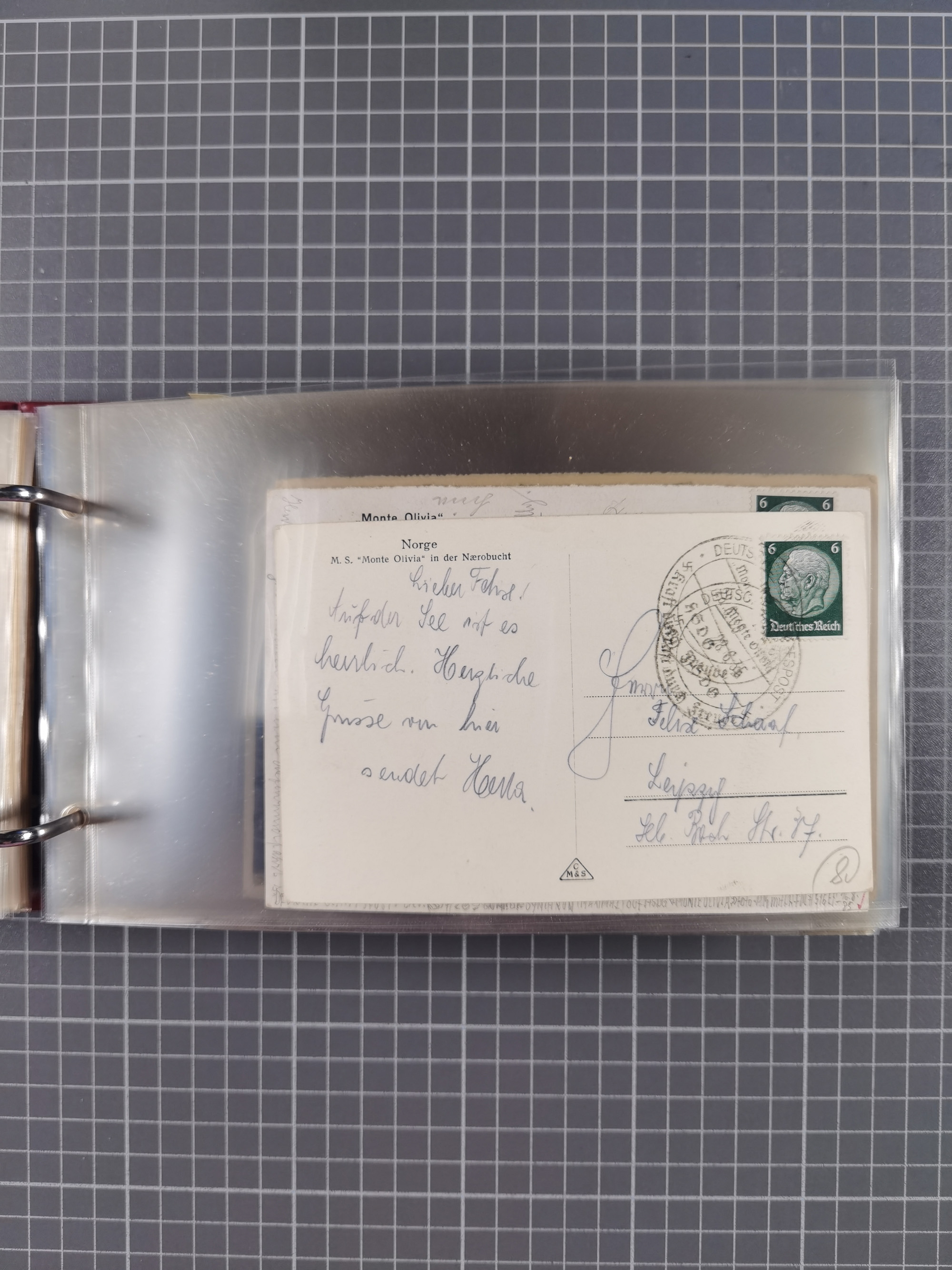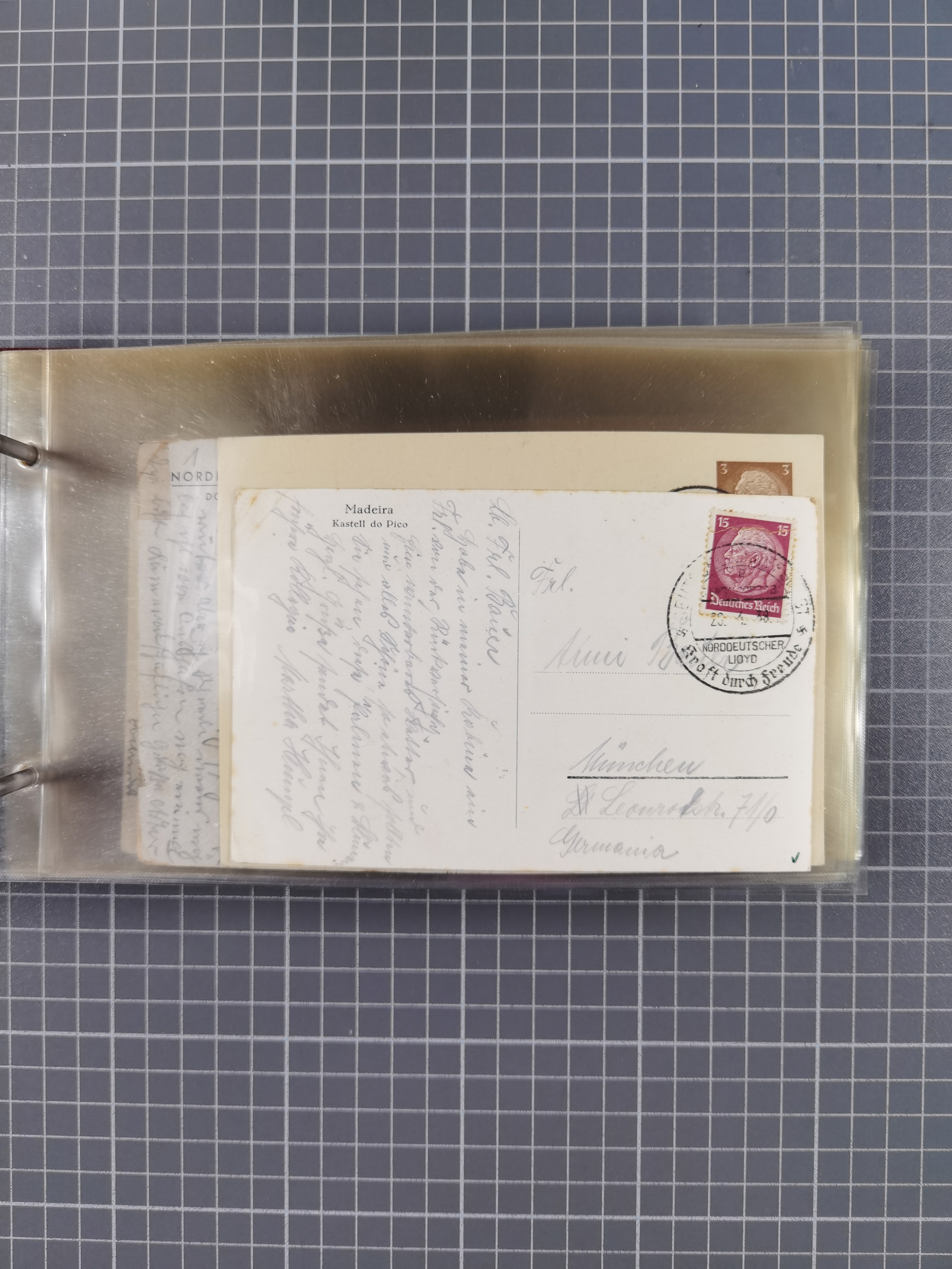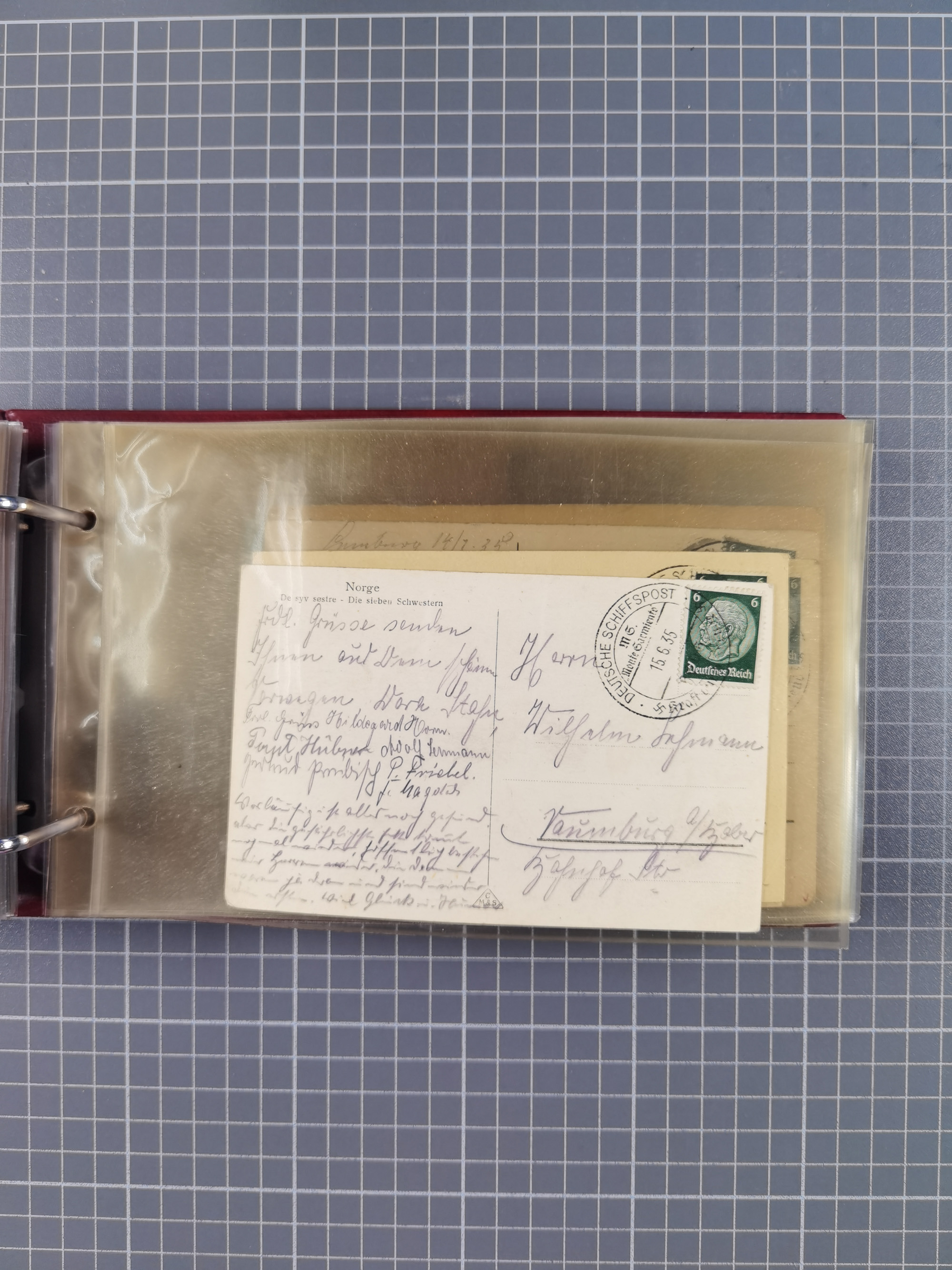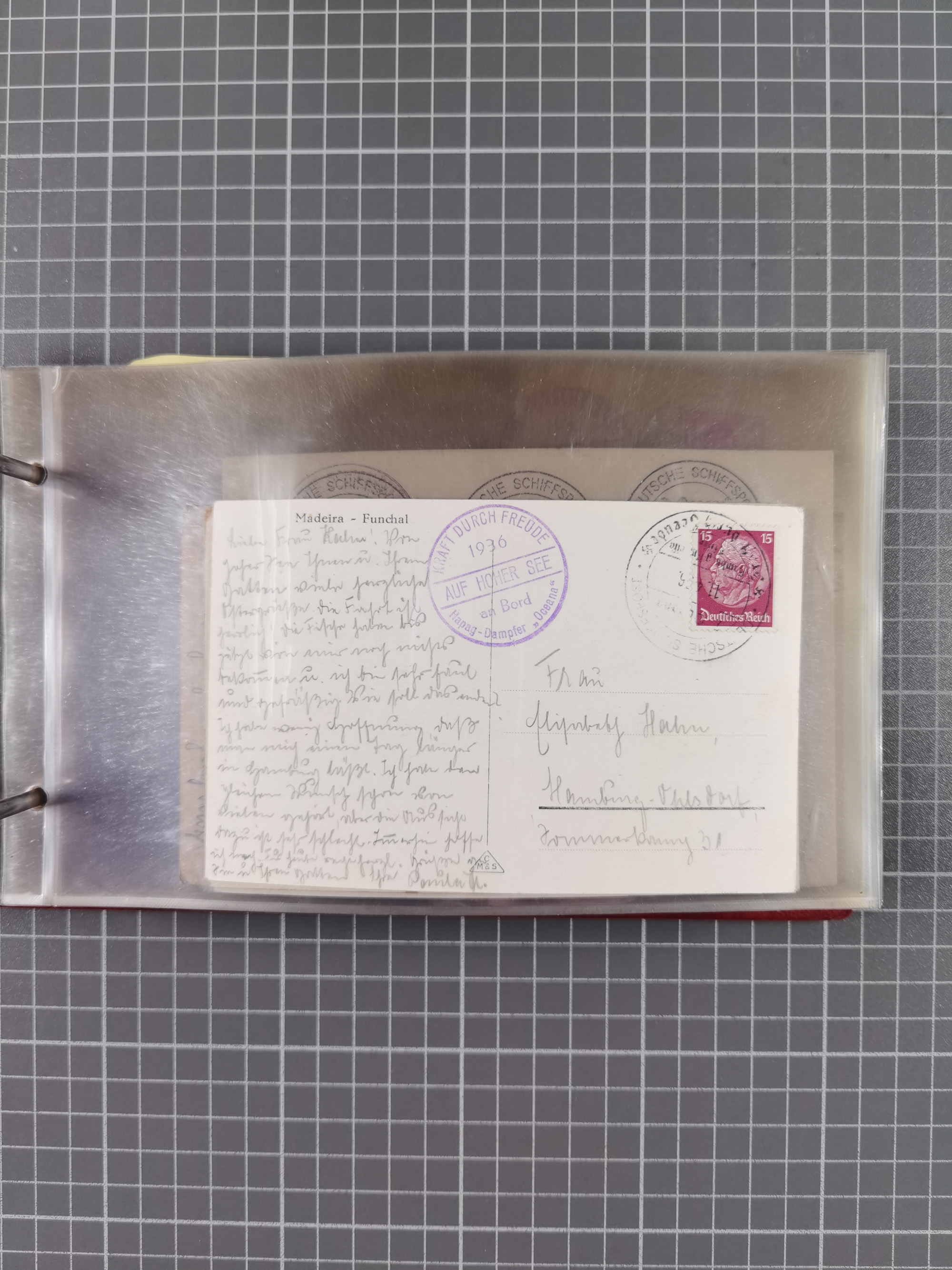 1934/39, Sammlung “Kraft durch Freude” mit ca. 240 Briefen, Karten und GSK inkl. Stempel des "LLOYD BREMEN", dazu Fotos, Schiffsansichtskarten, Speisekarten usw., sauber in vier Alben, ex Steinmeyer
