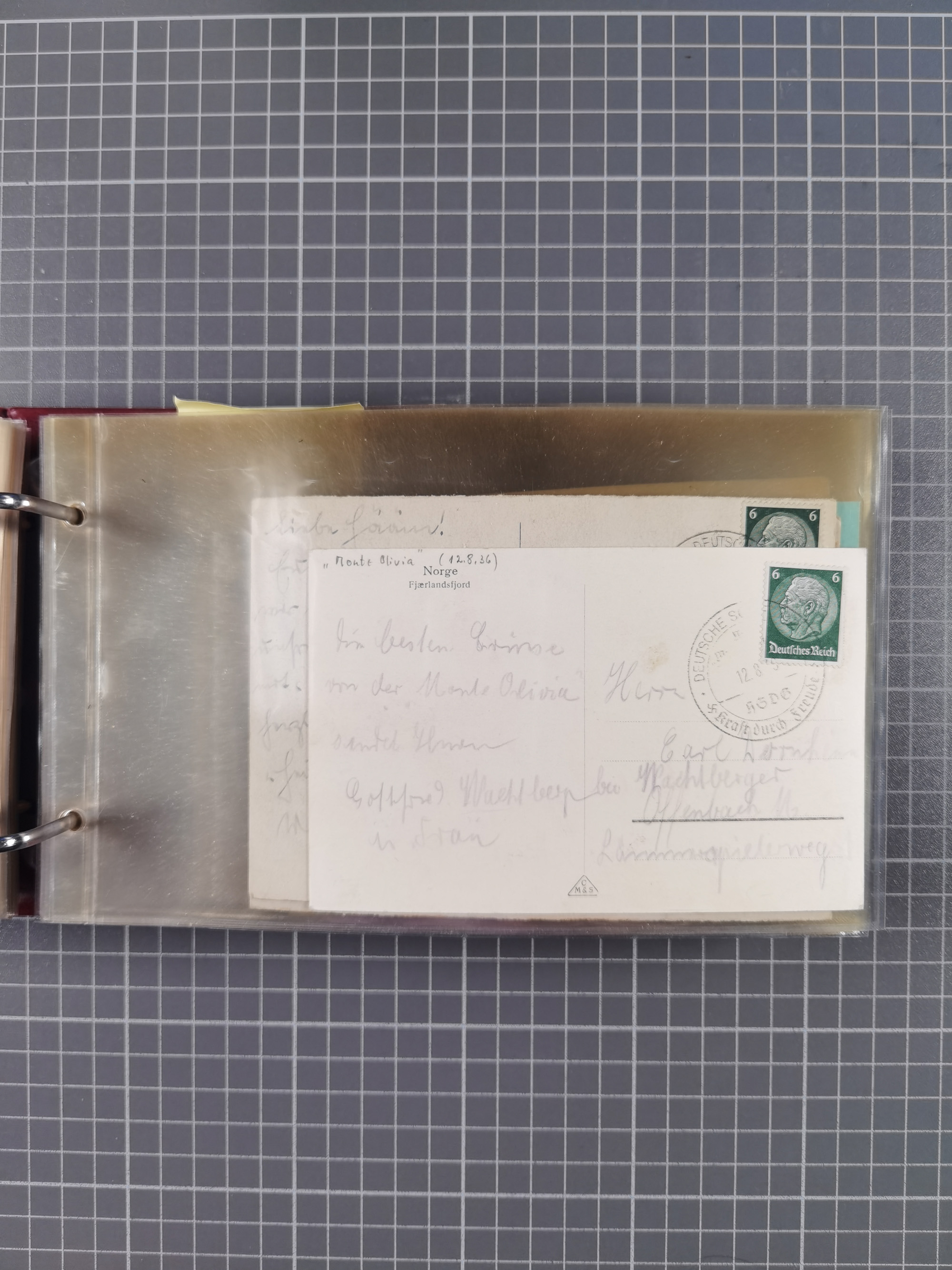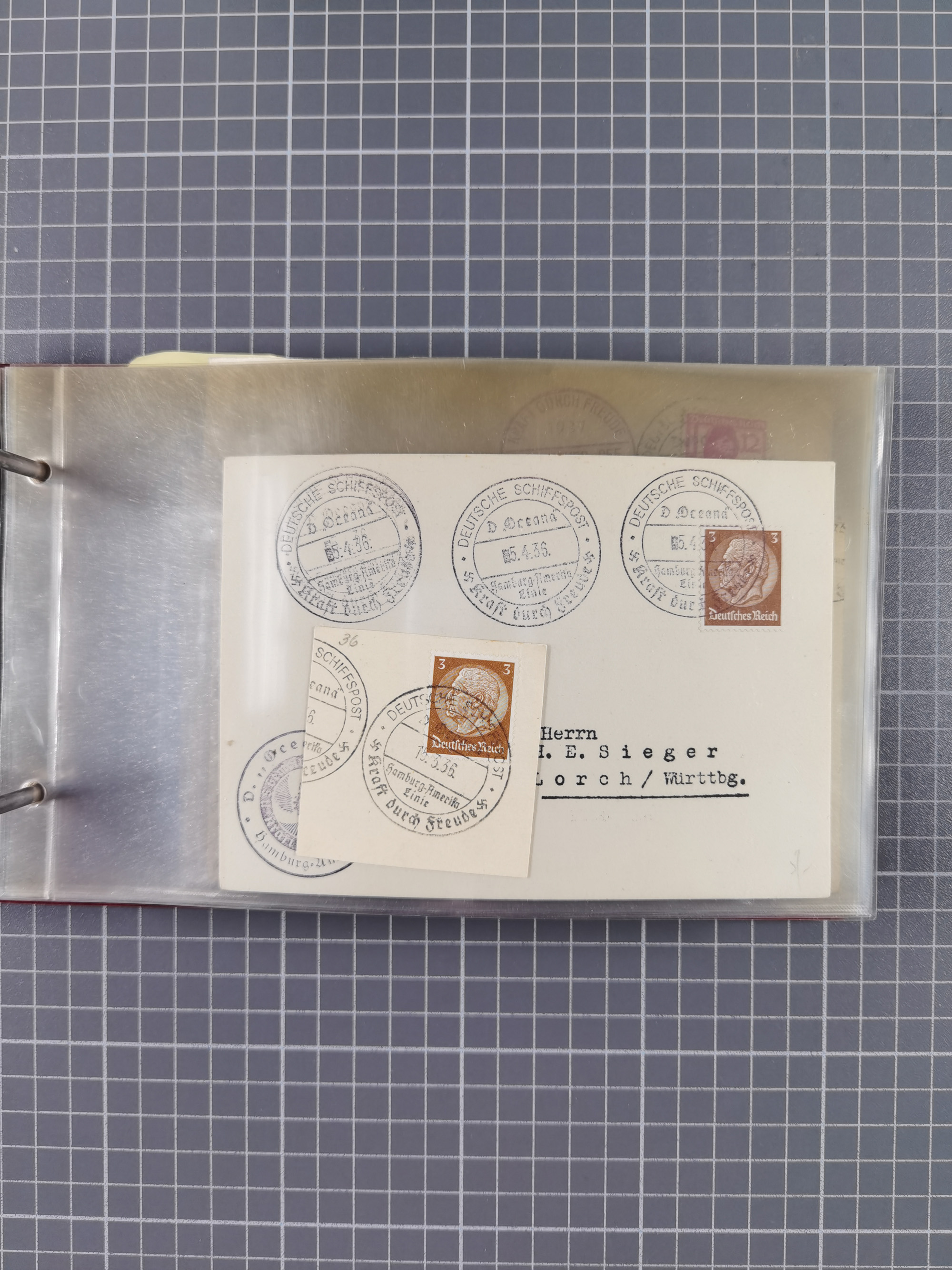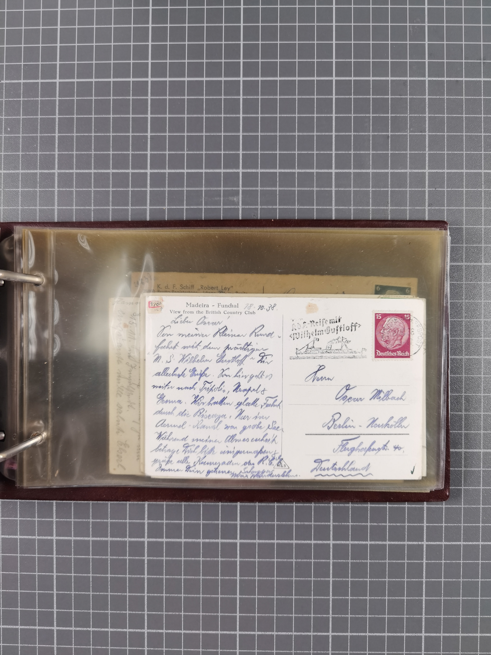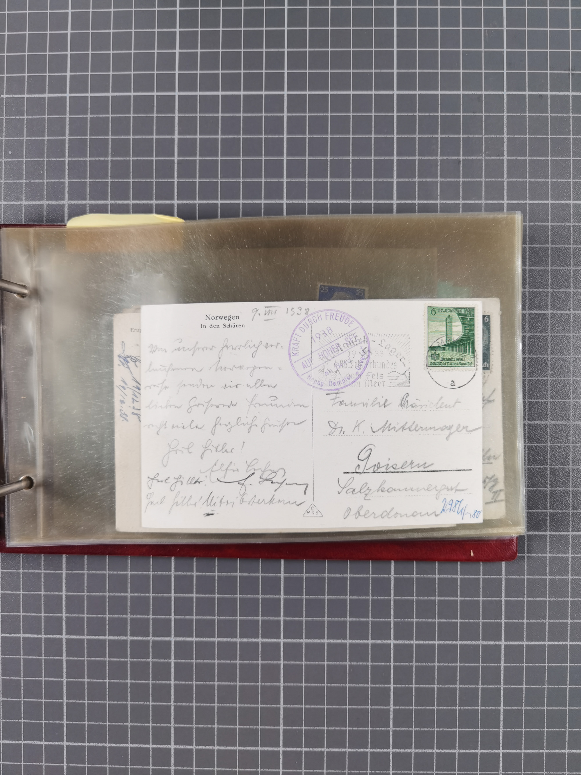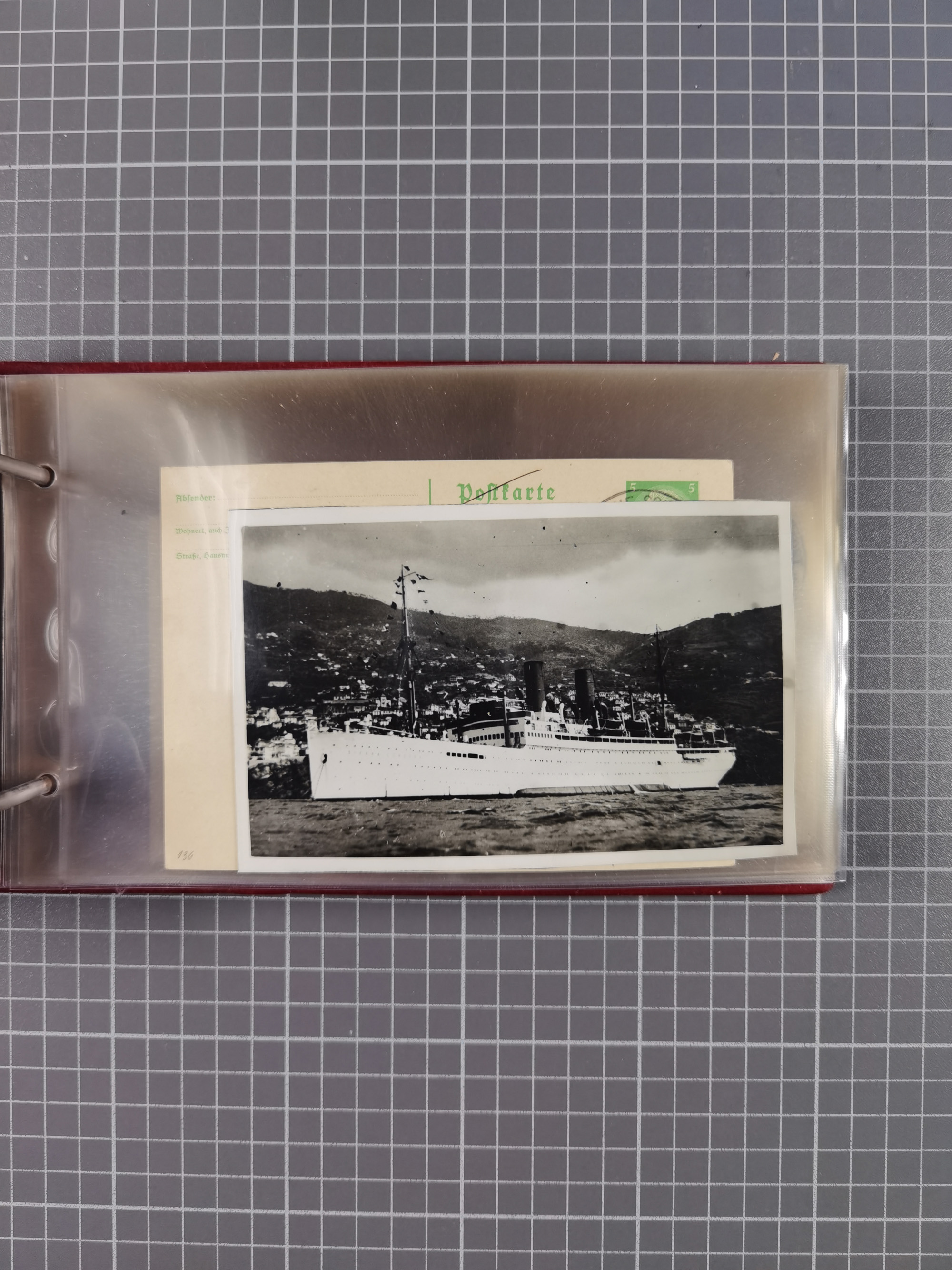 1934/39, Sammlung “Kraft durch Freude” mit ca. 240 Briefen, Karten und GSK inkl. Stempel des "LLOYD BREMEN", dazu Fotos, Schiffsansichtskarten, Speisekarten usw., sauber in vier Alben, ex Steinmeyer