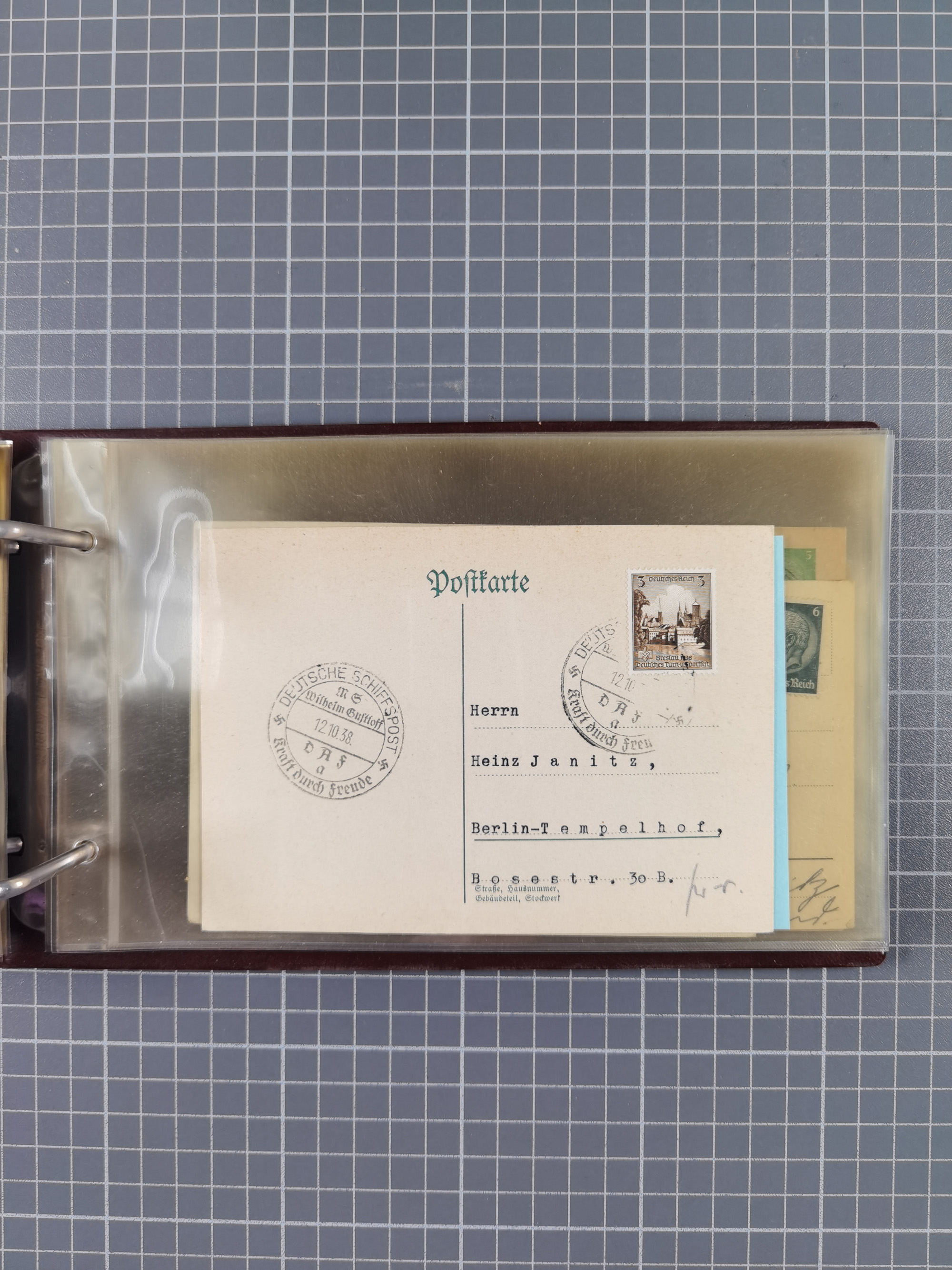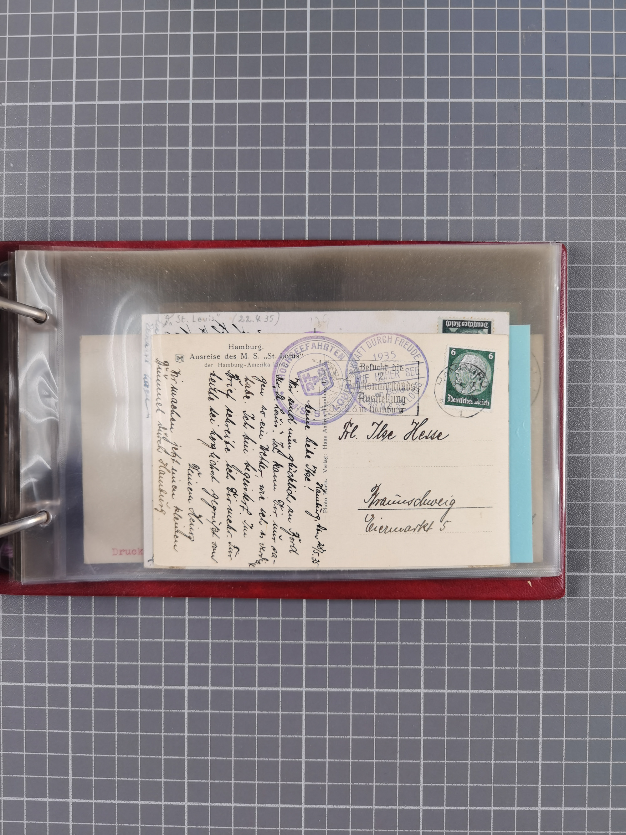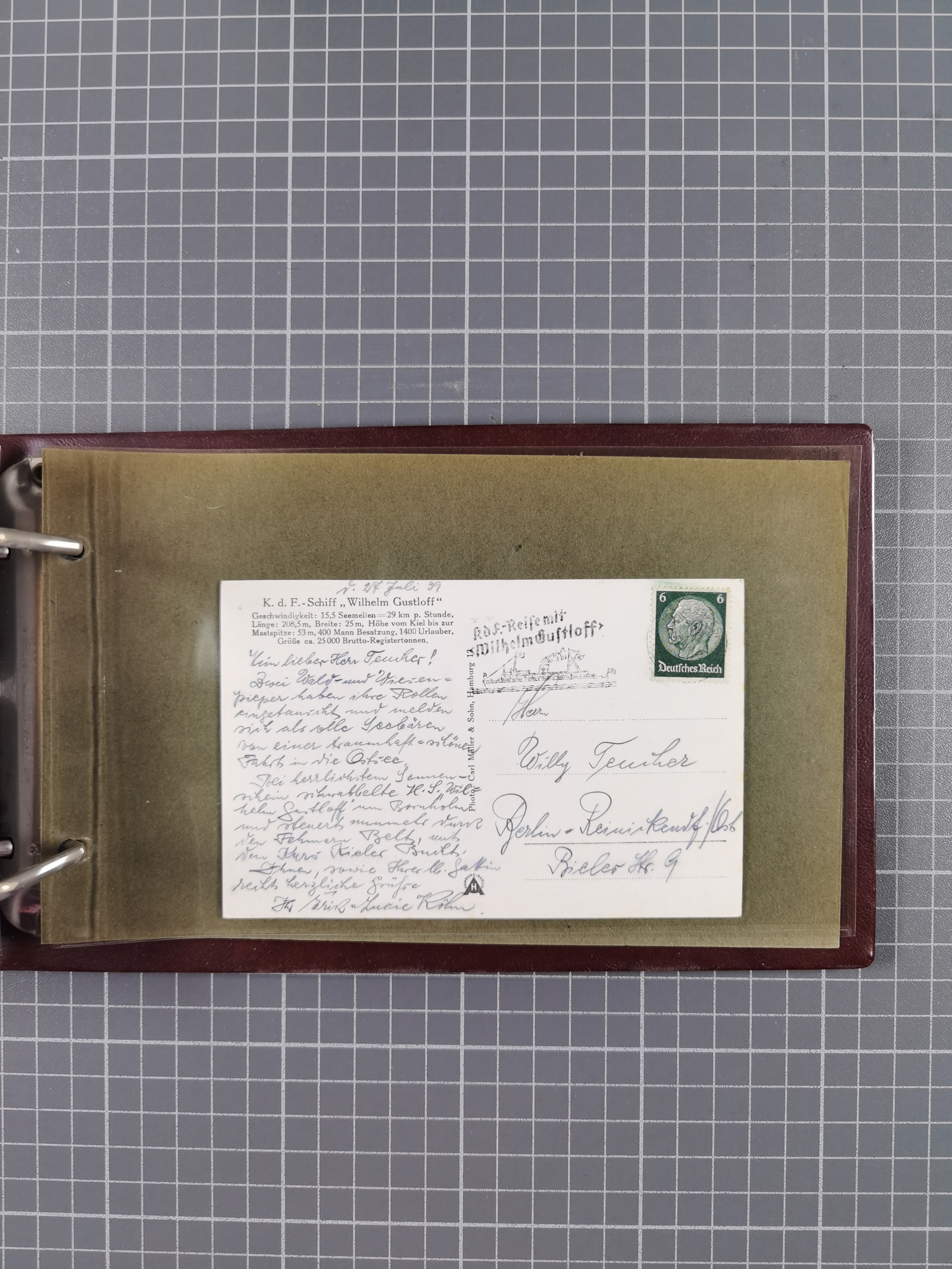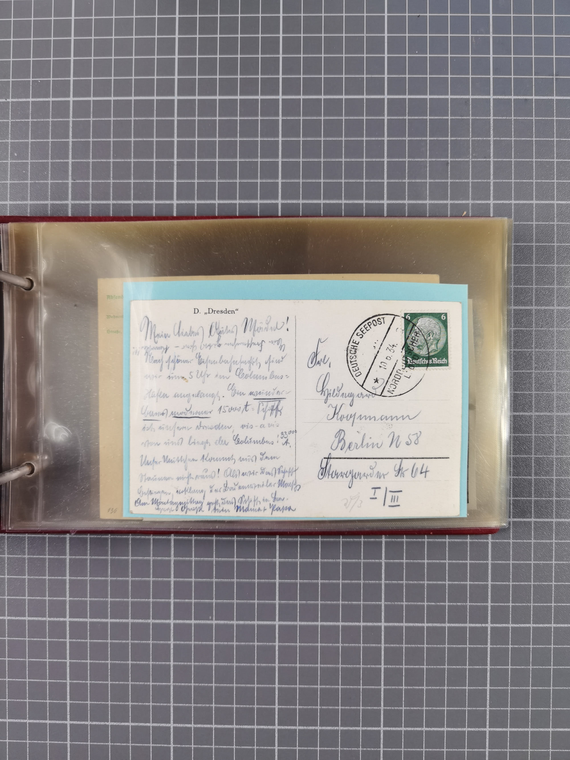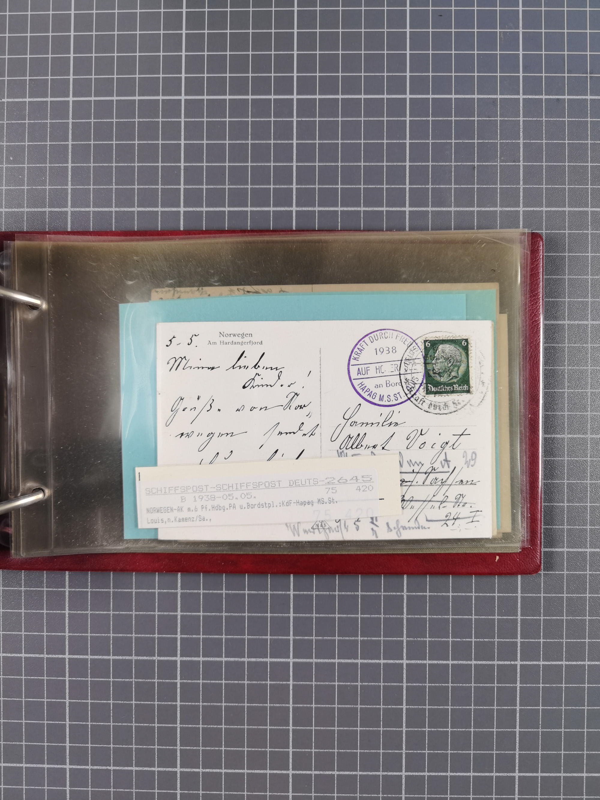 1934/39, Sammlung “Kraft durch Freude” mit ca. 240 Briefen, Karten und GSK inkl. Stempel des "LLOYD BREMEN", dazu Fotos, Schiffsansichtskarten, Speisekarten usw., sauber in vier Alben, ex Steinmeyer