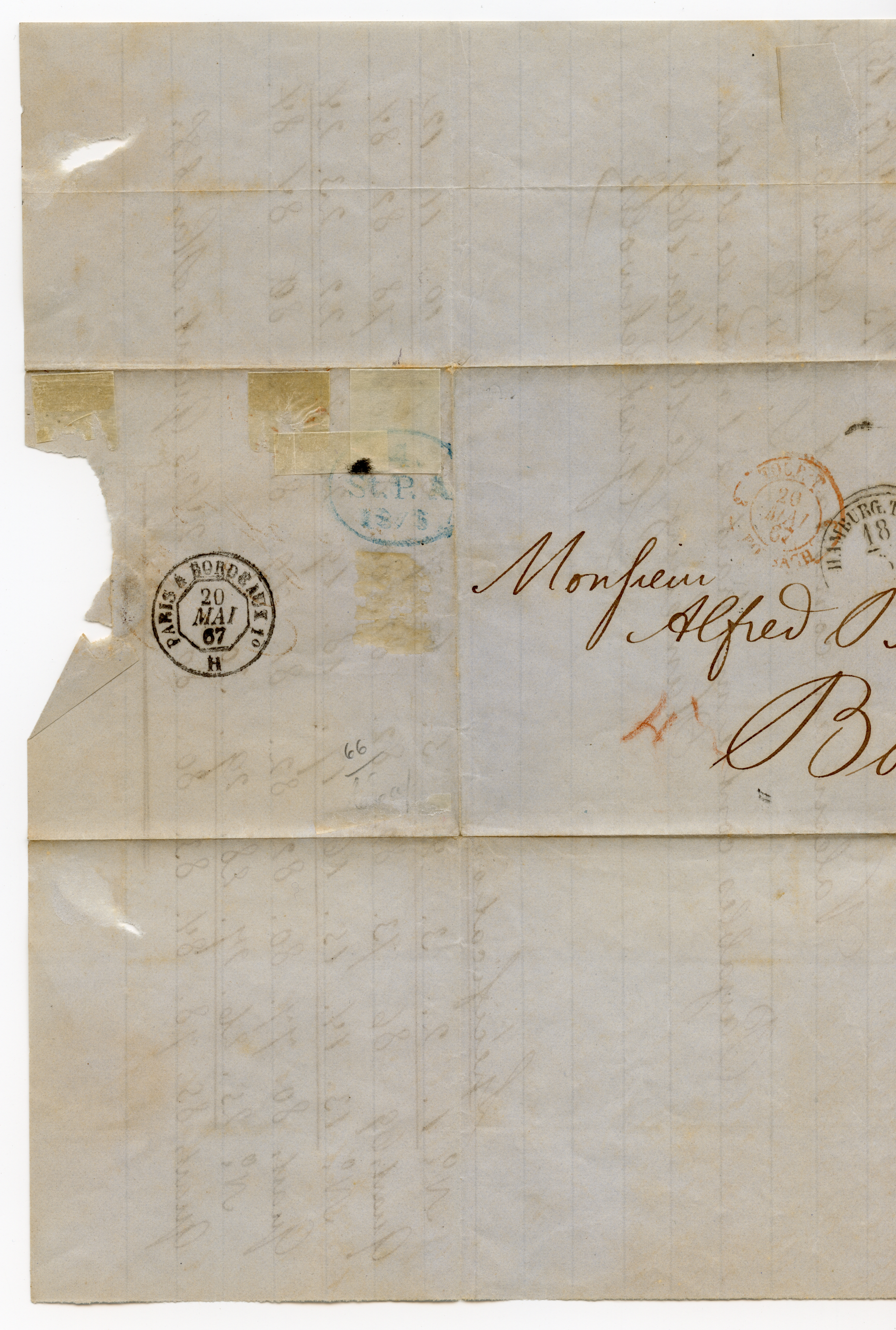 2 Sch. orangerot, 3 Einzelstücke als senkrechter Streifen geklebt, mit blauem Strichstempel und teils zusätzlich aufgesetztem Taxis-EKr. “HAMBURG T.&TH. 1/6 67”auf Briefkuvert nach Frankreich.