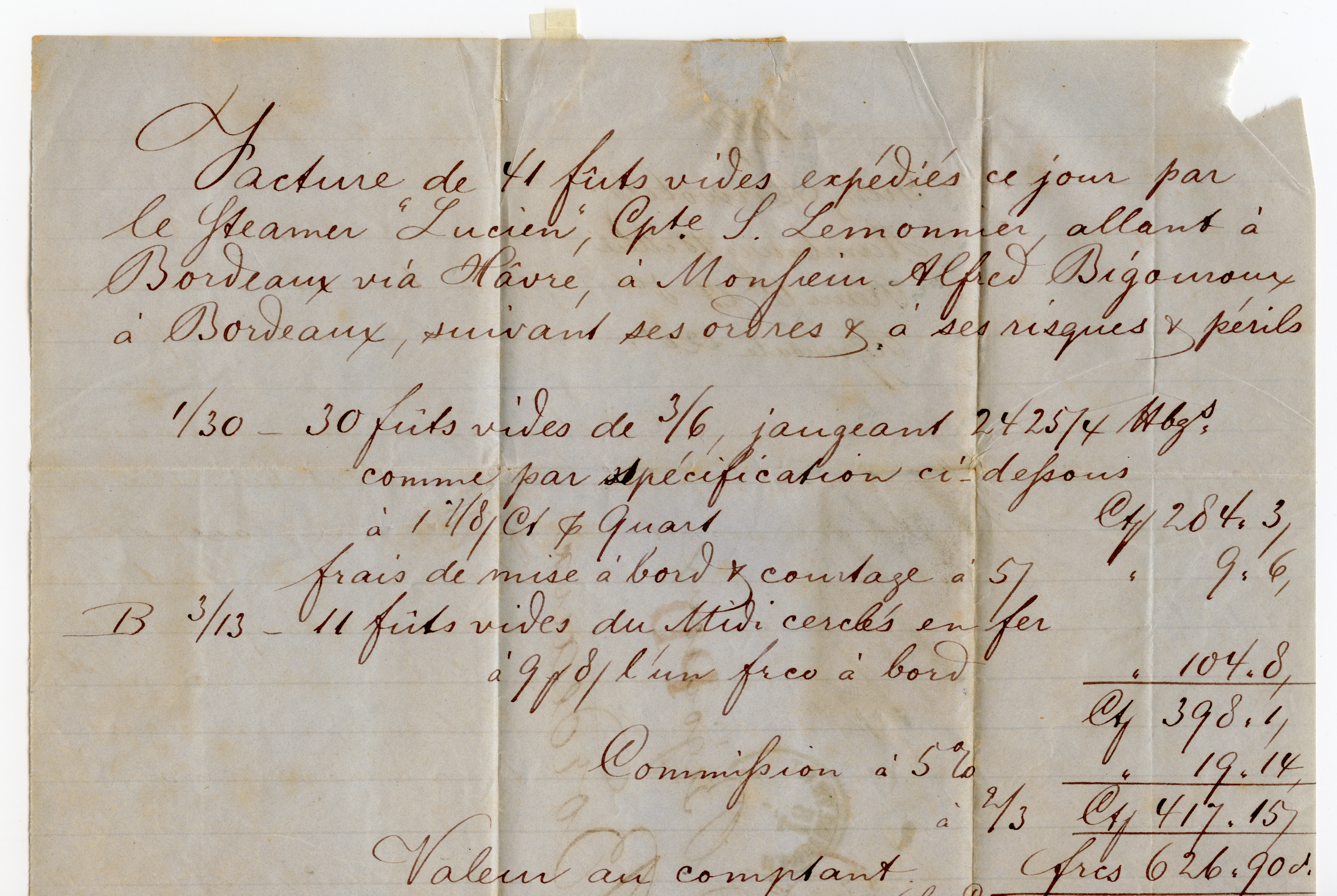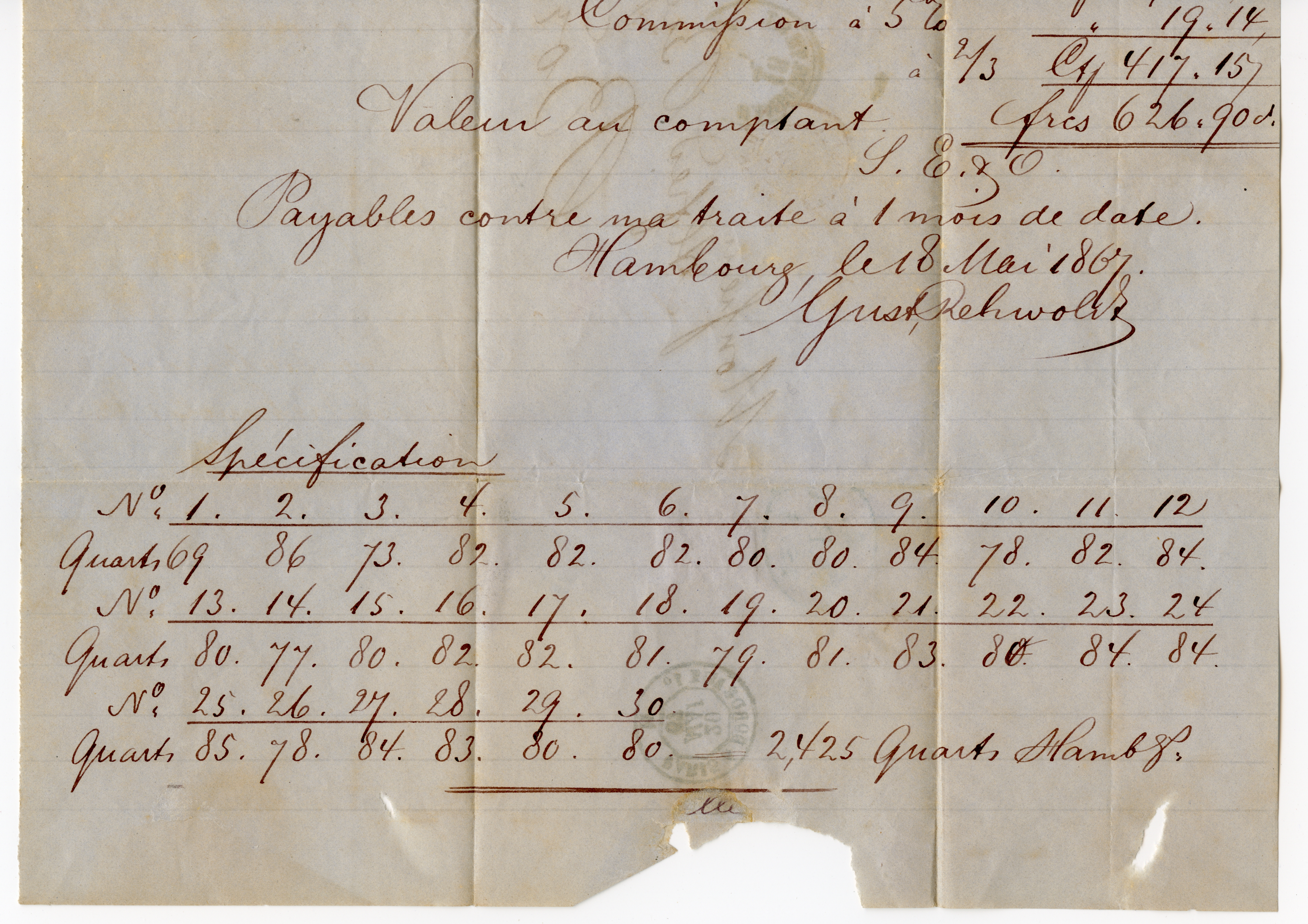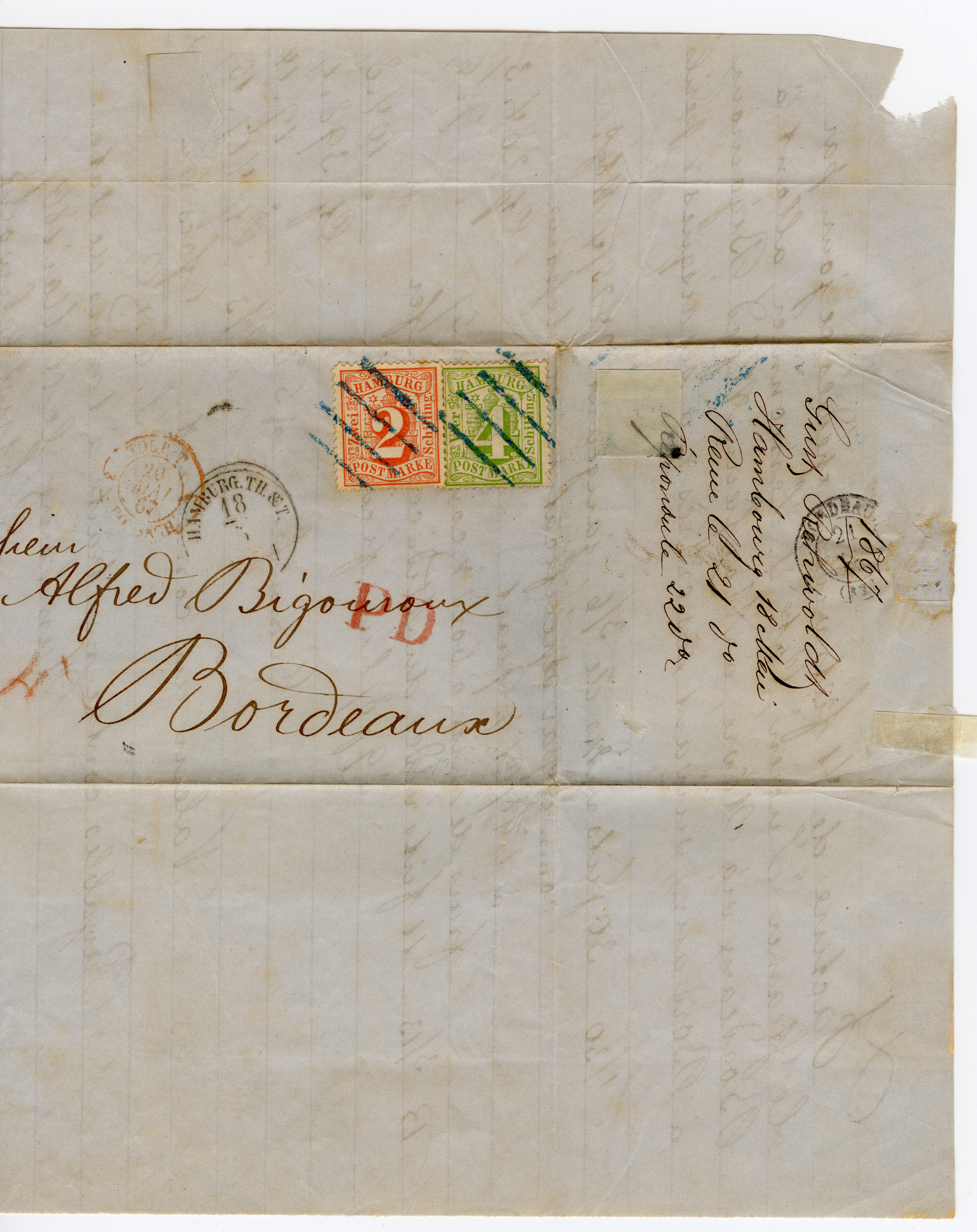 2 Sch. orangerot und 4 Sch. grün, beide farbfrisch und gut gezähnt mit blauem Strichstempel und nebengesetztem Taxis-EKr. "HAMBURG TH.&T. 18/5" (1867) auf Faltbrief nach Bordeaux. Ein Zähnchen gering fleckig, sonst einwandfrei.