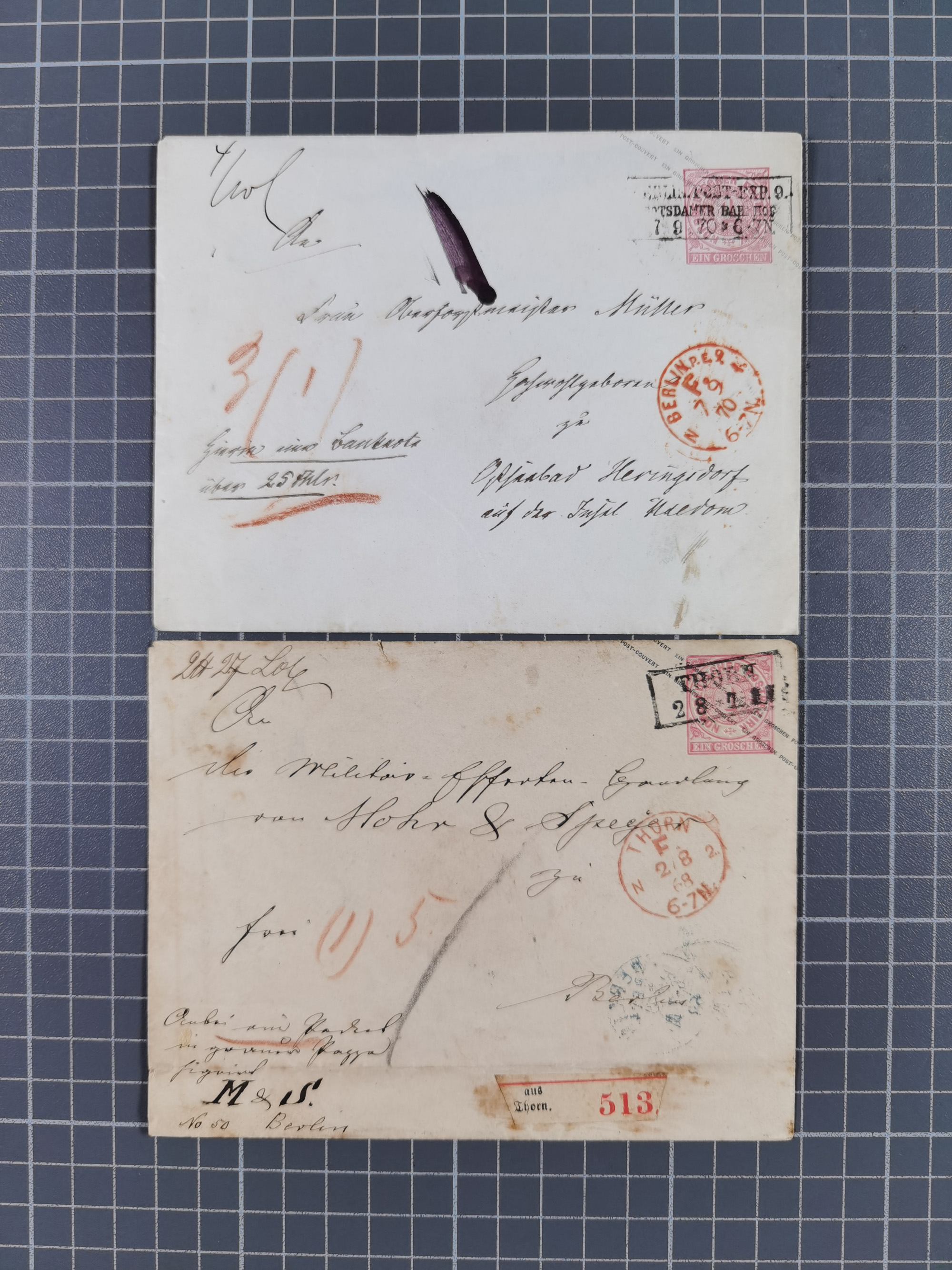 1870/71, 2 Briefe mit Mehrfachfrankaturen. 1 Brief von Neustettin 11.11.71 nach Mark Friedland mit 6 x 1/3 Groschen Mi. Nr. 14 (2 Marken wurden bereits fehlerhaft aufgeklebt) 1 Brief von Cottbus 1.10.70 nach Chemnitz (Banknoten Couvert Briefmarken") mit 5 x 1 Groschen Mi. Nr. 16
