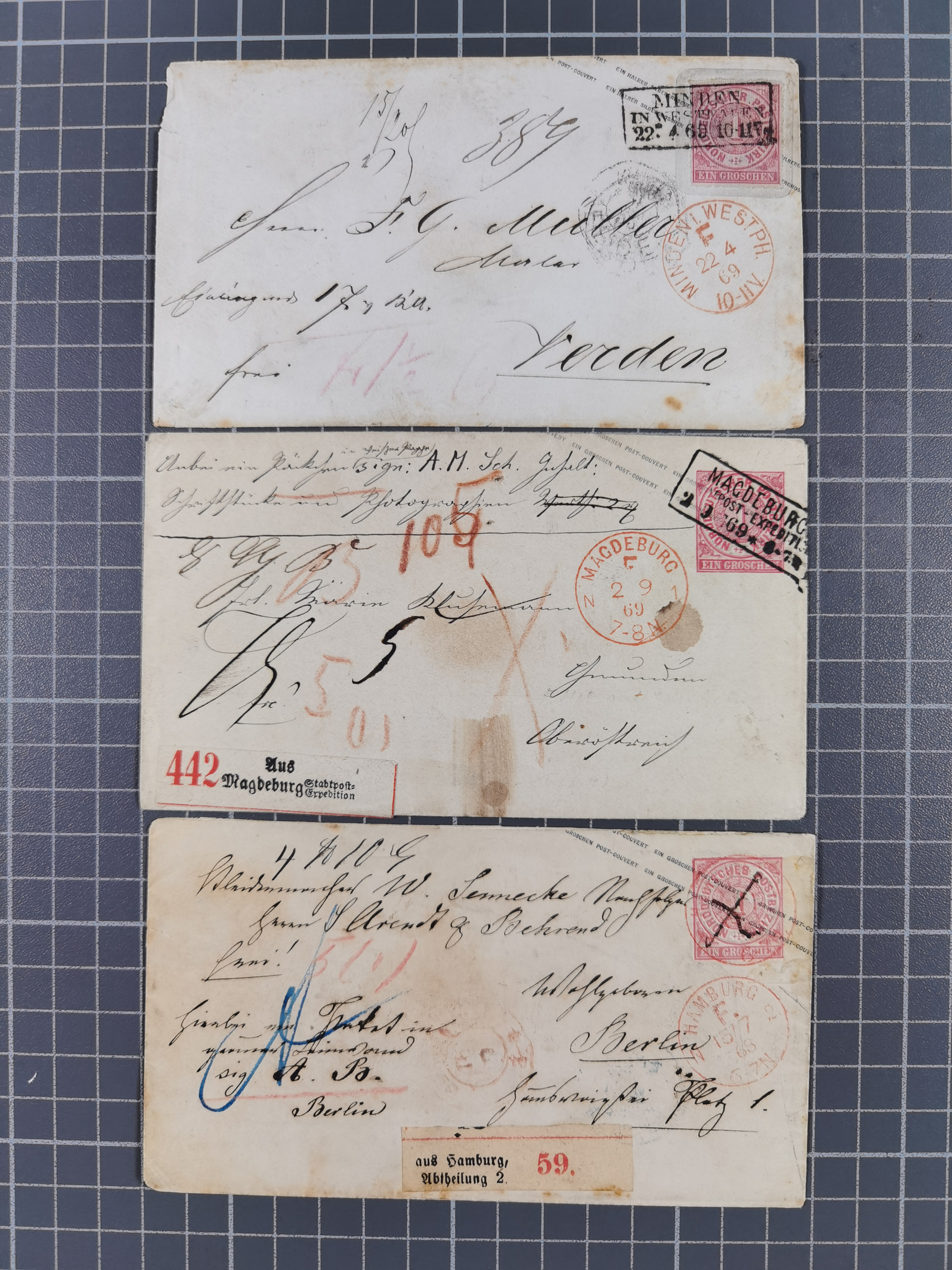 REICHSPOST-VORLÄUFER, ausstellungsmäßig aufgezogene Spezialsammlung von rund 120 Belegen und einigen losen Marken, Einheiten und Briefstücken, dabei eine Vielzahl von seltenen und besonderen Stücken, u.a. Frankaturen der durchstochenen Marken Mi. 2-4,9 und 11 (letztere u.a. MeF), Ortsbriefe und -Karten, Auslandsbriefe (dabei Drucksachen, Reco und Grenzrayon), 'Muster ohne Wert', Bücherzettel, Letzttagsbrief, Ganzsachenausschnitte auf Briefen, Eilboten, Währungsmischfrankatur, Mi. 25 als Mehrfachfrankatur und in Farbfrankatur auf Reco-Brief nach Frankreich, etc. etc. ein sehr interessantes und reichhaltiges Objekt.