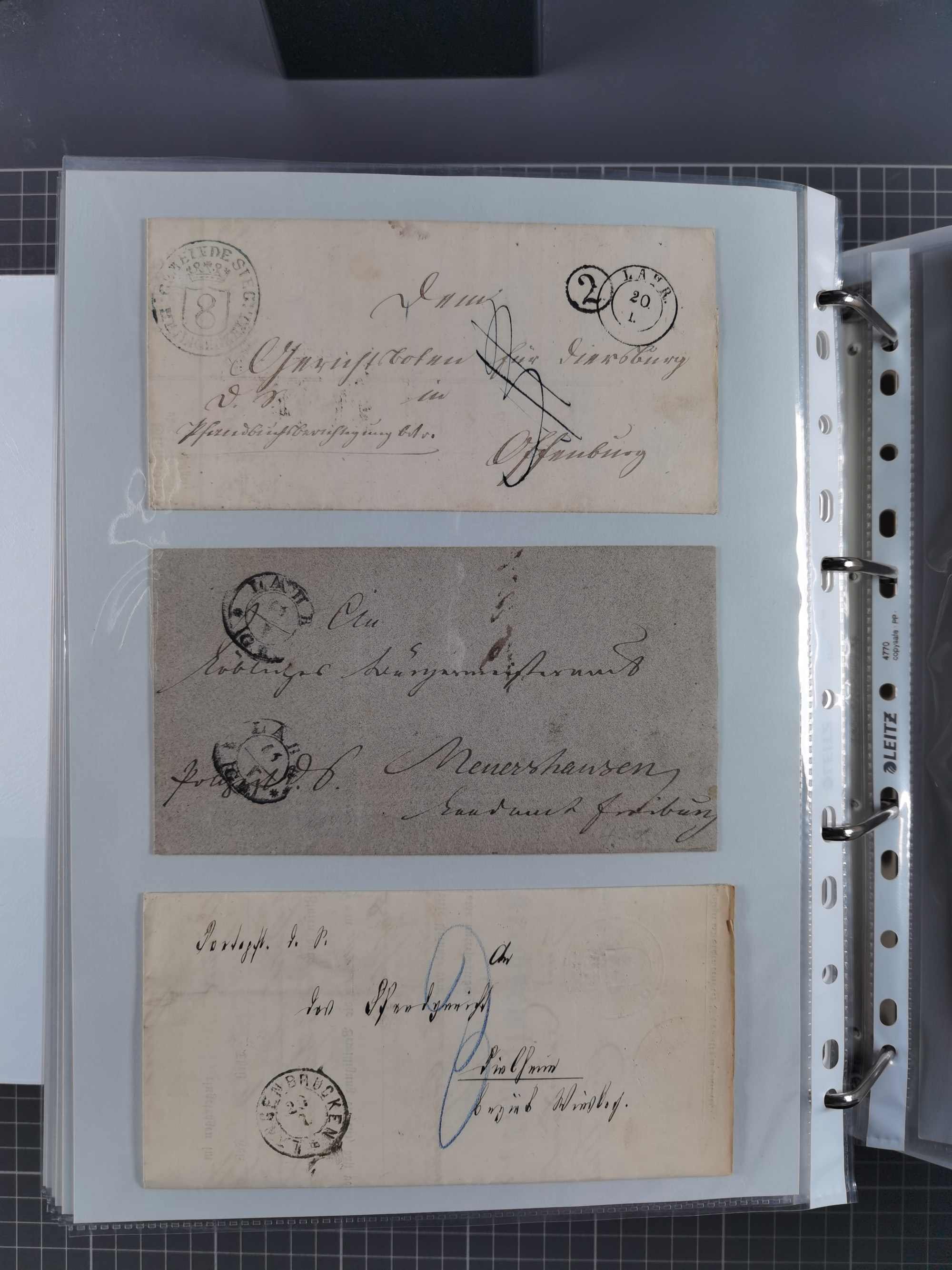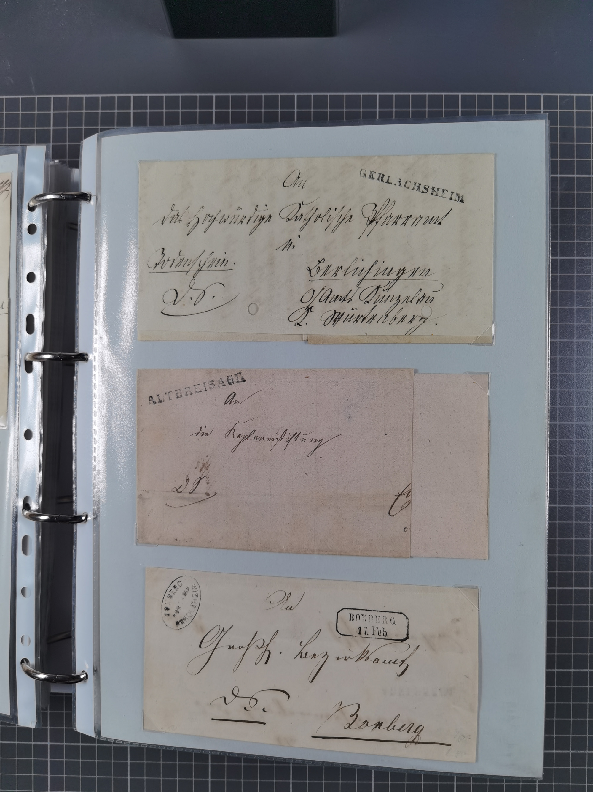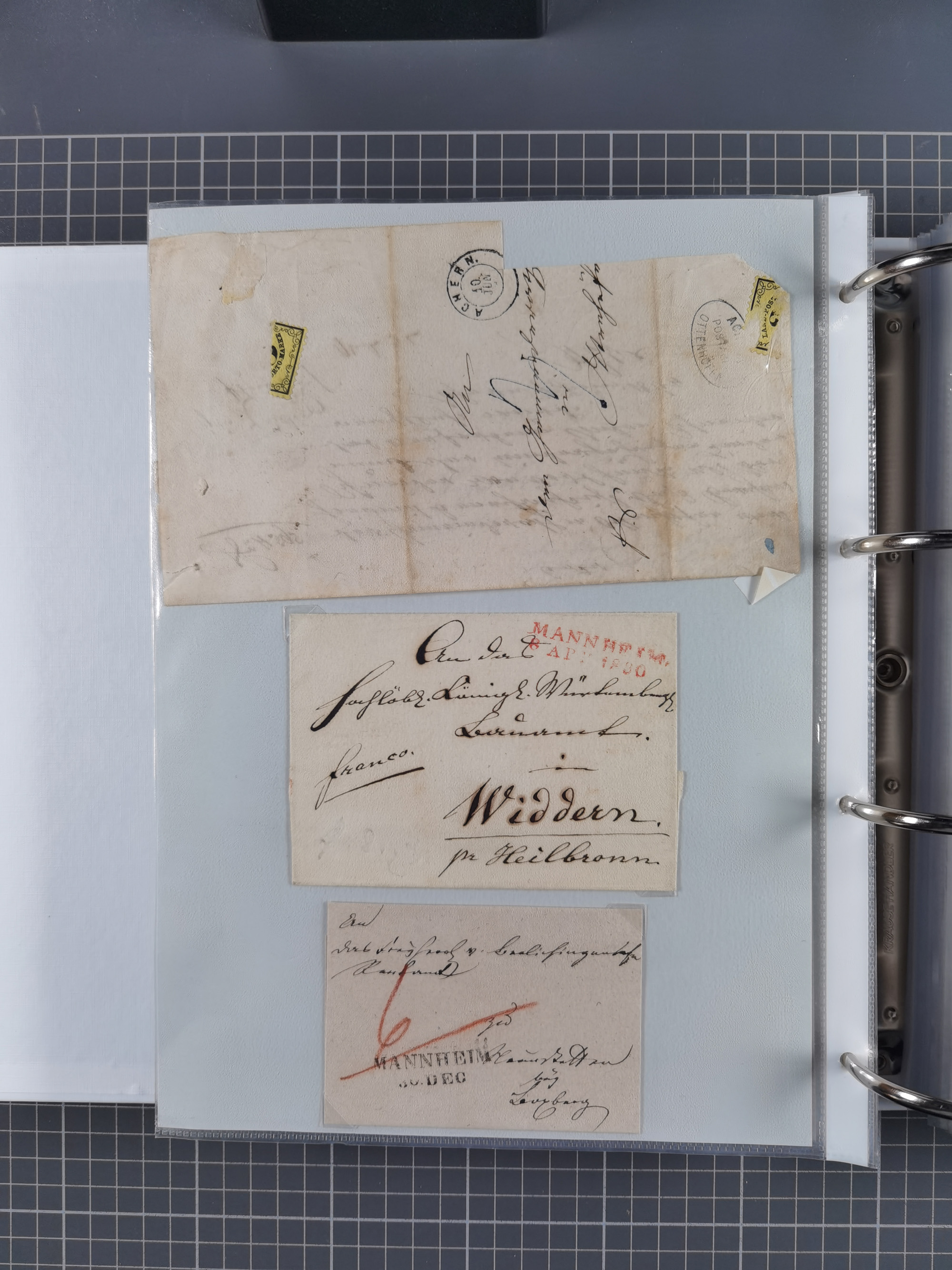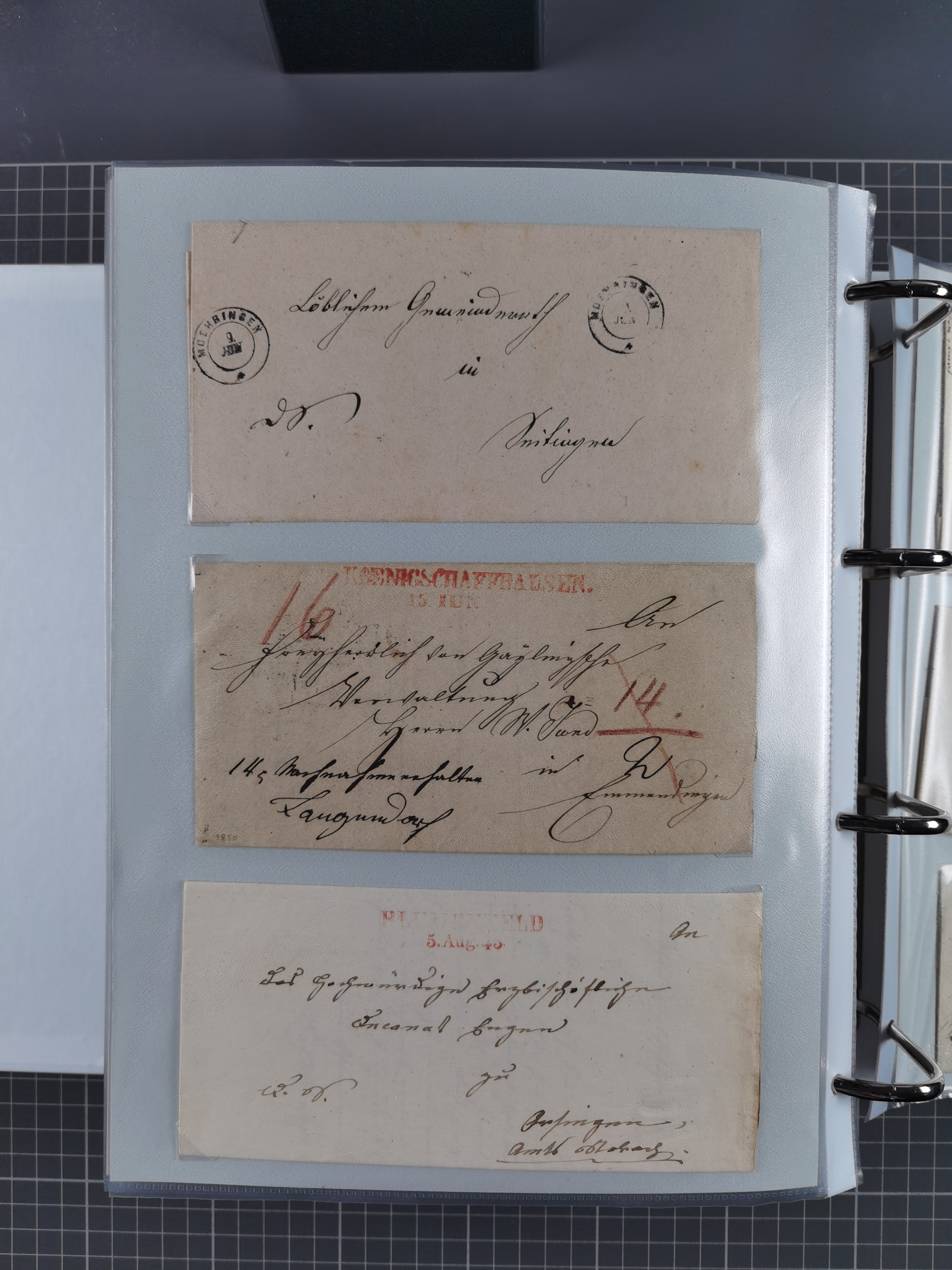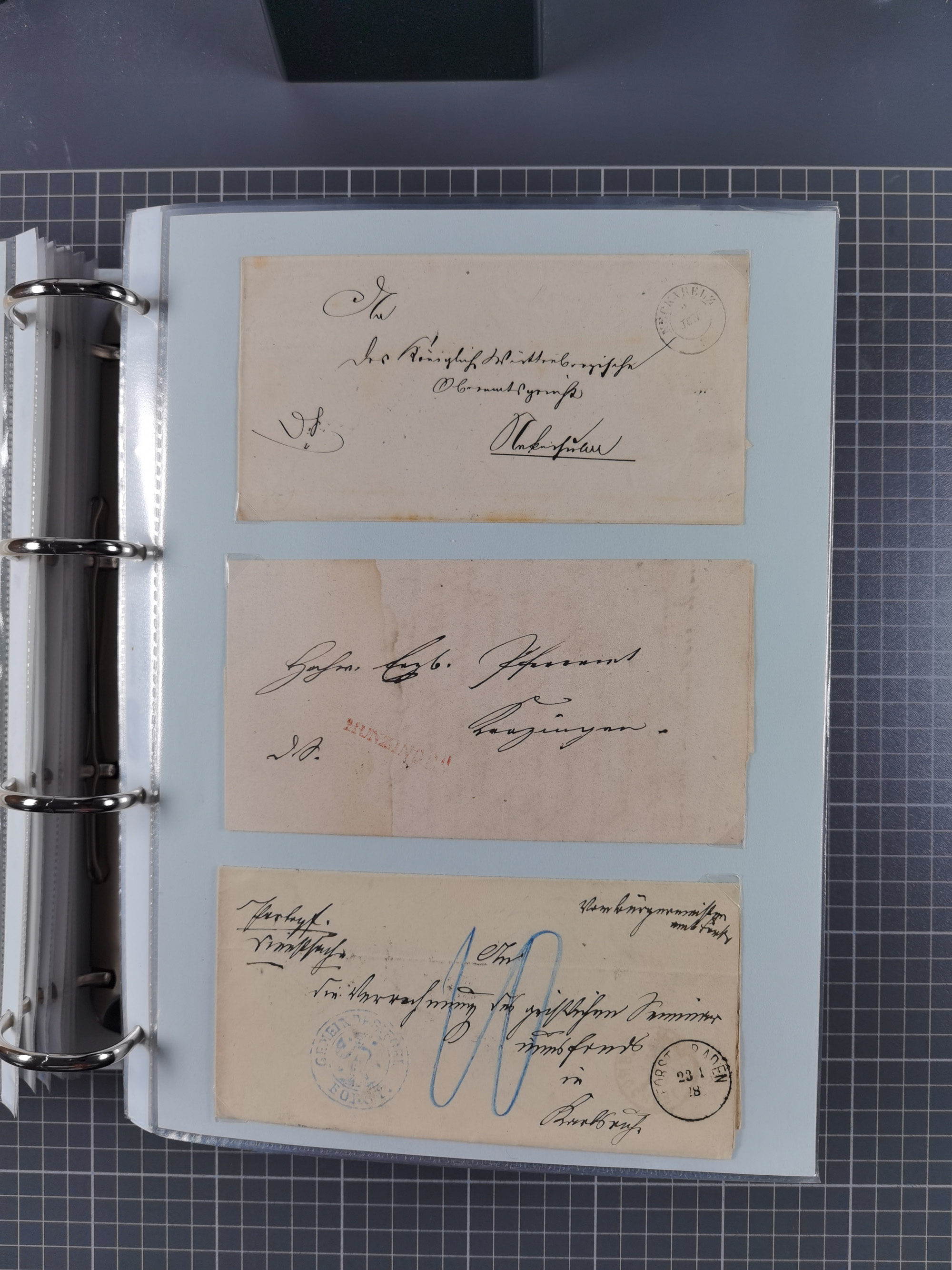 1830/86 (ca.), über 45 meist markenlose Briefe mit Steigbügelstempeln mit Schwerpunkt Württemberg, dabei u.a. HAIGERLOCH in rot auf Vorderseite, ALTSHAUSEN in blau (1844), BLAUFELDEN in waidblau (1850), ECHTERDINGEN in blau (1847), PLOCHINGEN, etc., auch einige Postscheine und Einzelmarken, im Album