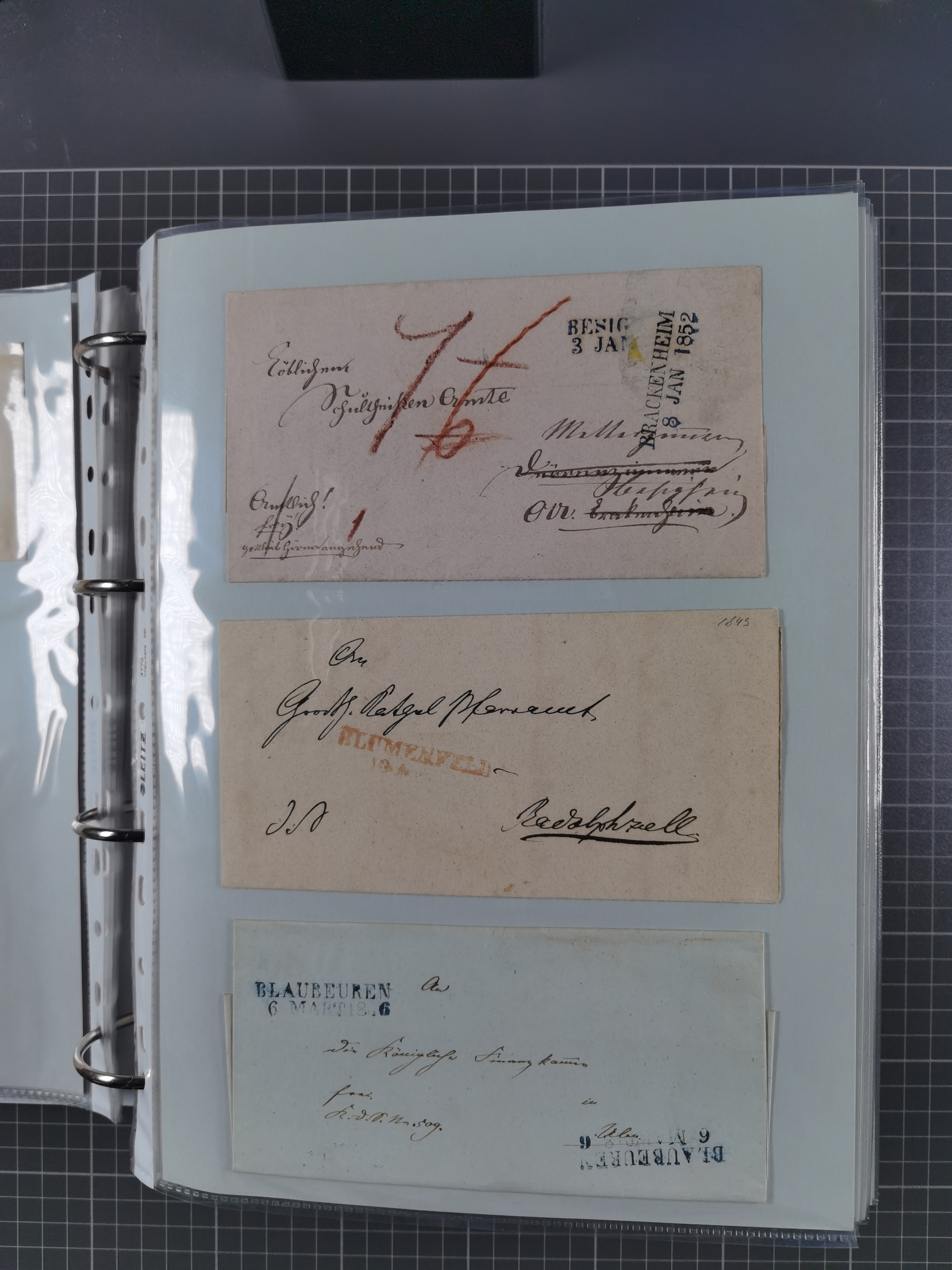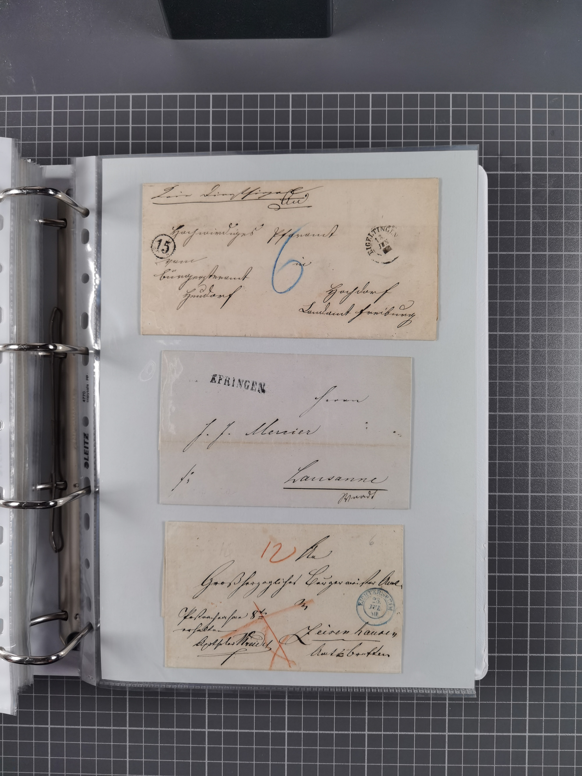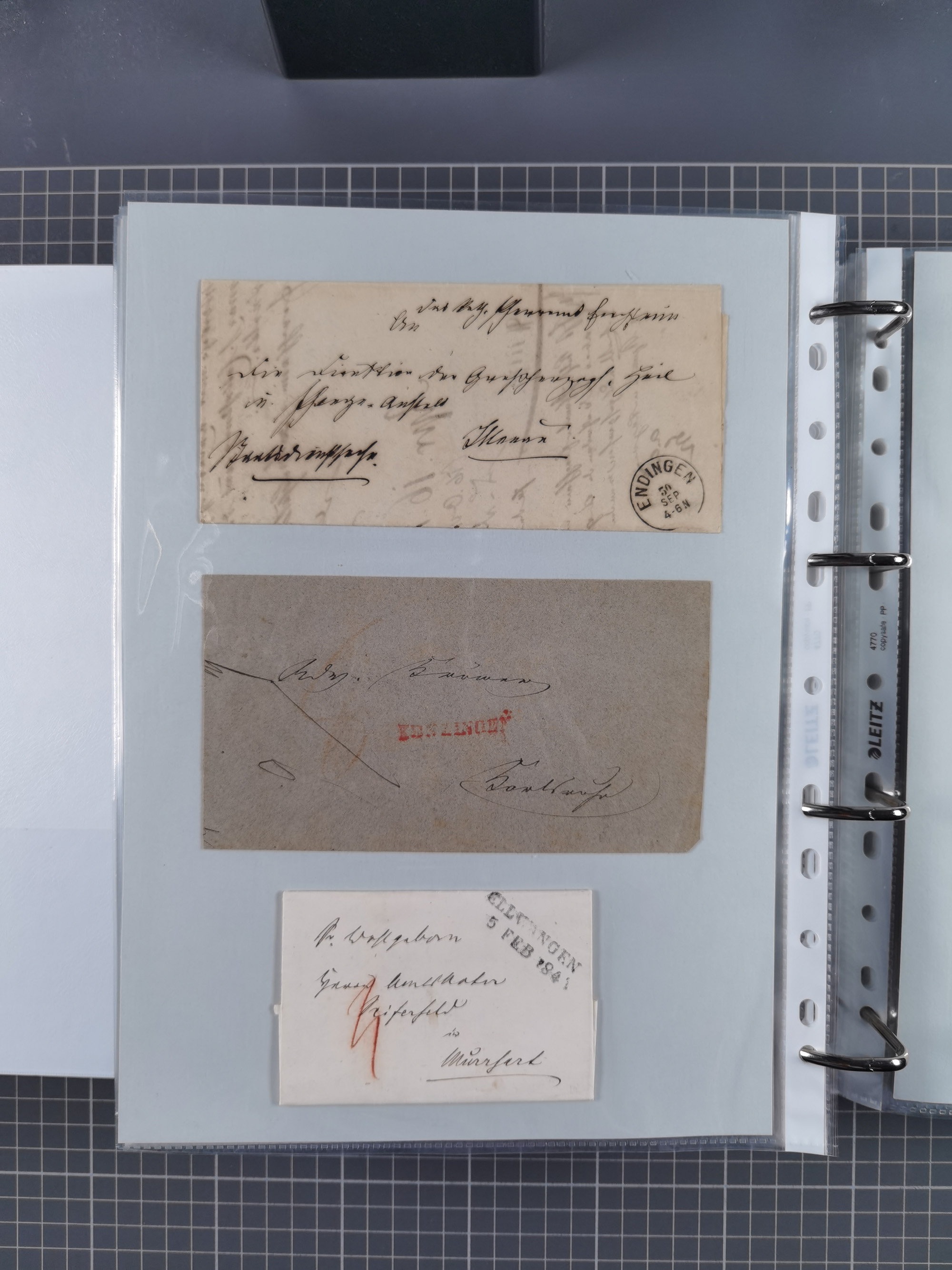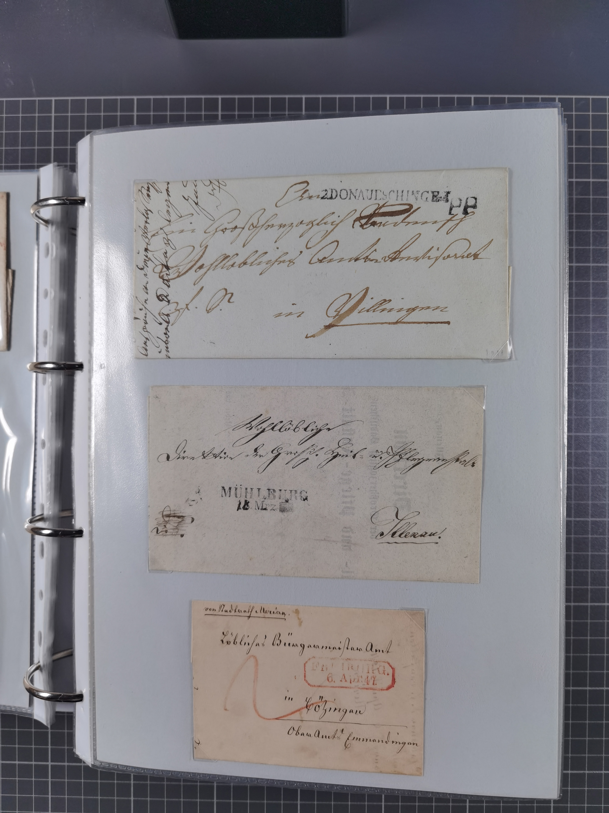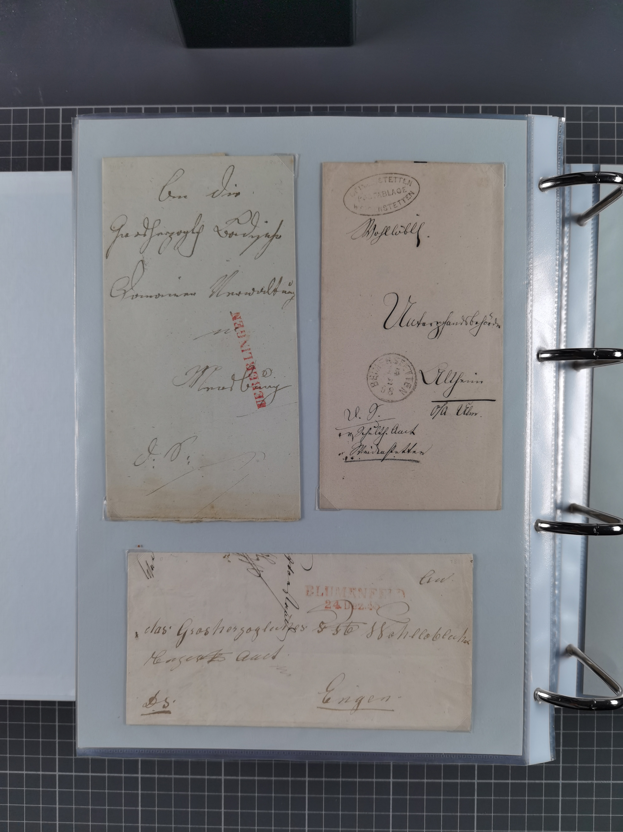 1830/86 (ca.), über 45 meist markenlose Briefe mit Steigbügelstempeln mit Schwerpunkt Württemberg, dabei u.a. HAIGERLOCH in rot auf Vorderseite, ALTSHAUSEN in blau (1844), BLAUFELDEN in waidblau (1850), ECHTERDINGEN in blau (1847), PLOCHINGEN, etc., auch einige Postscheine und Einzelmarken, im Album