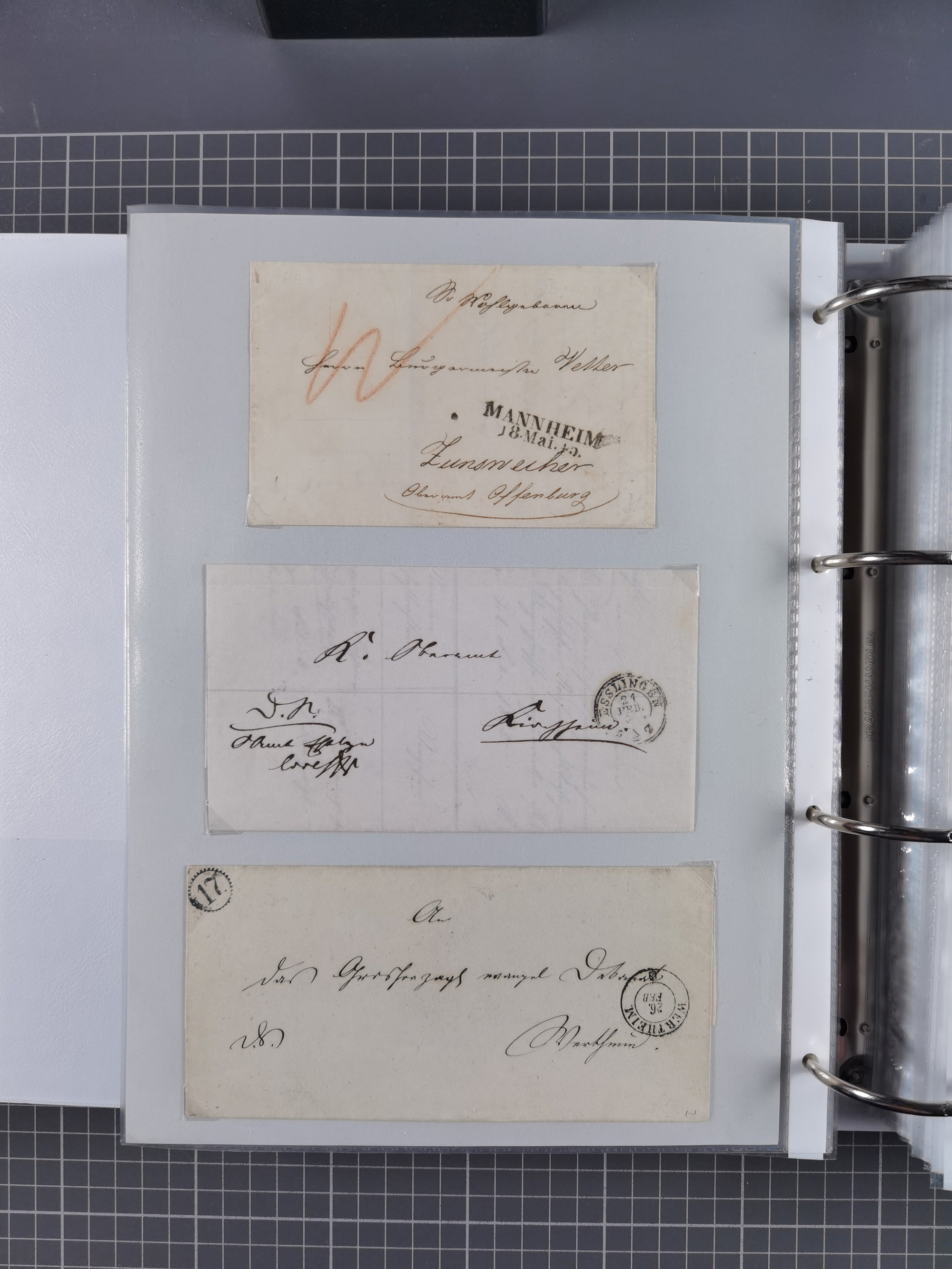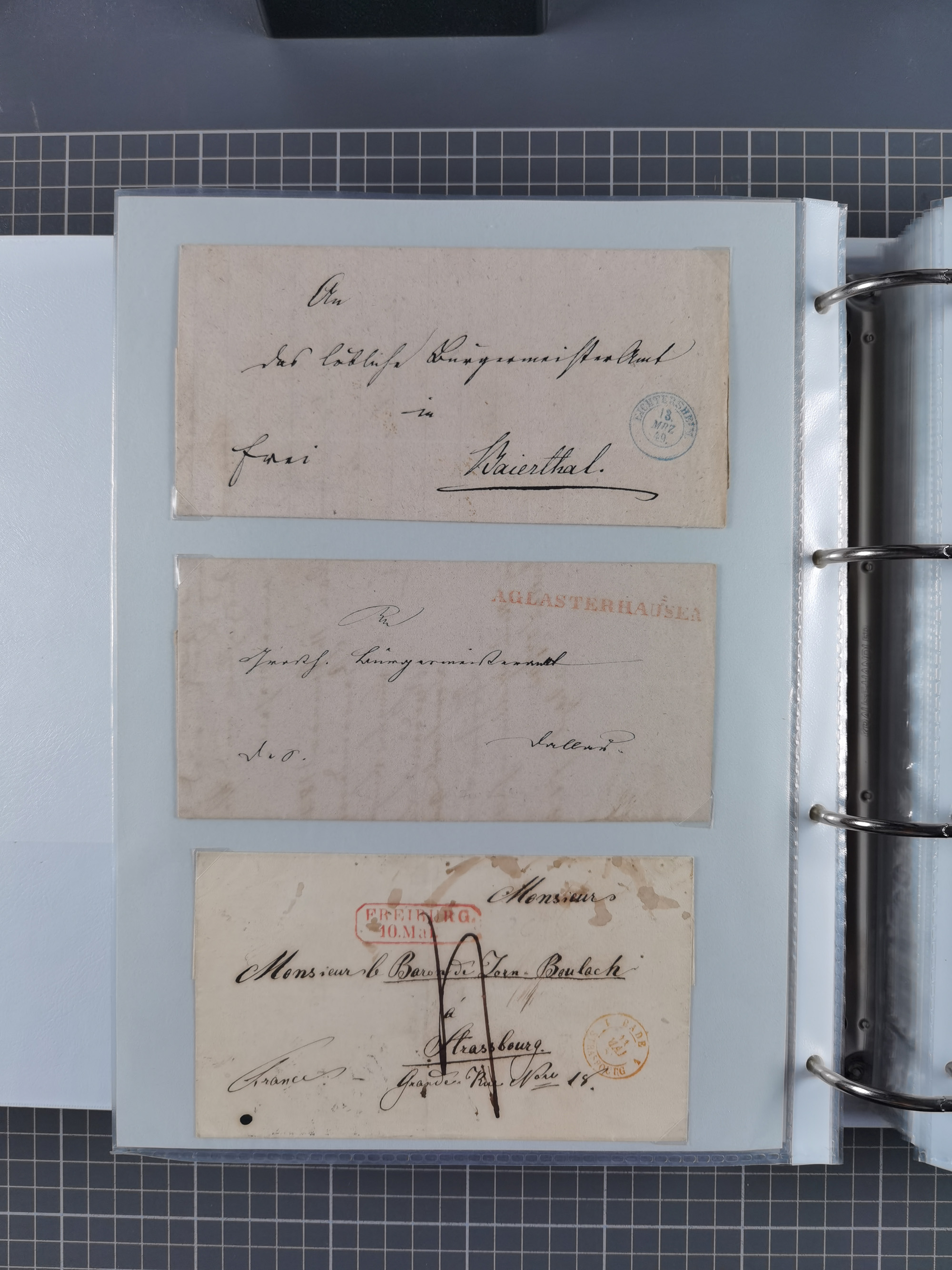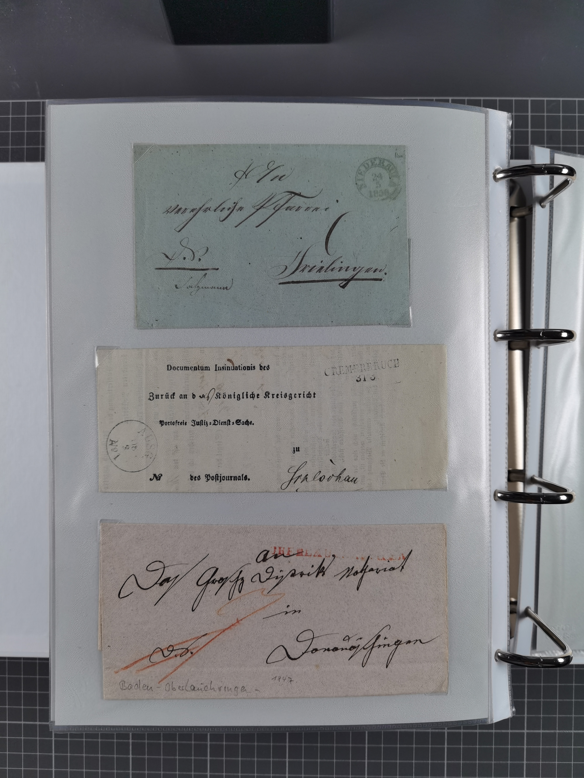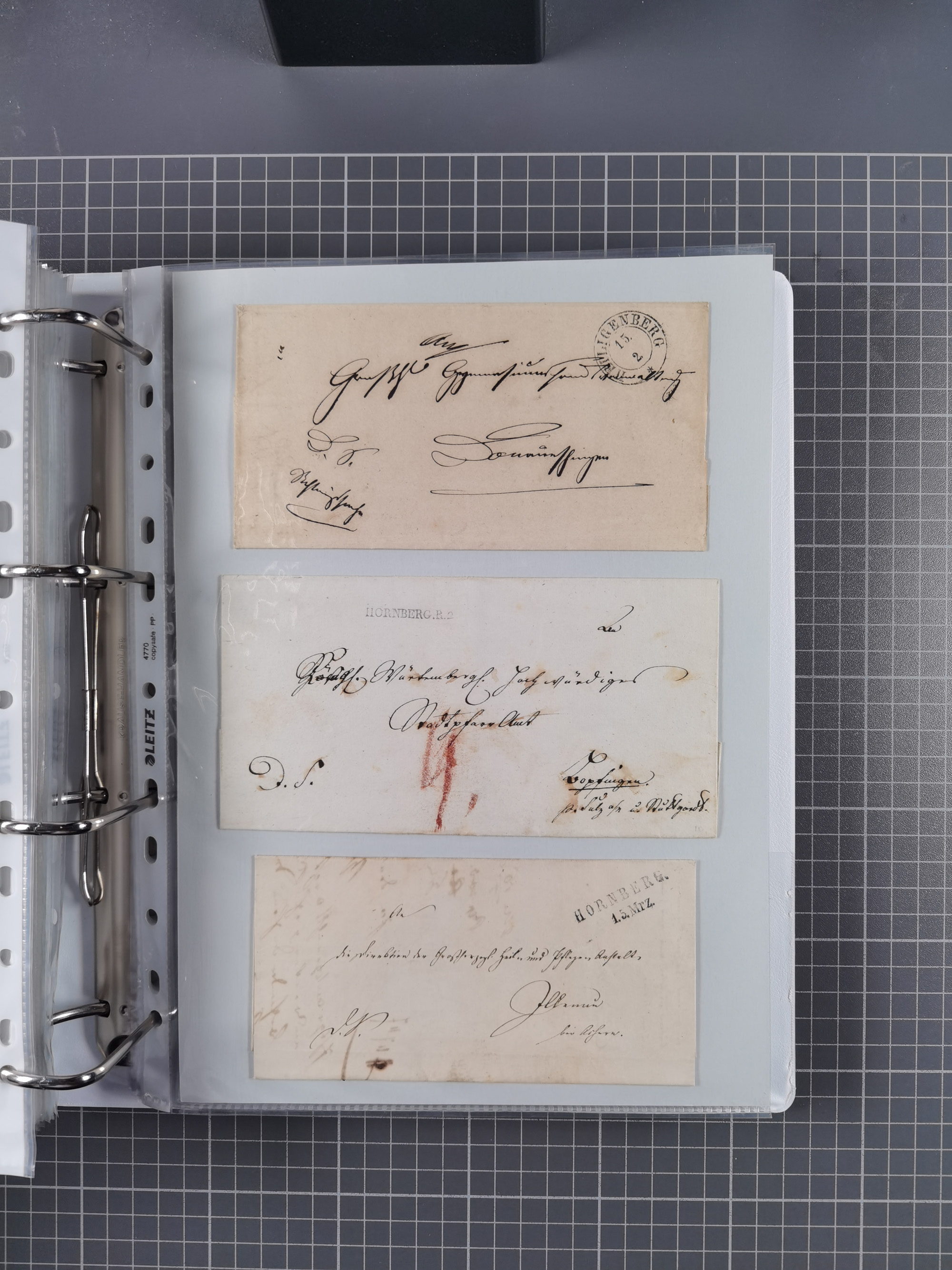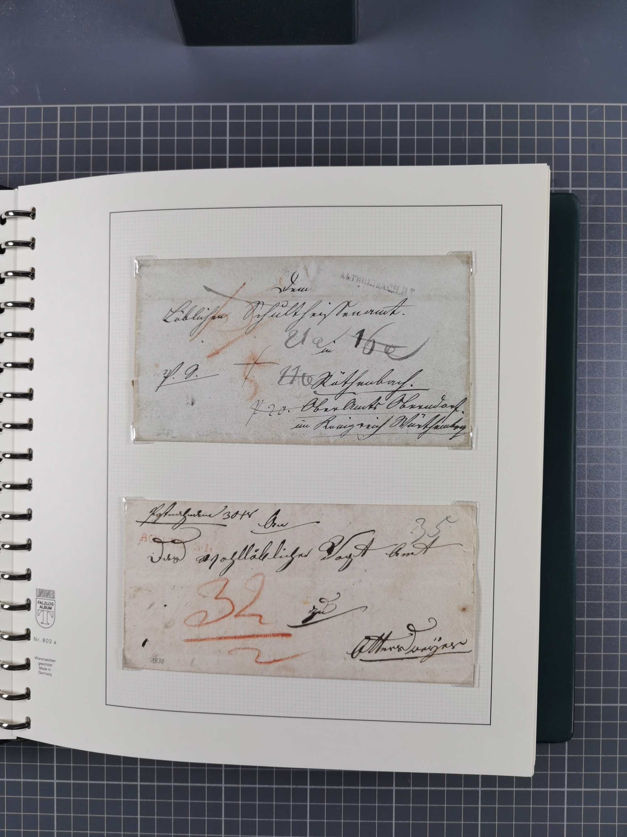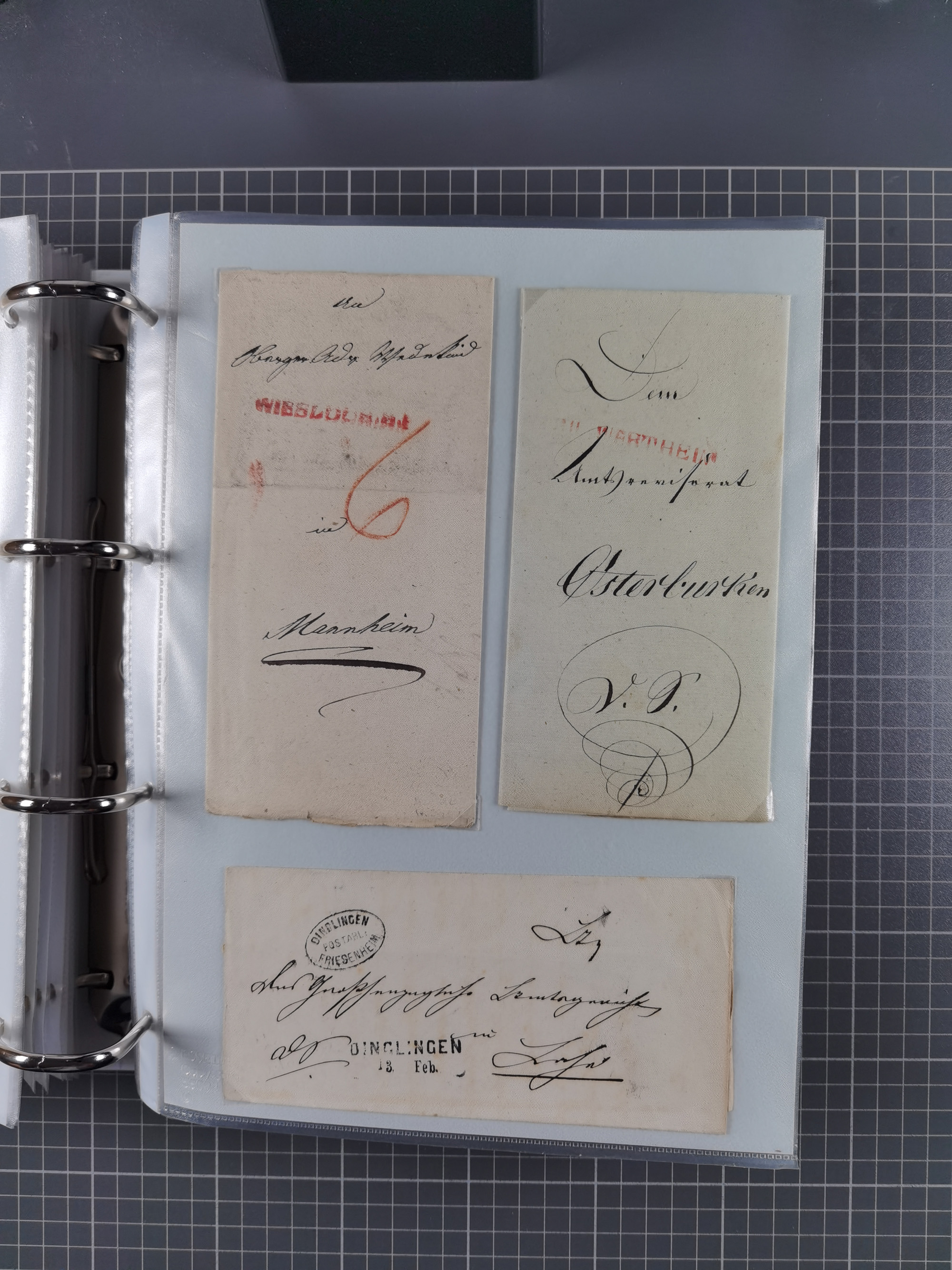 1830/86 (ca.), über 45 meist markenlose Briefe mit Steigbügelstempeln mit Schwerpunkt Württemberg, dabei u.a. HAIGERLOCH in rot auf Vorderseite, ALTSHAUSEN in blau (1844), BLAUFELDEN in waidblau (1850), ECHTERDINGEN in blau (1847), PLOCHINGEN, etc., auch einige Postscheine und Einzelmarken, im Album