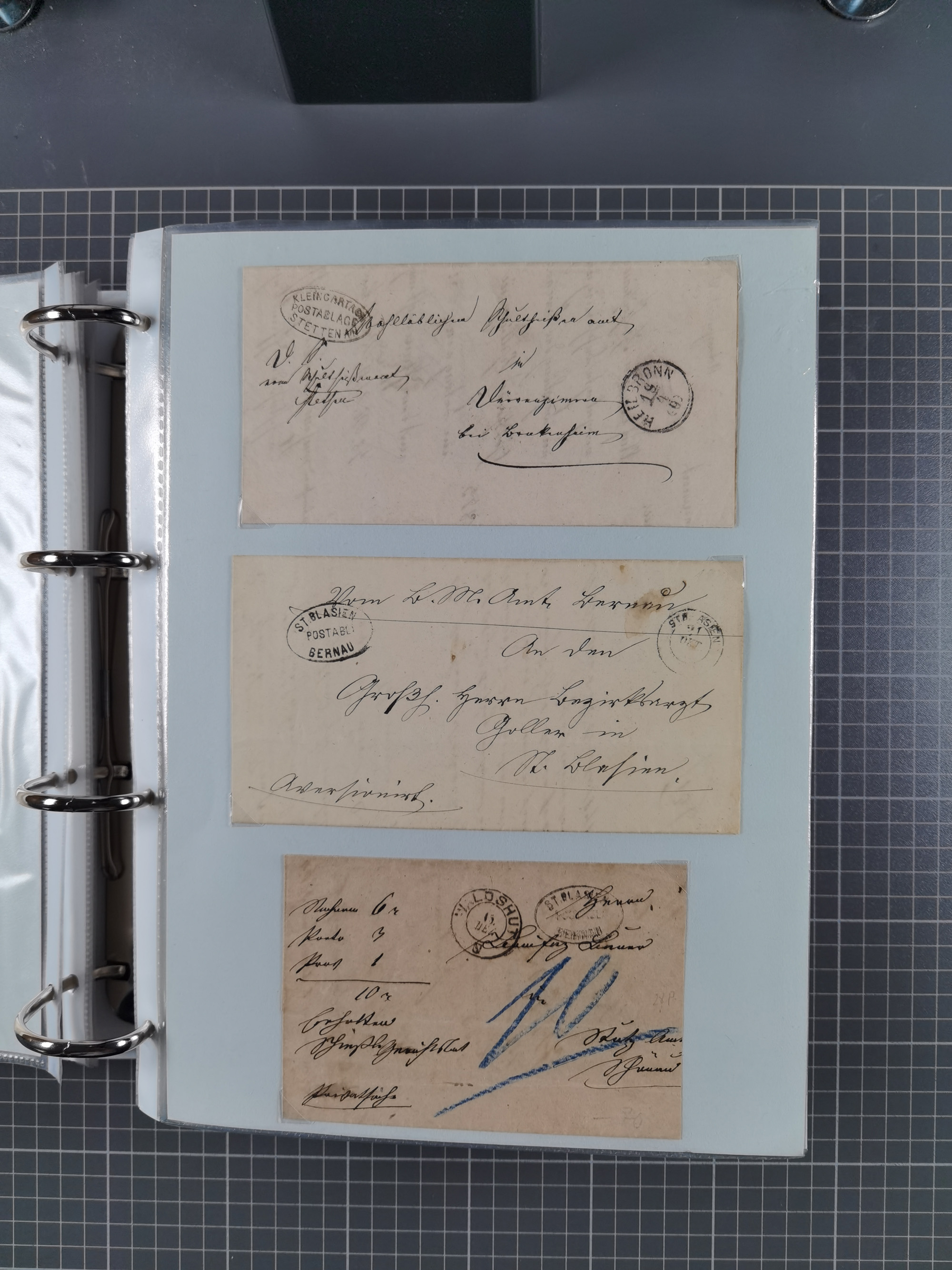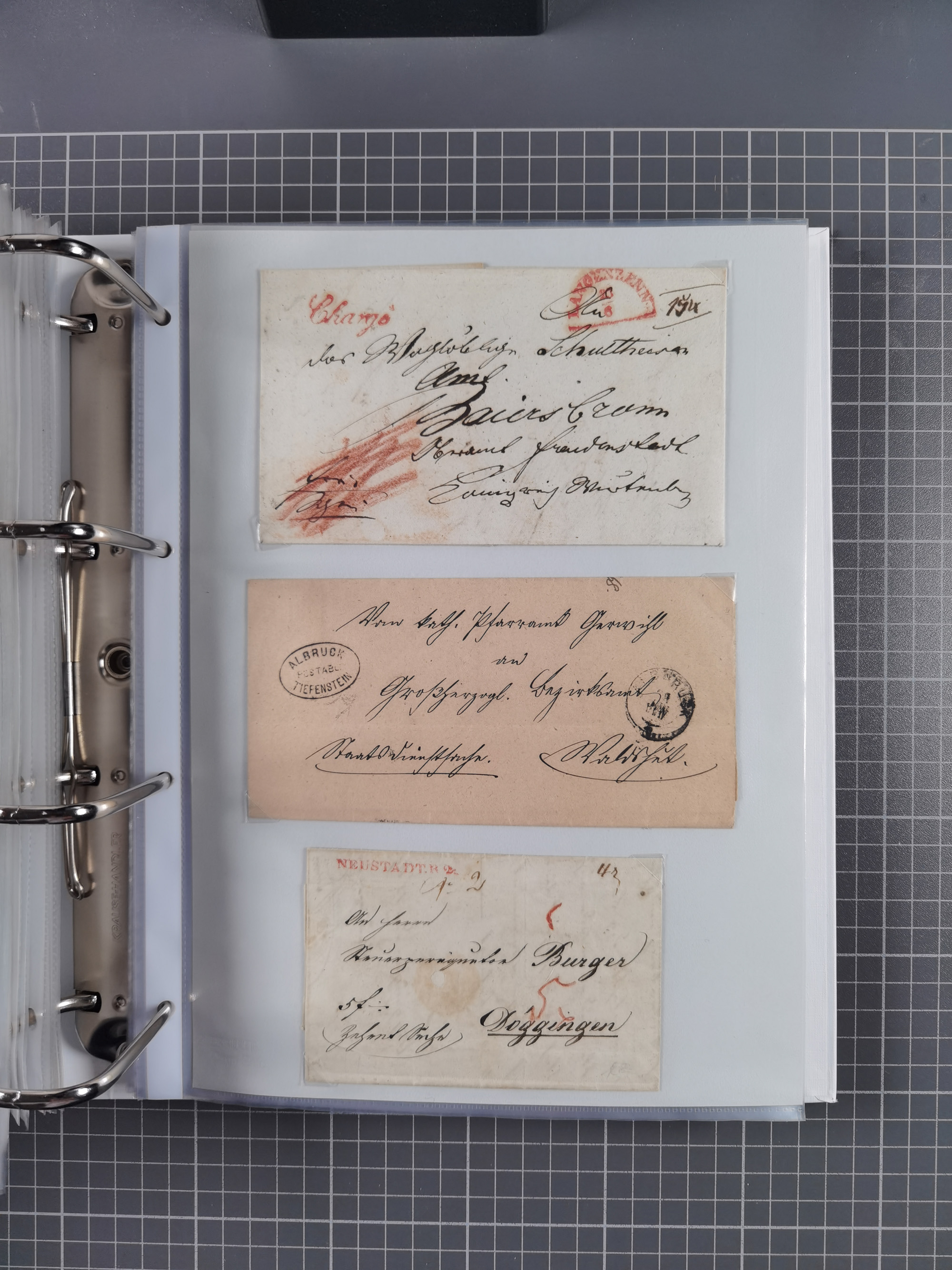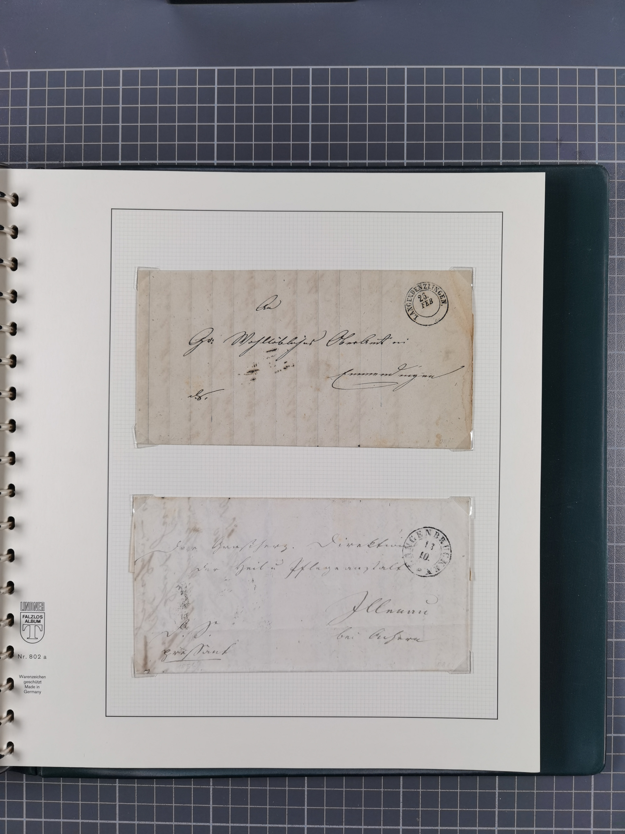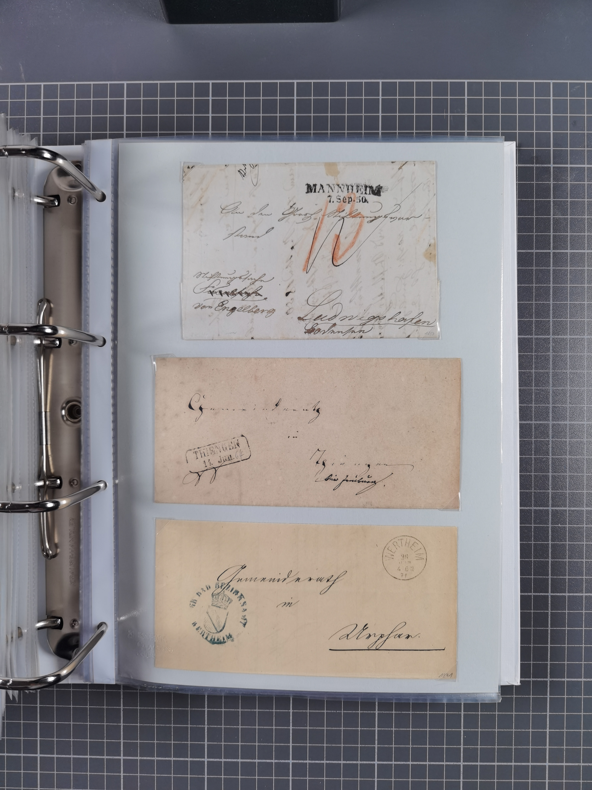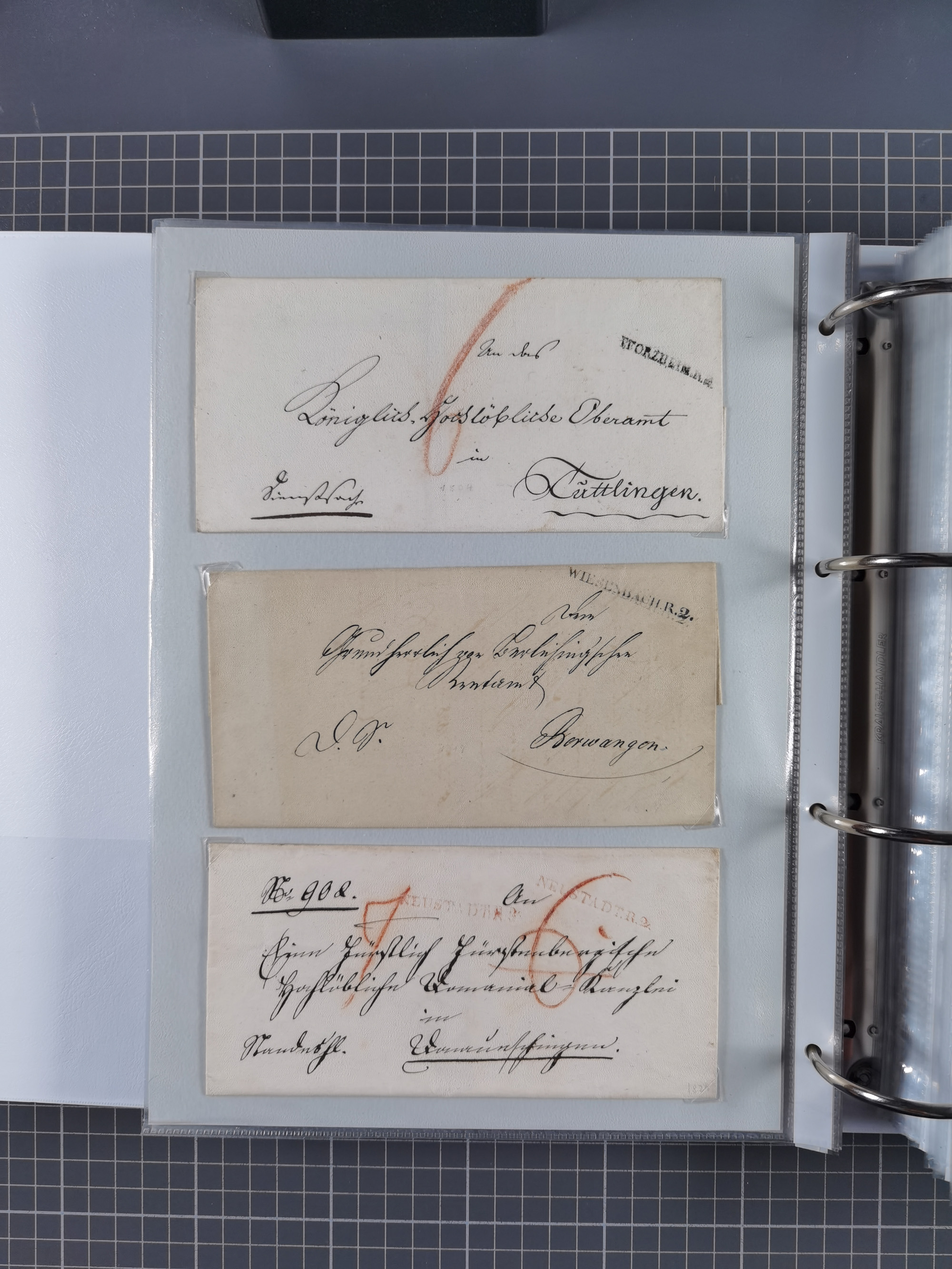 1830/86 (ca.), über 45 meist markenlose Briefe mit Steigbügelstempeln mit Schwerpunkt Württemberg, dabei u.a. HAIGERLOCH in rot auf Vorderseite, ALTSHAUSEN in blau (1844), BLAUFELDEN in waidblau (1850), ECHTERDINGEN in blau (1847), PLOCHINGEN, etc., auch einige Postscheine und Einzelmarken, im Album