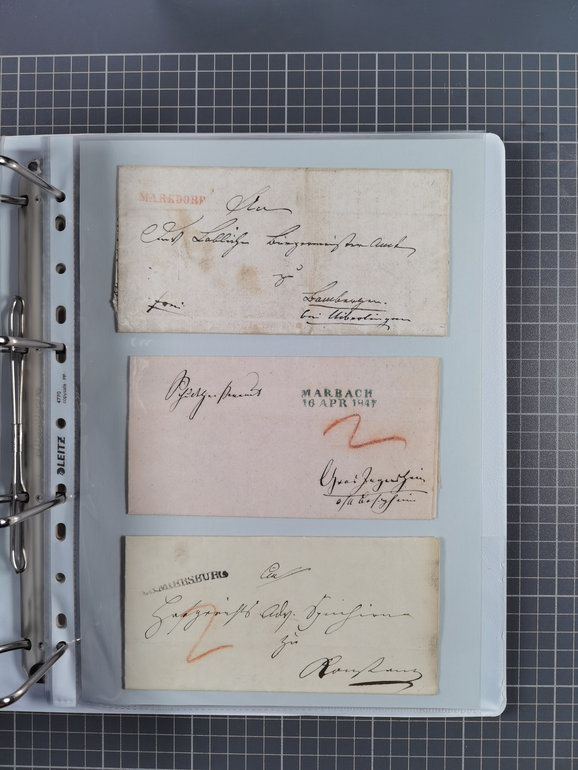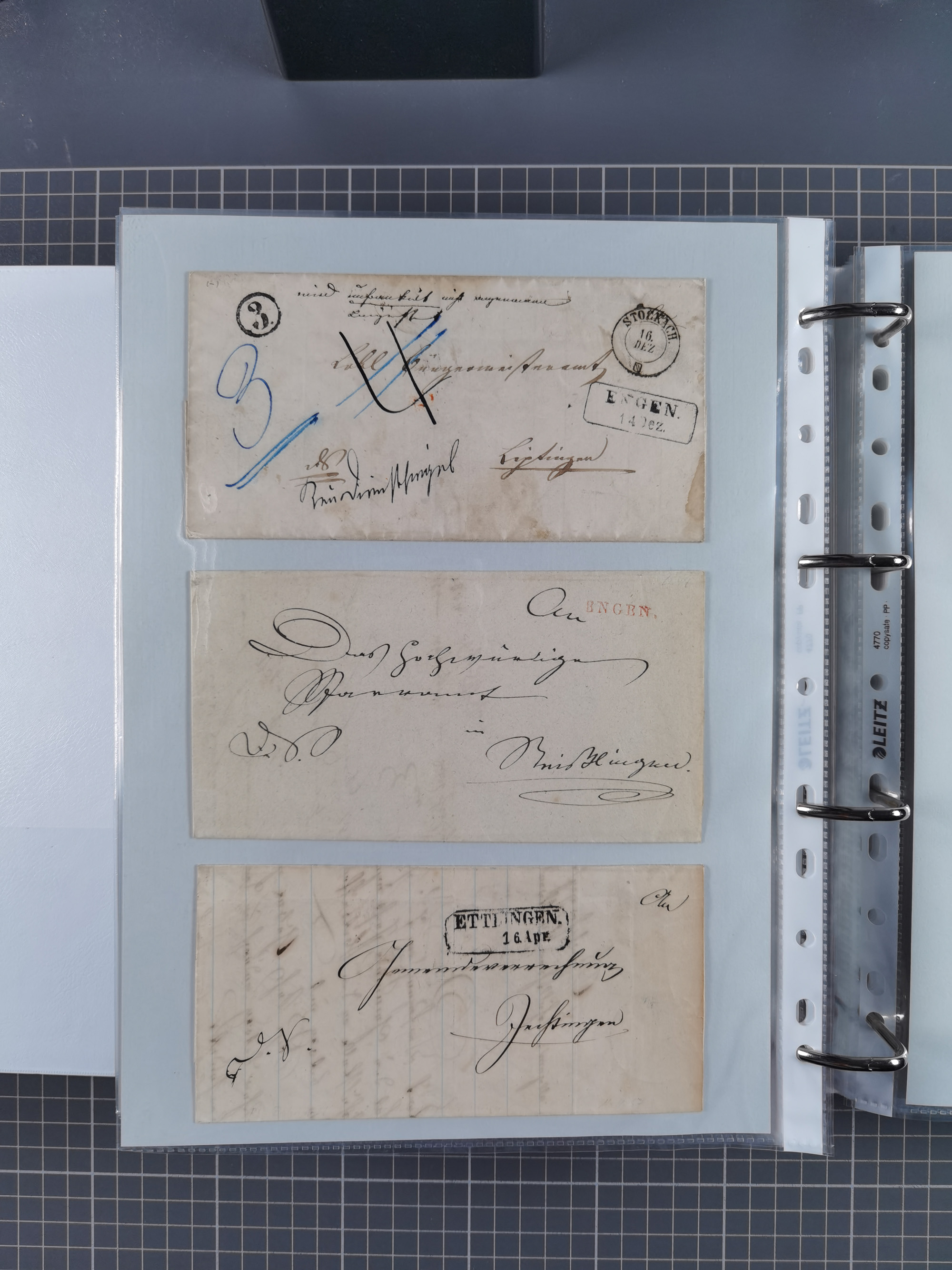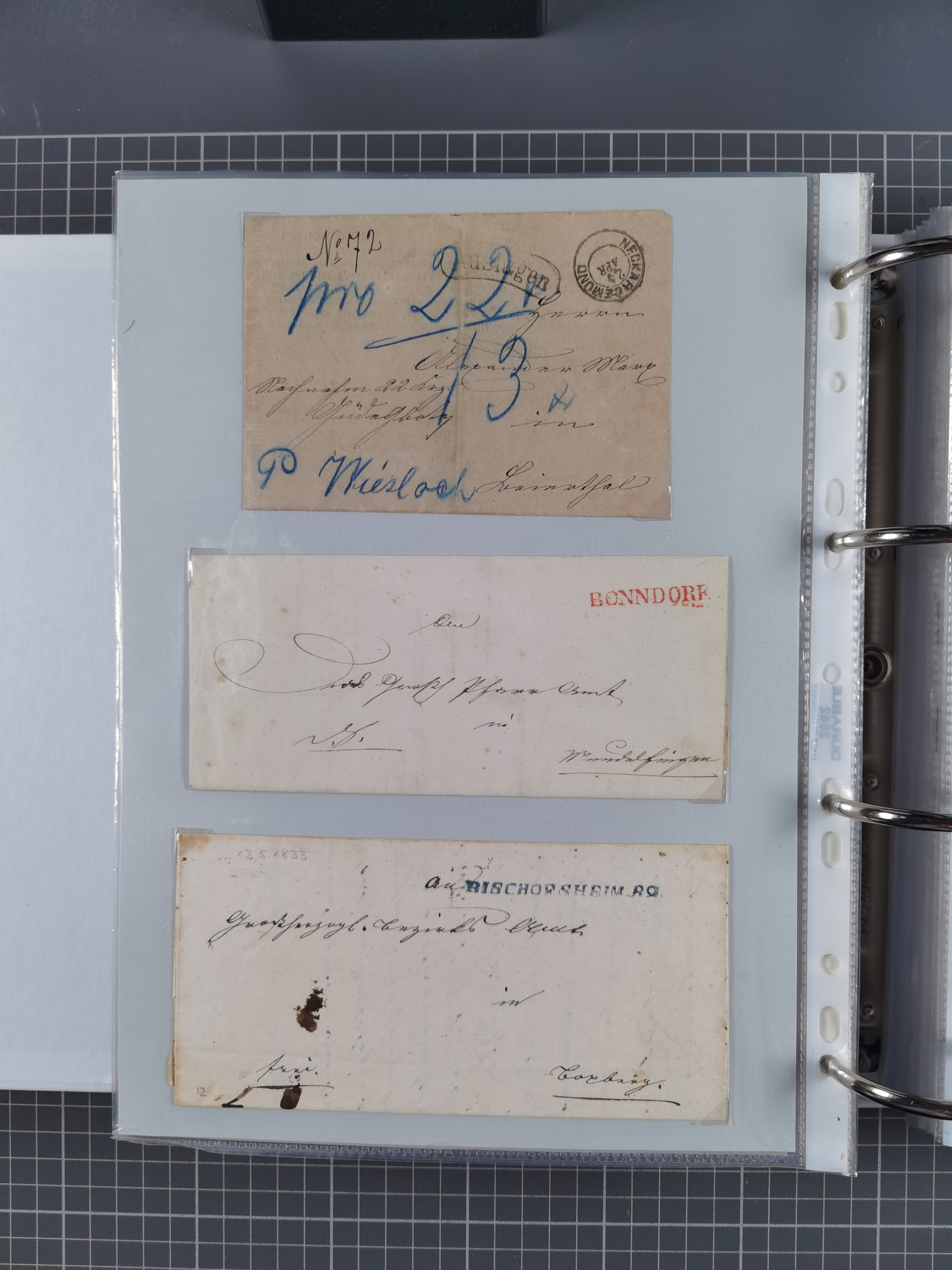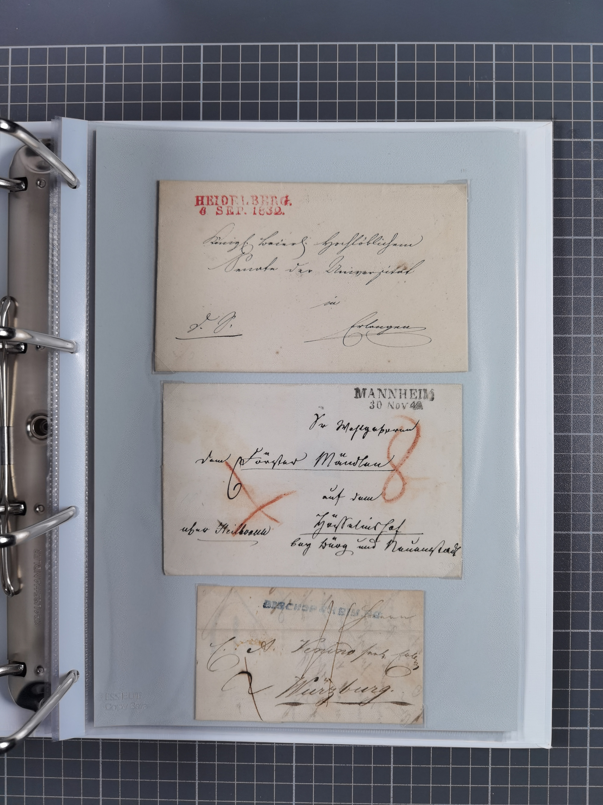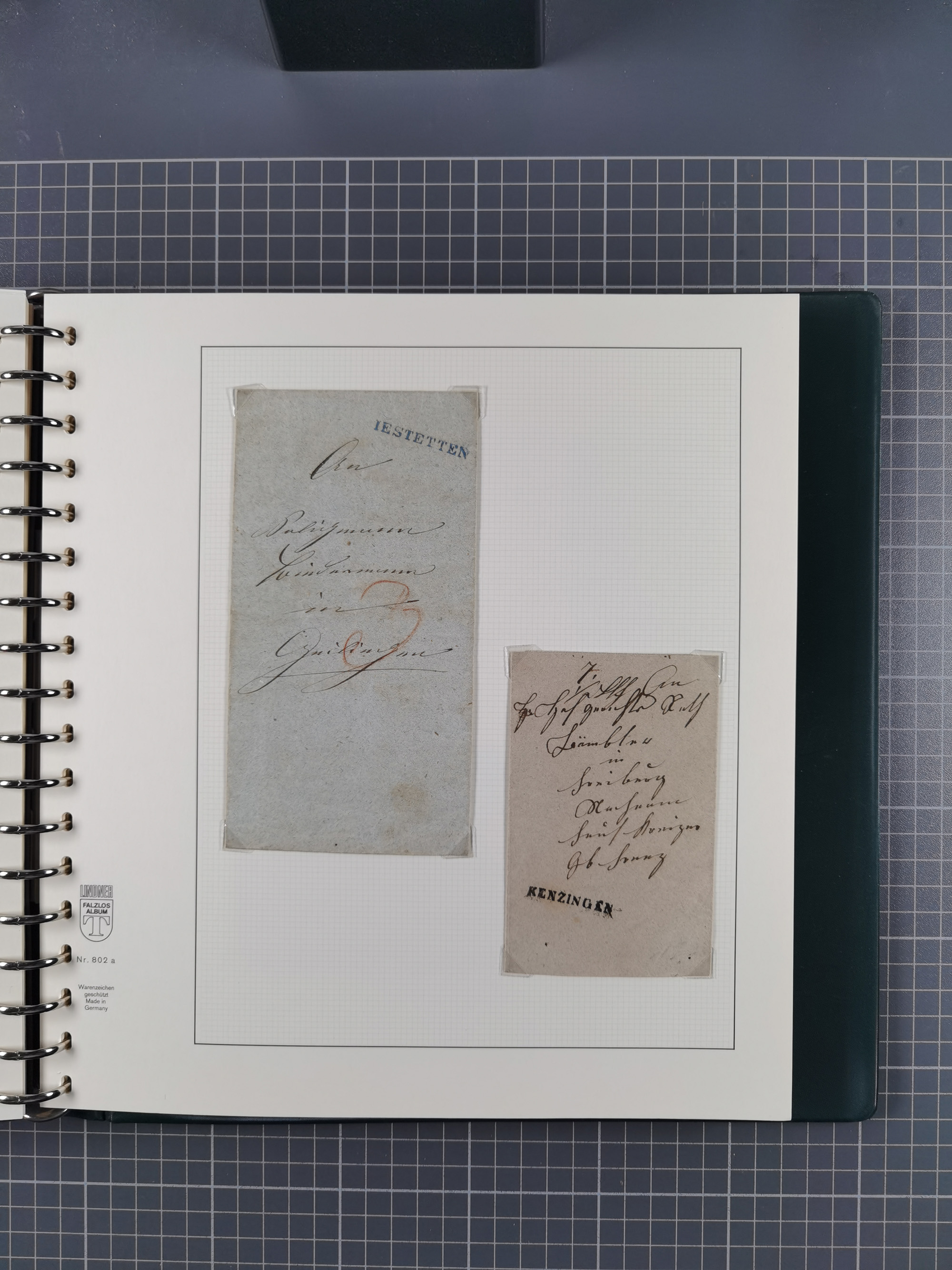 1830/86 (ca.), über 45 meist markenlose Briefe mit Steigbügelstempeln mit Schwerpunkt Württemberg, dabei u.a. HAIGERLOCH in rot auf Vorderseite, ALTSHAUSEN in blau (1844), BLAUFELDEN in waidblau (1850), ECHTERDINGEN in blau (1847), PLOCHINGEN, etc., auch einige Postscheine und Einzelmarken, im Album