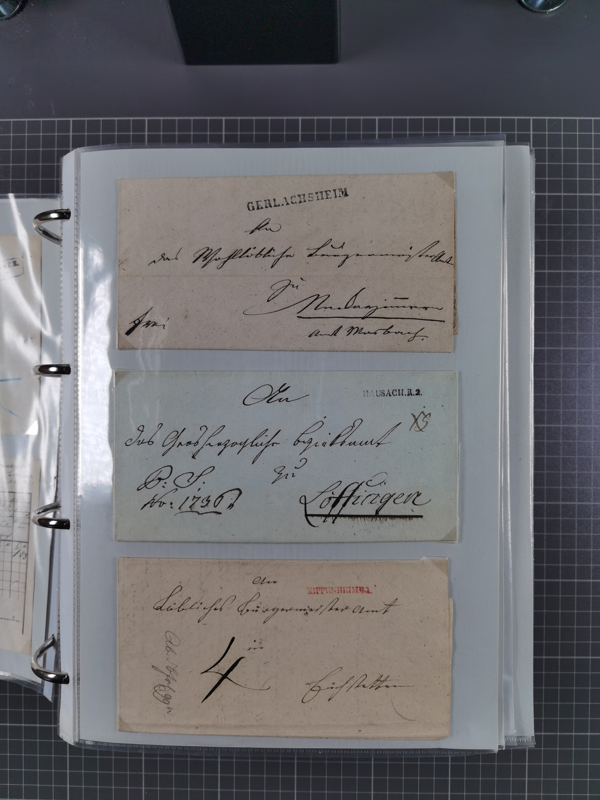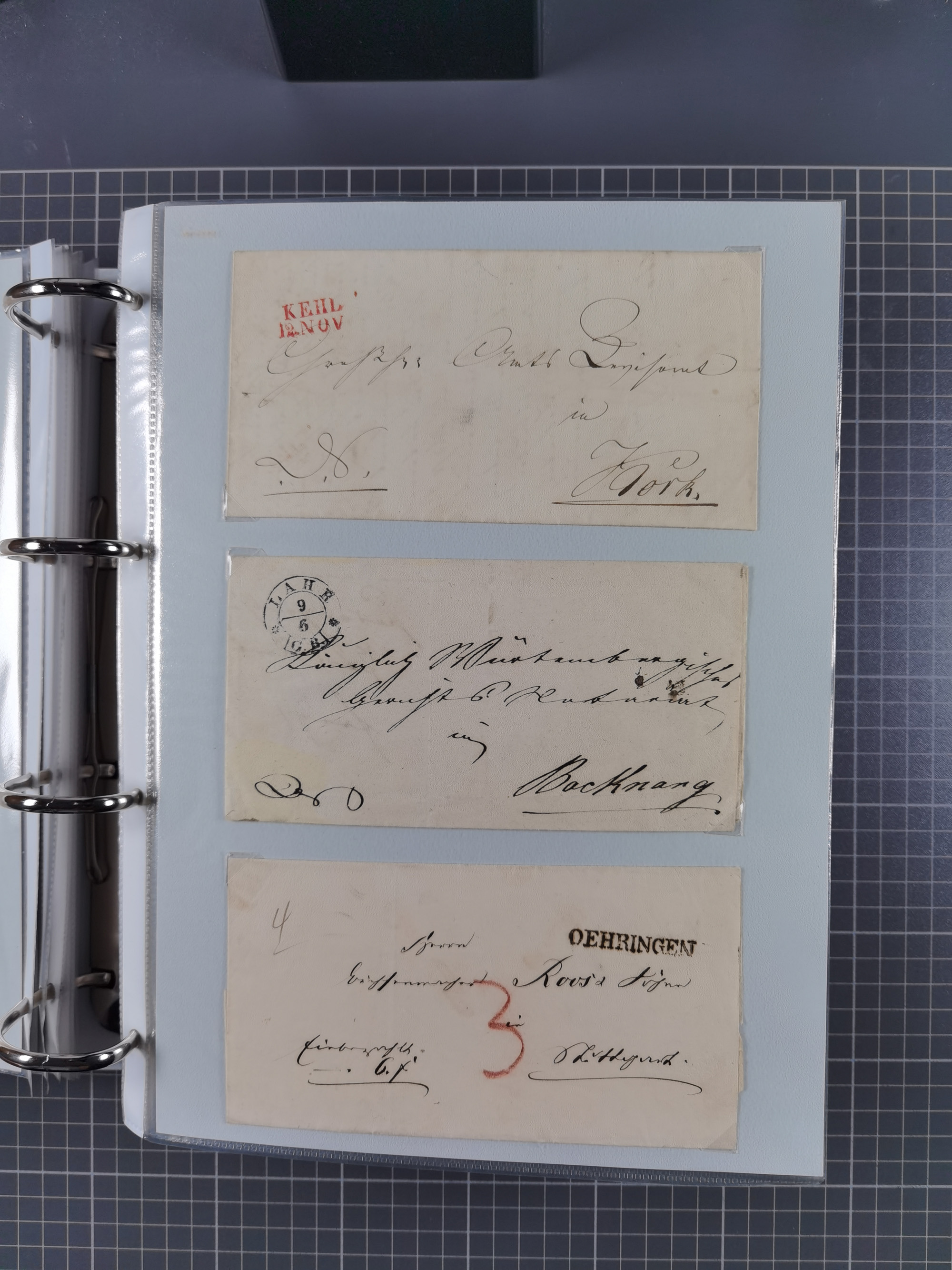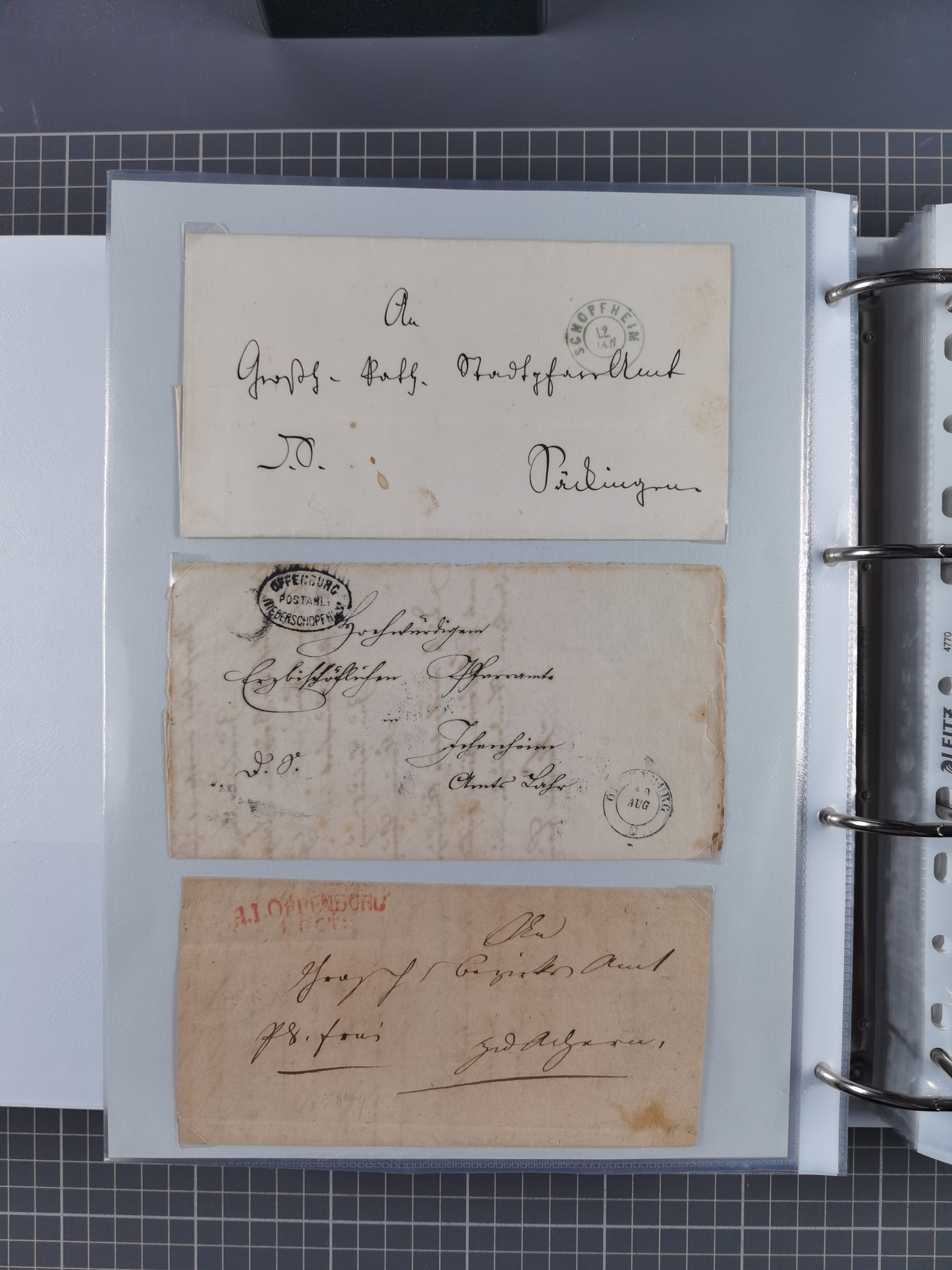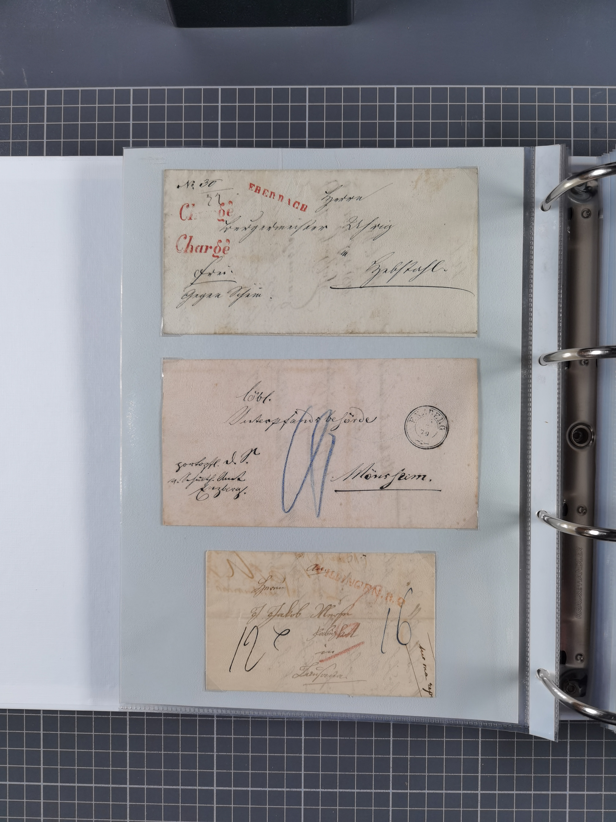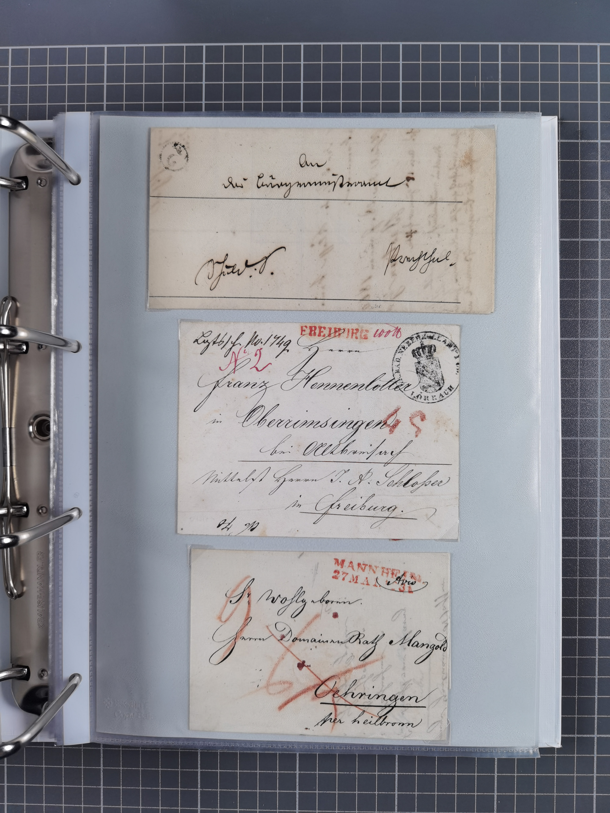 1830/86 (ca.), über 45 meist markenlose Briefe mit Steigbügelstempeln mit Schwerpunkt Württemberg, dabei u.a. HAIGERLOCH in rot auf Vorderseite, ALTSHAUSEN in blau (1844), BLAUFELDEN in waidblau (1850), ECHTERDINGEN in blau (1847), PLOCHINGEN, etc., auch einige Postscheine und Einzelmarken, im Album