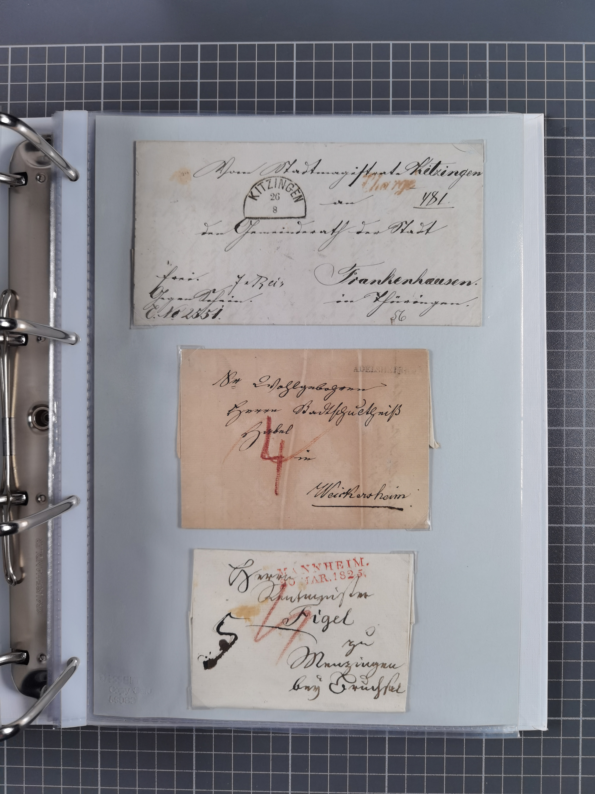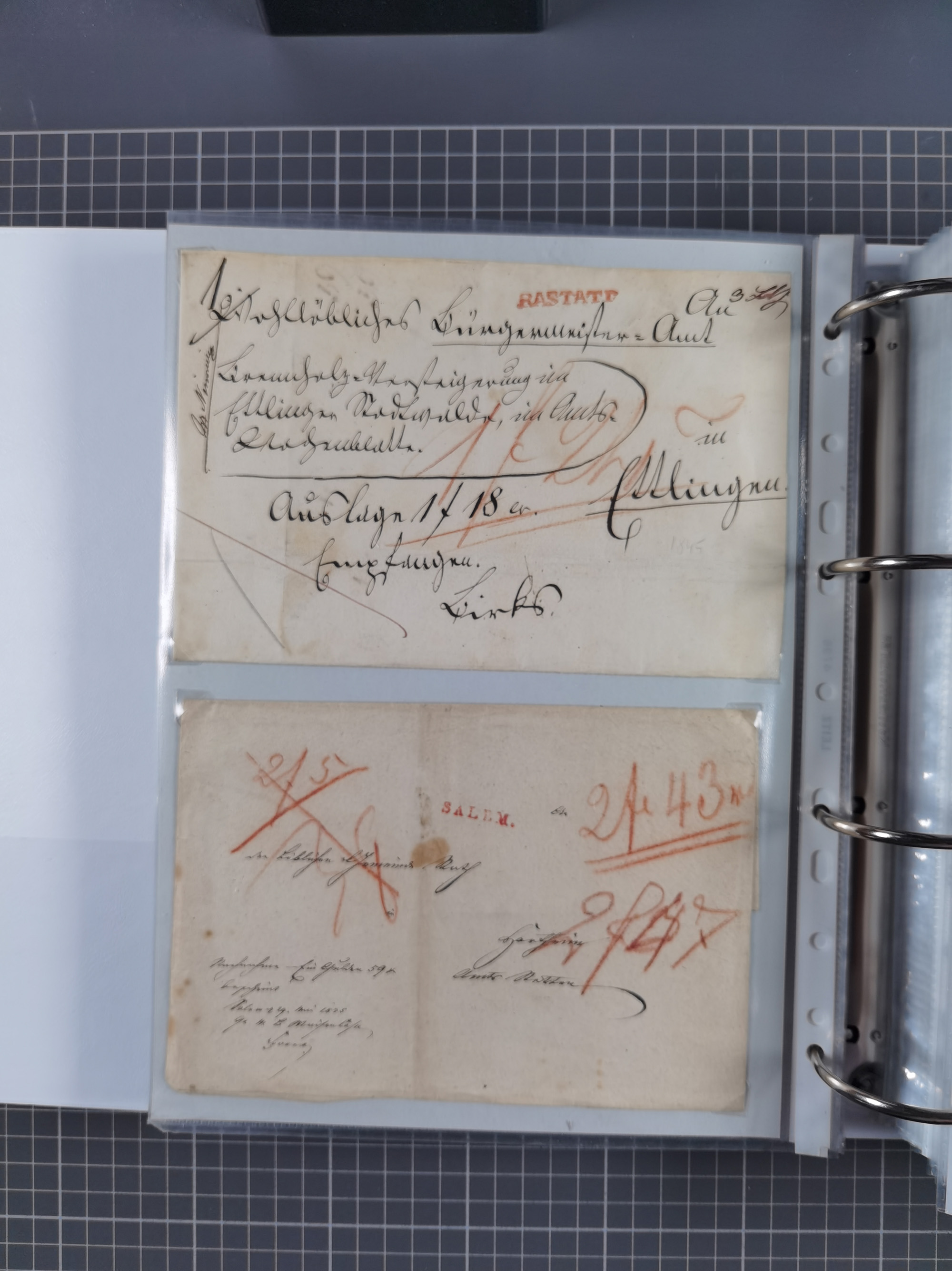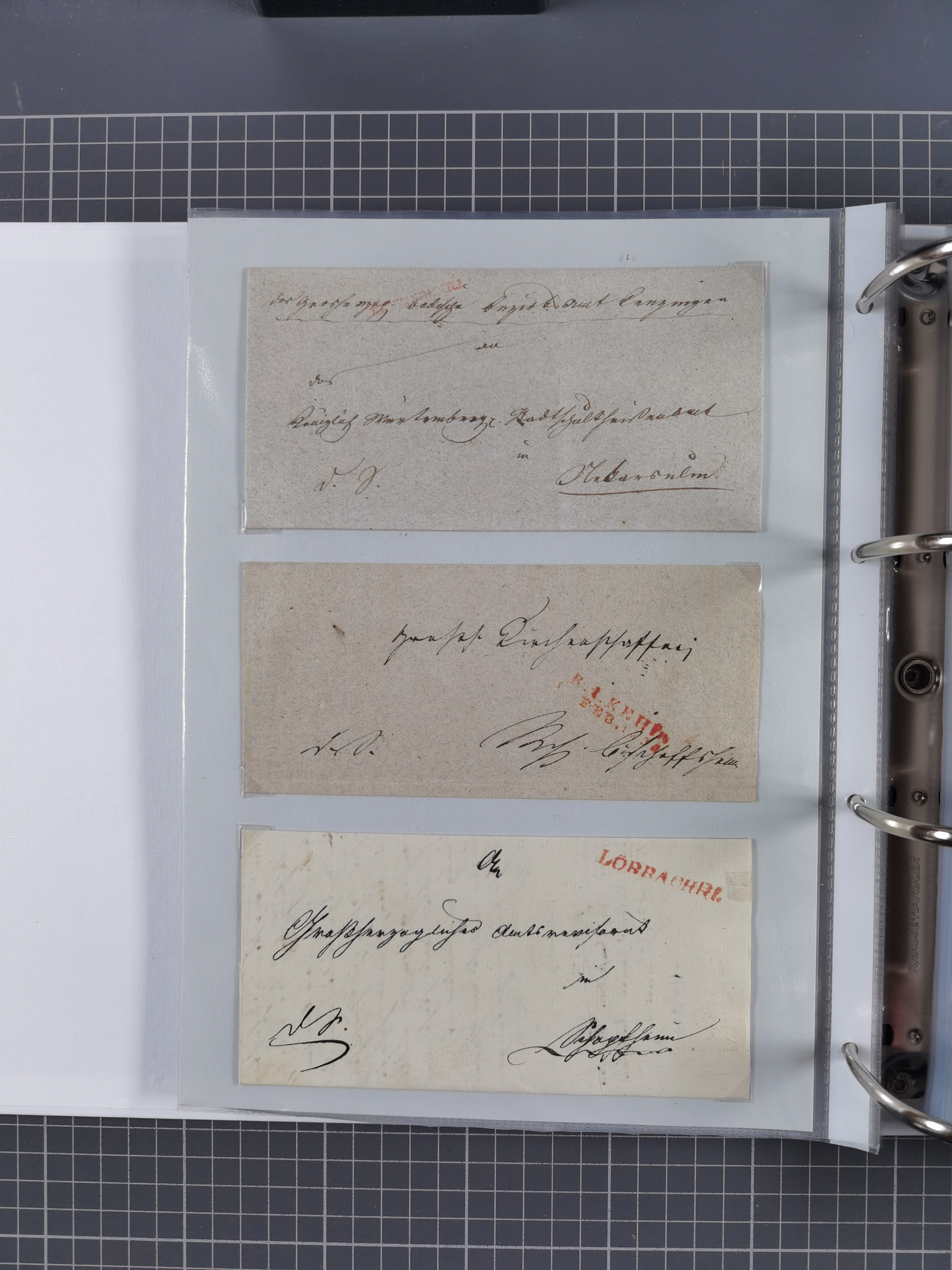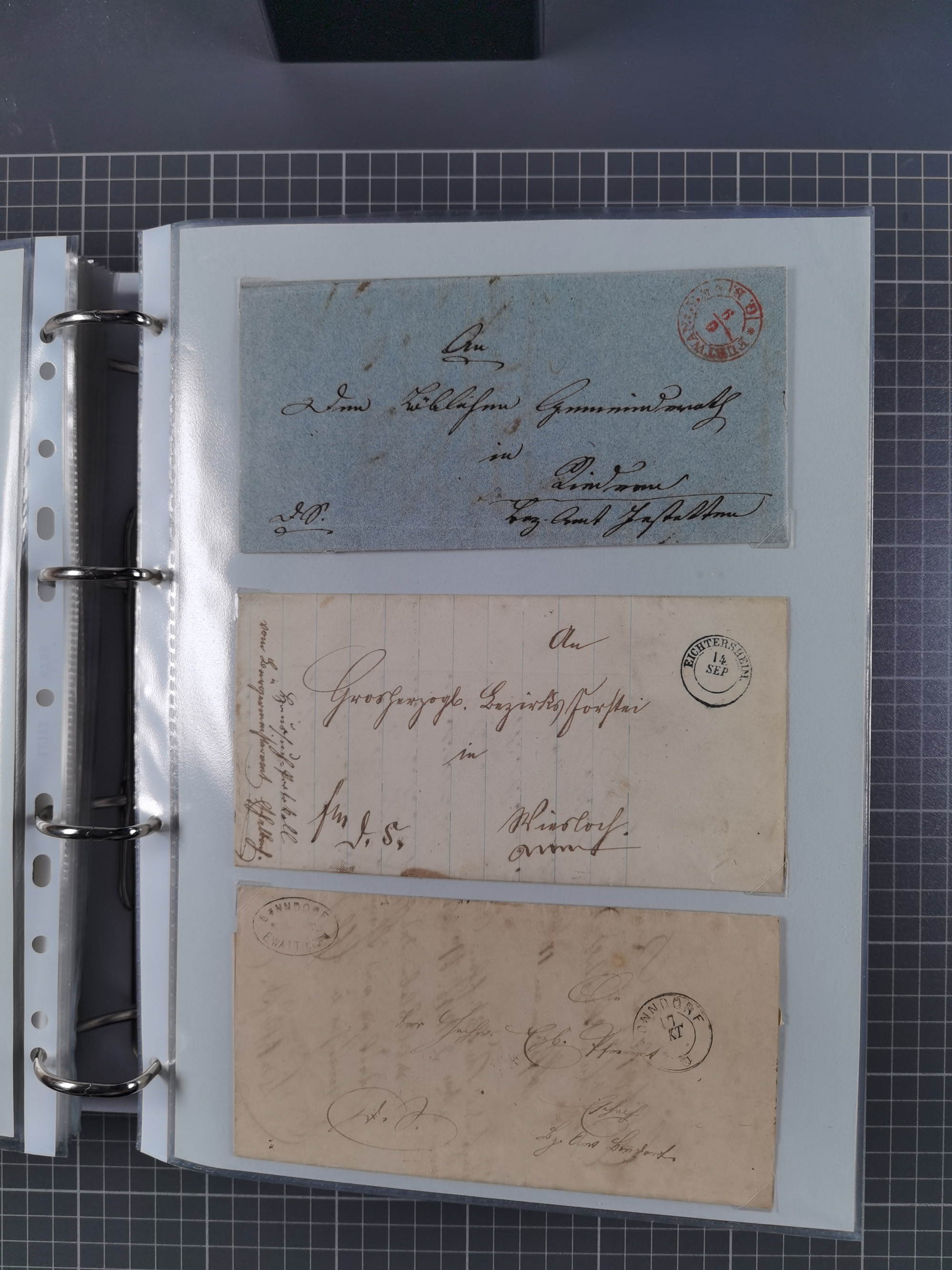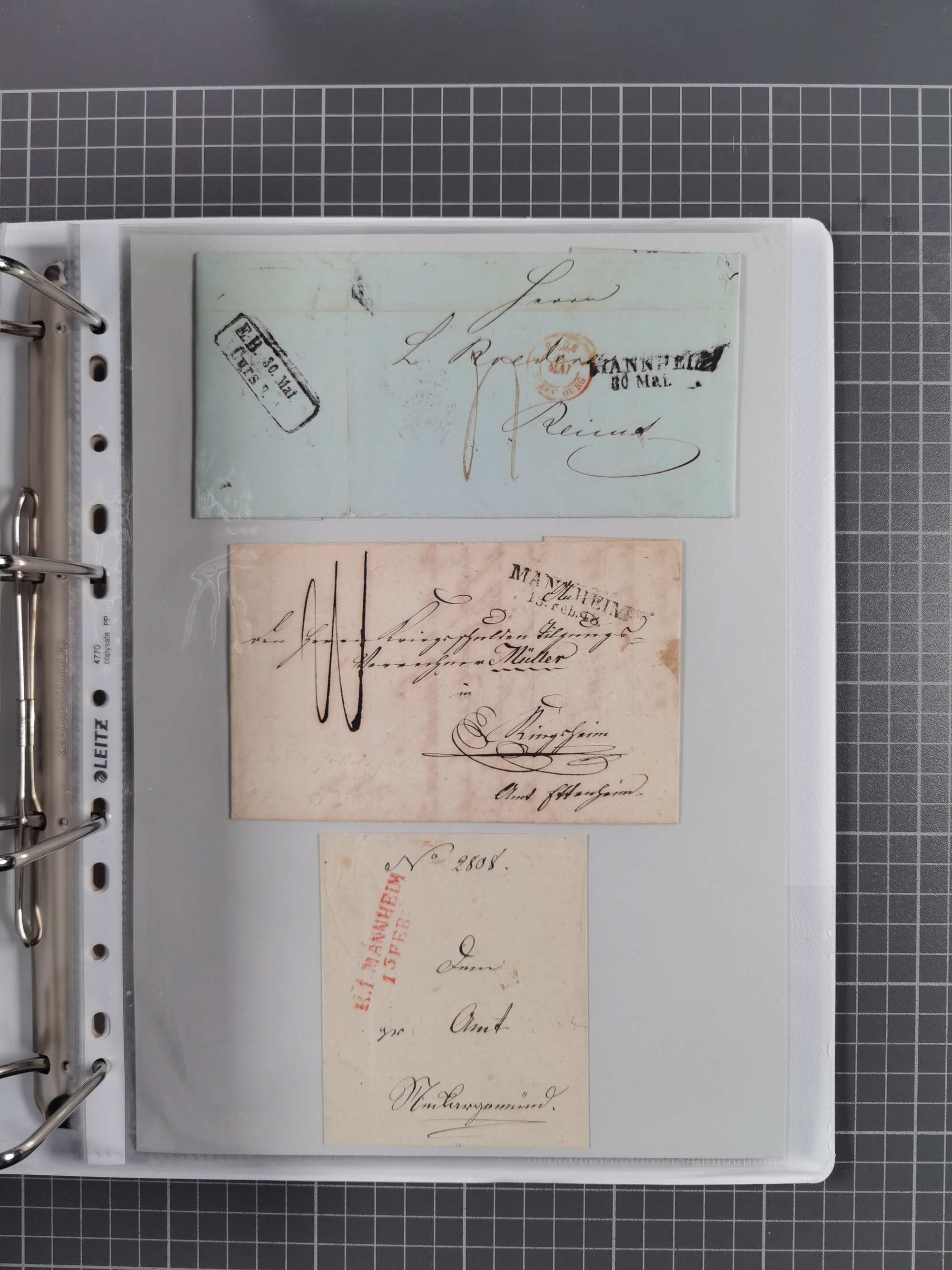 1830/86 (ca.), über 45 meist markenlose Briefe mit Steigbügelstempeln mit Schwerpunkt Württemberg, dabei u.a. HAIGERLOCH in rot auf Vorderseite, ALTSHAUSEN in blau (1844), BLAUFELDEN in waidblau (1850), ECHTERDINGEN in blau (1847), PLOCHINGEN, etc., auch einige Postscheine und Einzelmarken, im Album