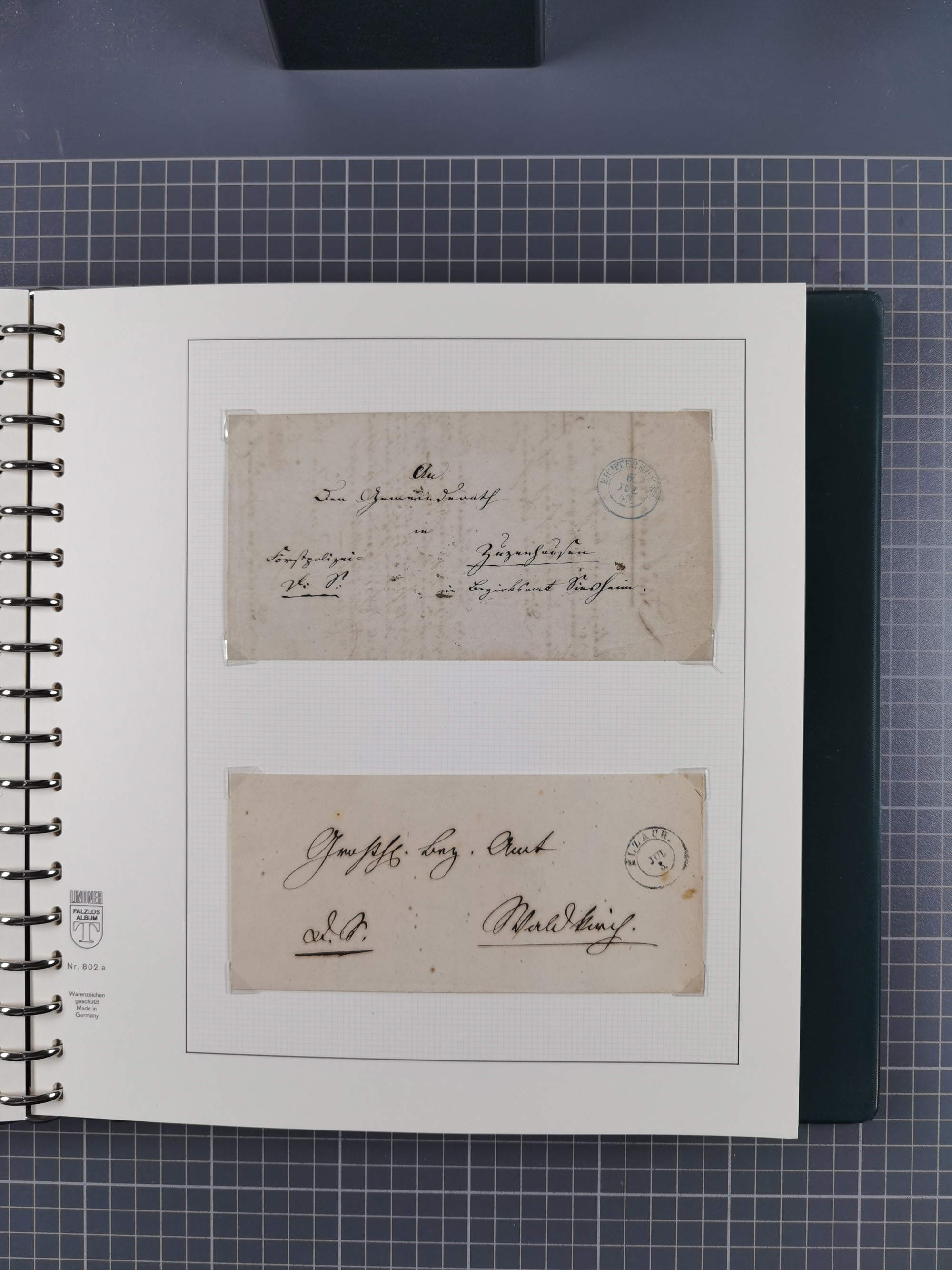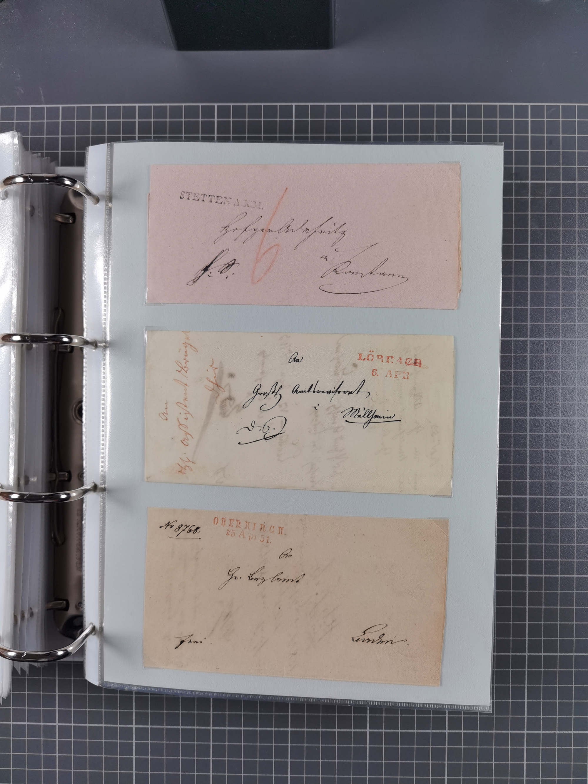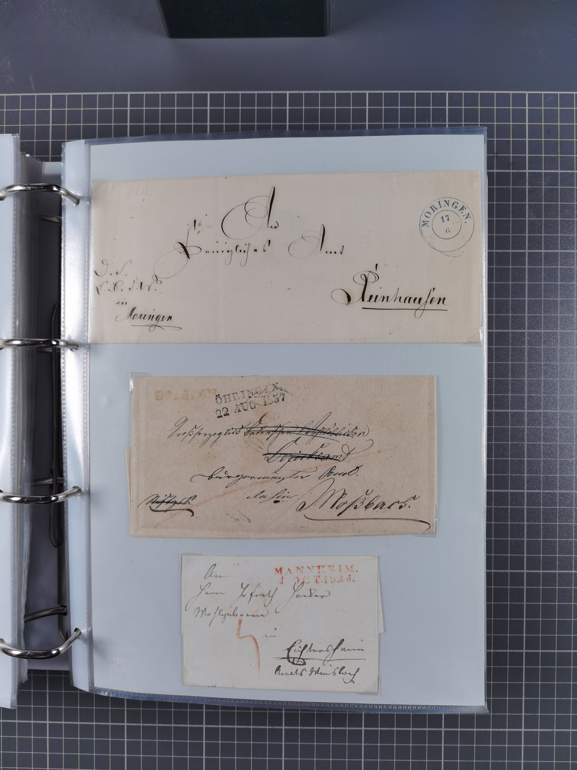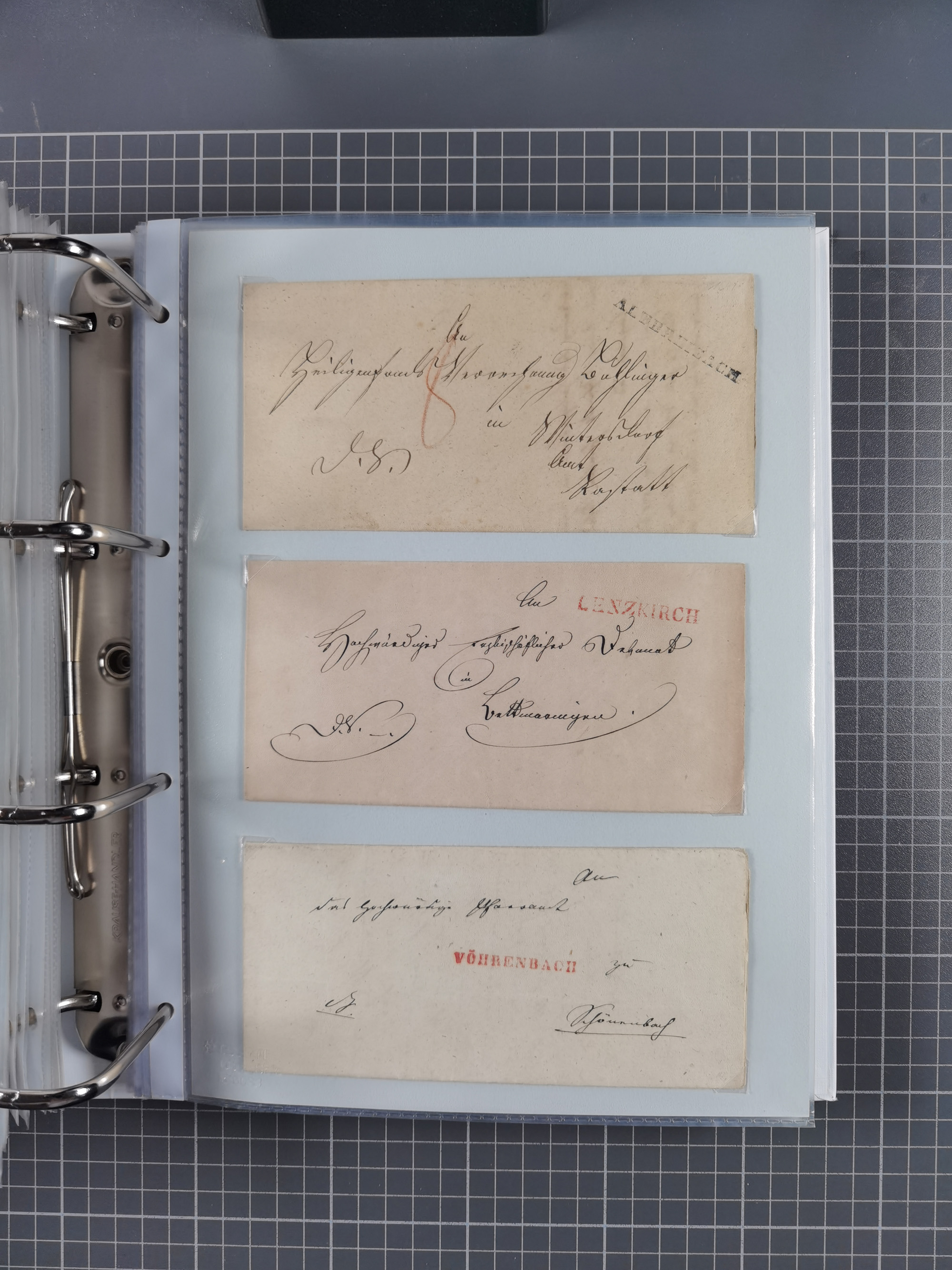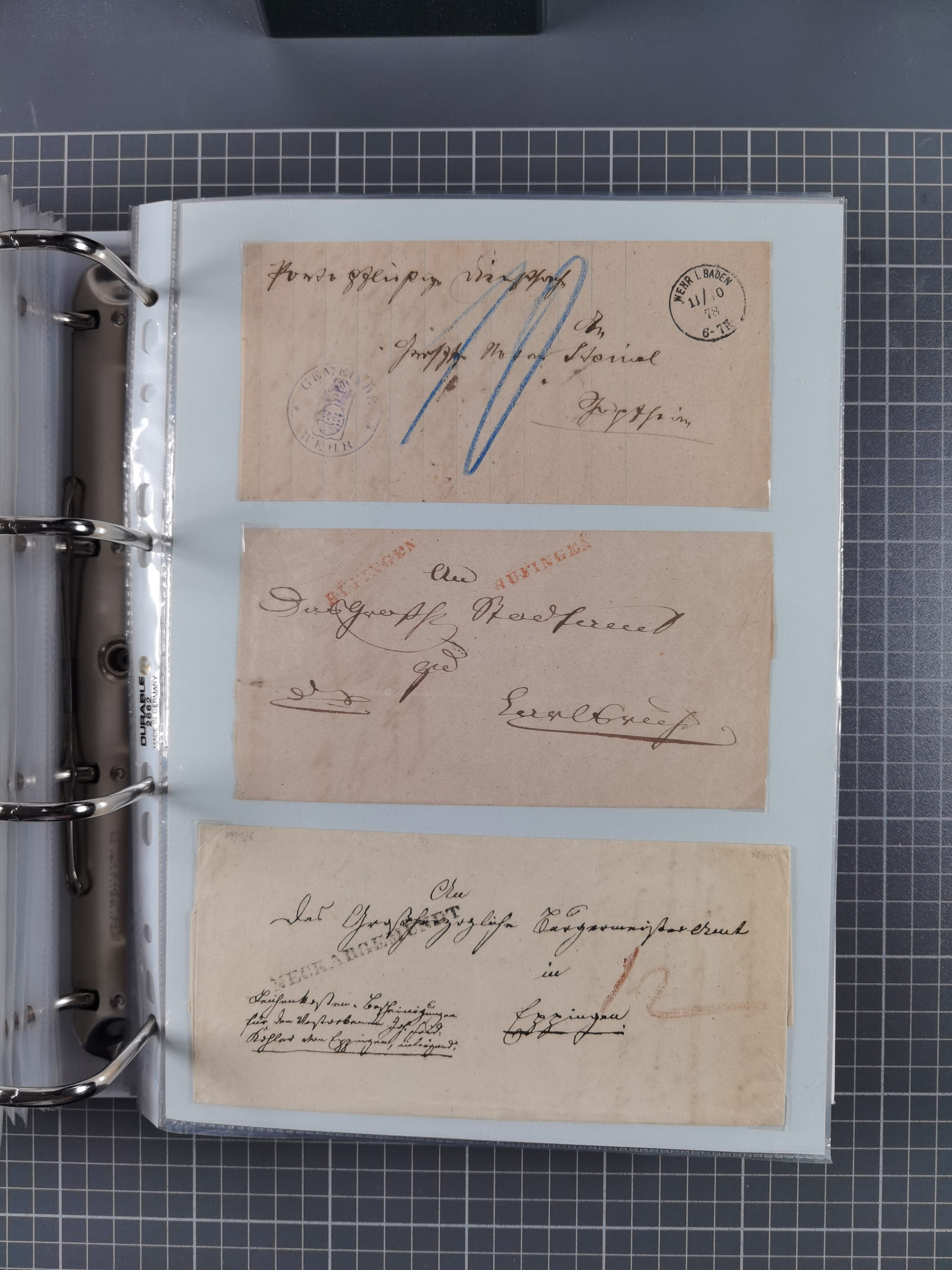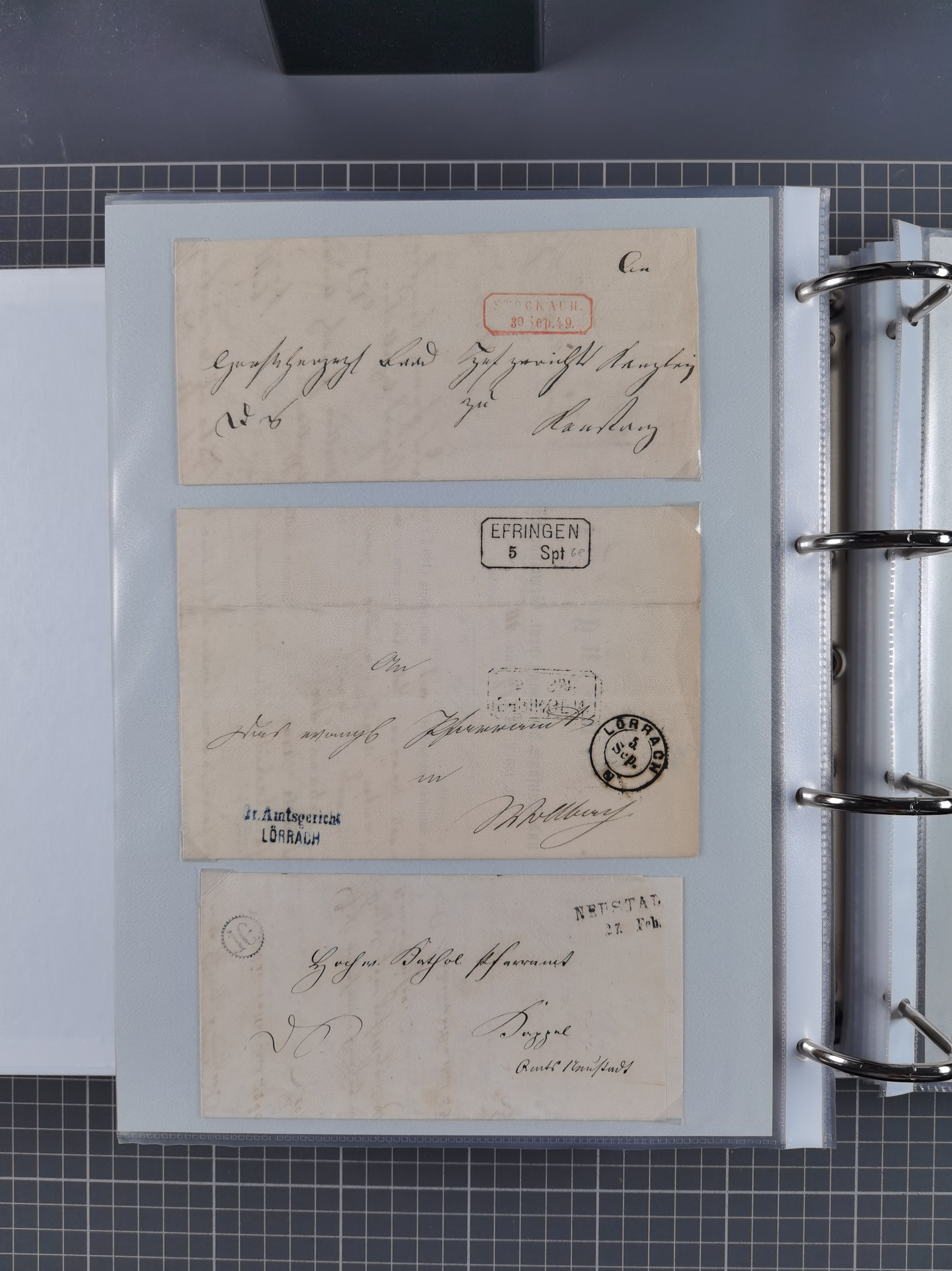 1830/86 (ca.), über 45 meist markenlose Briefe mit Steigbügelstempeln mit Schwerpunkt Württemberg, dabei u.a. HAIGERLOCH in rot auf Vorderseite, ALTSHAUSEN in blau (1844), BLAUFELDEN in waidblau (1850), ECHTERDINGEN in blau (1847), PLOCHINGEN, etc., auch einige Postscheine und Einzelmarken, im Album