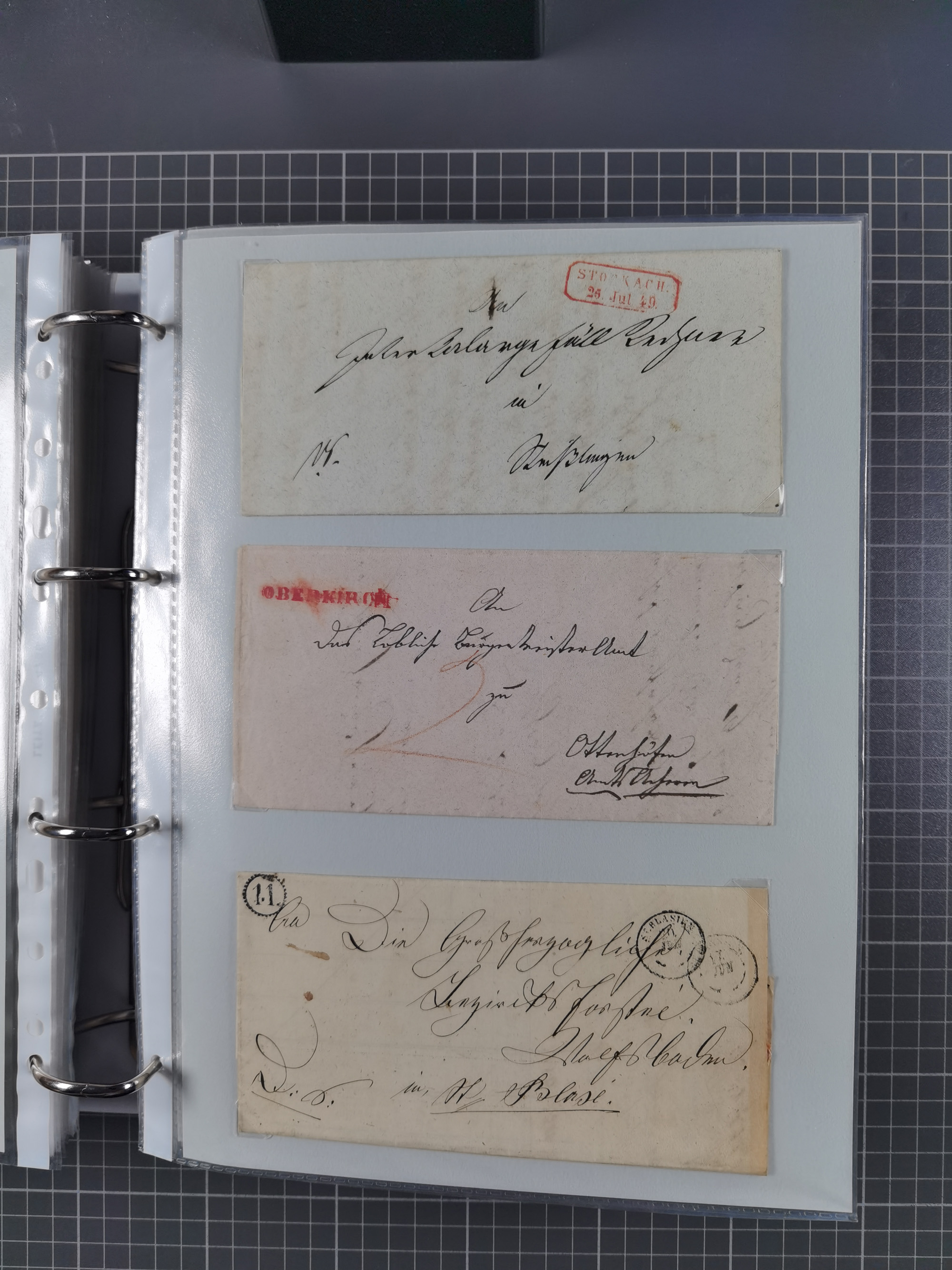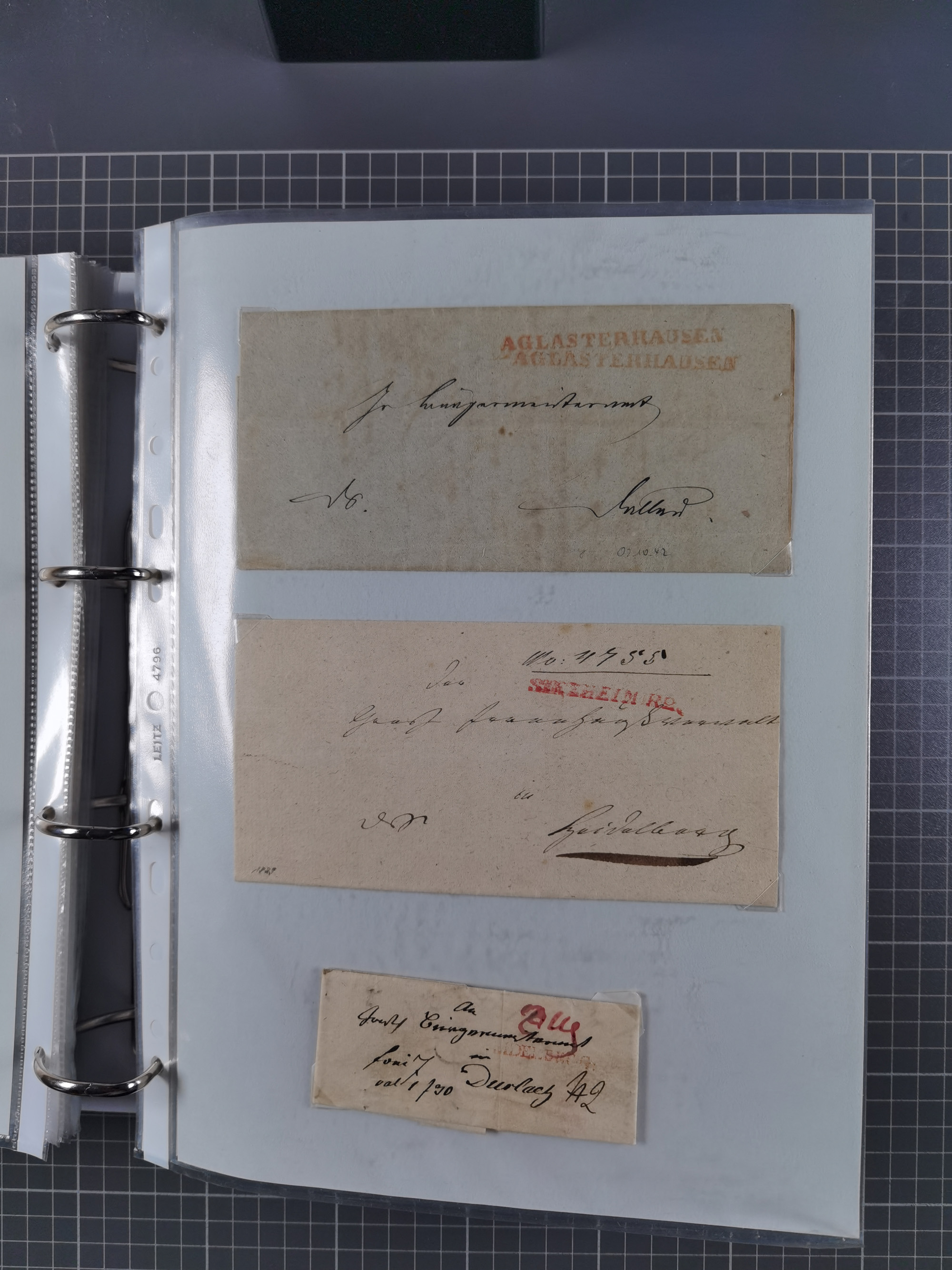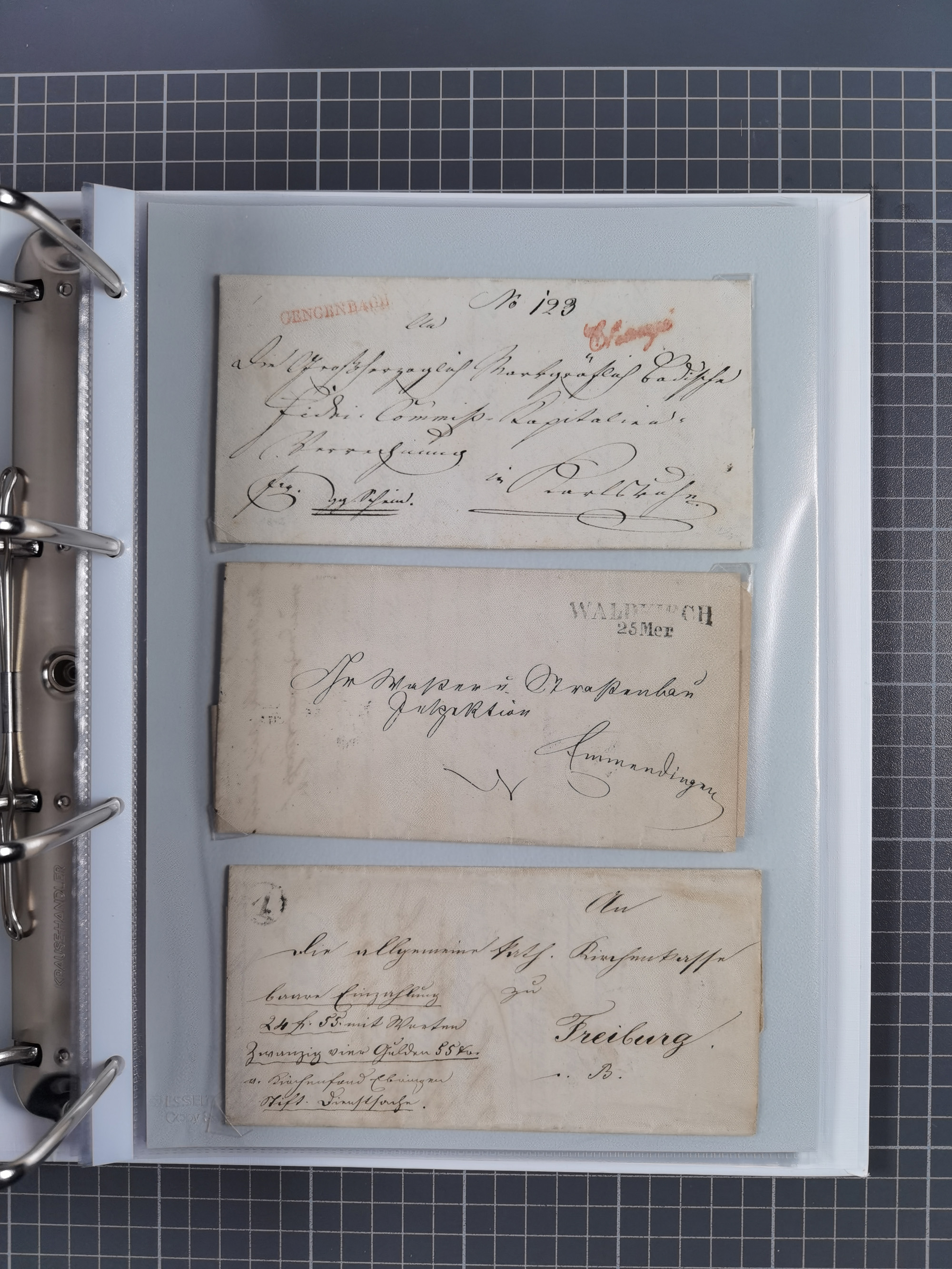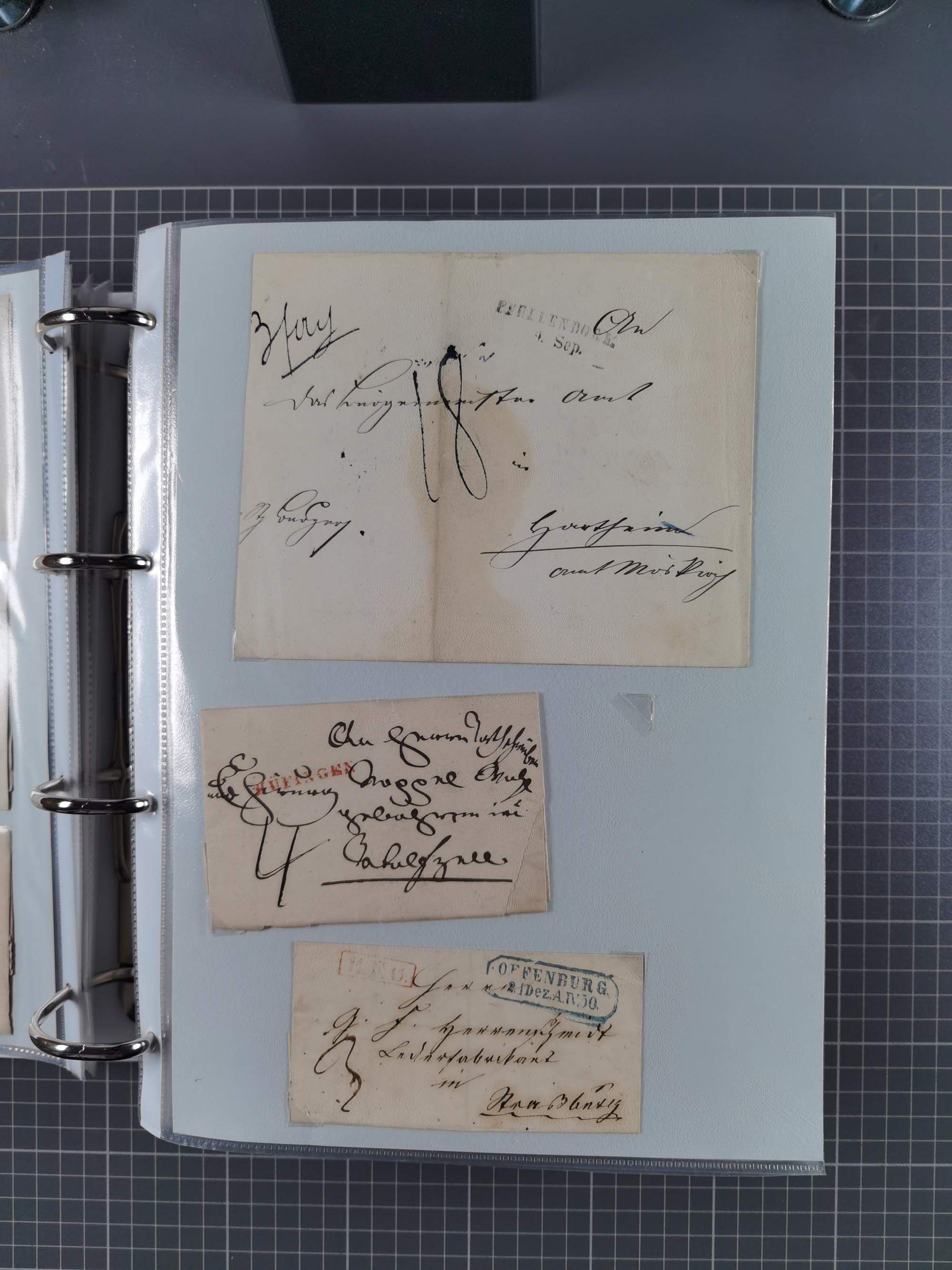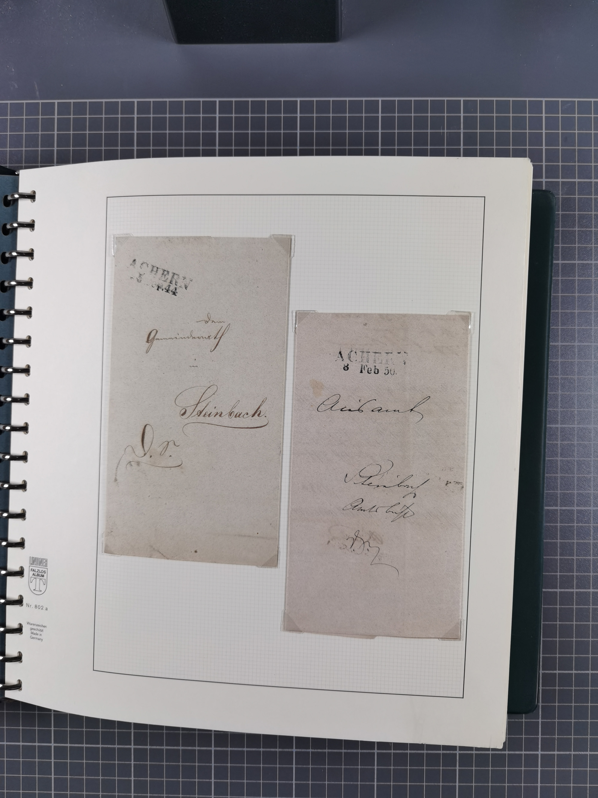 1830/86 (ca.), über 45 meist markenlose Briefe mit Steigbügelstempeln mit Schwerpunkt Württemberg, dabei u.a. HAIGERLOCH in rot auf Vorderseite, ALTSHAUSEN in blau (1844), BLAUFELDEN in waidblau (1850), ECHTERDINGEN in blau (1847), PLOCHINGEN, etc., auch einige Postscheine und Einzelmarken, im Album