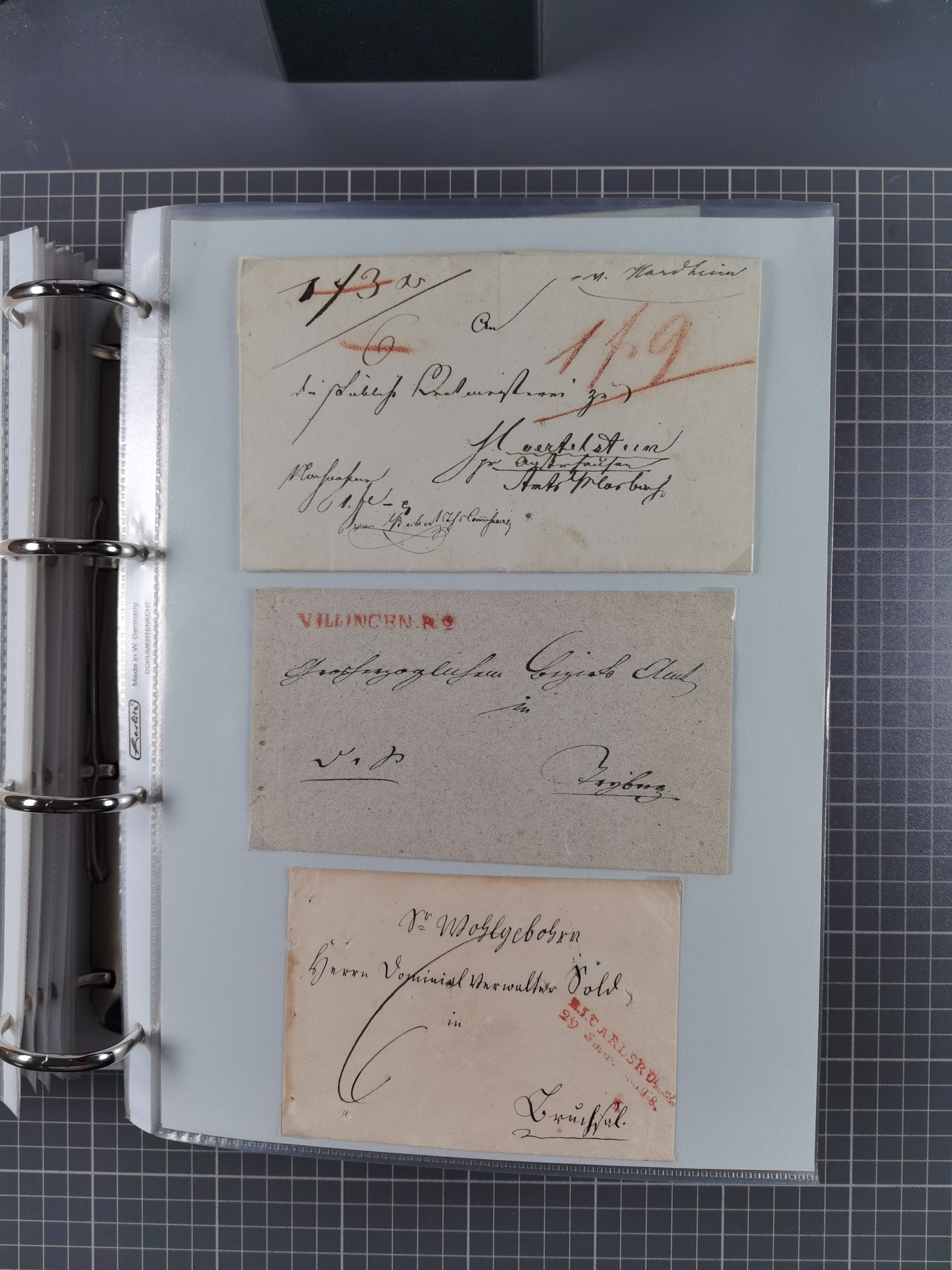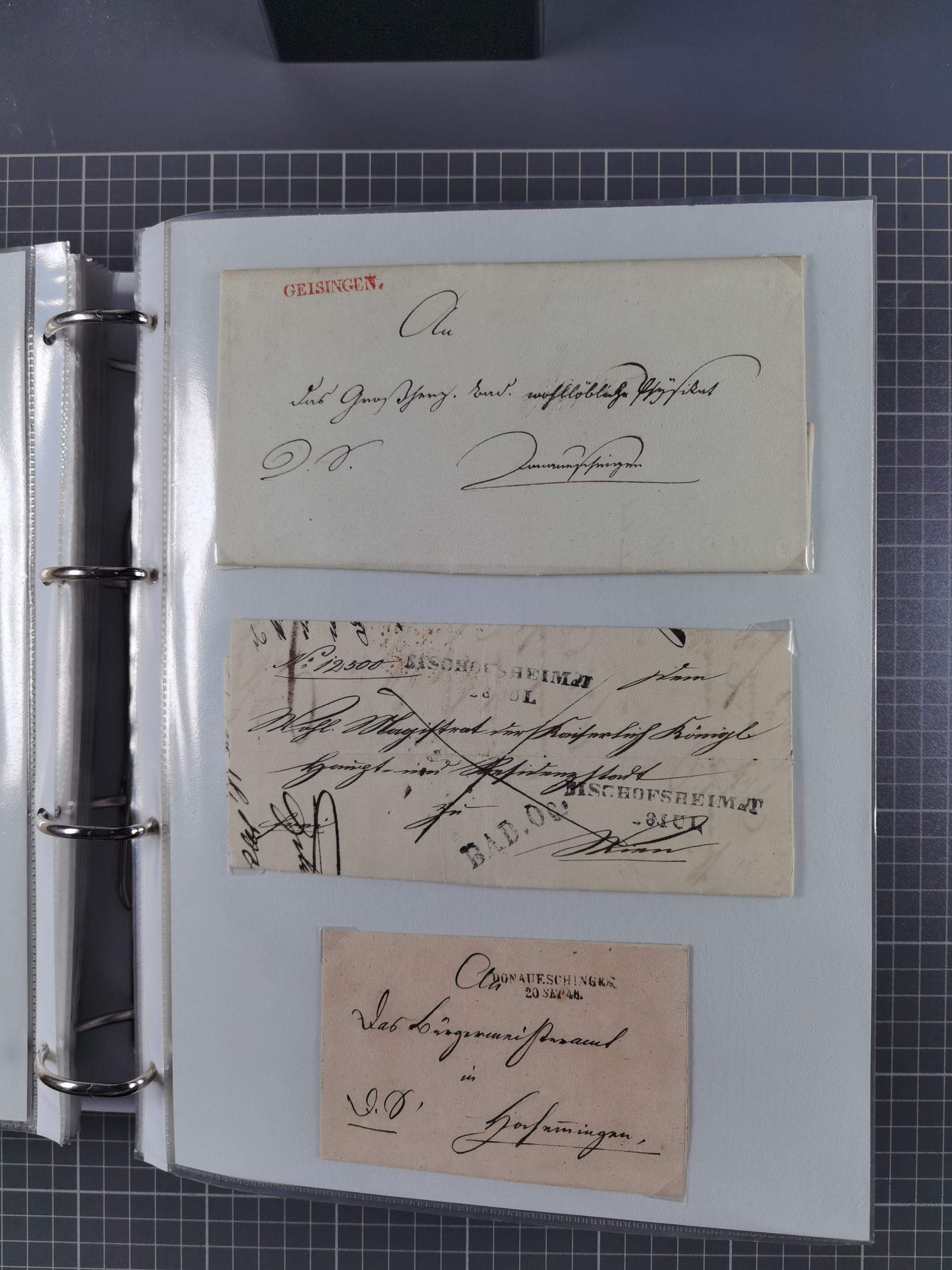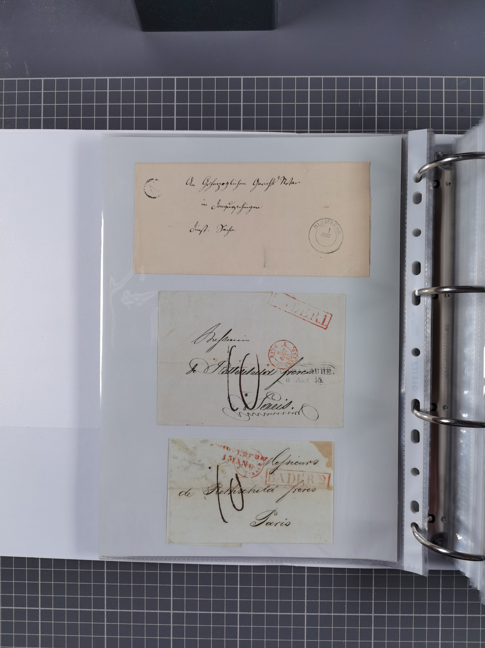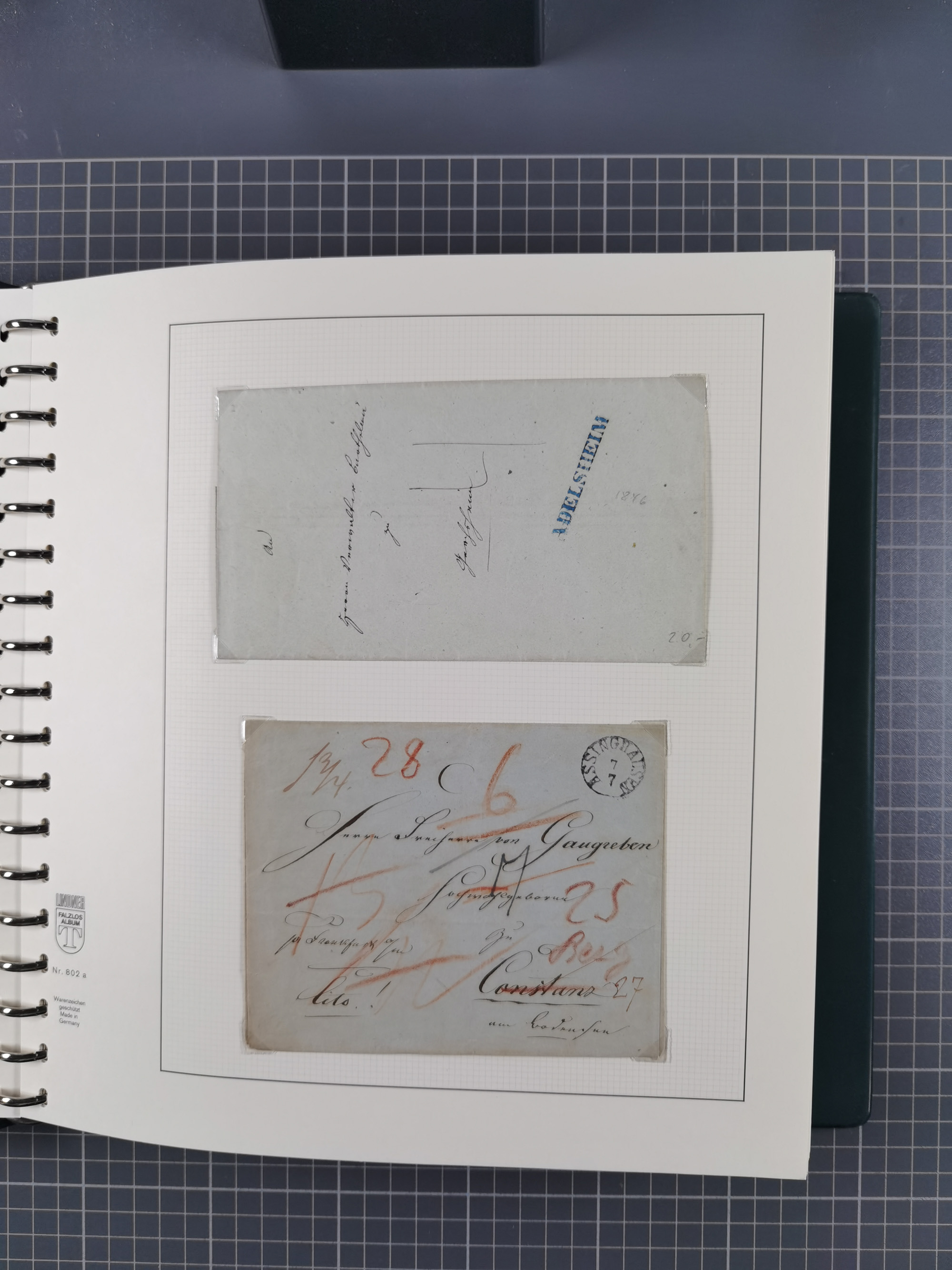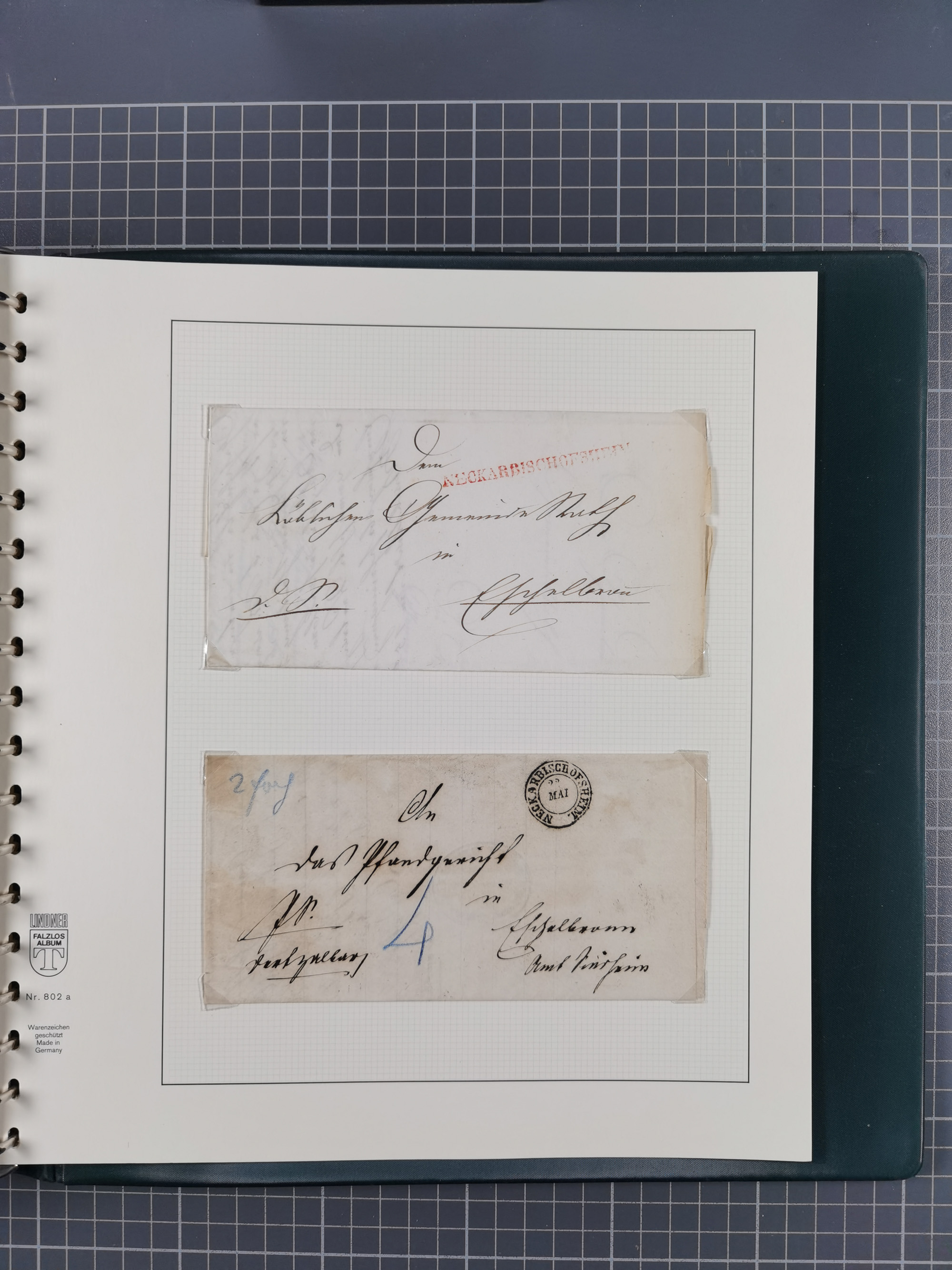 1830/86 (ca.), über 45 meist markenlose Briefe mit Steigbügelstempeln mit Schwerpunkt Württemberg, dabei u.a. HAIGERLOCH in rot auf Vorderseite, ALTSHAUSEN in blau (1844), BLAUFELDEN in waidblau (1850), ECHTERDINGEN in blau (1847), PLOCHINGEN, etc., auch einige Postscheine und Einzelmarken, im Album