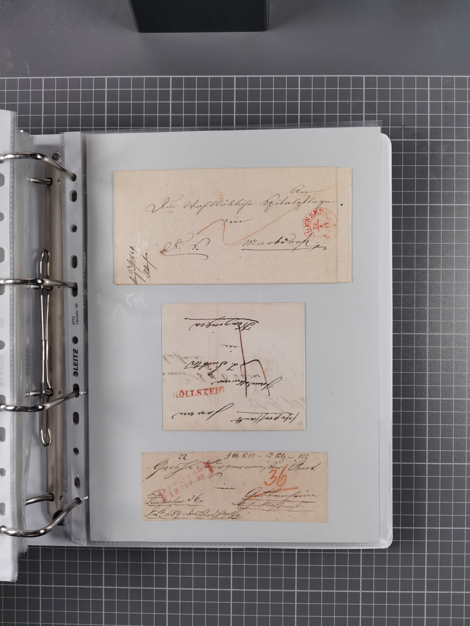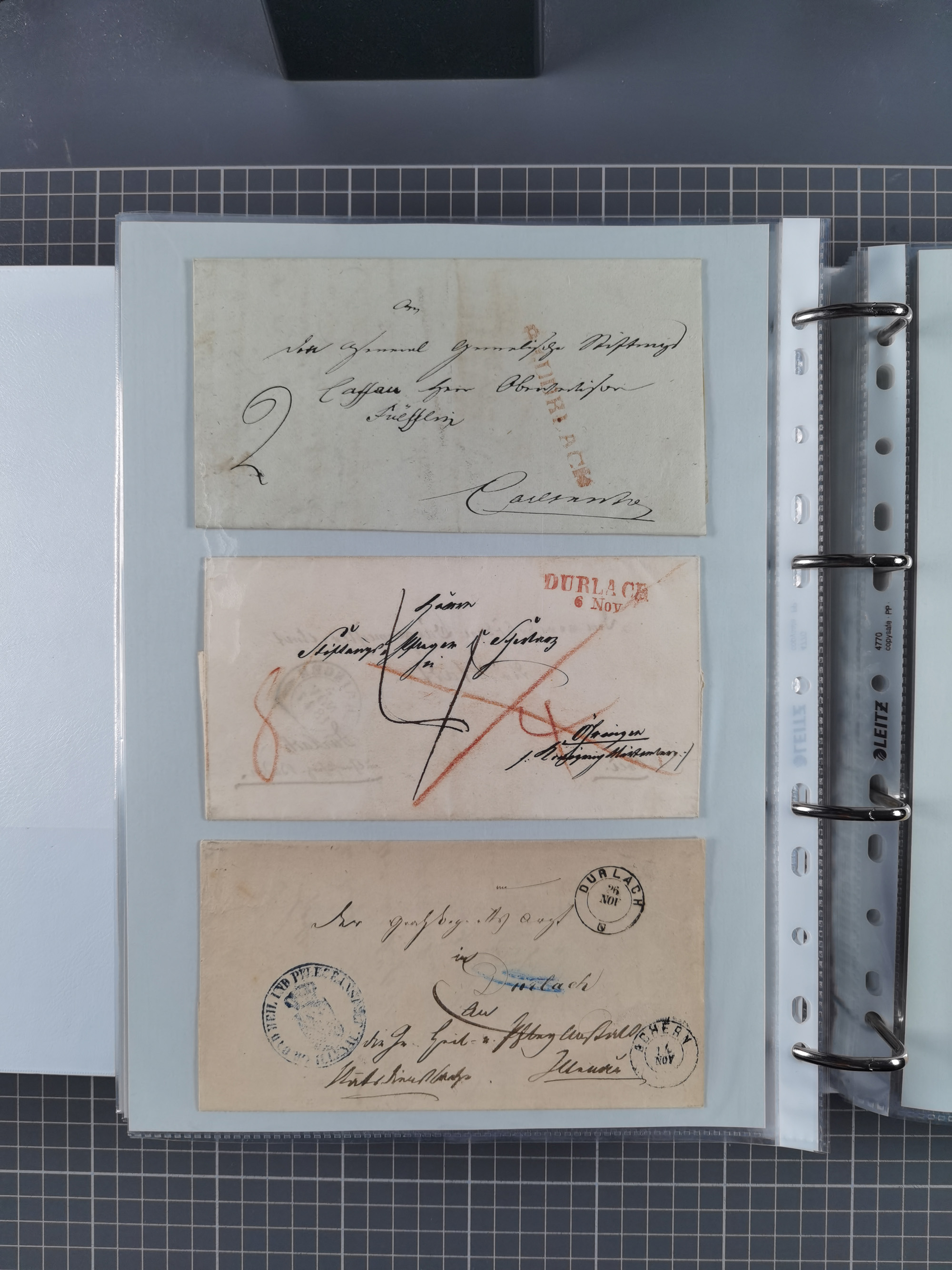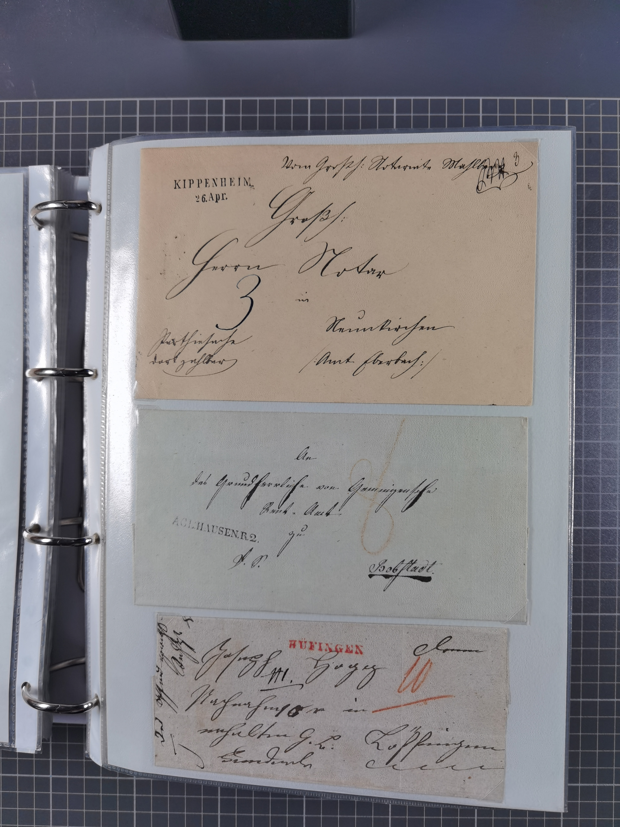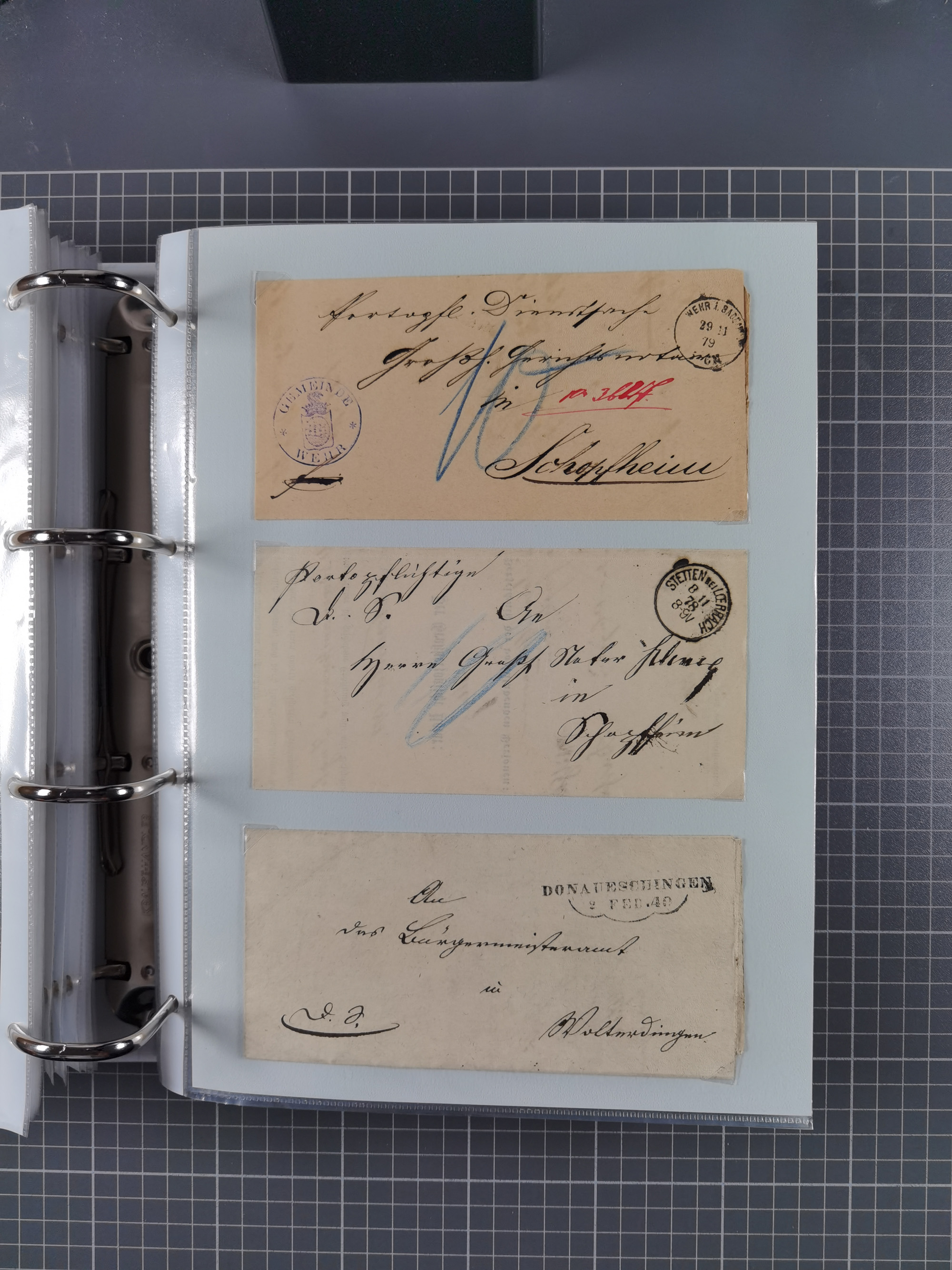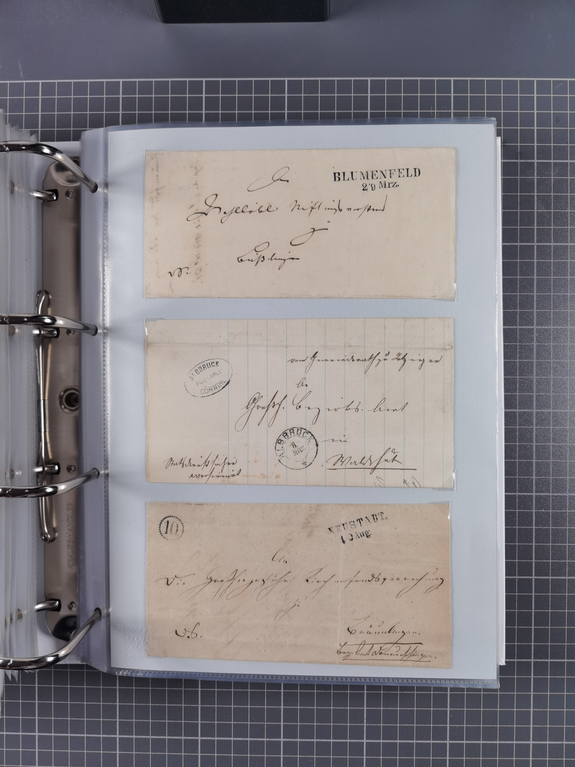 1830/86 (ca.), über 45 meist markenlose Briefe mit Steigbügelstempeln mit Schwerpunkt Württemberg, dabei u.a. HAIGERLOCH in rot auf Vorderseite, ALTSHAUSEN in blau (1844), BLAUFELDEN in waidblau (1850), ECHTERDINGEN in blau (1847), PLOCHINGEN, etc., auch einige Postscheine und Einzelmarken, im Album