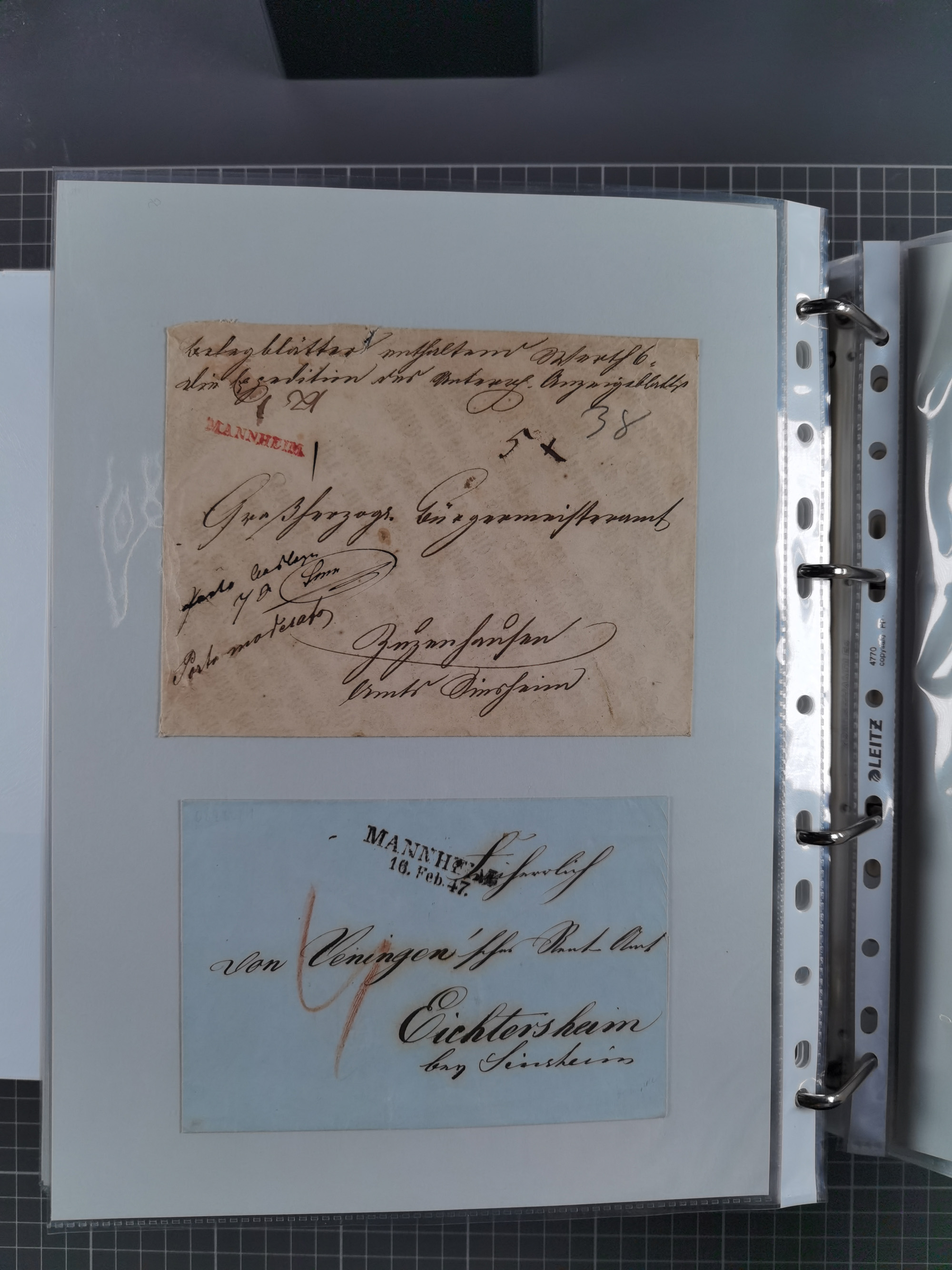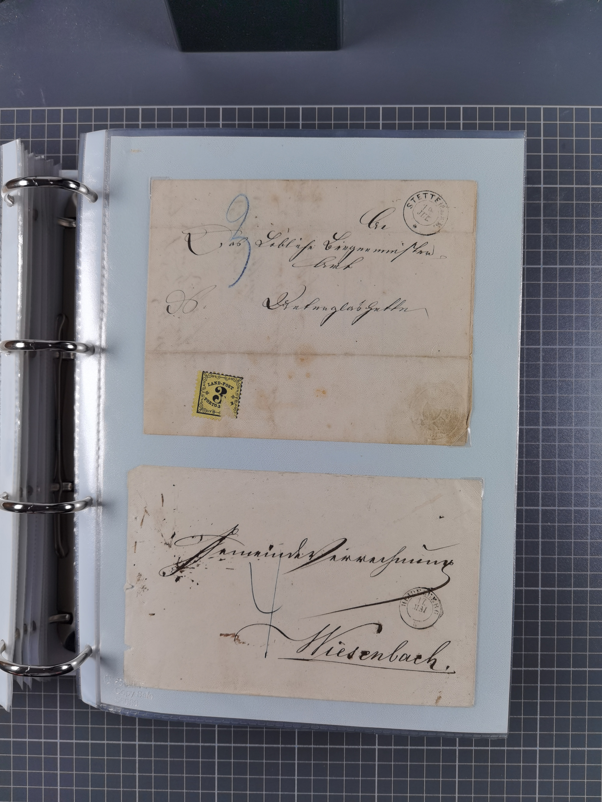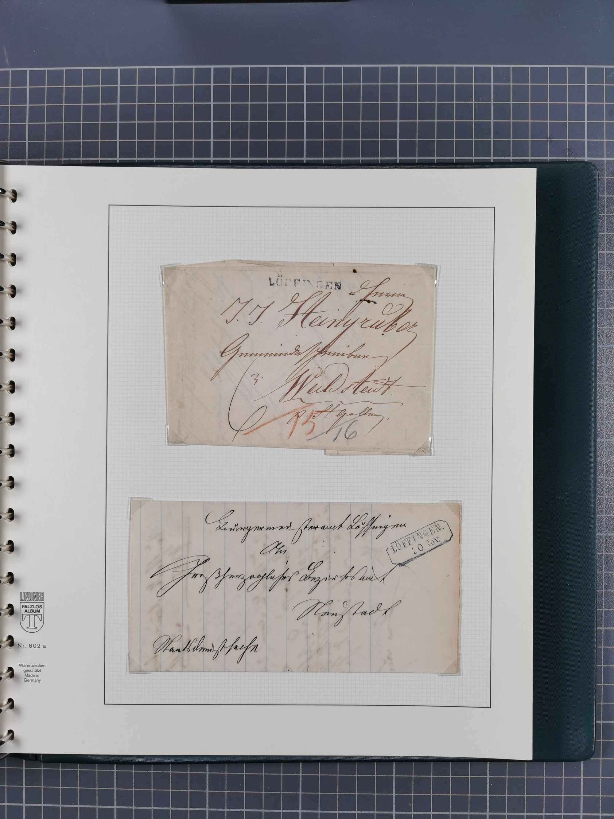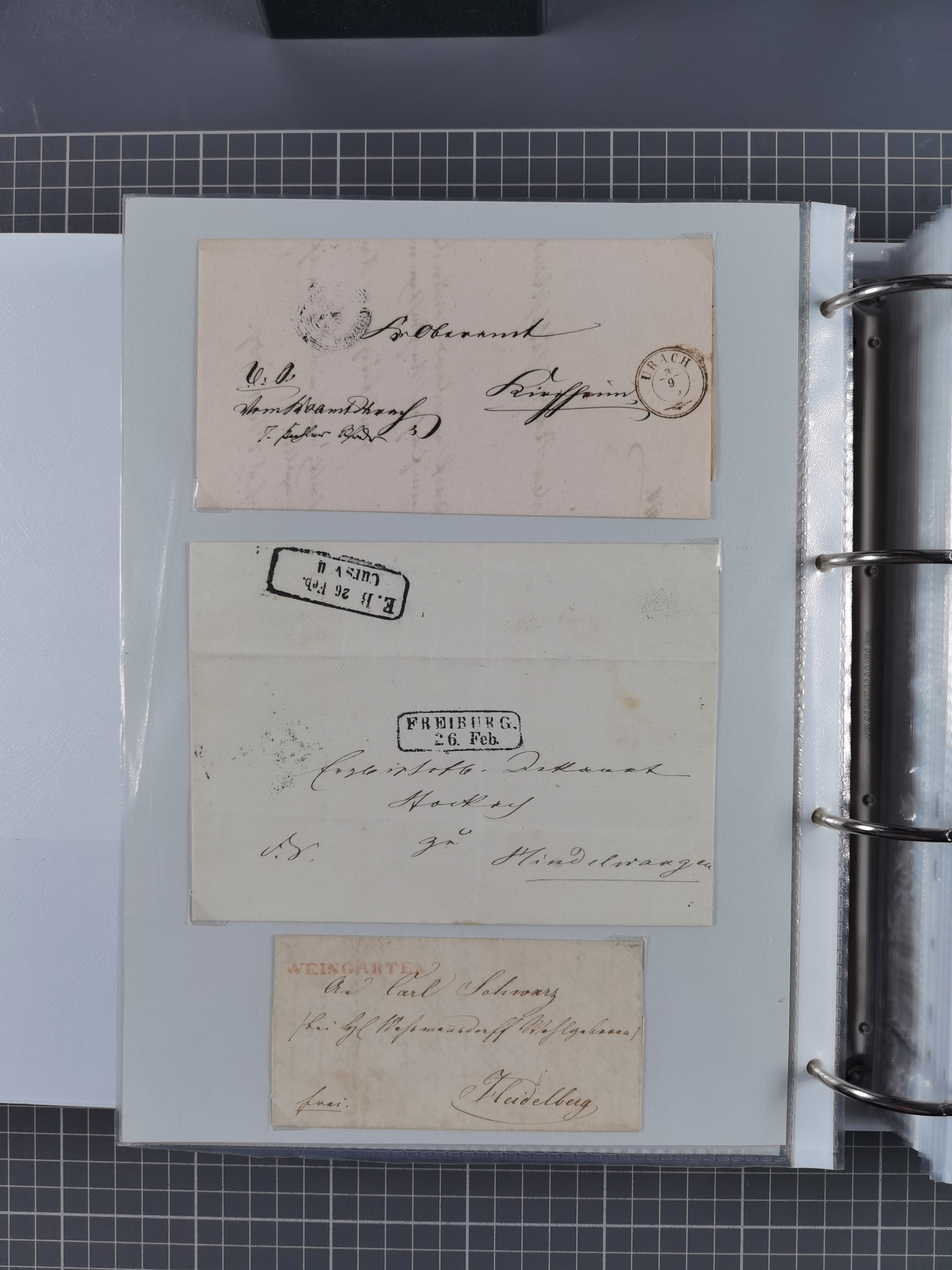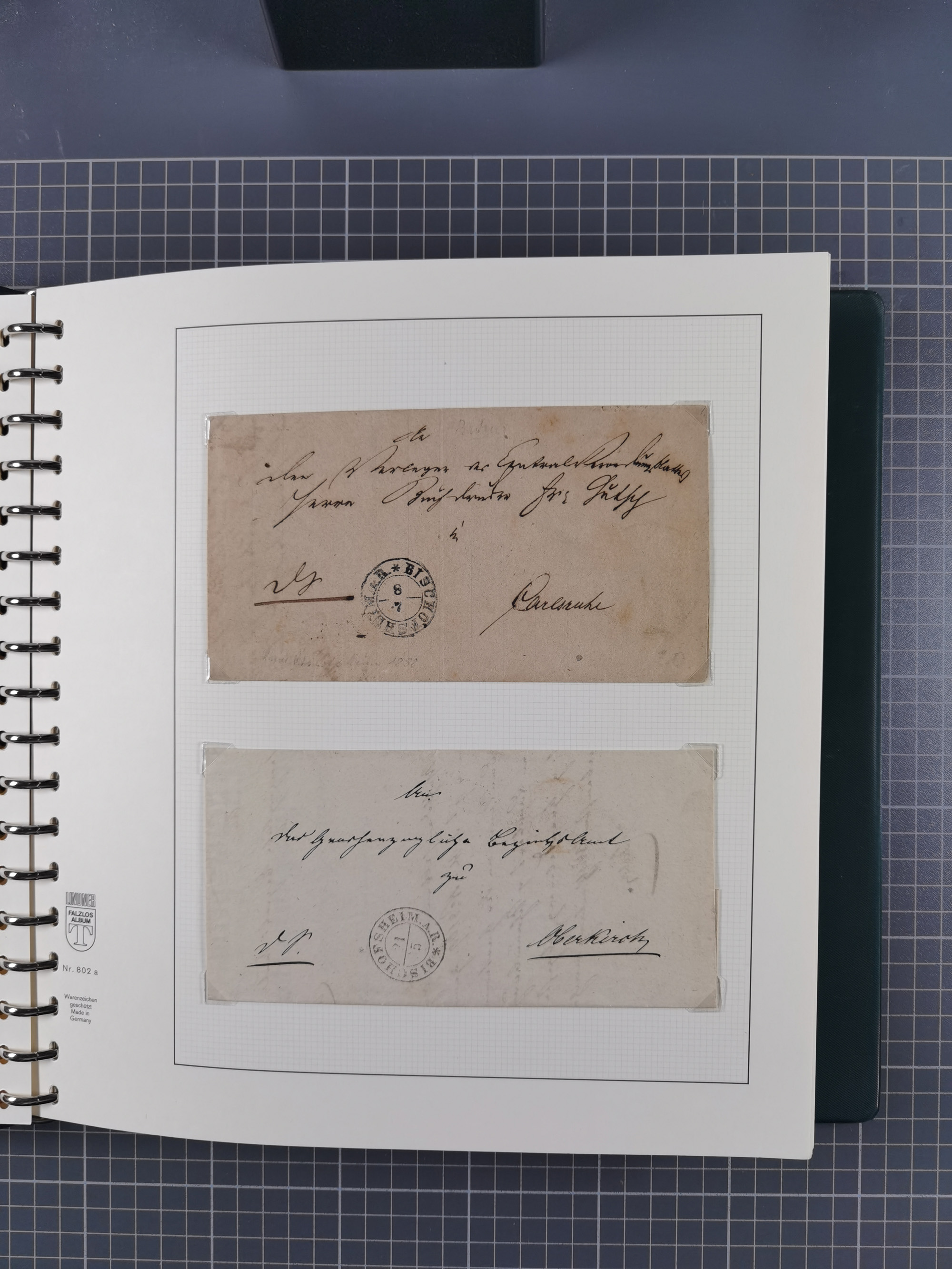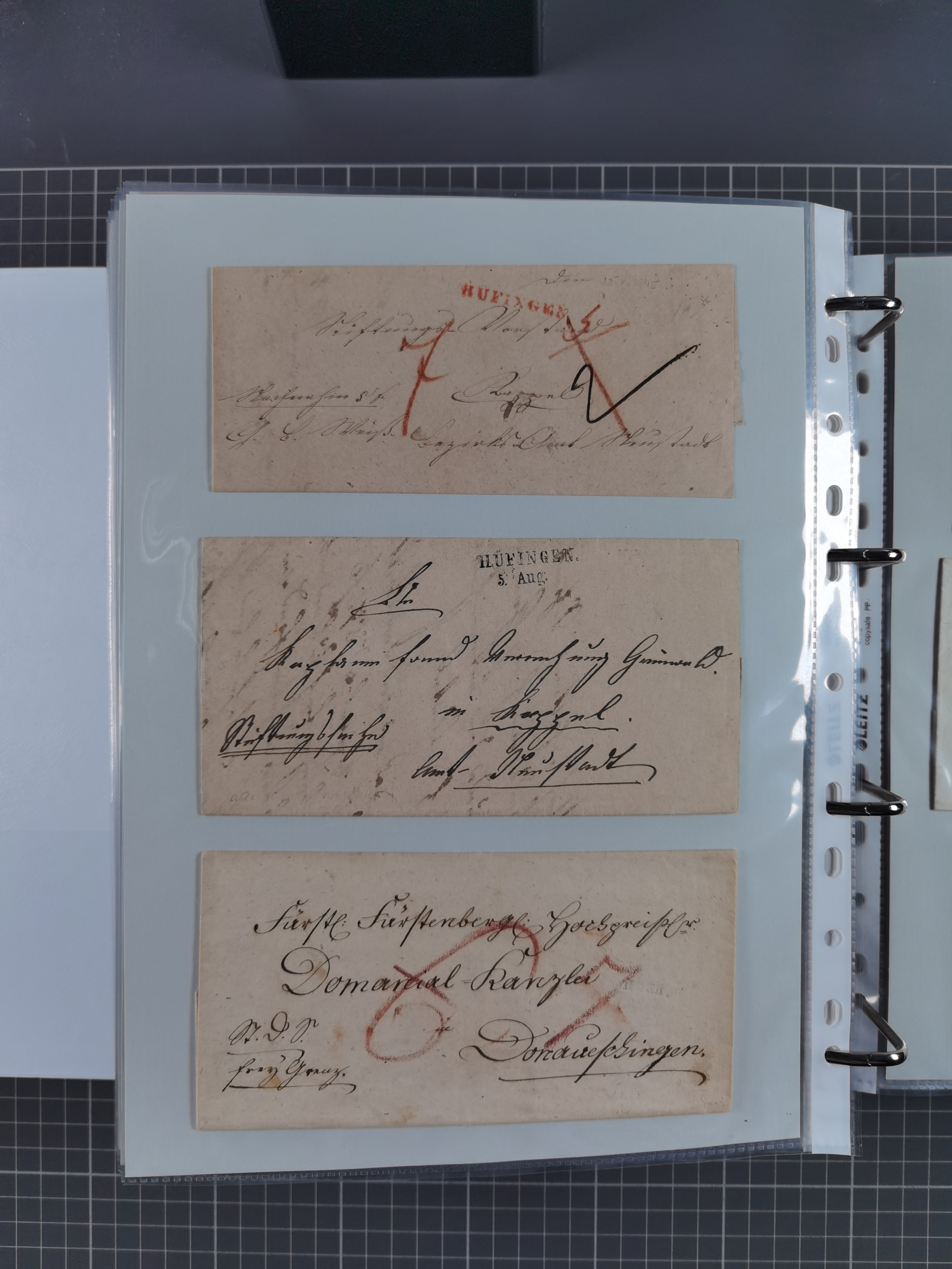 1830/86 (ca.), über 45 meist markenlose Briefe mit Steigbügelstempeln mit Schwerpunkt Württemberg, dabei u.a. HAIGERLOCH in rot auf Vorderseite, ALTSHAUSEN in blau (1844), BLAUFELDEN in waidblau (1850), ECHTERDINGEN in blau (1847), PLOCHINGEN, etc., auch einige Postscheine und Einzelmarken, im Album