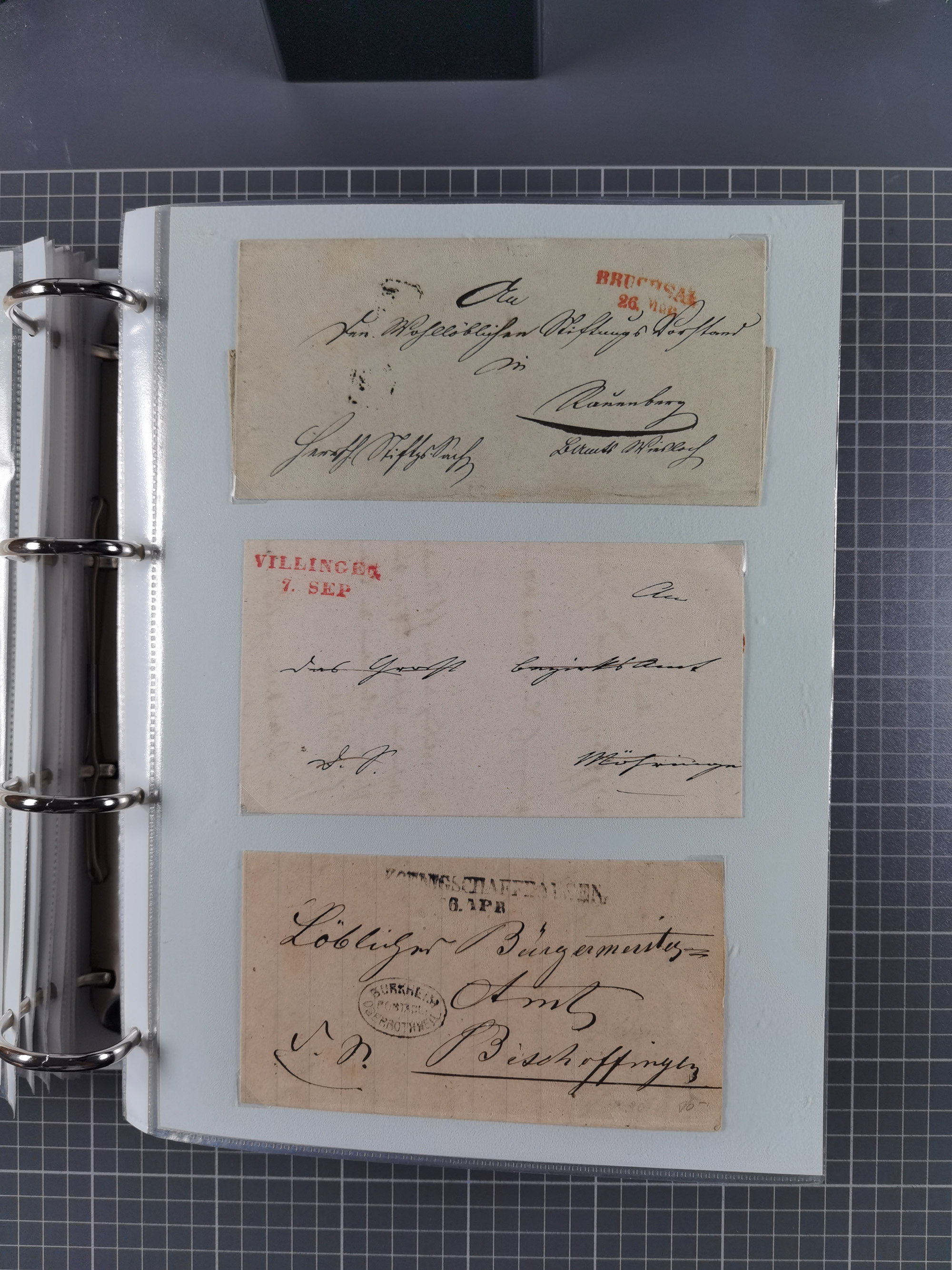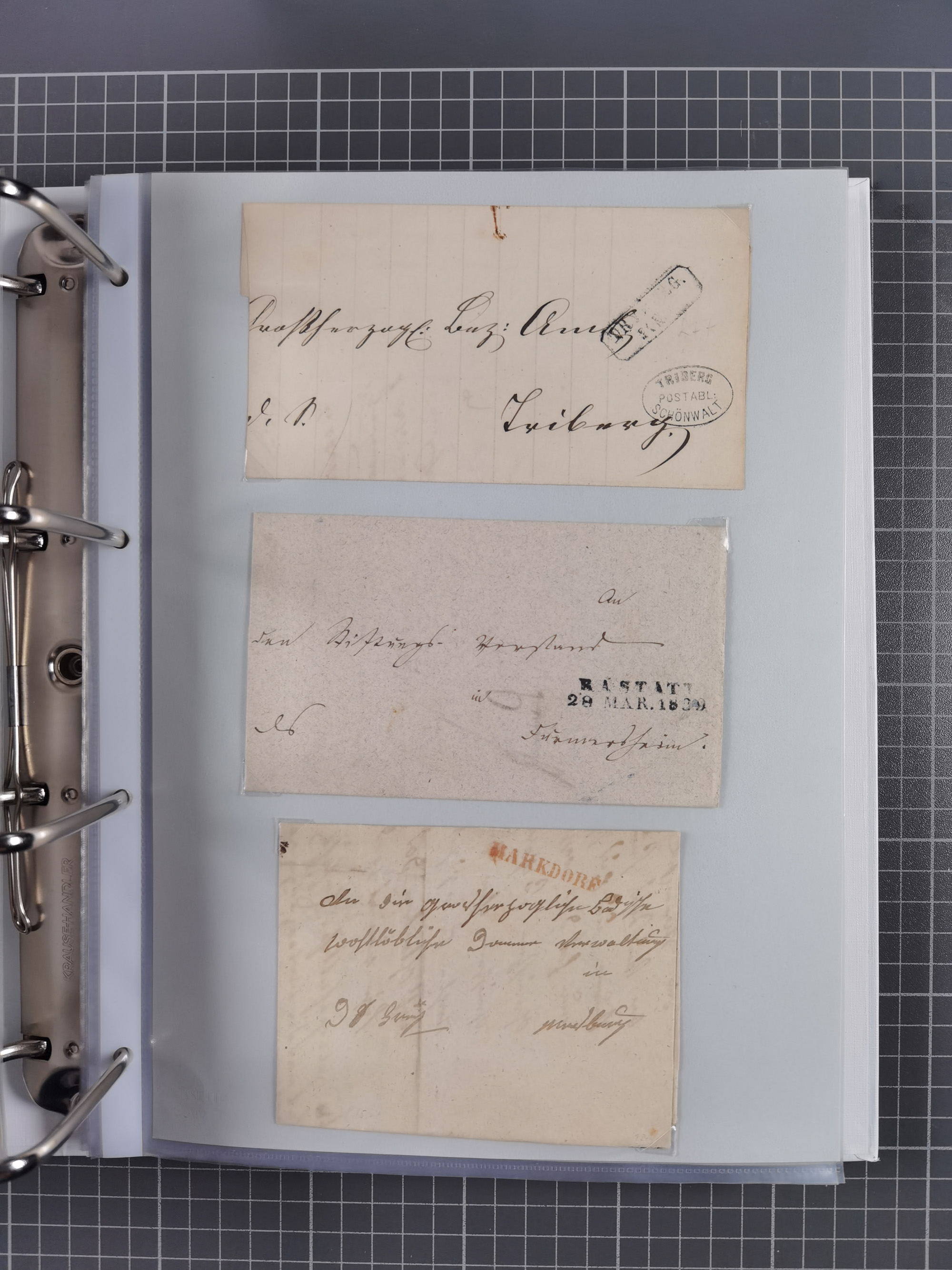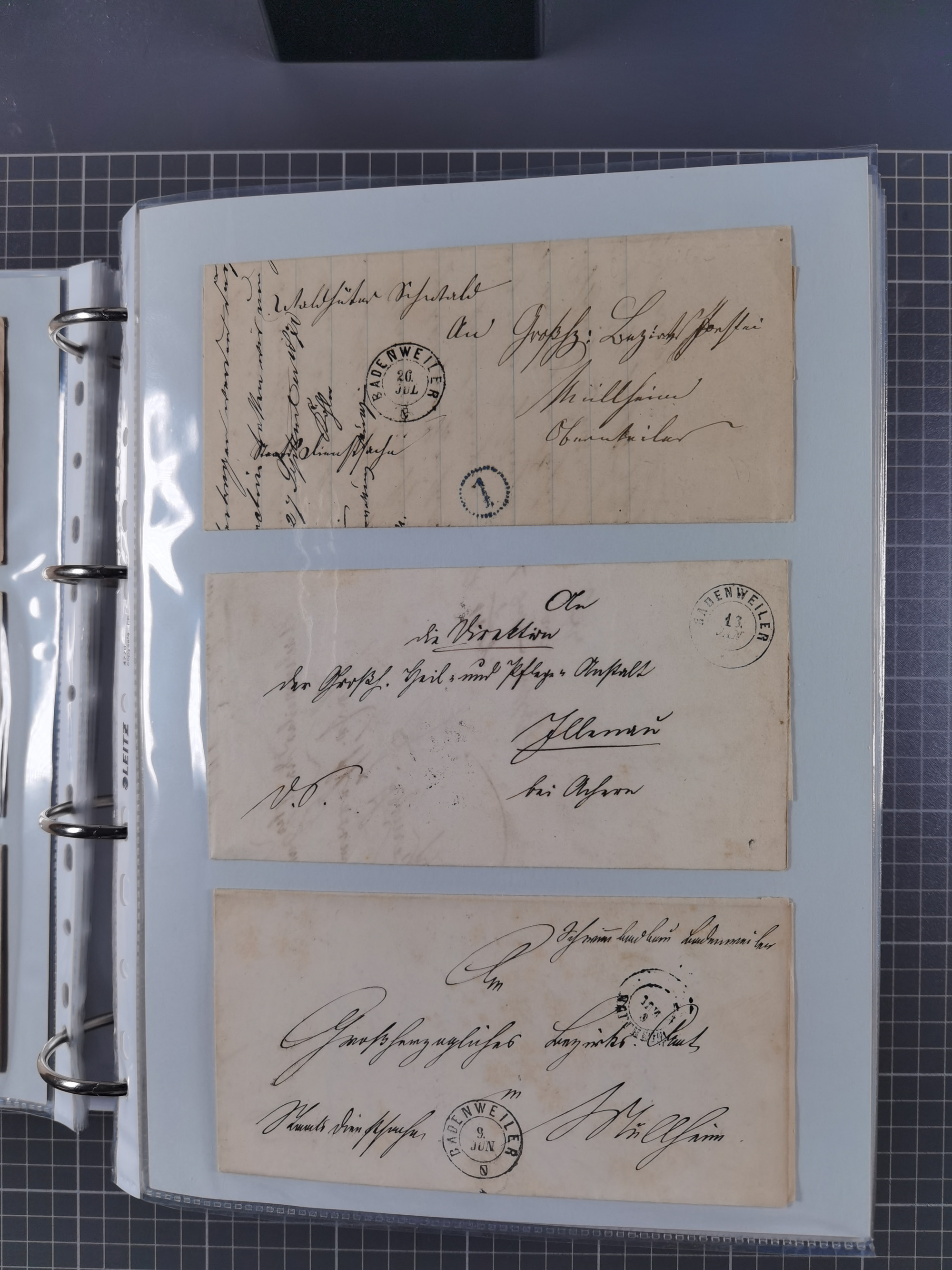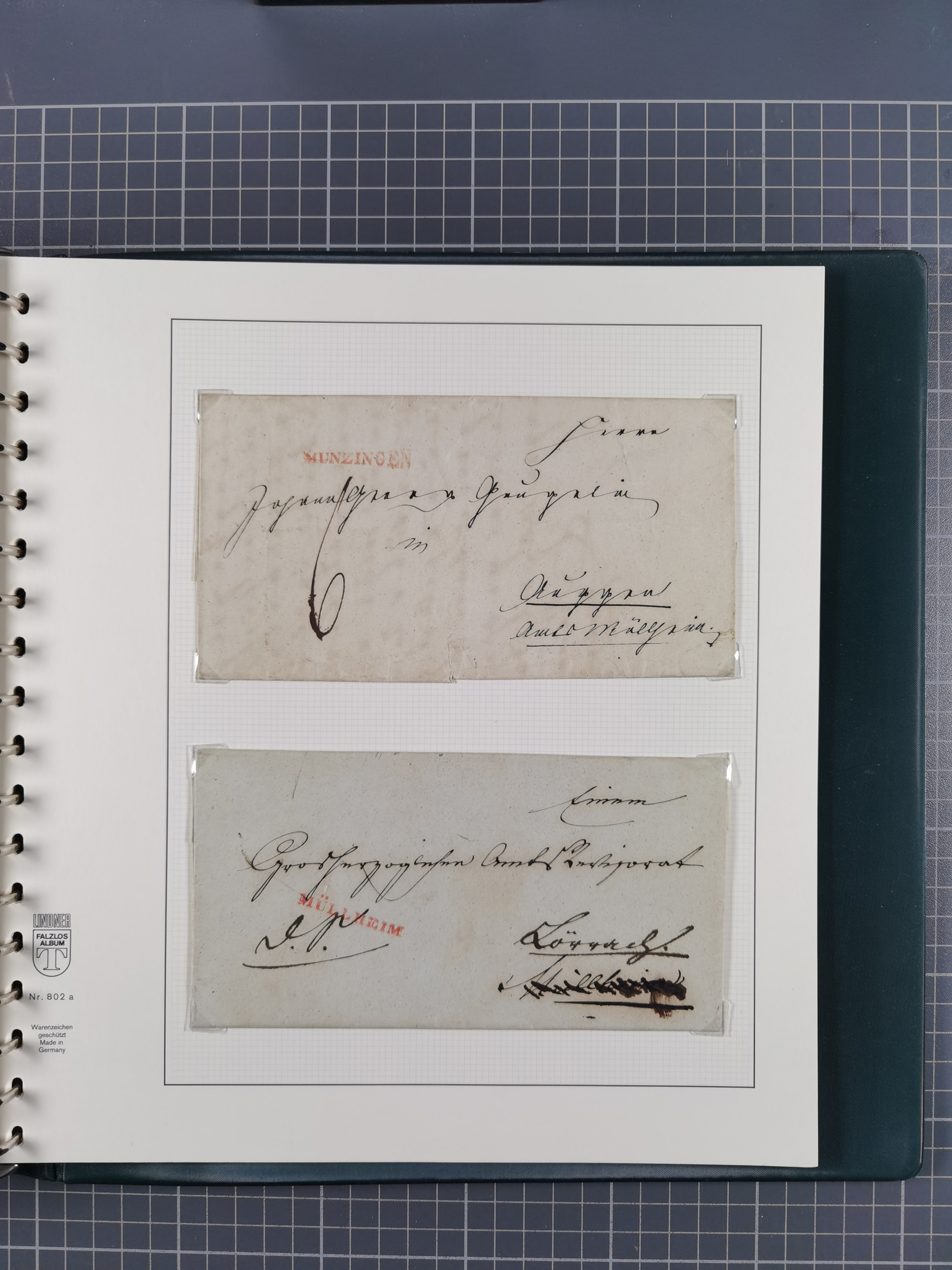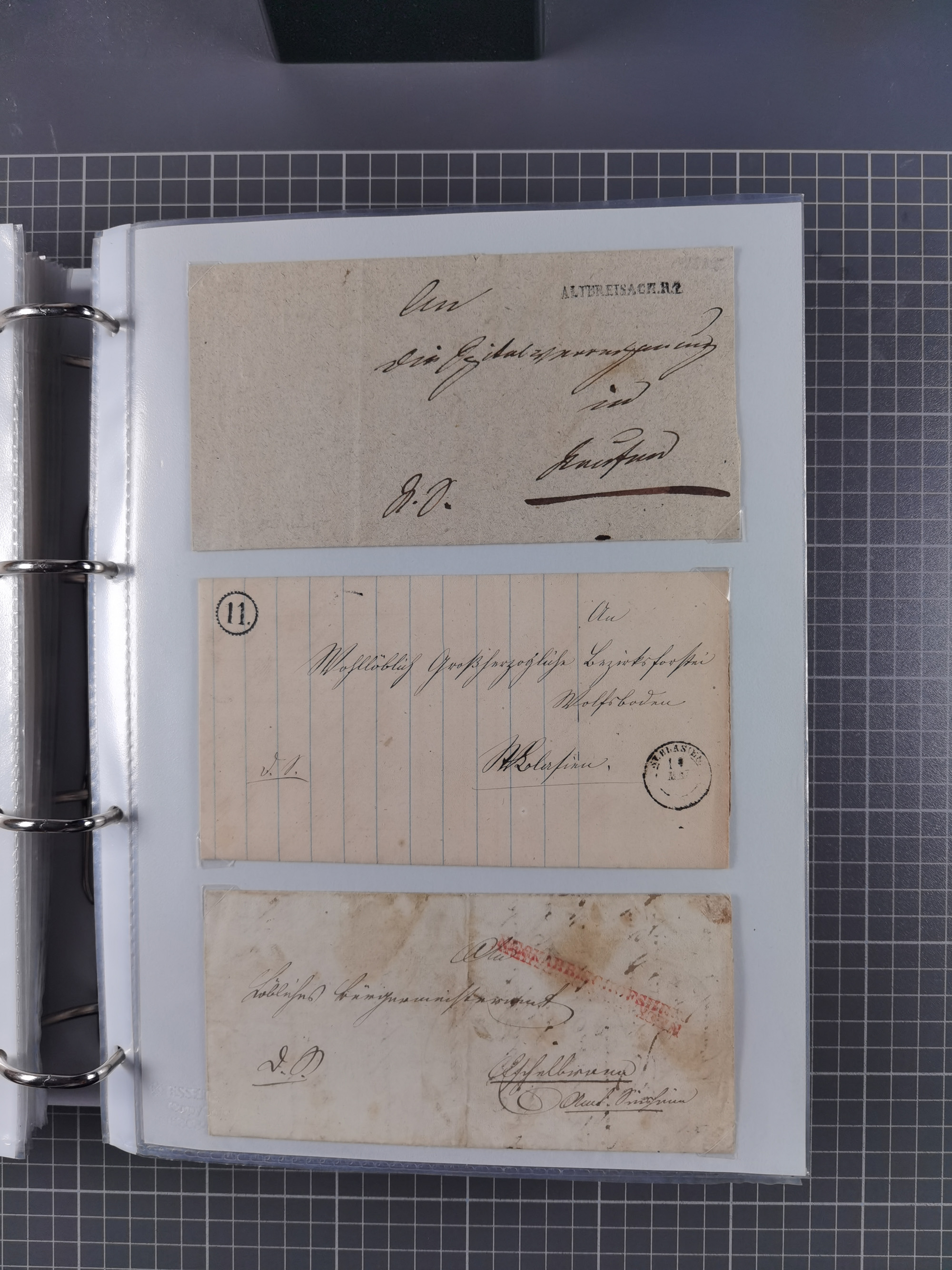 1830/86 (ca.), über 45 meist markenlose Briefe mit Steigbügelstempeln mit Schwerpunkt Württemberg, dabei u.a. HAIGERLOCH in rot auf Vorderseite, ALTSHAUSEN in blau (1844), BLAUFELDEN in waidblau (1850), ECHTERDINGEN in blau (1847), PLOCHINGEN, etc., auch einige Postscheine und Einzelmarken, im Album